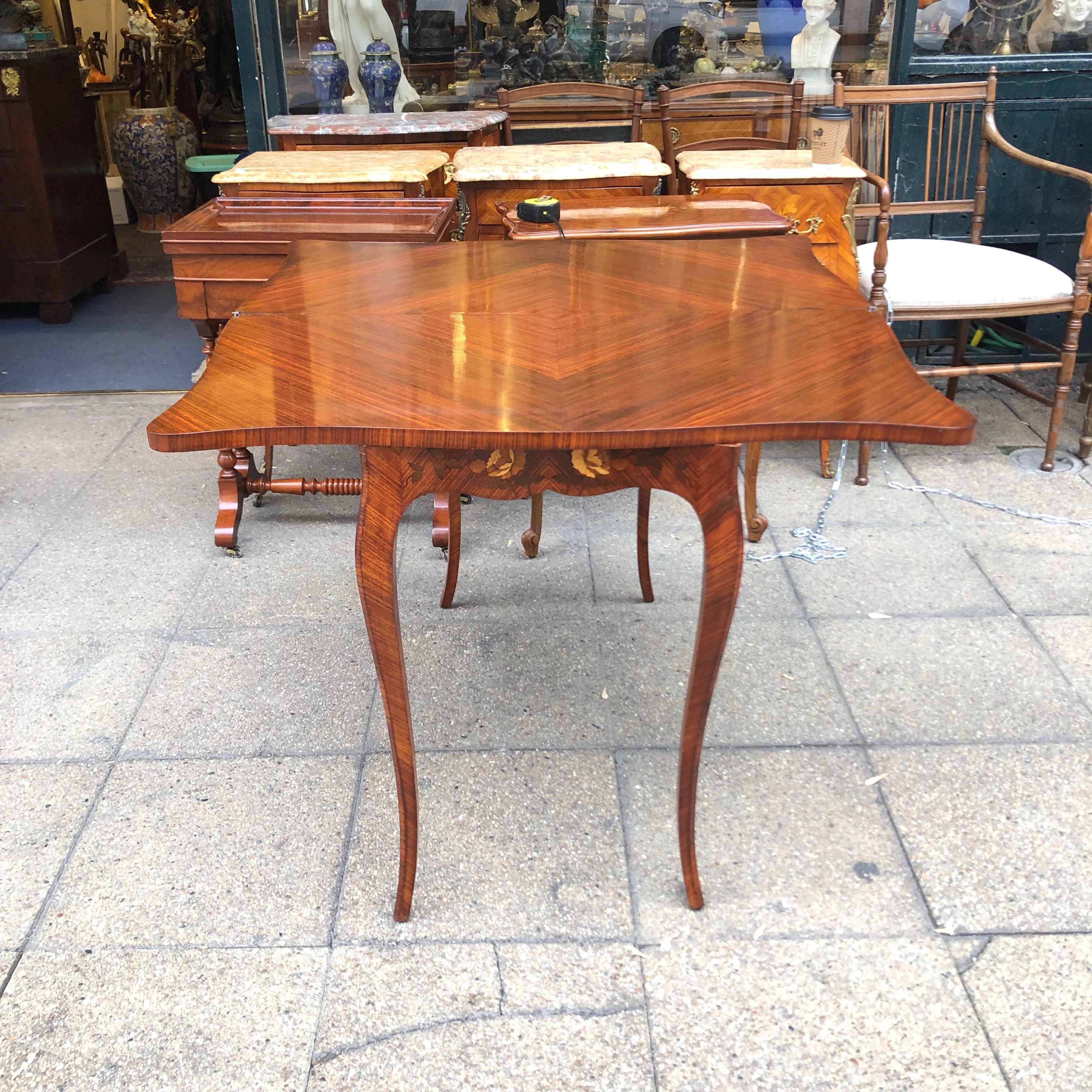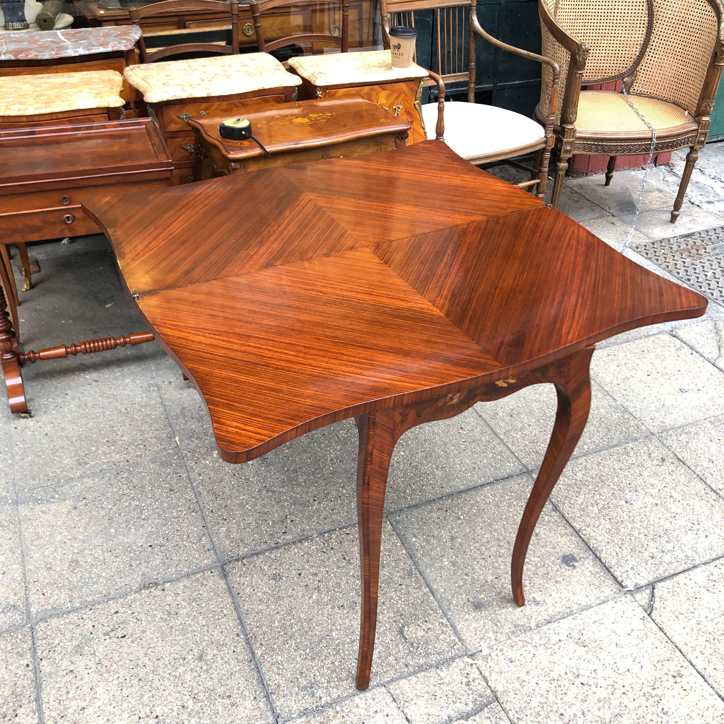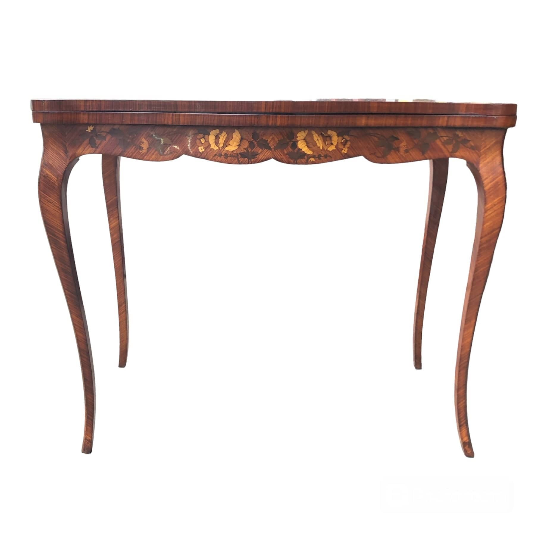 Mesa de juego desmontable. La superficie se gira y despliega para descubrir el centro y el compartimiento de almacenaje. Cuenta con marquetería en la cubierta y rosas a los costados.