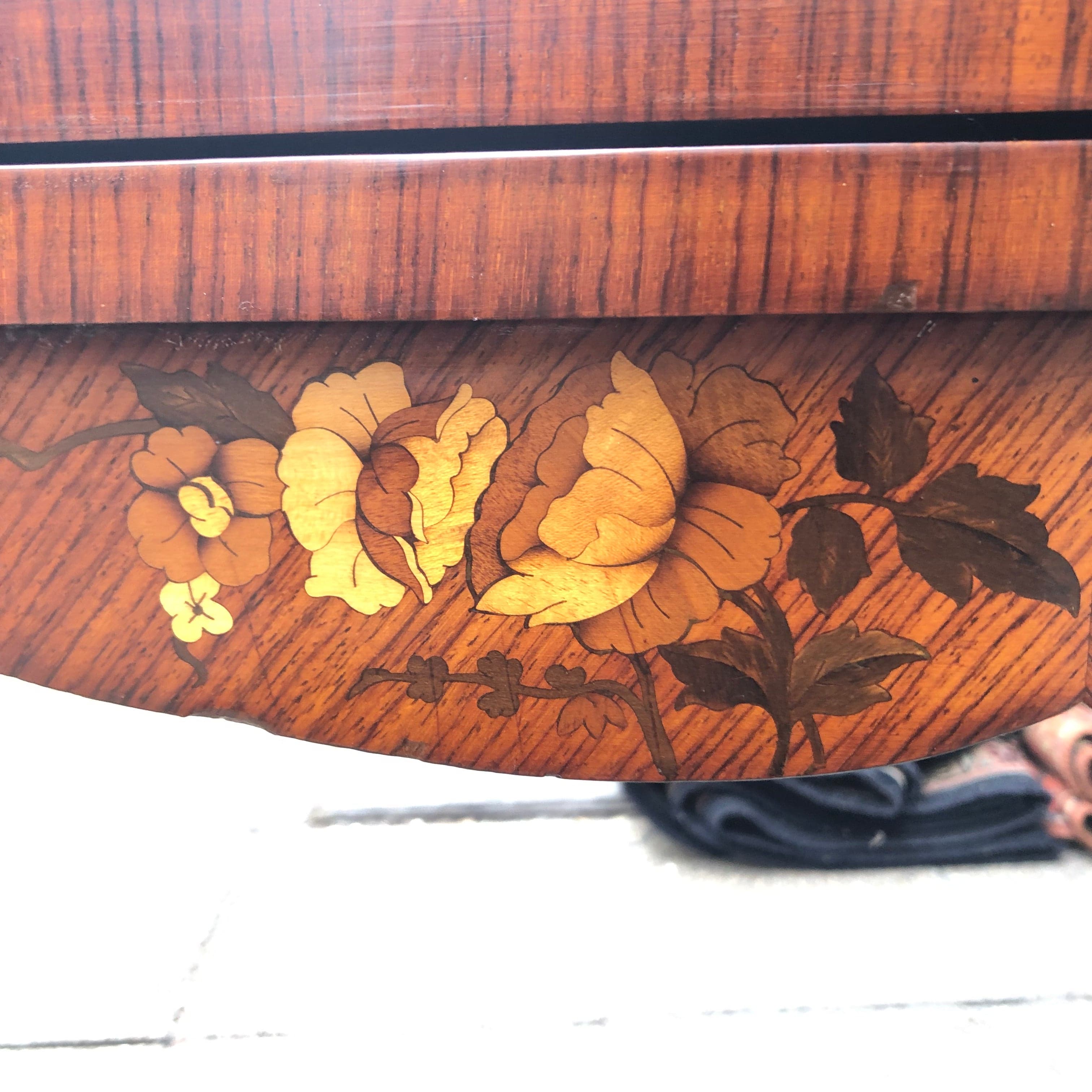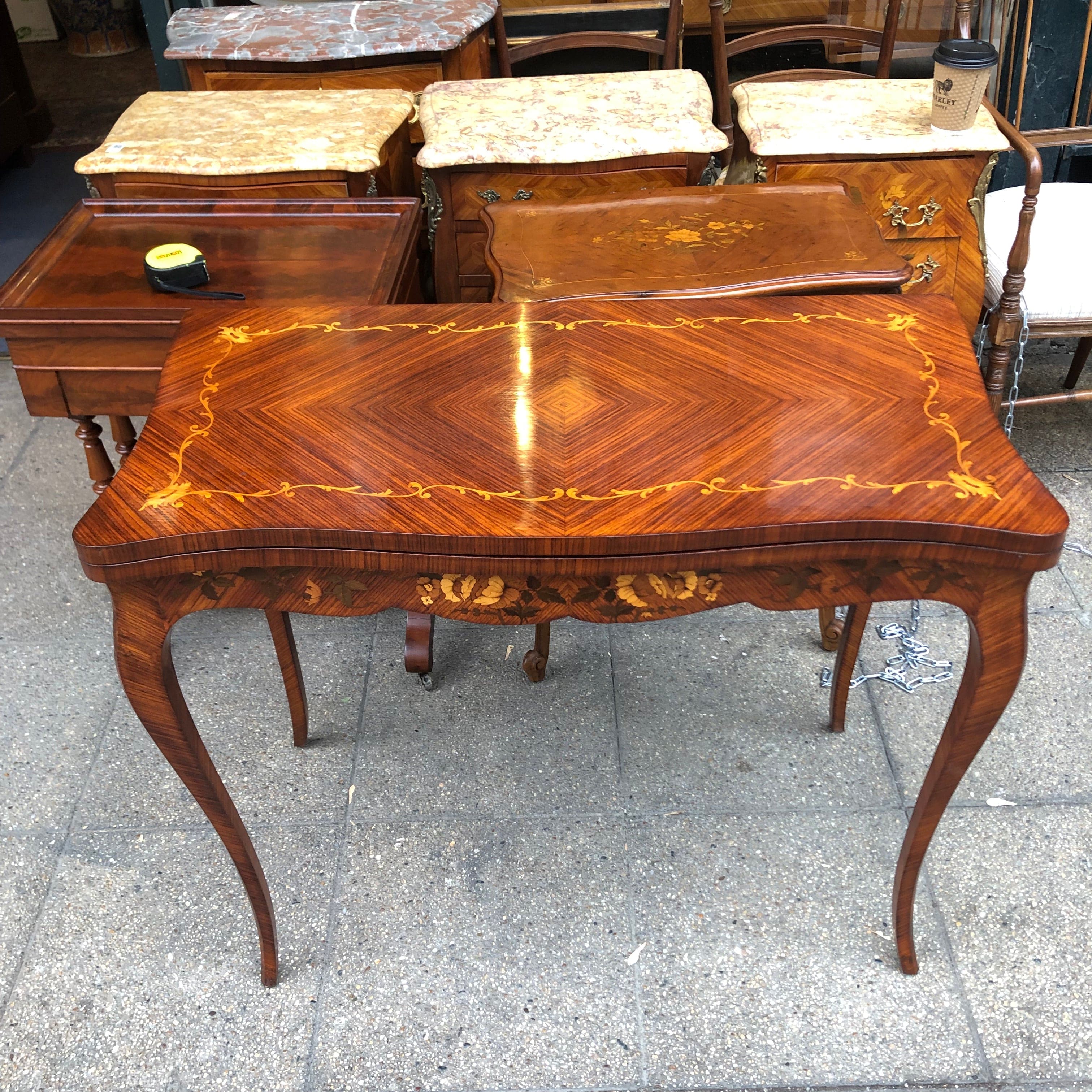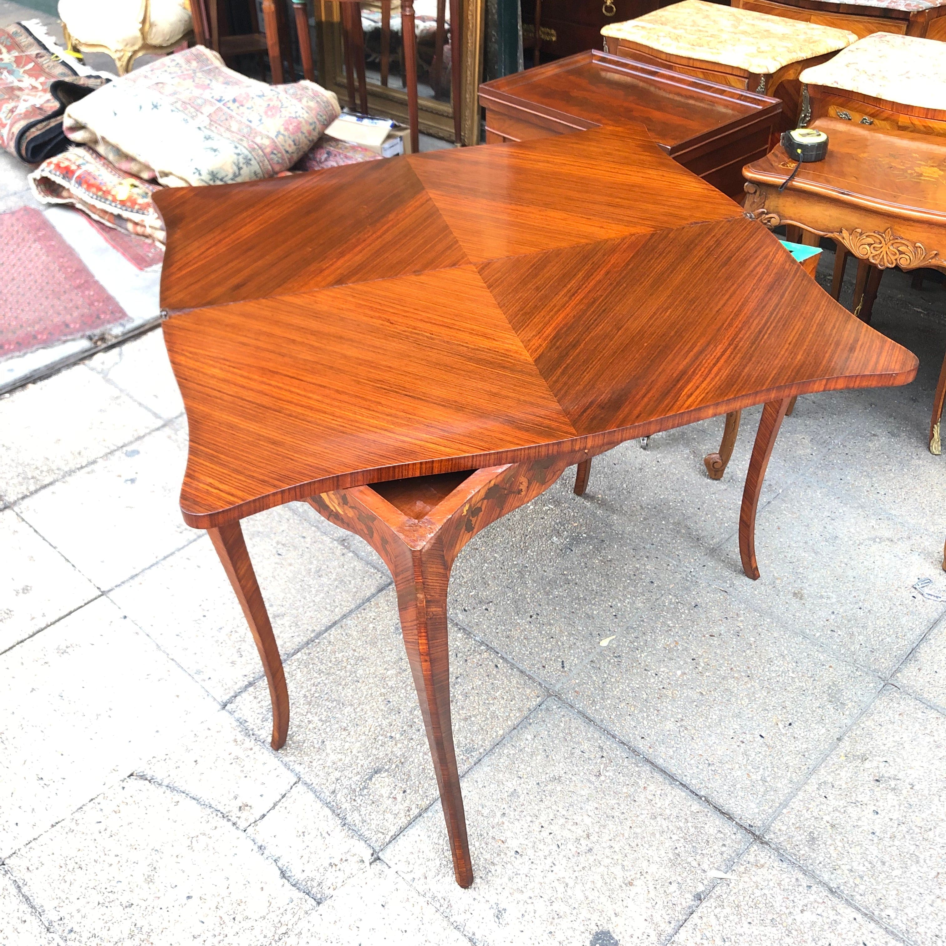 Mesa de juego desmontable. La superficie se gira y despliega para descubrir el centro y el compartimiento de almacenaje. Cuenta con marquetería en la cubierta y rosas a los costados.
