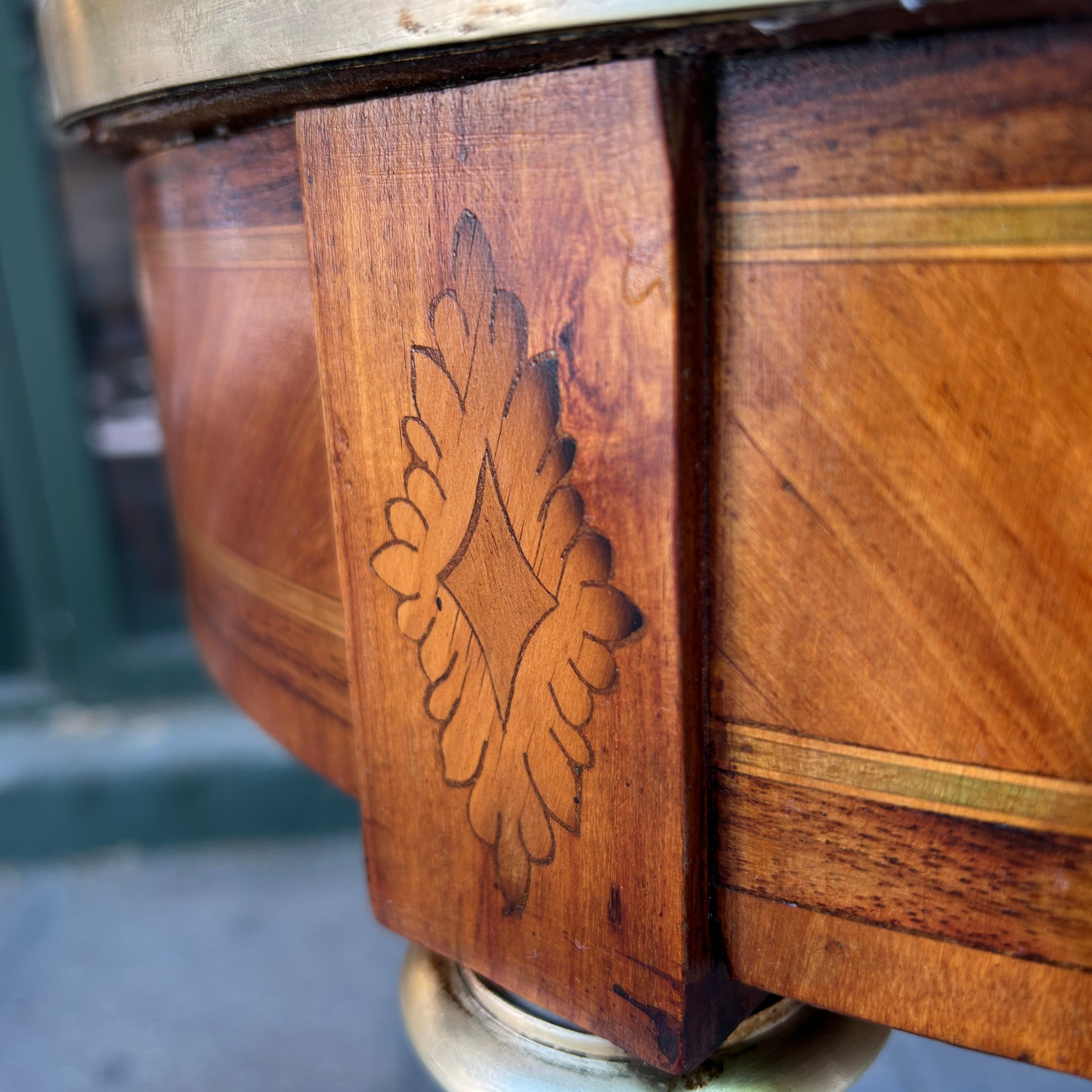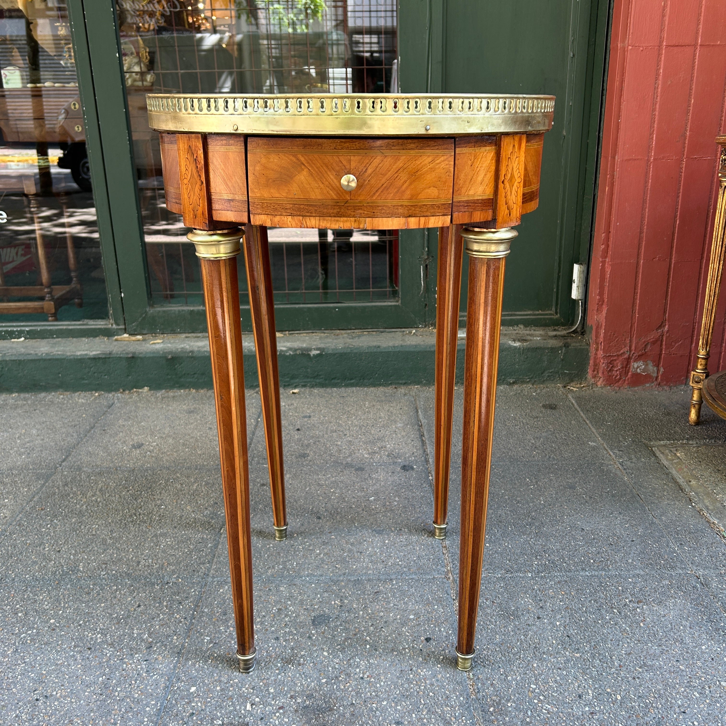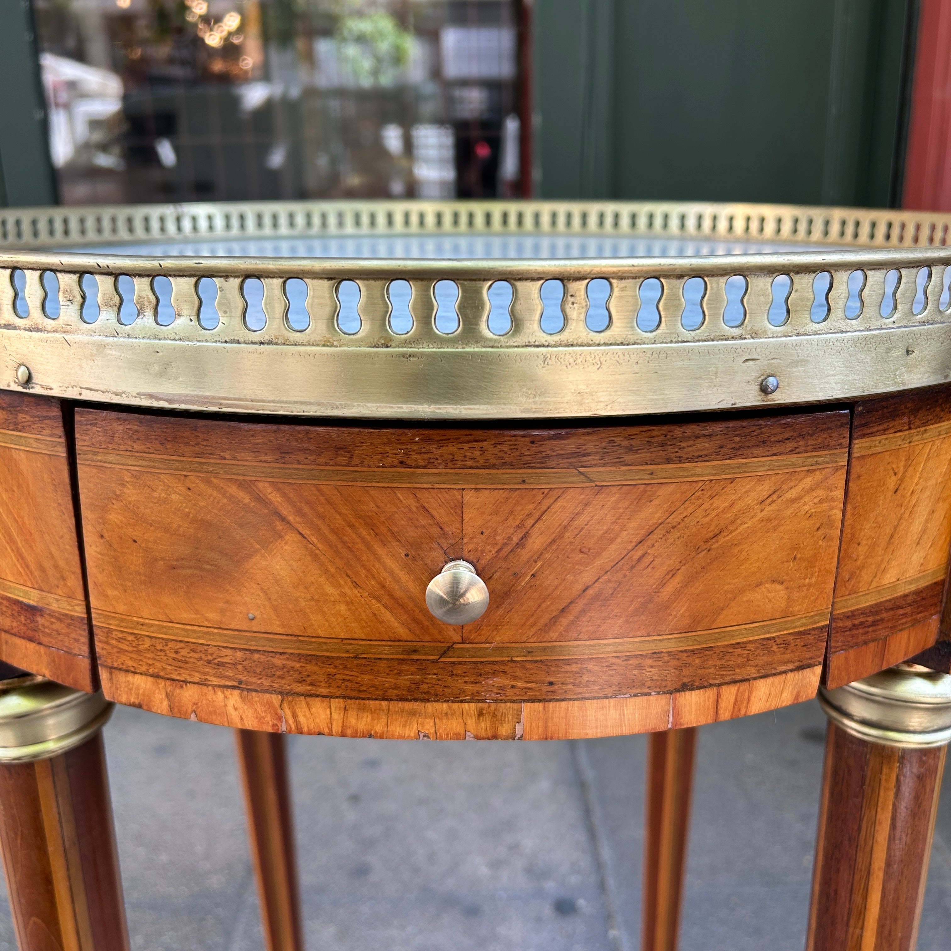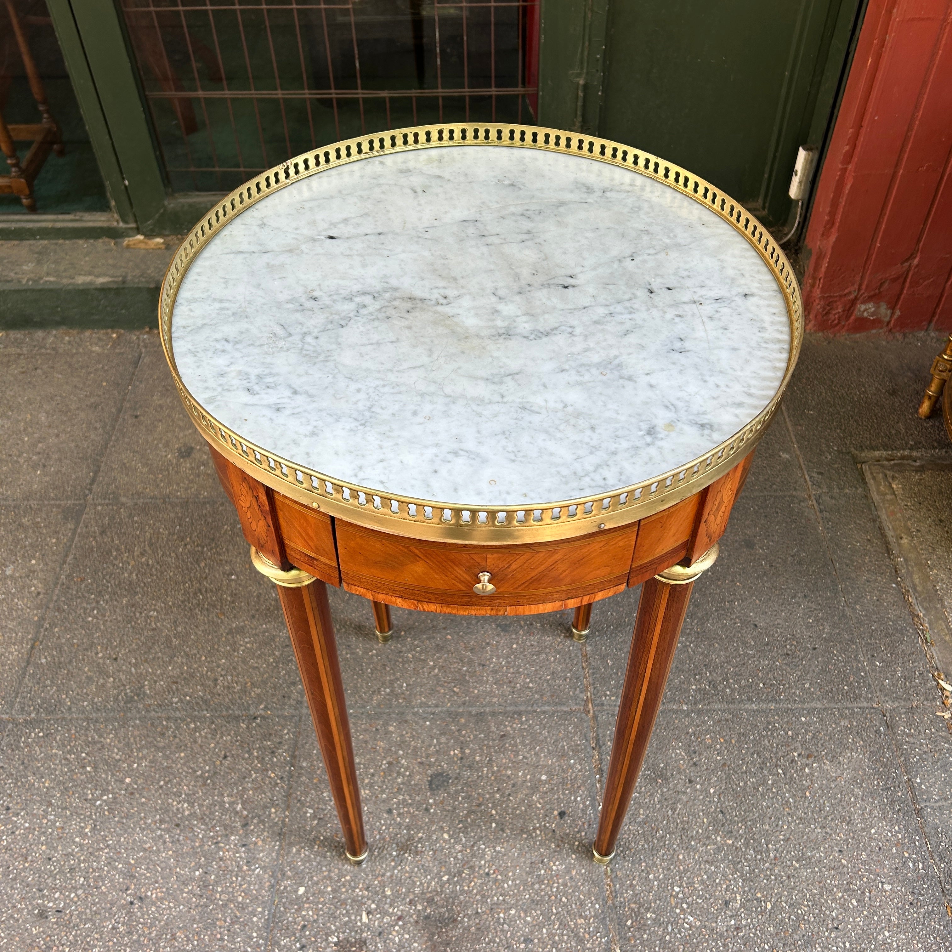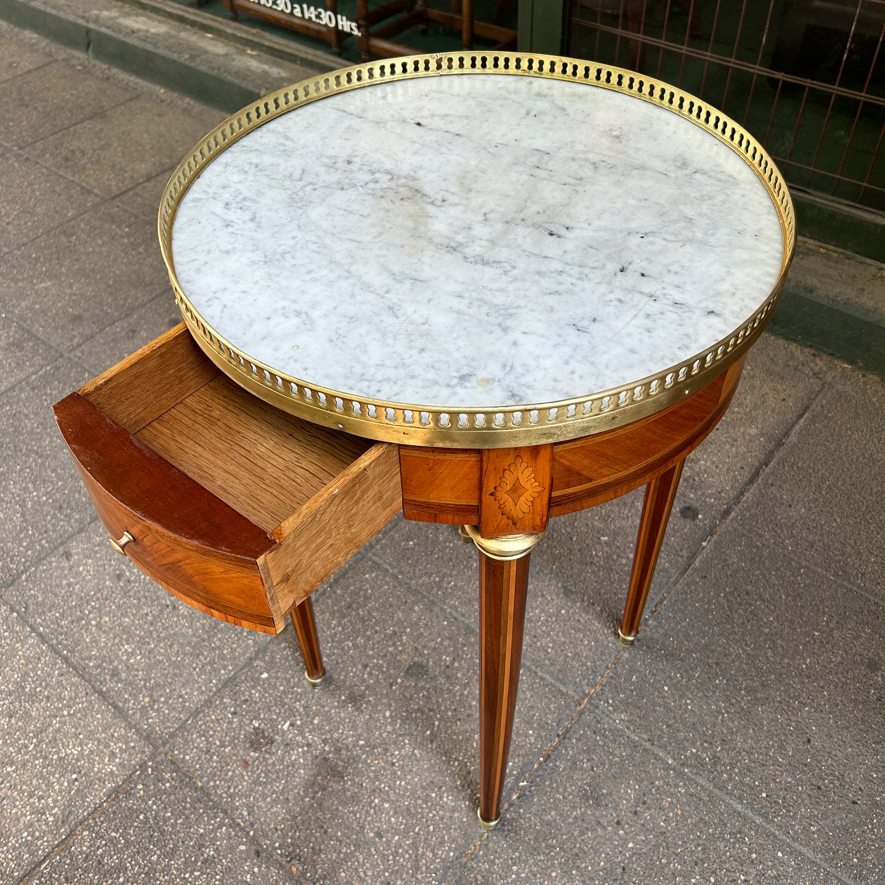 Elegante mesa de apoyo de origen francés estilo Luis XVI, de madera enchapada, marquetería floral en cada una de sus patas, tiradores, tacos, aplicaciones y cintillo de bronce. La mesa tiene una cubierta de mármol blanco veteado y un cajón frontal. Francia, s.XIX.