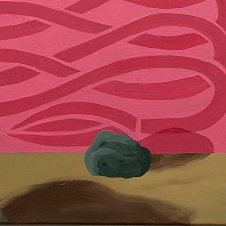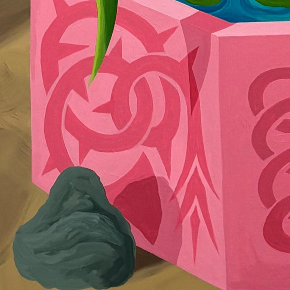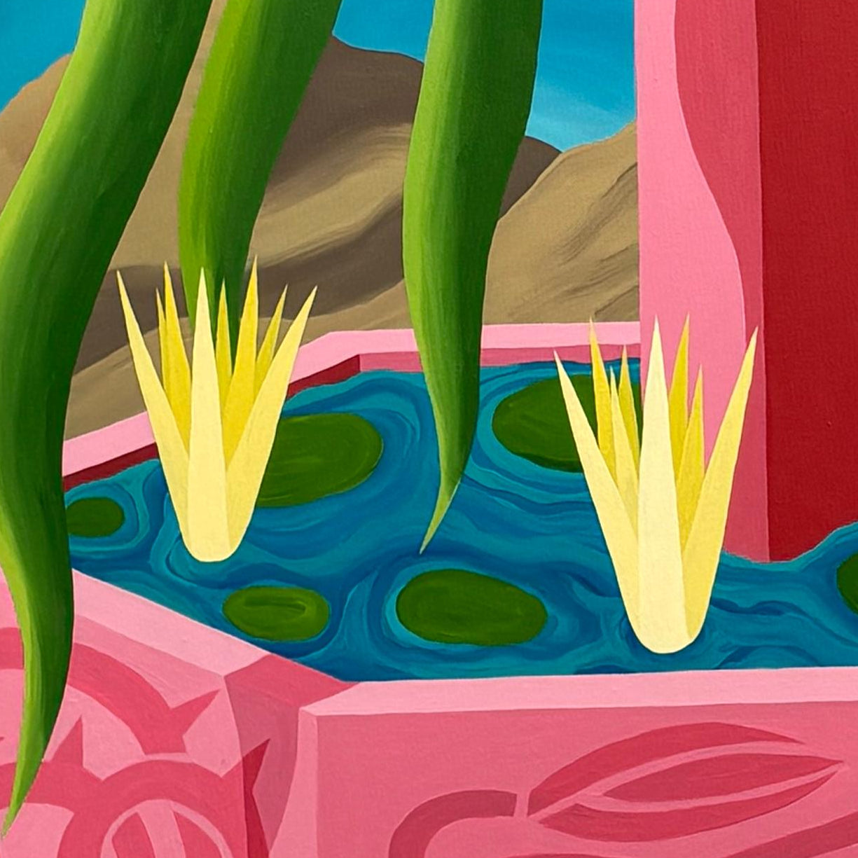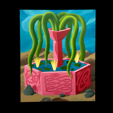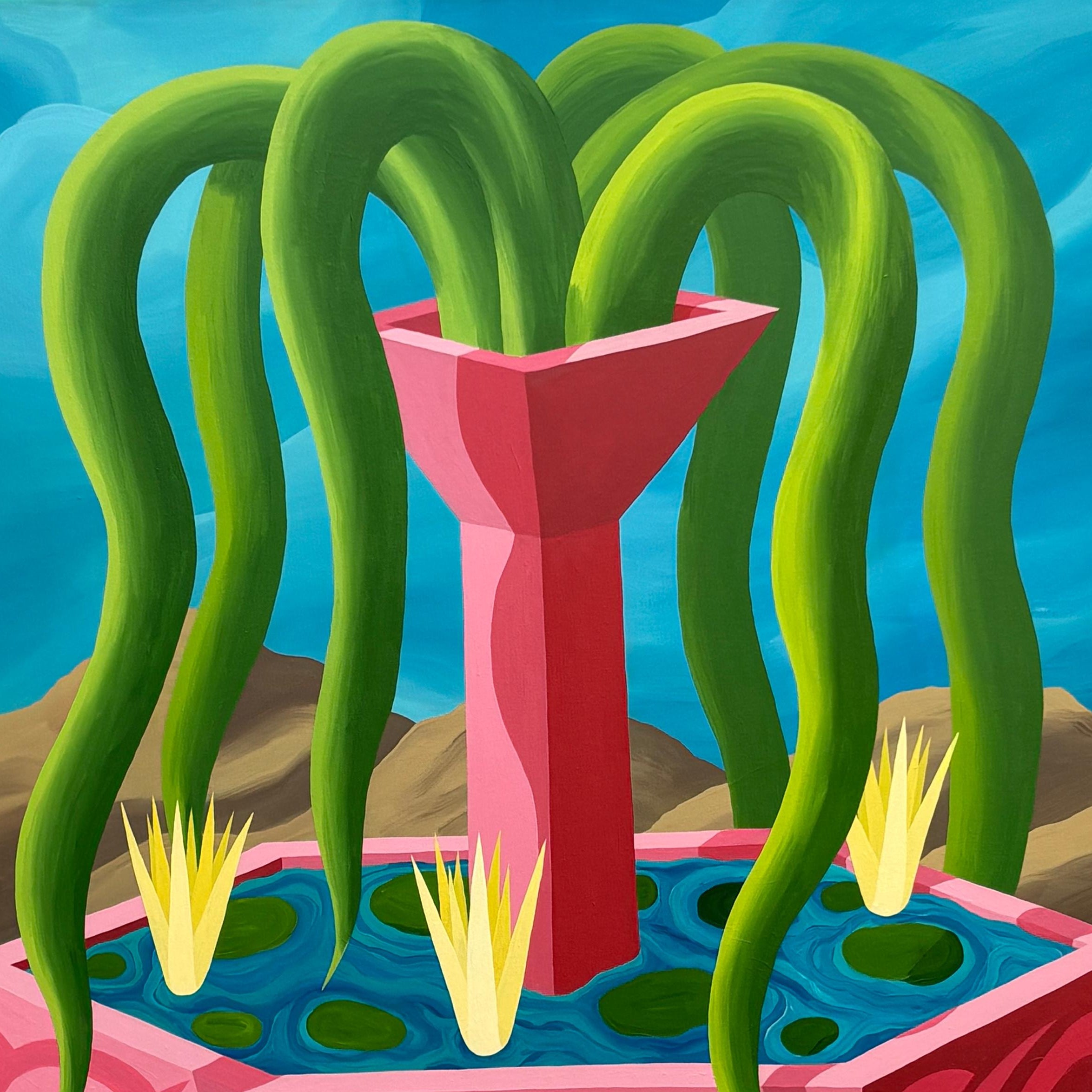 Hermoso acrílico sobre tela del artista chileno Michael Yaikel. La obra presenta una gran fuente en medio de un paisaje desértico, desde cuya estructura emergen formas orgánicas que evocan una planta cuyos tallos caen hacia el agua. La composición combina elementos naturales y geométricos en una escena de carácter simbólico y onírico.