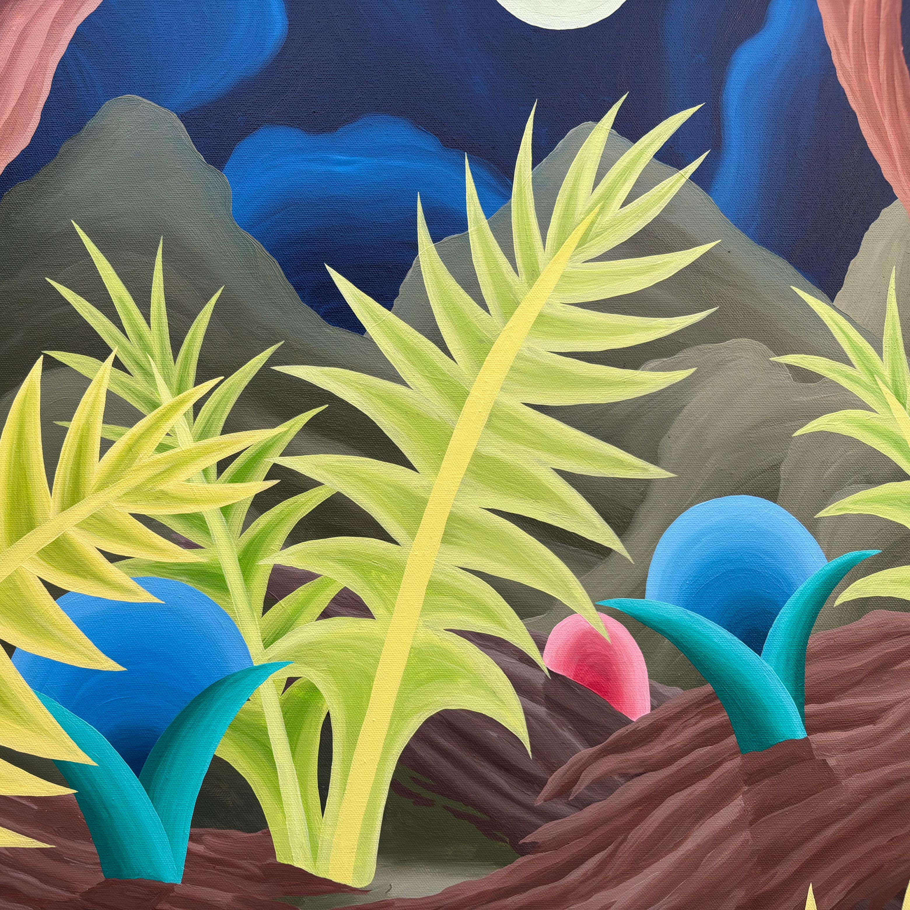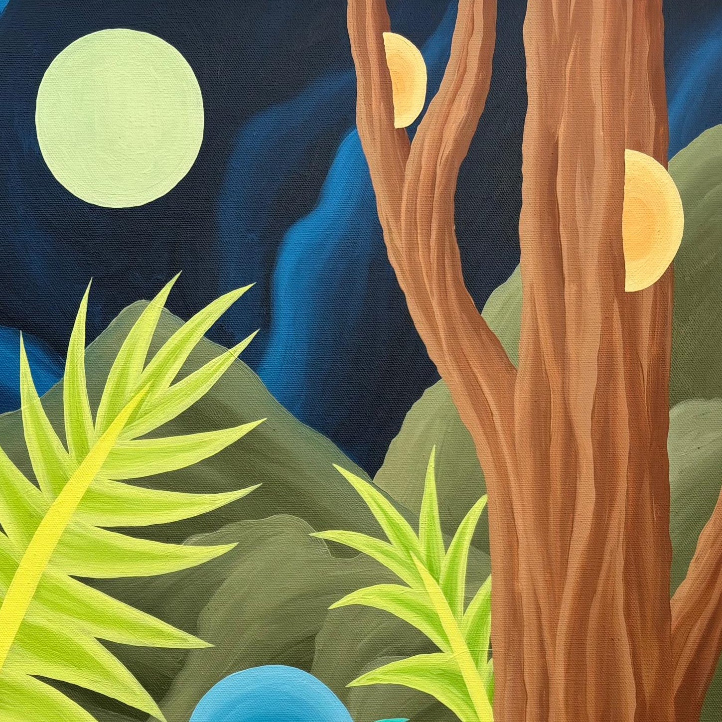 Llamativo óleo sobre tela del pintor y grabador chileno Michael Yaikel. La obra presenta un paisaje nocturno de abundante vegetación, donde largos troncos y hojas estilizadas se despliegan en formas orgánicas y geométricas. En el fondo, la luna aparece como un elemento protagónico que ilumina la escena y refuerza su atmósfera. La pintura refleja el lenguaje característico del artista: una interpretación imaginativa de la naturaleza, donde la forma, el ritmo y el color adquieren un papel central.
