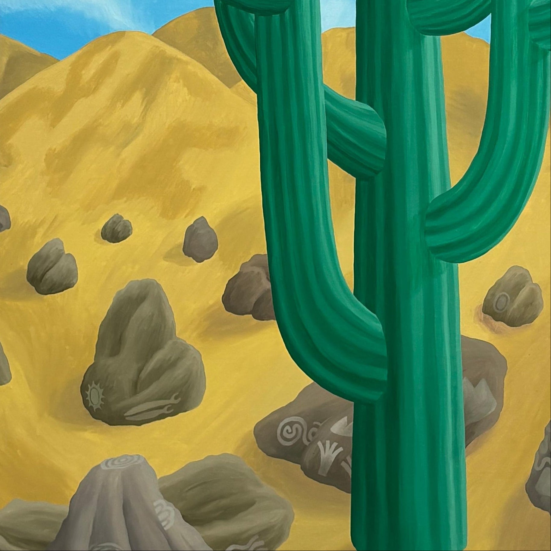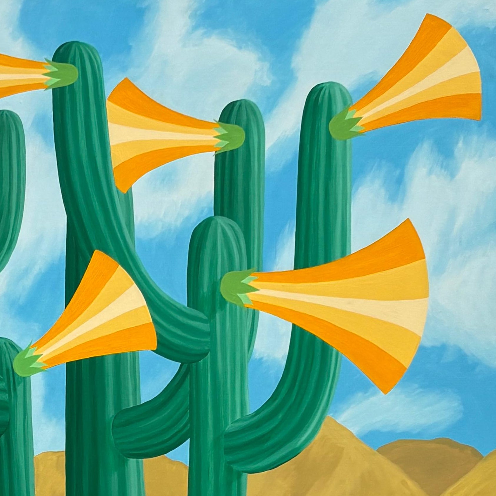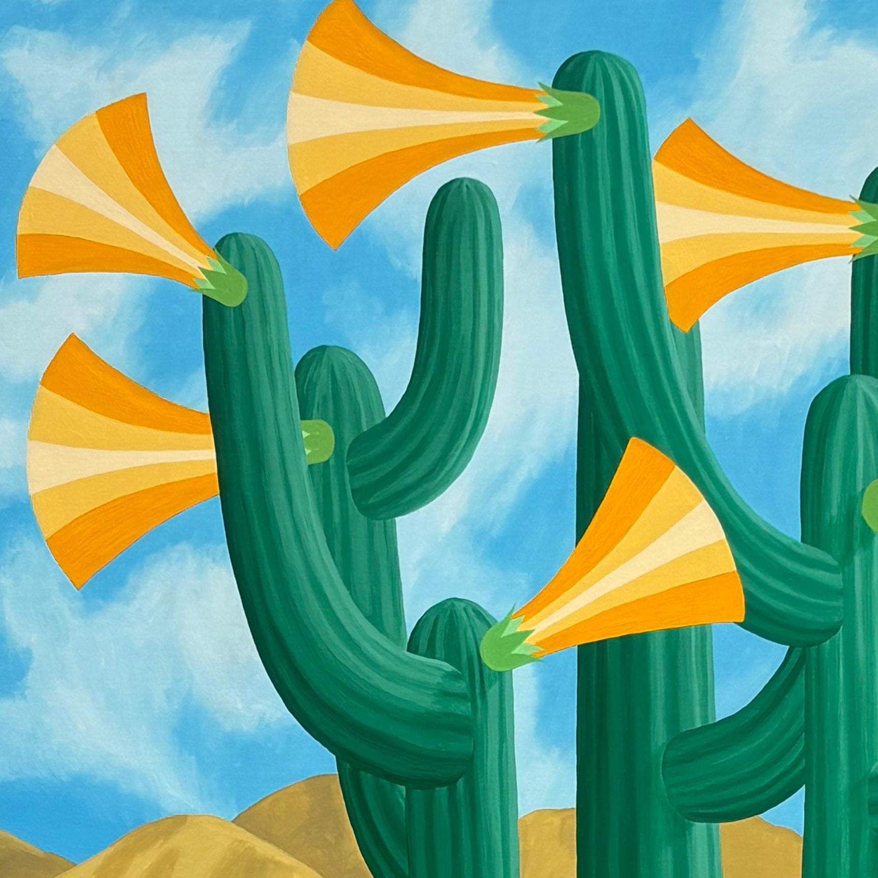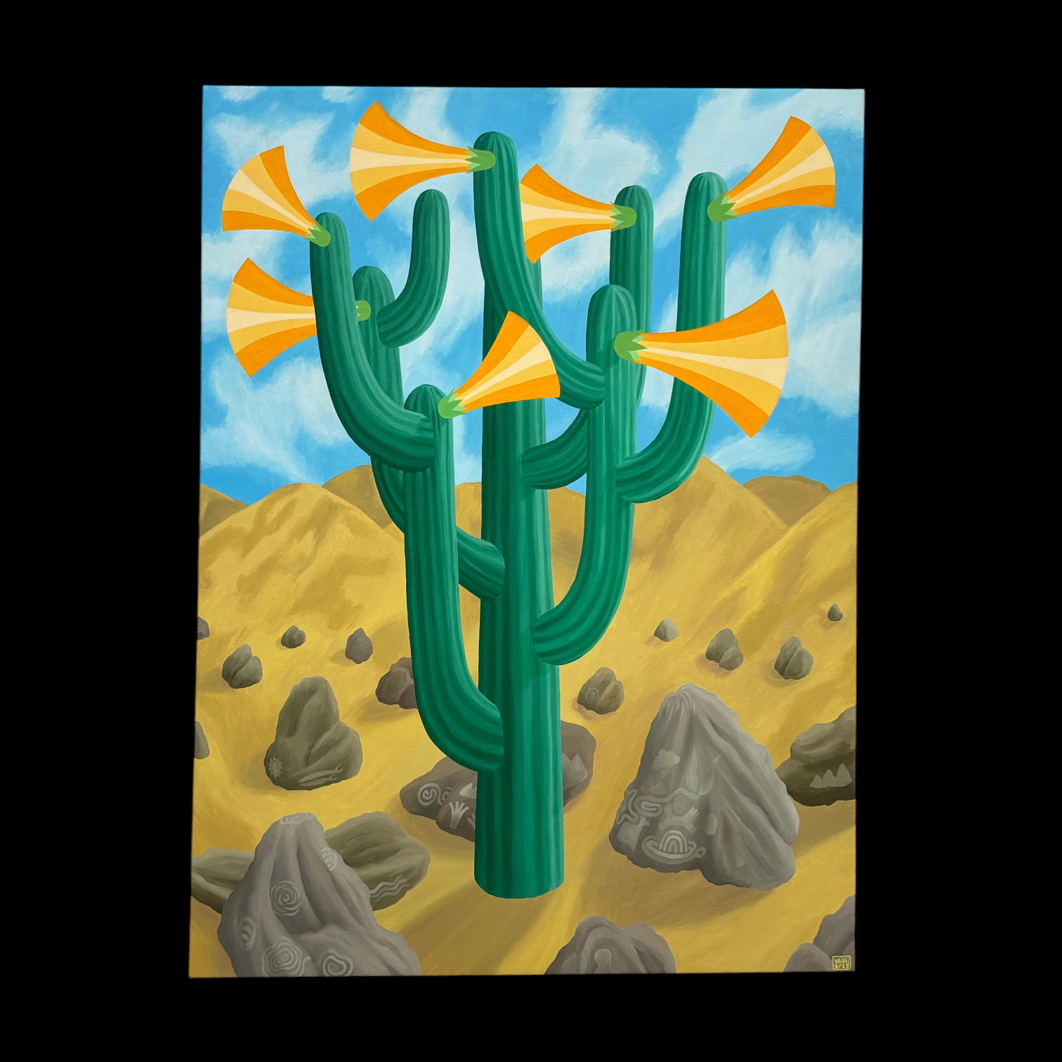Espectacular óleo sobre tela del artista chileno Michael Yaikel. La obra presenta un paisaje desértico dominado por un cactus central cuyas ramificaciones se transforman en formas que parecen ser flores, generando una escena de carácter simbólico y onírico. Destaca el notable trabajo cromático del autor, donde los verdes intensos del cactus contrastan con los tonos cálidos del desierto y el azul luminoso del cielo.