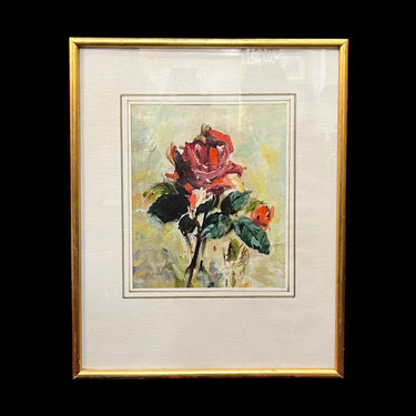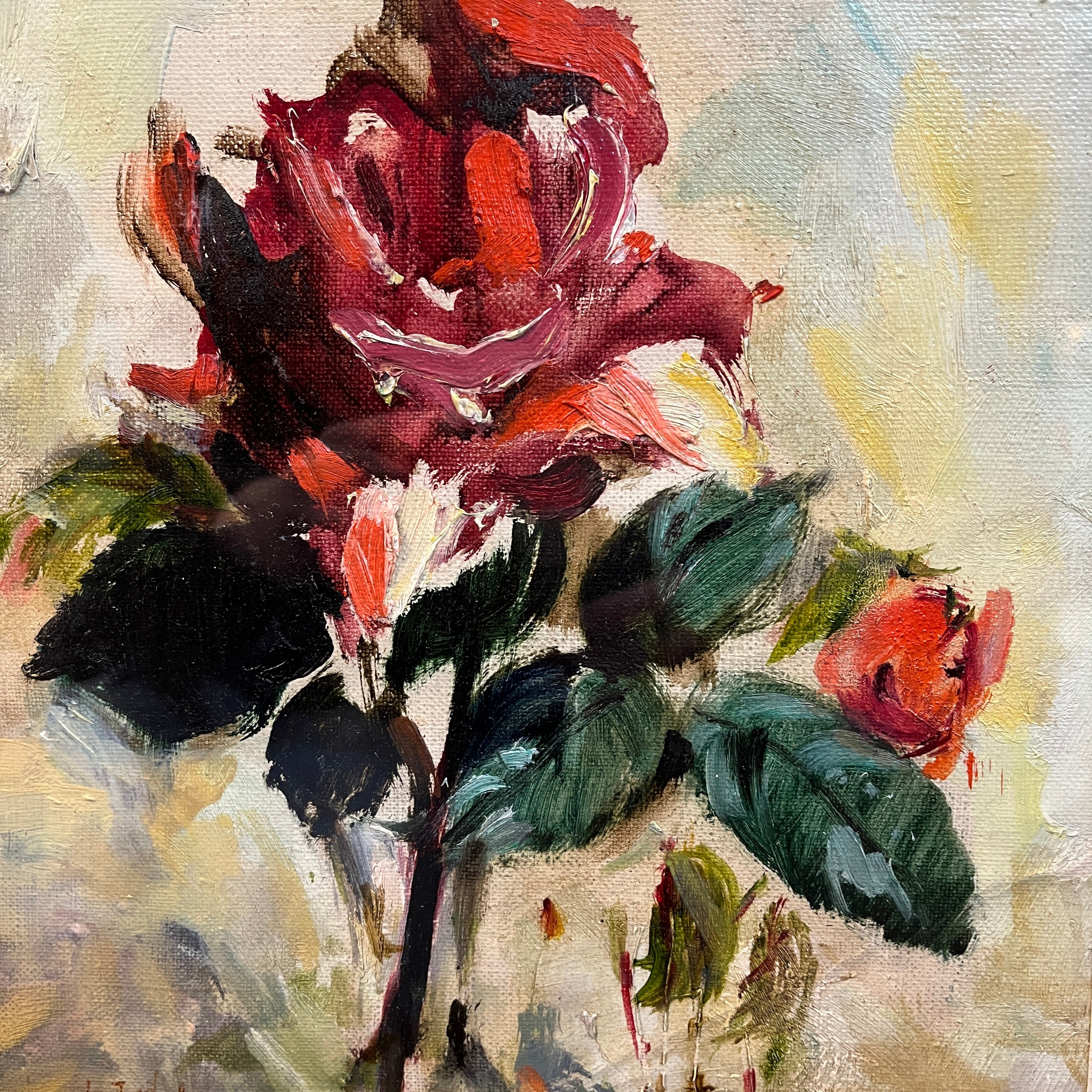 El pintor chileno Fernando Morales Jordán nos deleita con esta bella pintura de una solitaria rosa roja imponente.