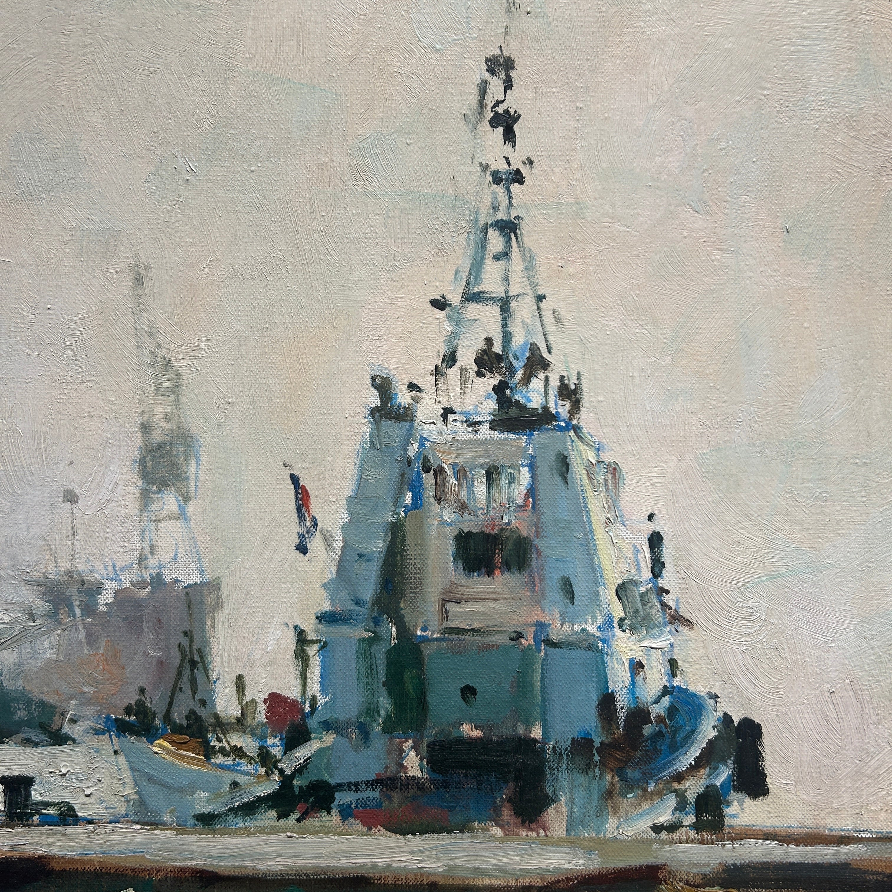 El gran artista chileno Fernando Morales Jordán presenta un bello óleo sobre tela inspirado en la observación de buques de guerra fondeados en un puerto con grúas al fondo, presumiblemente en Valparaíso. El marco es de madera y yeso pintado.