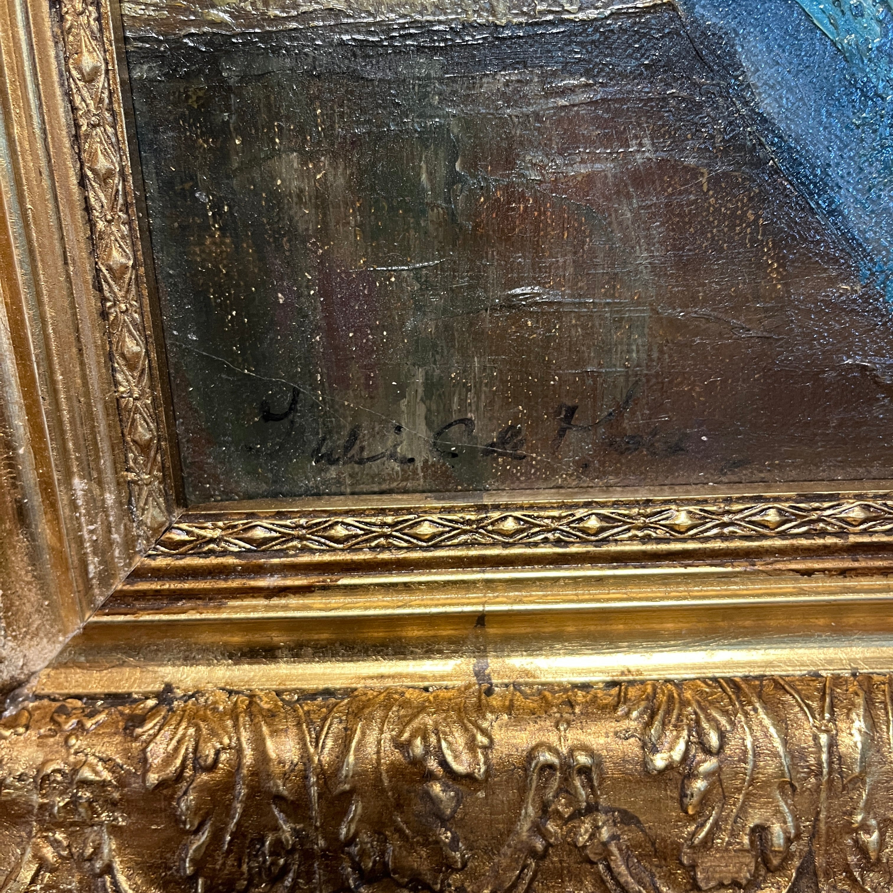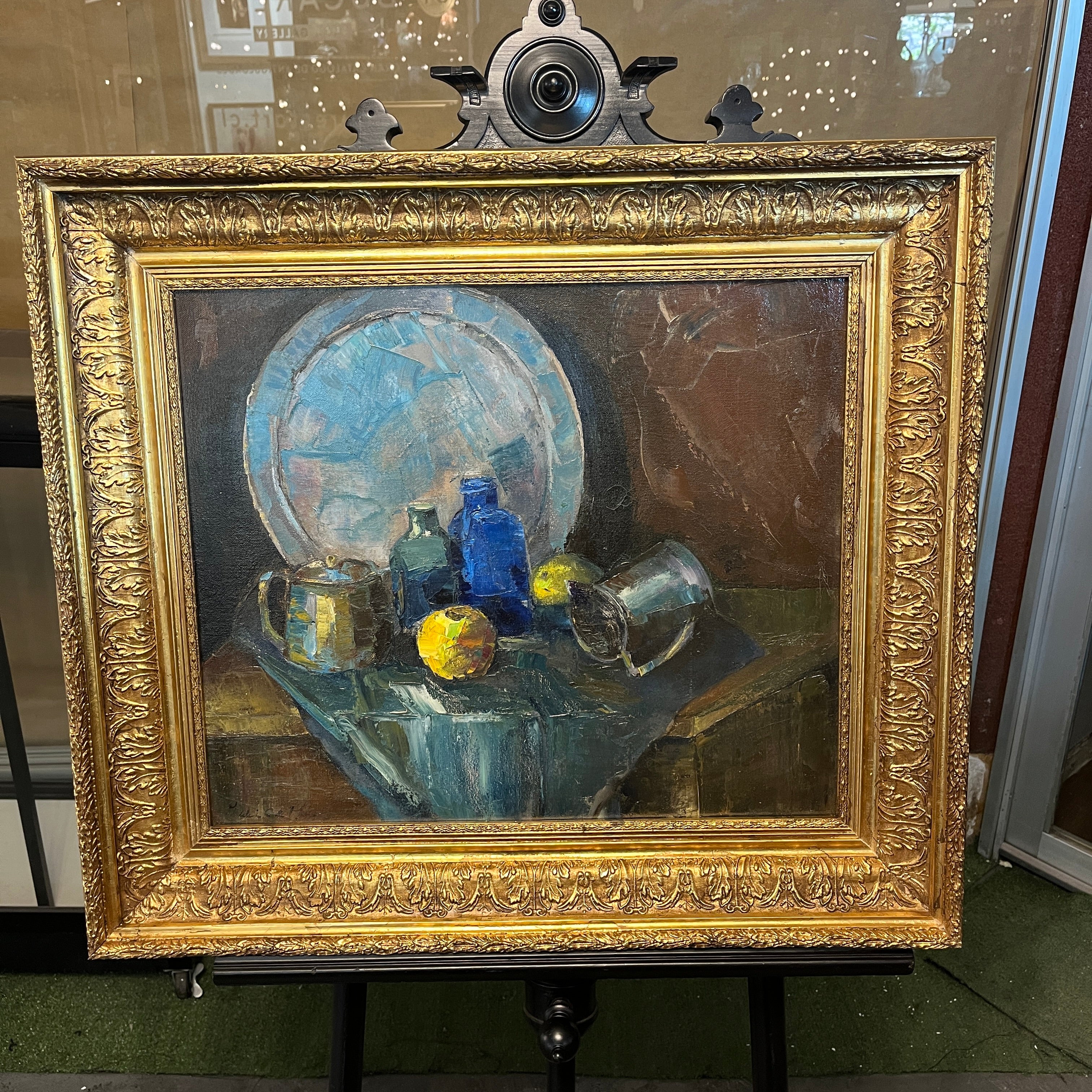 Óleo sobre tela, de forma ilegible, representando un bodegón de limones junto a objetos de mesa de platería y vidrio, como unas botellas, una bandeja, un jarrito y un azucarero. La obra tiene un bello juego de colores, haciendo contrastar los reflejos de la platería y los tonos saturados de amarillo y azul, sobre el fondo opaco. La obra está enmarcada en madera tallada de finos relieves y terminada en dorado.