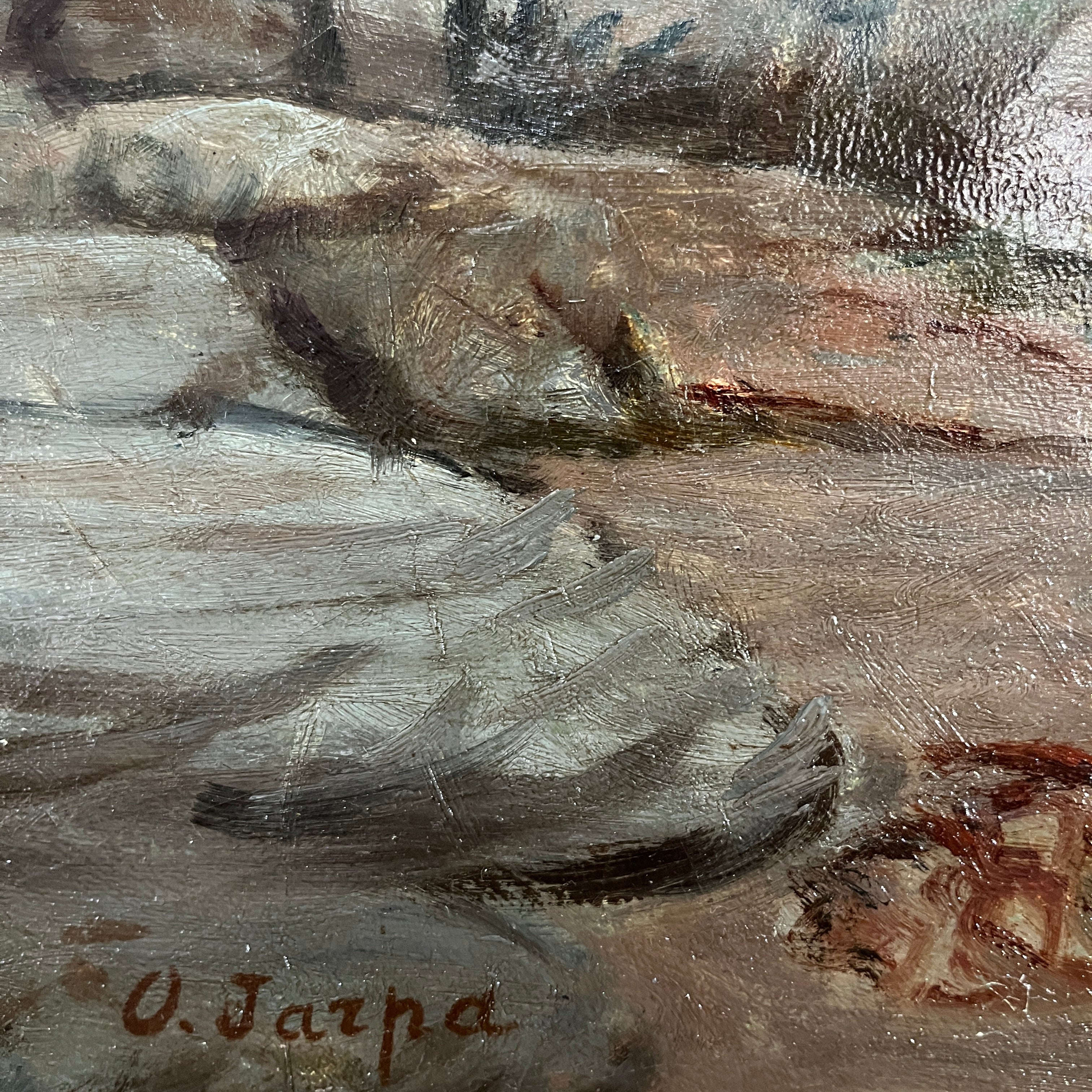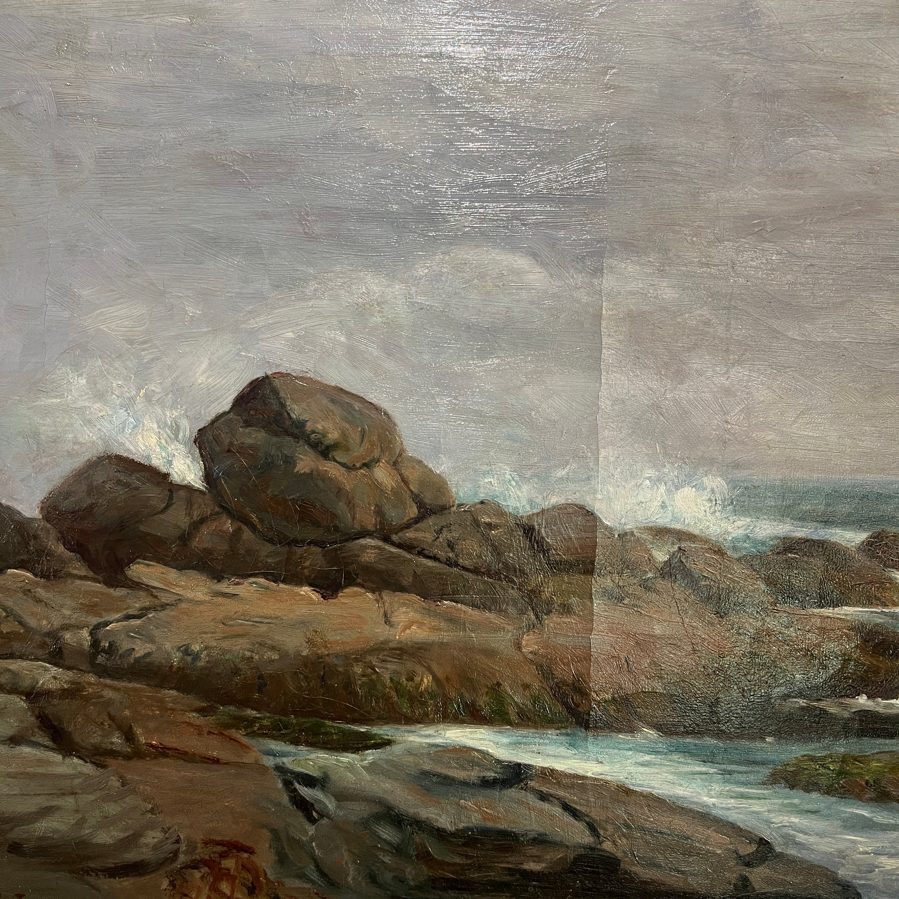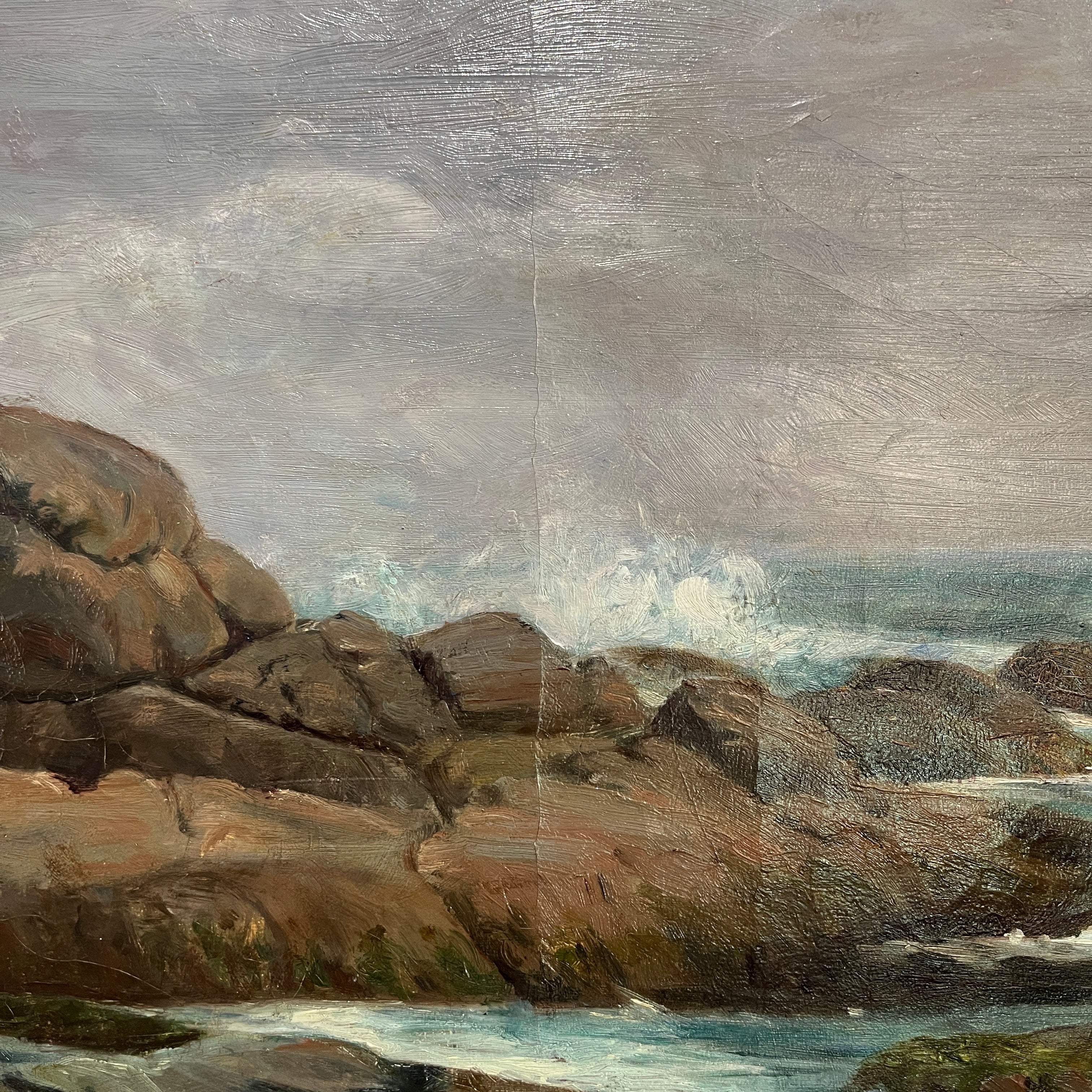 Óleo del talentoso pintor chileno Onofre Jarpa, donde vemos un paisaje con marcado roquerío y un mar agitado chocando contra ellas, todo acompañado por un día nublado y gris. Es una pintura que logra capturar el movimiento y fuerza de la naturaleza.
