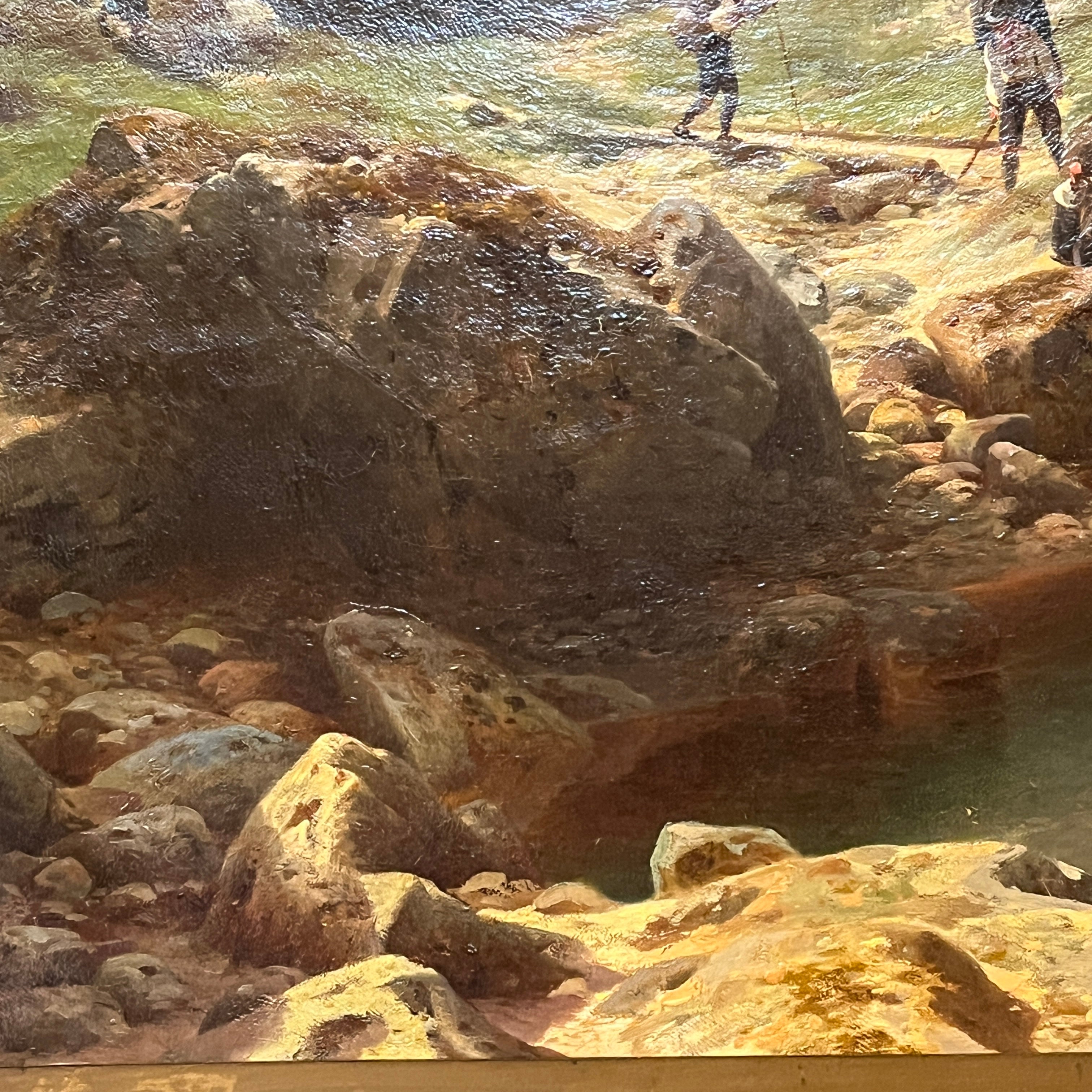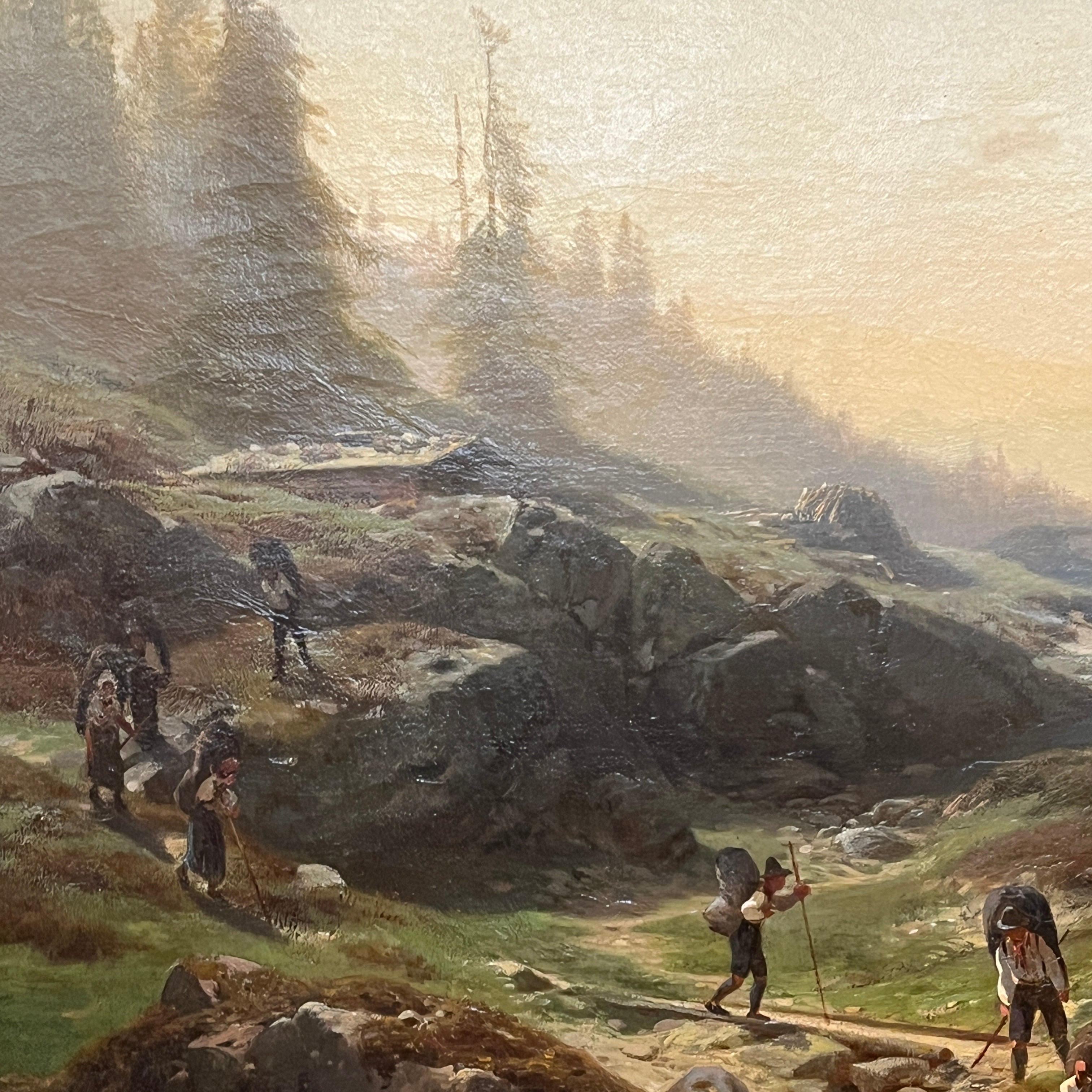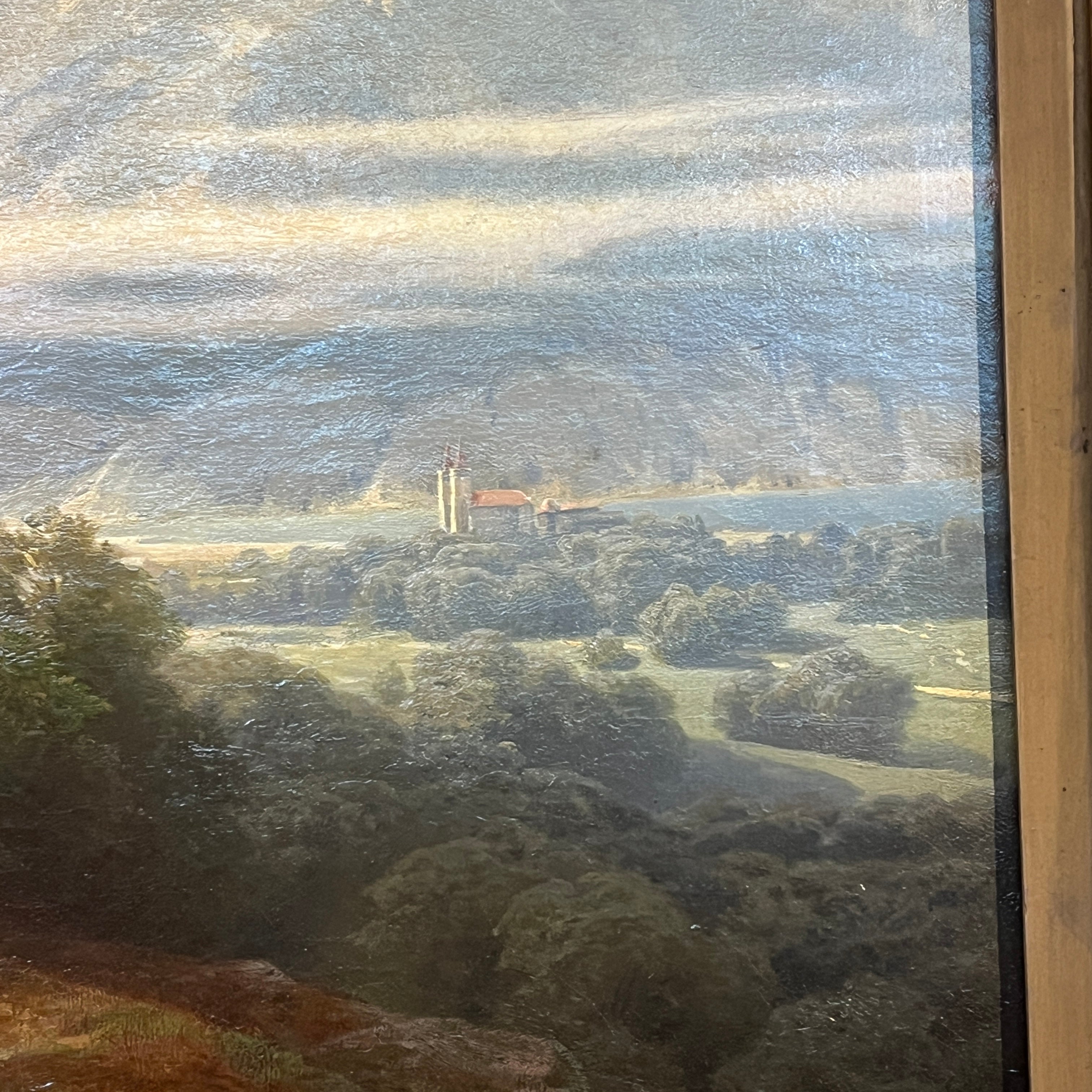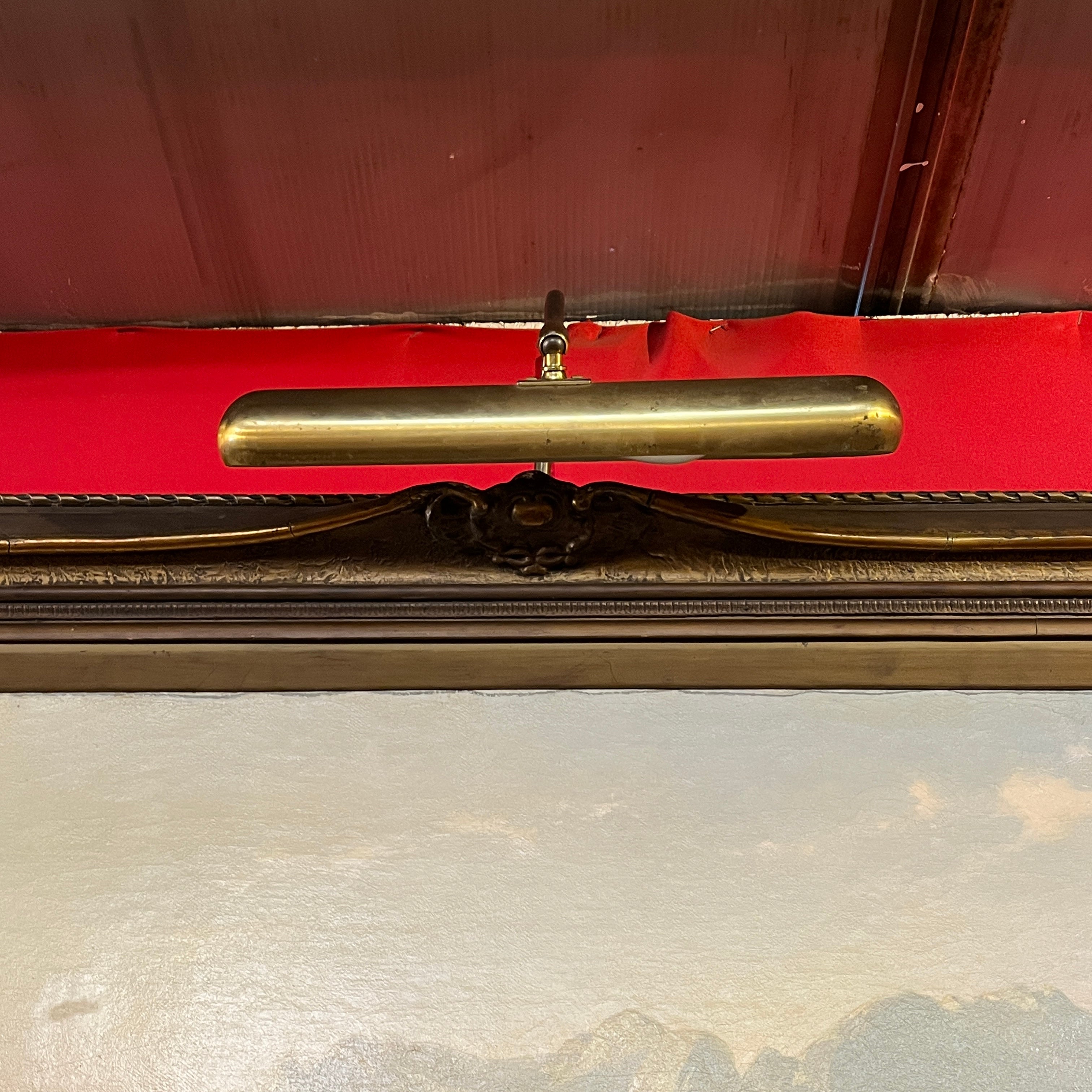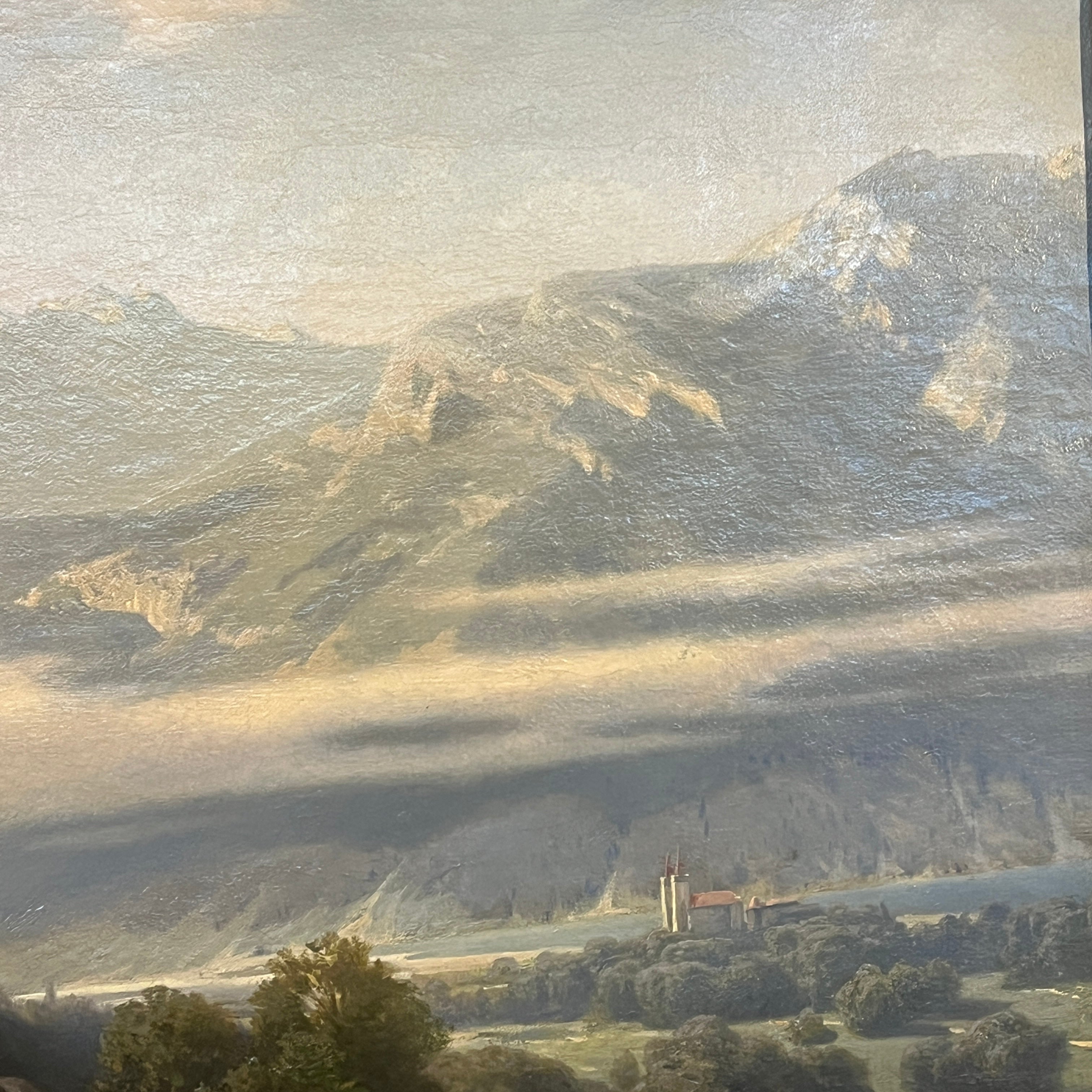 Óleo sobre tela europeo, pintado por el artista polaco Otto Van Kamecke (1826-1899), representando un gran paisaje titulado ‘Weimar’. Este título alude a la tradicional ciudad alemana, llamada la “joya cultural”, de gran importancia en términos literarios y filosóficos, durante finales del siglo XVIII y principios de s. XIX . La obra muestra un paisaje montañoso con algunos peregrinos caminando por las montañas en dirección a la ciudad. El paisaje representa en detalle el tipo de territorio por el cual el pintor se hizo reconocido, como eran los paisajes montañosos de Suiza y Bavaria. La obra está enmarcada en madera tallada con decorados en relieve en sus esquinas y pintado de elegante dorado. Además el marco cuenta con una placa con el nombre del artista y una lámpara en sus esquinas parte superior para iluminar la obra.