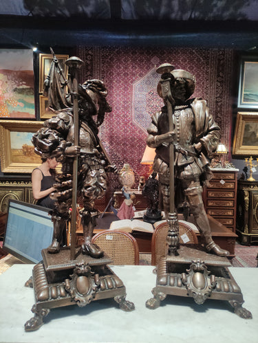 Preciosa pareja de figuras de peltre, antiguamente lámparas de gas, montadas sobre bases cuadradas del mismo metal, con patas de león. Ambas representan soldados de tercio español, con sus respectivas vestiduras, armas y armaduras. Francia, principios s.XX.