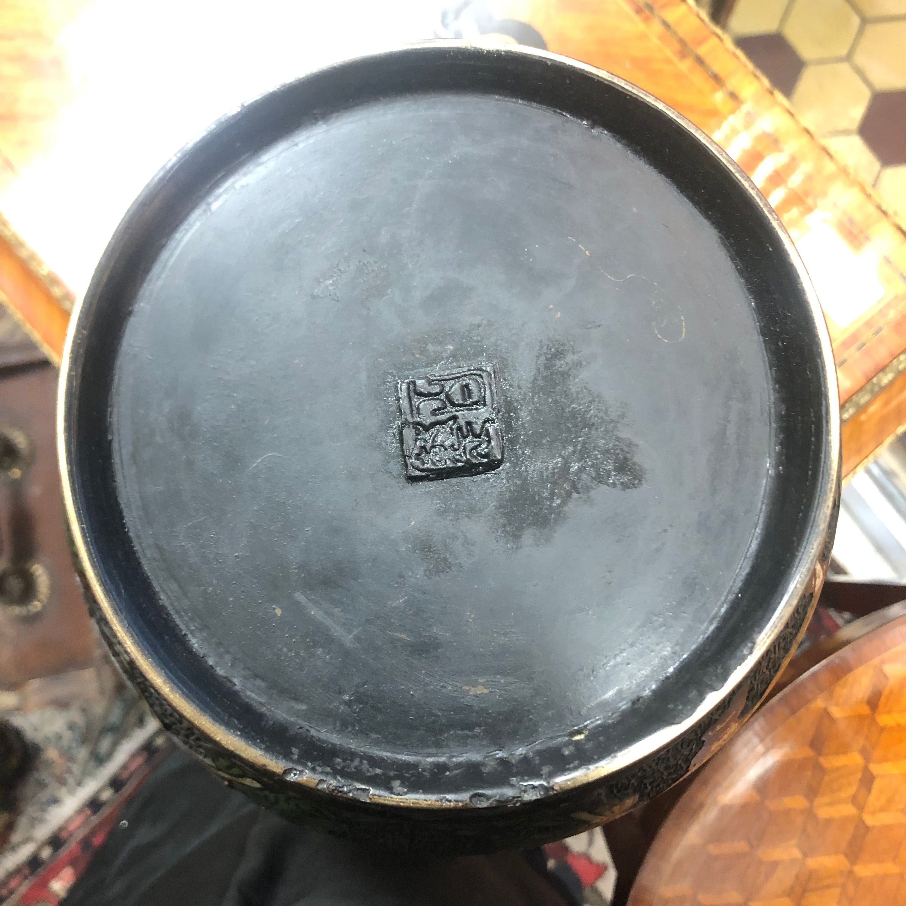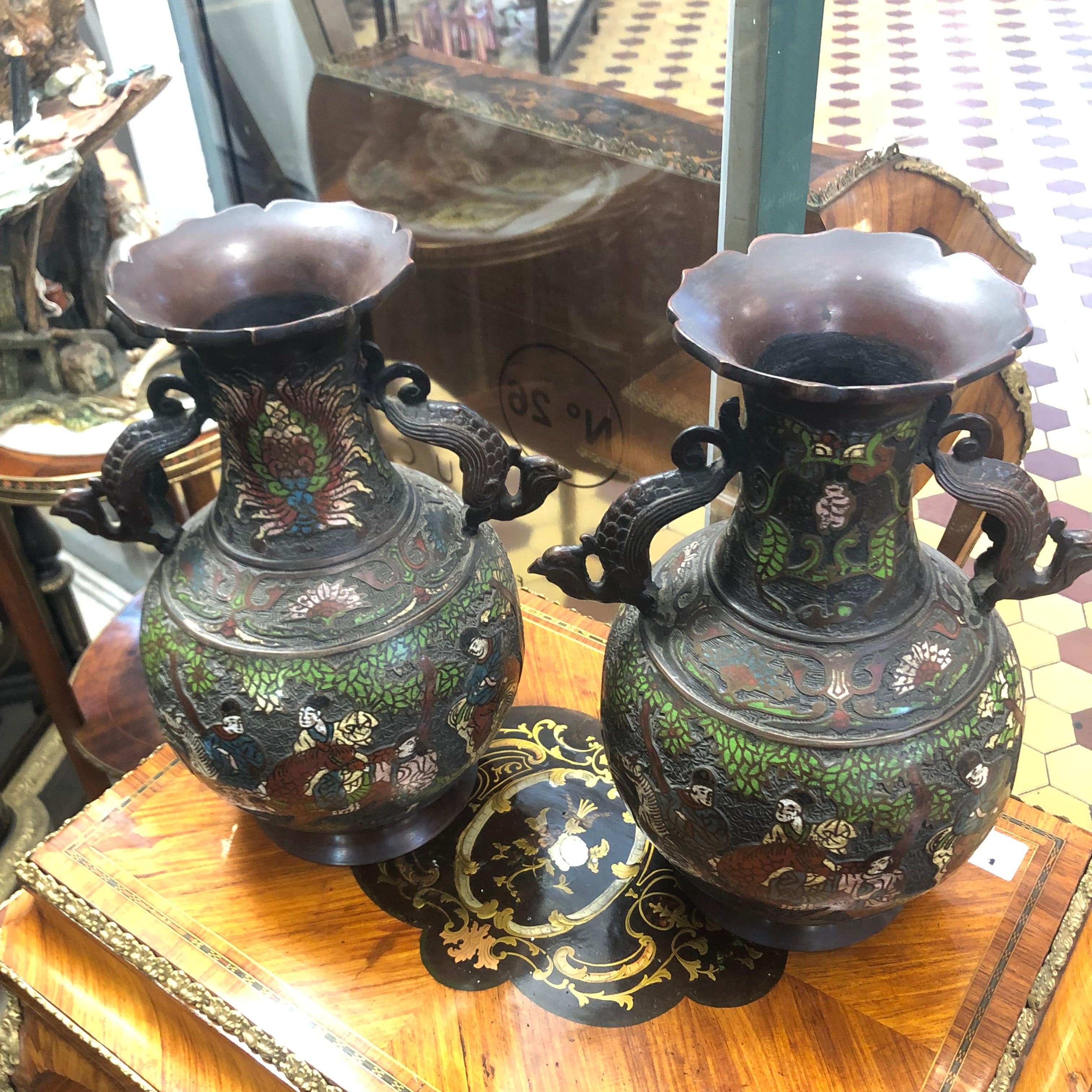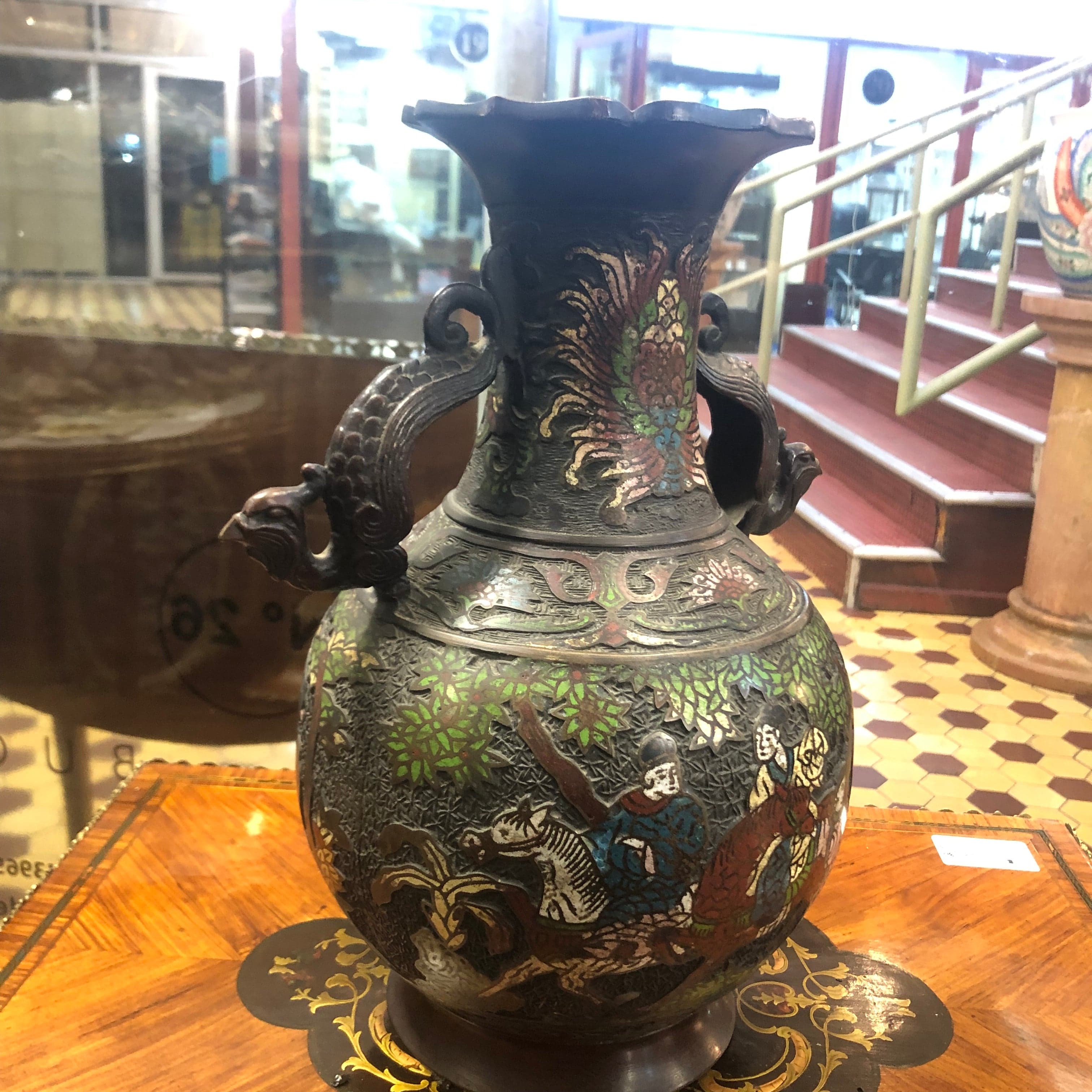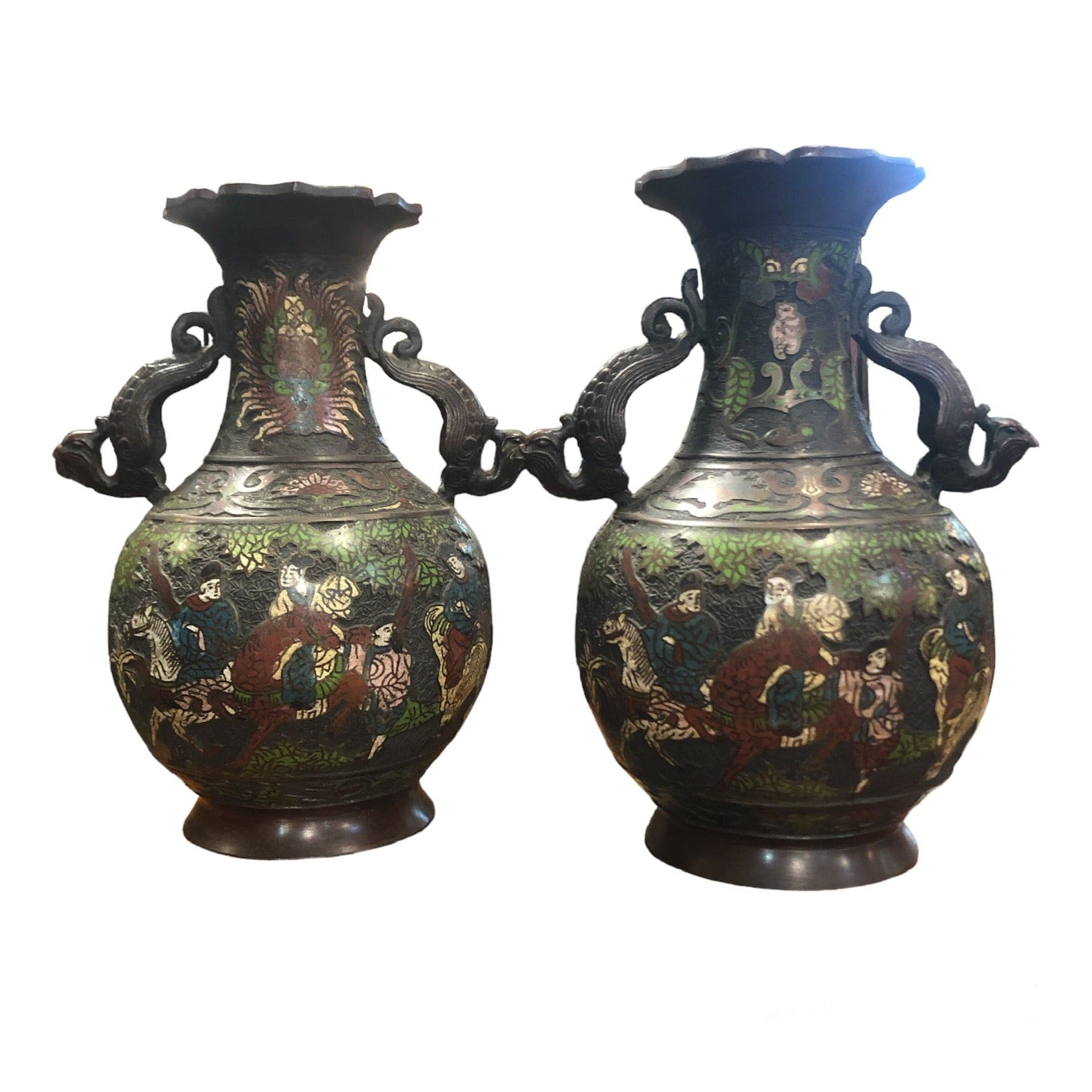 Bellos jarrones cloissoné con asas de pájaros y diseño de flores y jinetes a caballo.