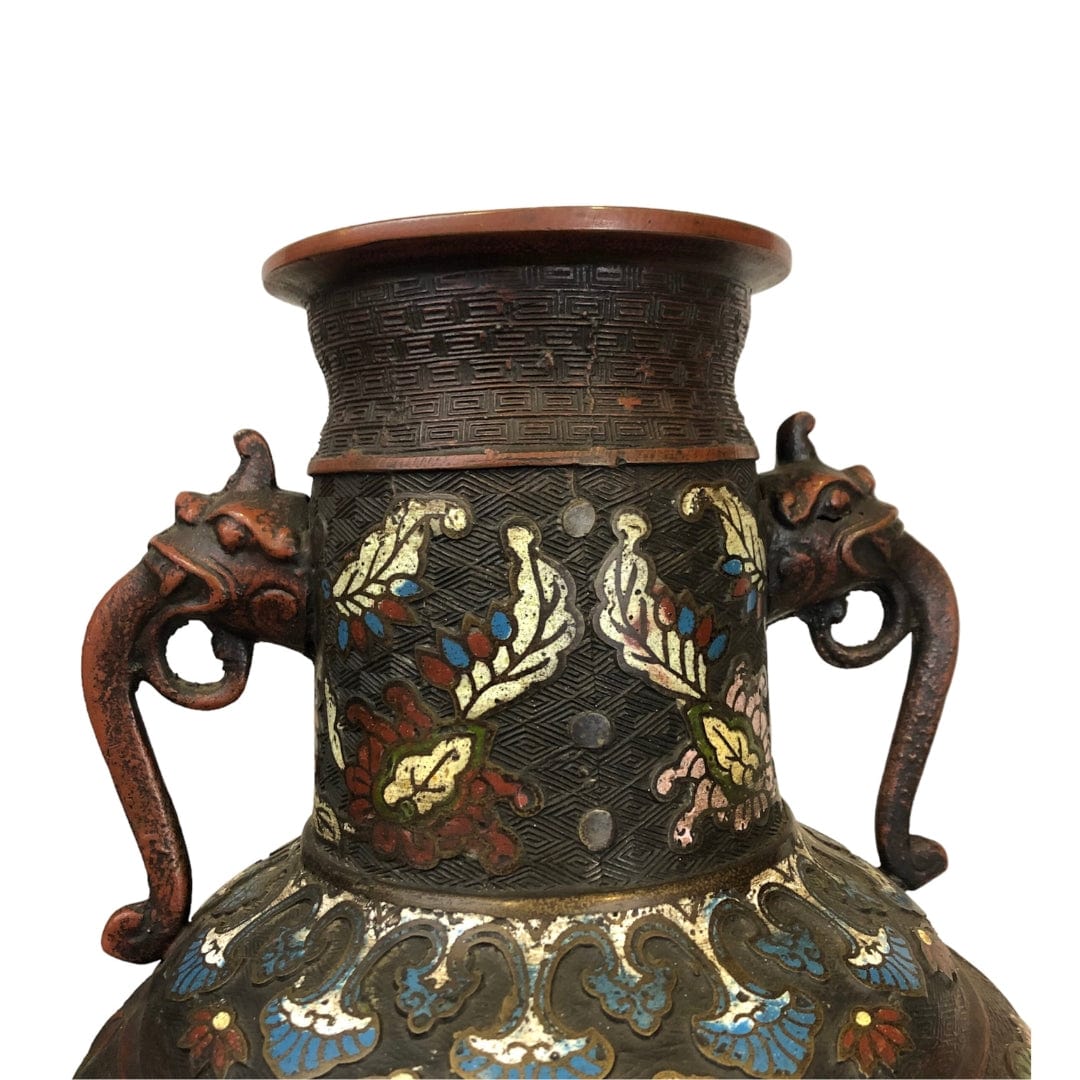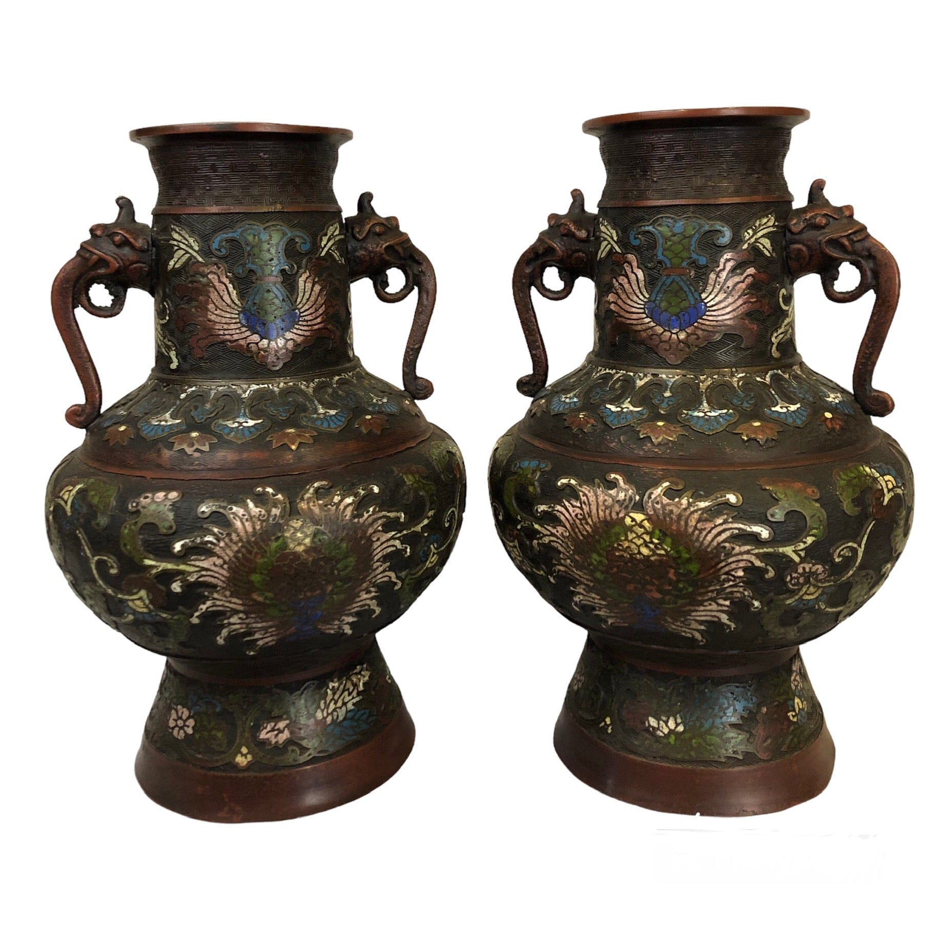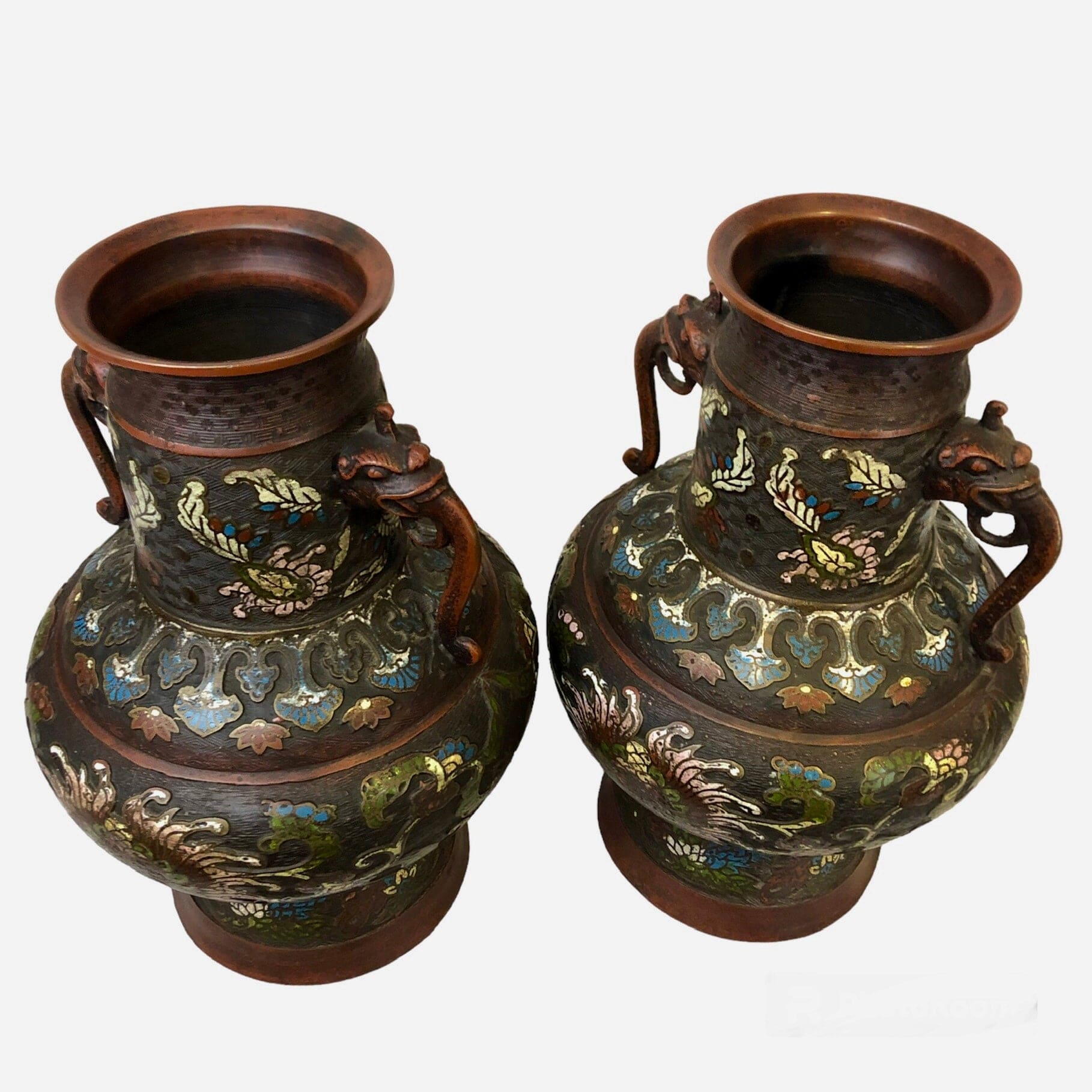 Par de jarrones de bronce esmaltados cloissoné, con bajo relieve. Figura de elefante en los tomadores. Expresivos diseños florales.