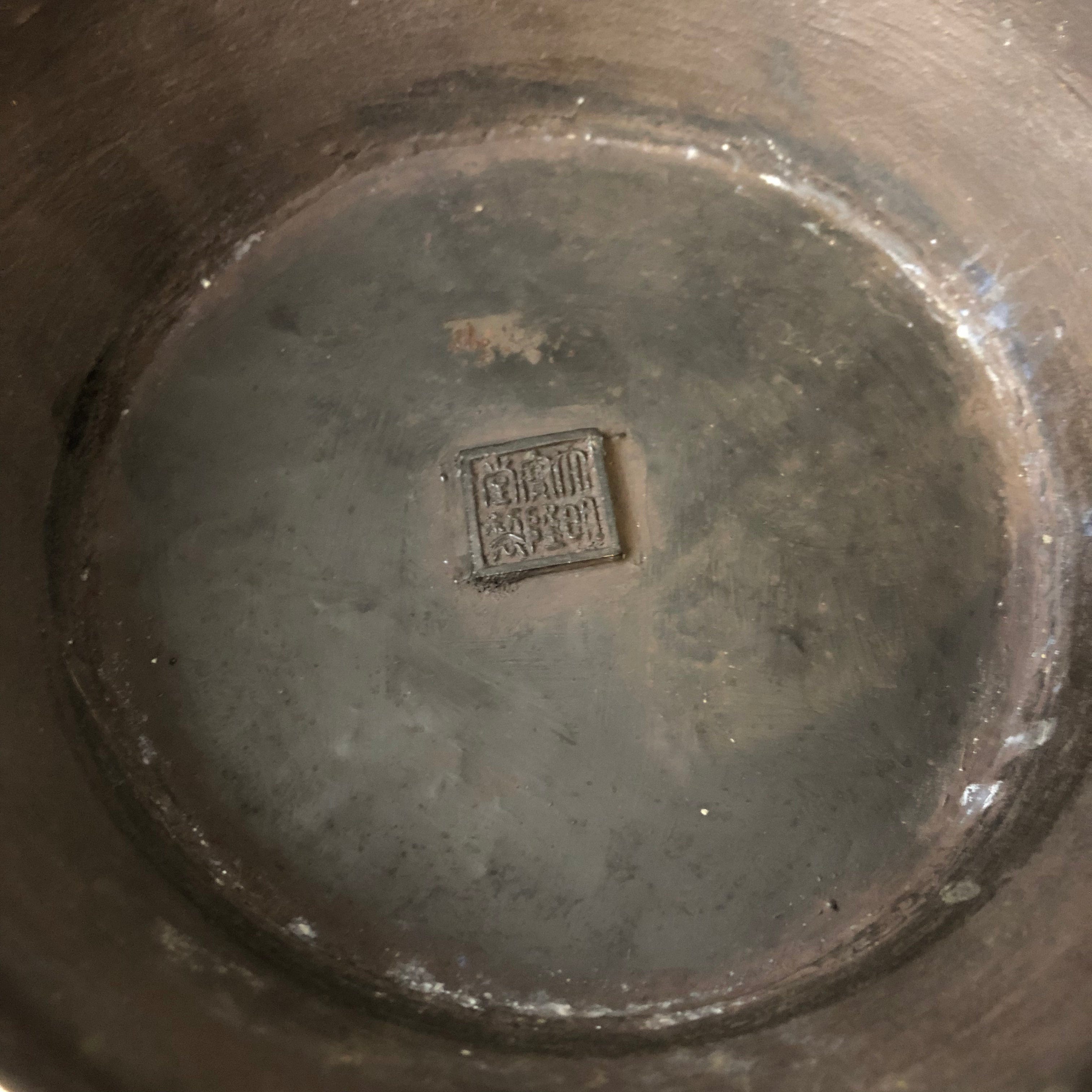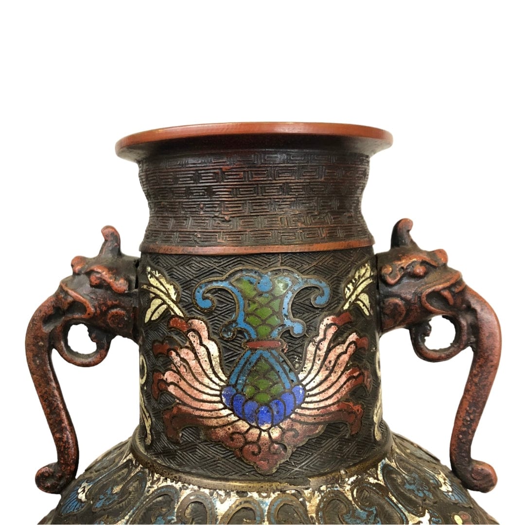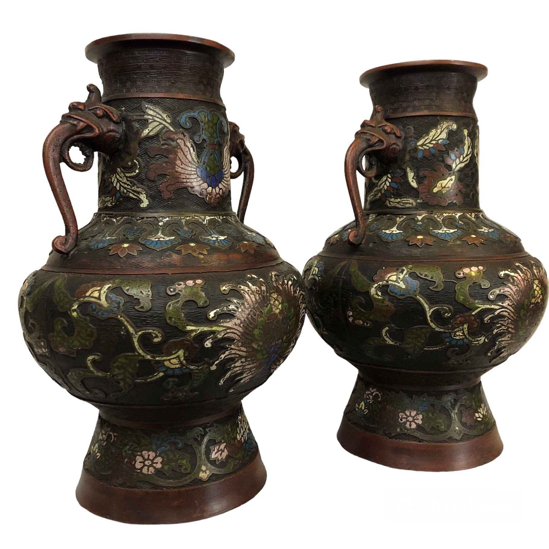 Par de jarrones de bronce esmaltados cloissoné, con bajo relieve. Figura de elefante en los tomadores. Expresivos diseños florales.