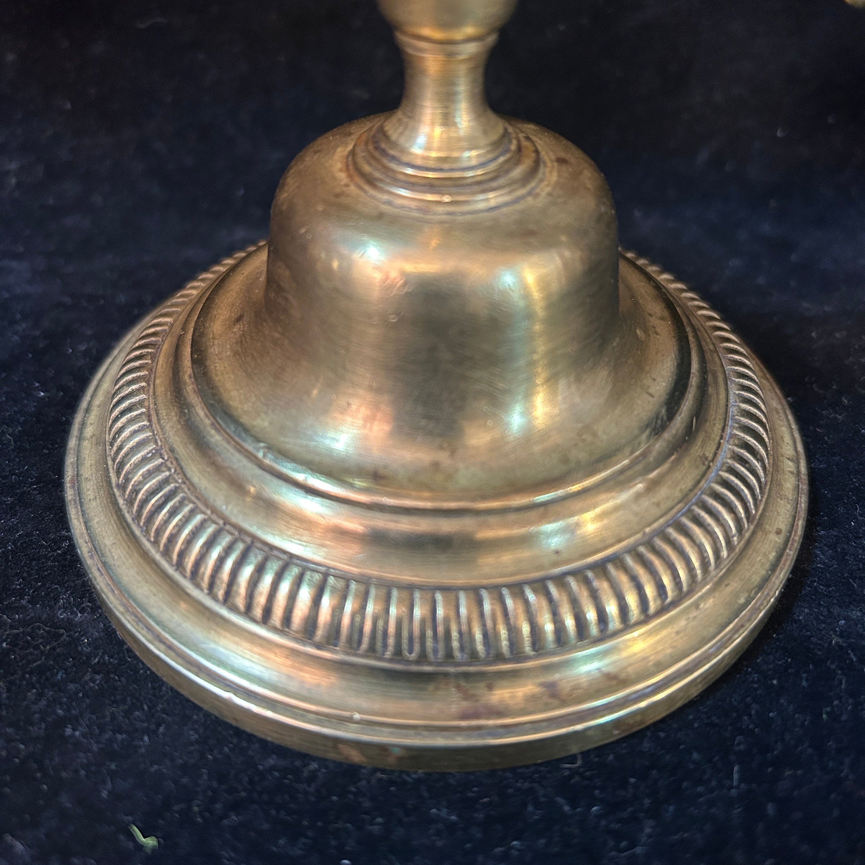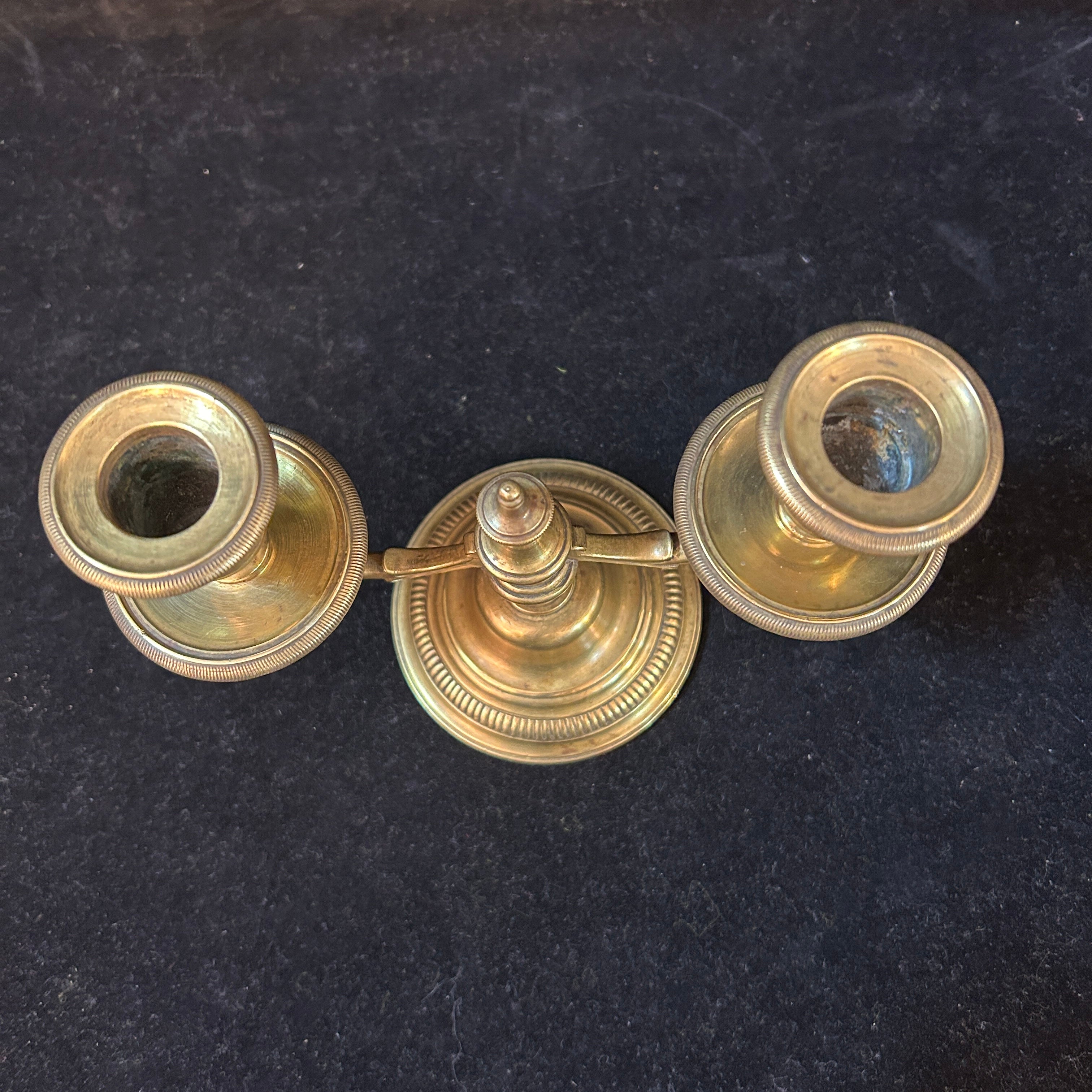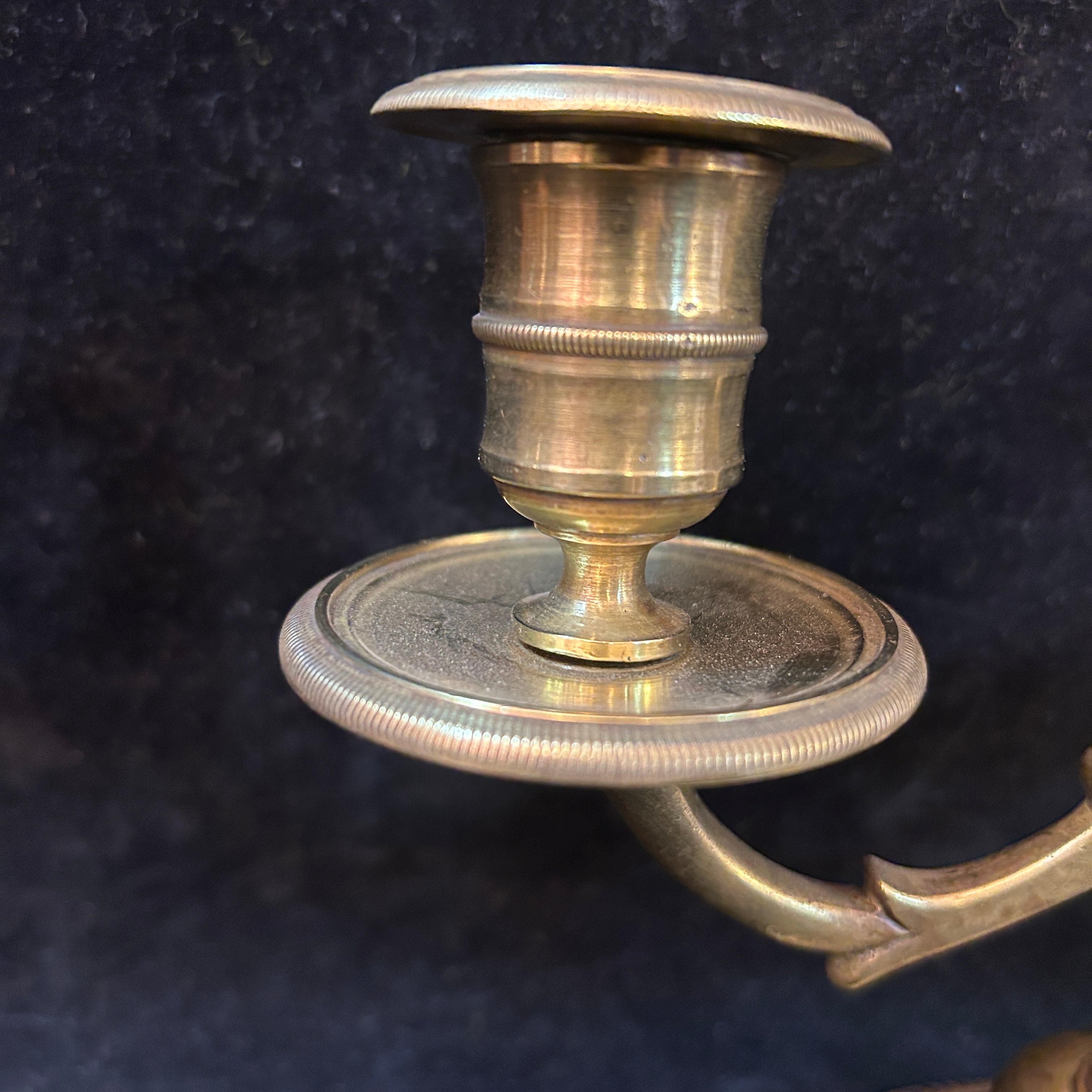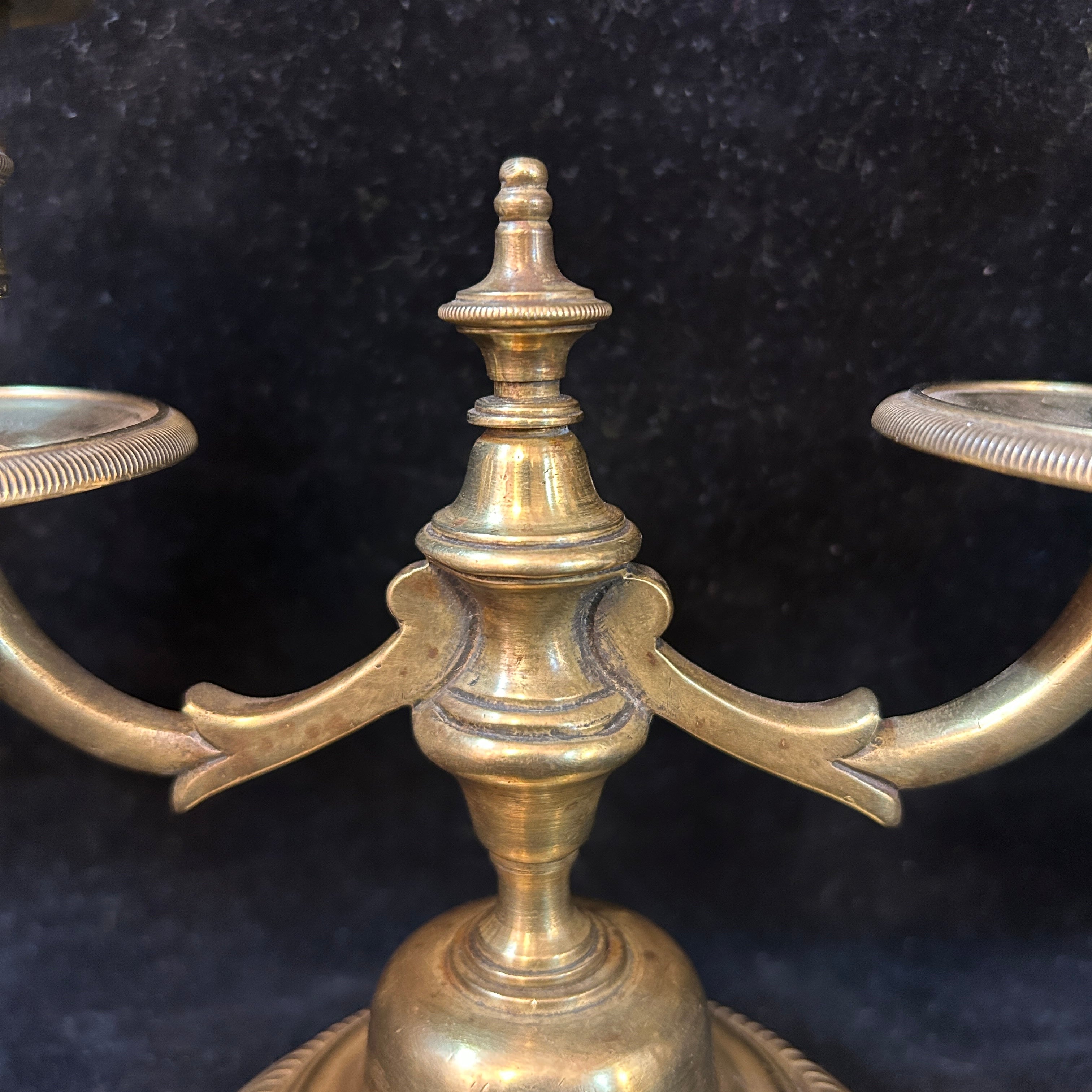 Par de elegantes candelabros gemelos franceses de bronce con base maciza.