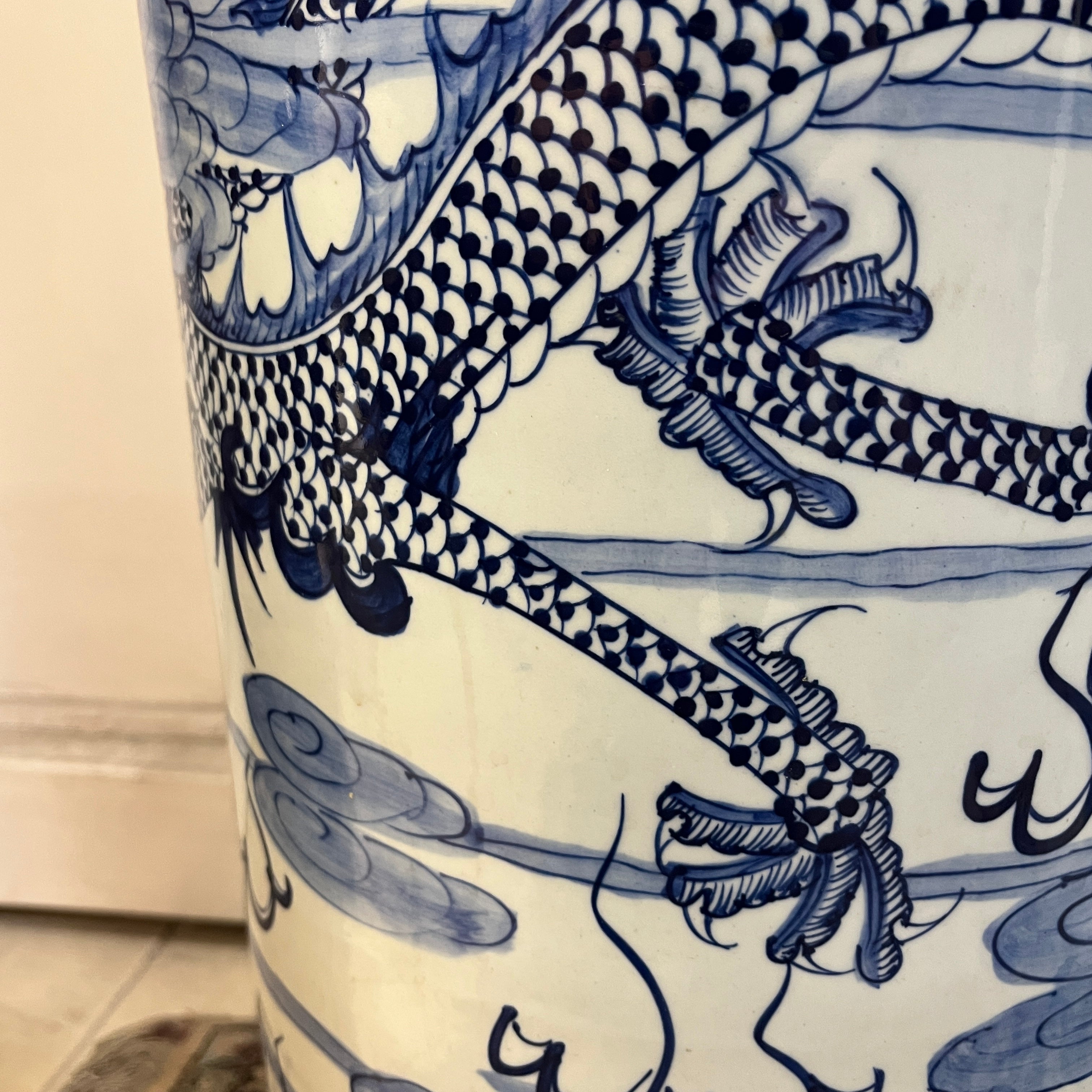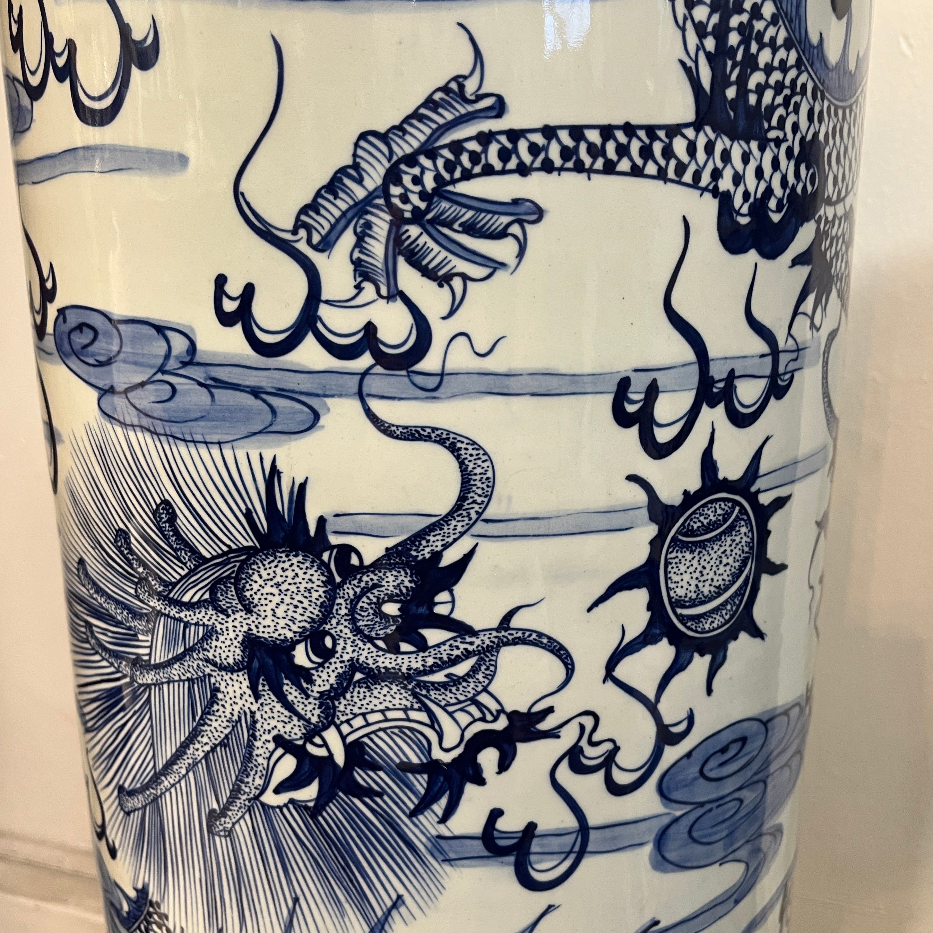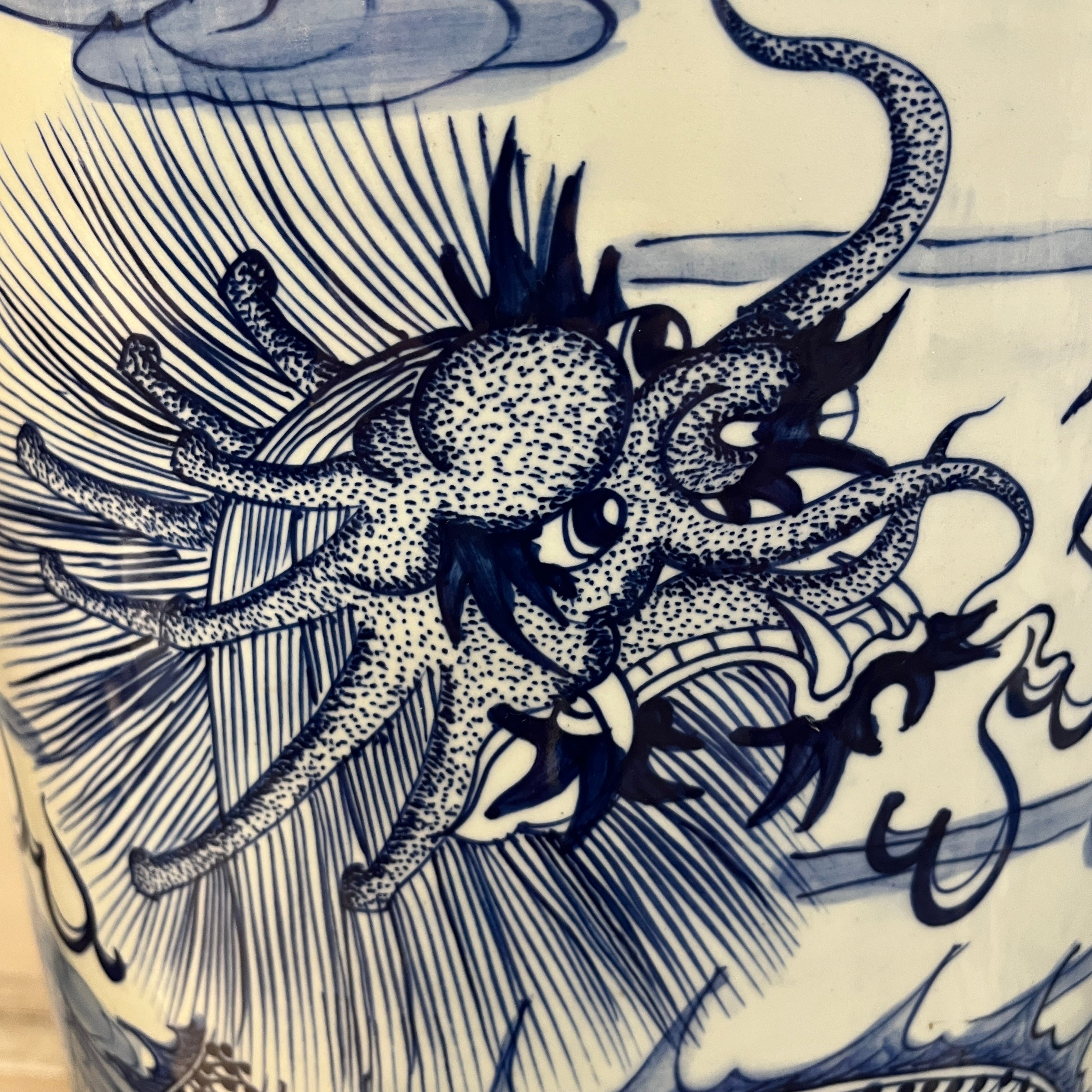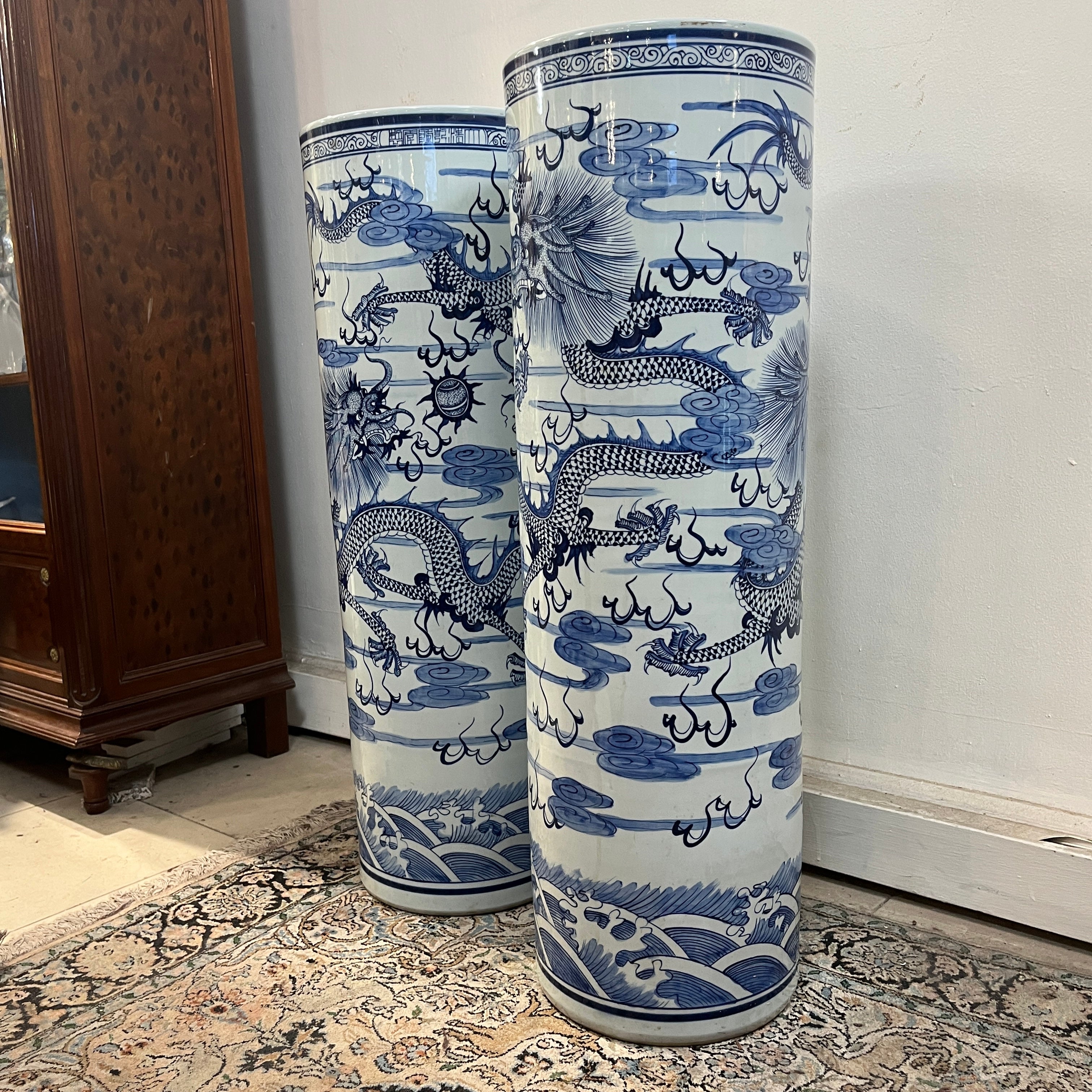 Par de jarrones cilíndricos de porcelana china, con un increíble diseño con motivos de dragones, representados con texturas detalladas en puntillismo y patrones de escamas. En la parte inferior se pueden ver las olas de mar y más arriba el dragón, volando entre nubes.