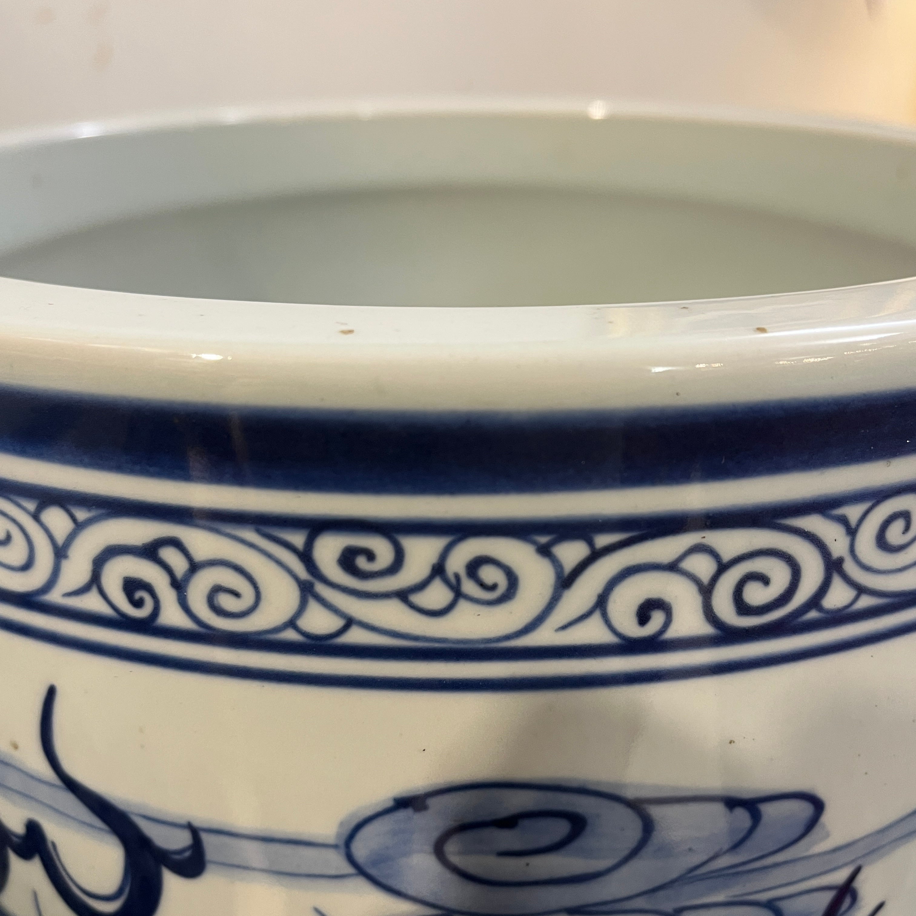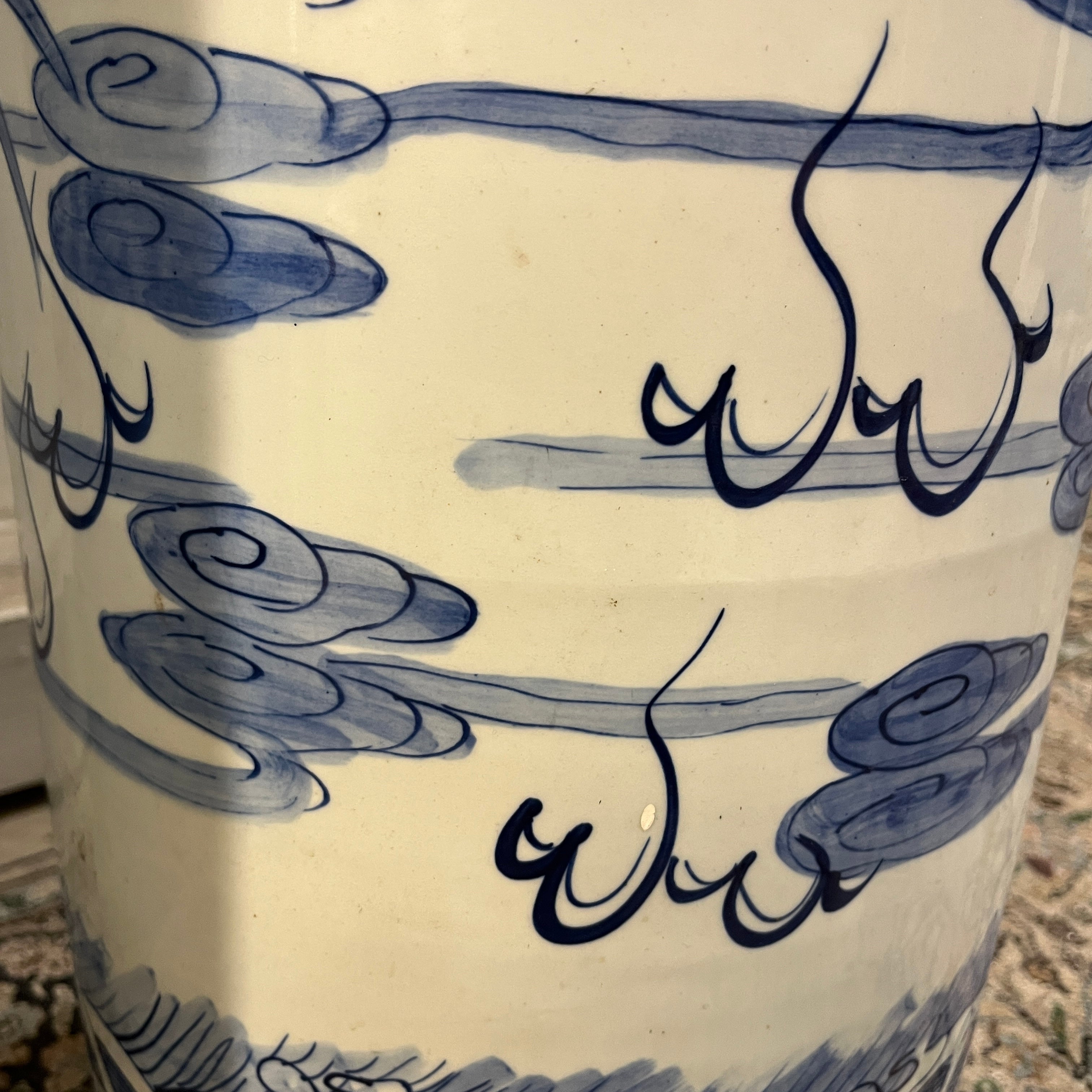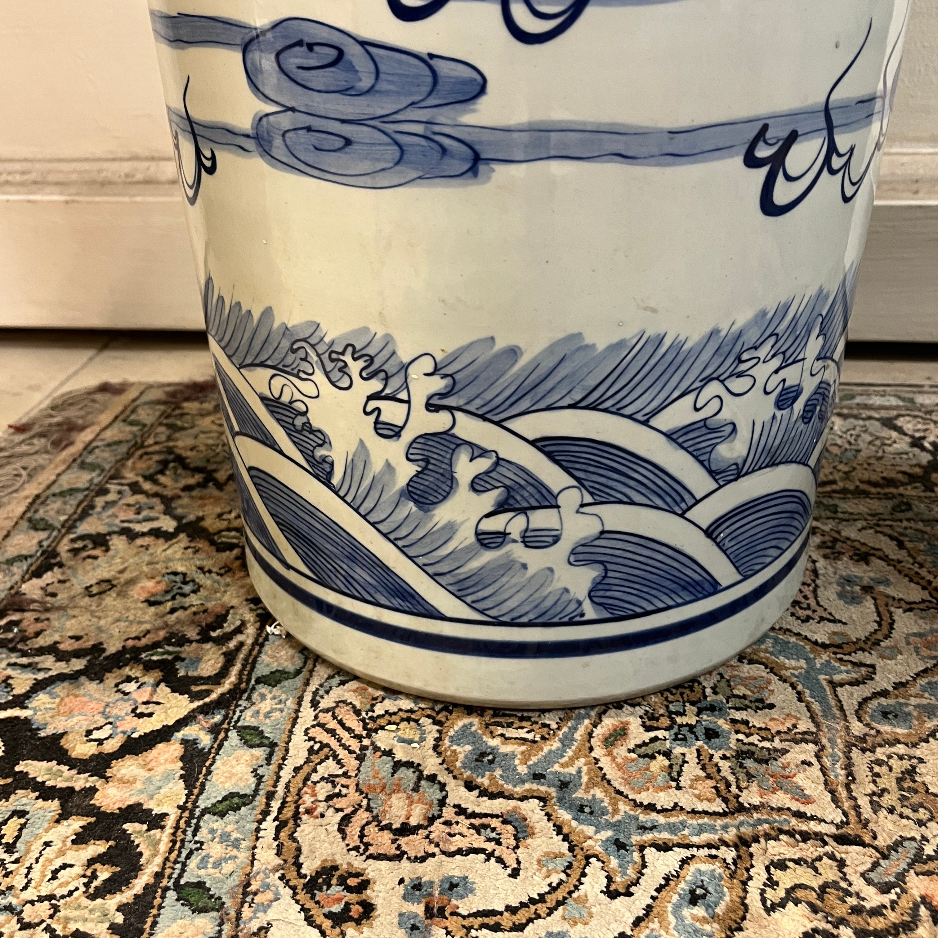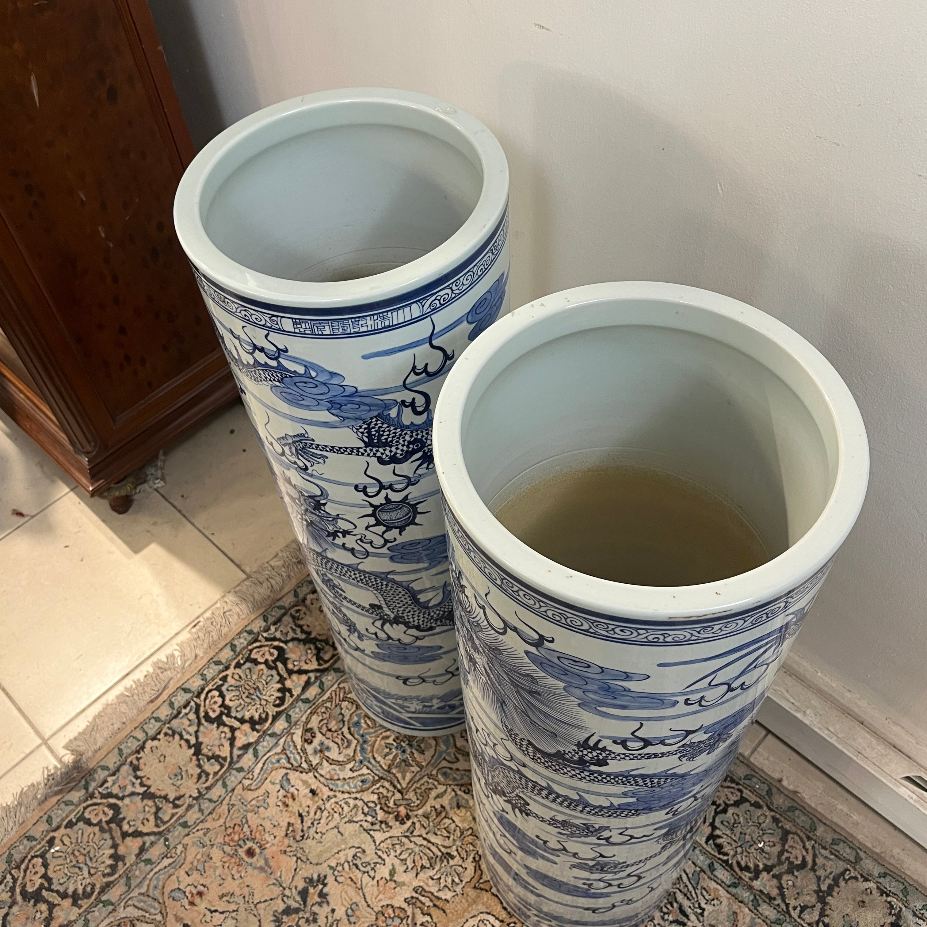 Par de jarrones cilíndricos de porcelana china, con un increíble diseño con motivos de dragones, representados con texturas detalladas en puntillismo y patrones de escamas. En la parte inferior se pueden ver las olas de mar y más arriba el dragón, volando entre nubes.