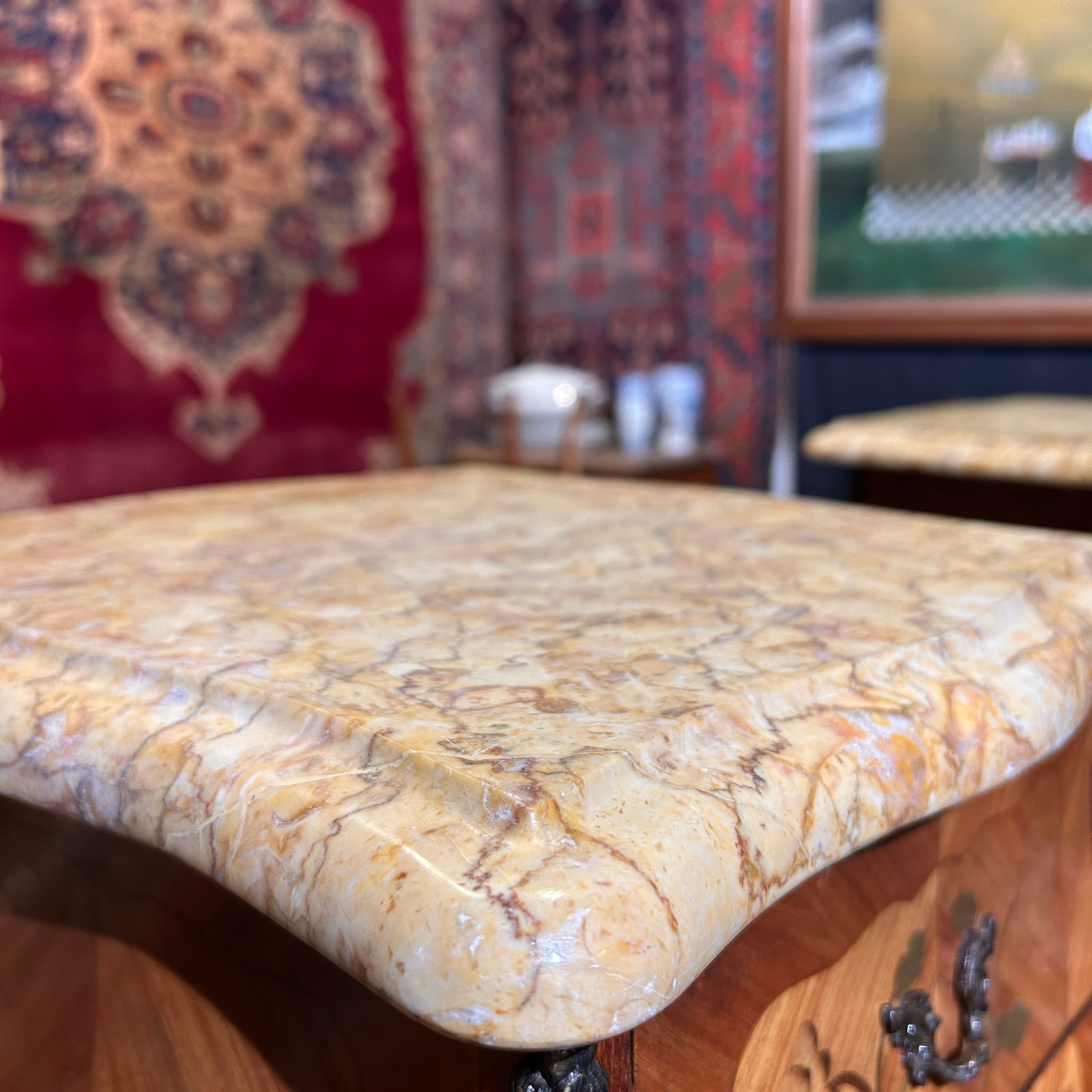 Petit veladores Luis XV bombé marquetería mármol y dos cajones