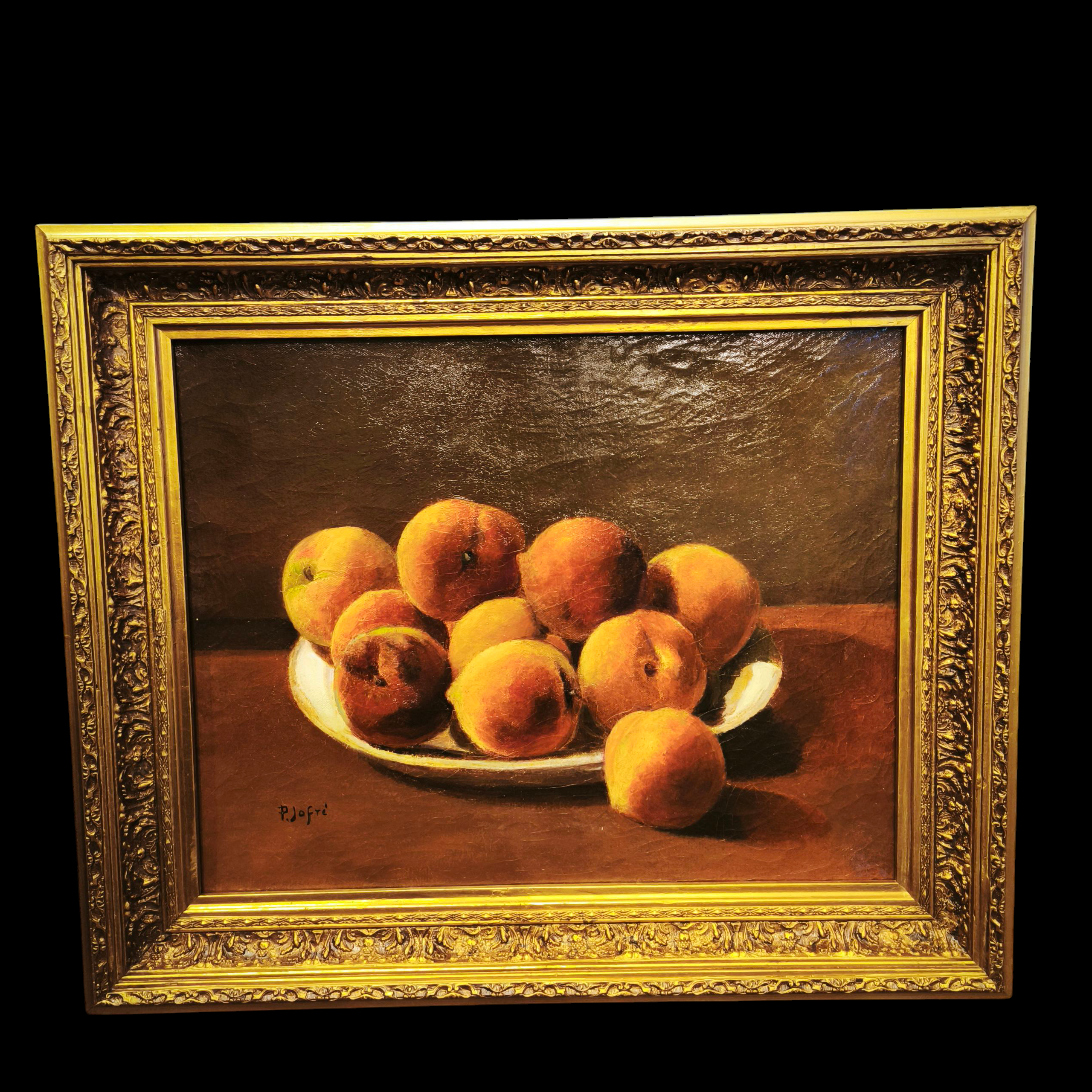 Óleo sobre tela del reconocido artista chileno Pedro Jofré, representando un bodegón de duraznos dentro de una fuente blanca. Se trata de una composición muy cálida, ya que la mesa y el fondo también tiene un fondo anaranjado y café, como los duraznos. La obra tiene un elegante Marco de madera tallada en relieve y pintada de dorado.