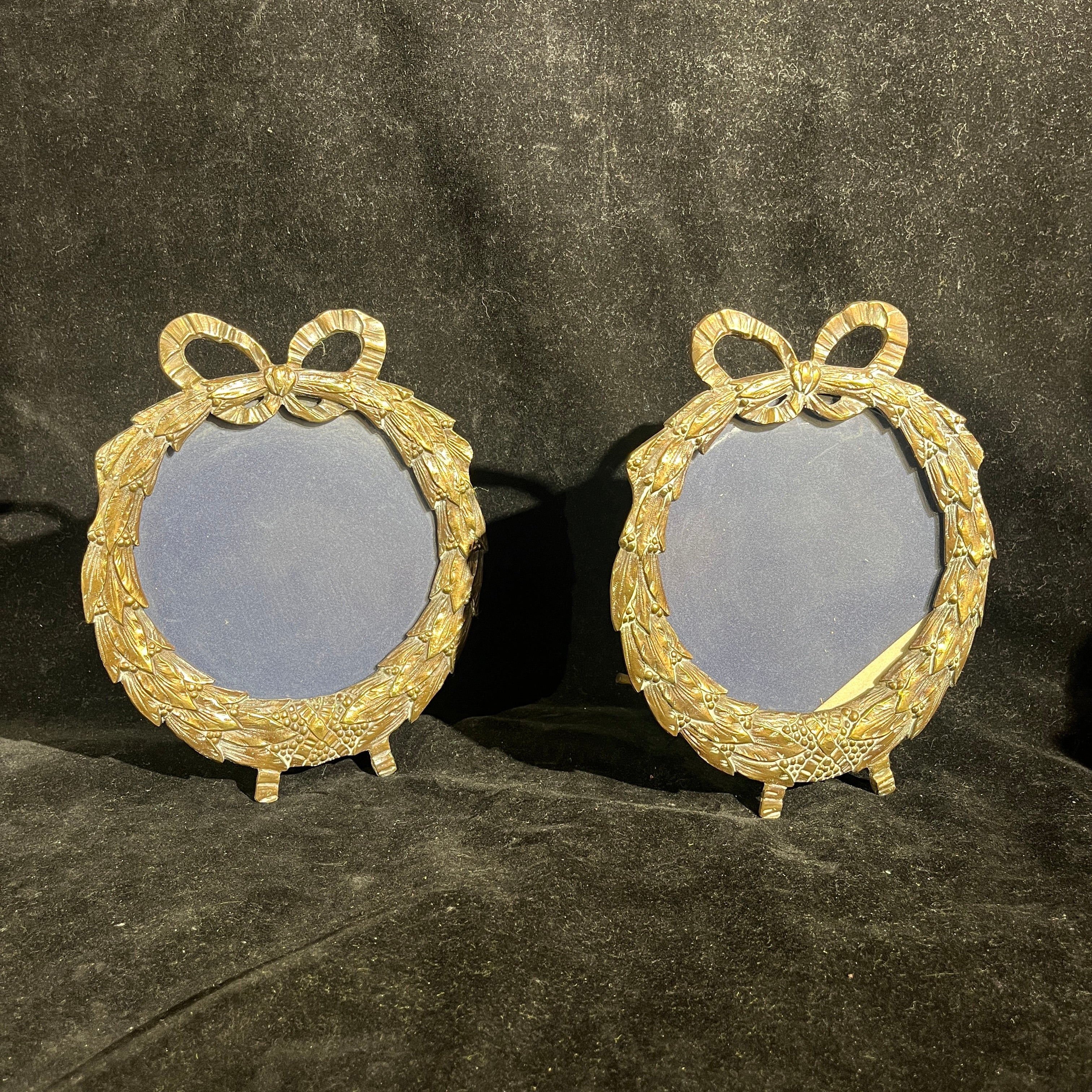 Pareja de bellos portarretratos circulares en bronce con diseño tallado en forma de guirnalda con cinto en su parte superior. Las piezas tienen un vidrio para proteger el retrato y y su parte posterior tiene una pata de sobrio diseño en líneas rectas.