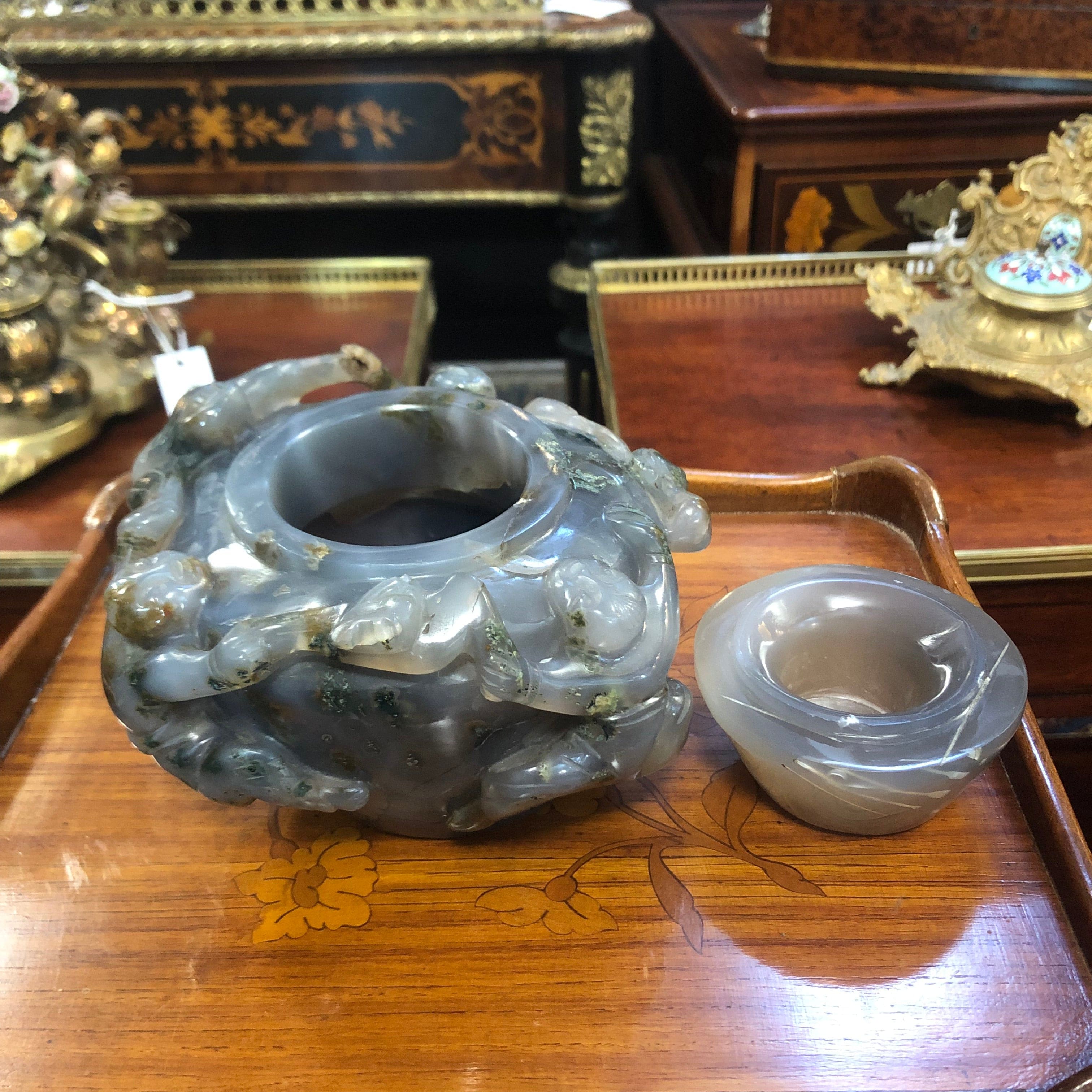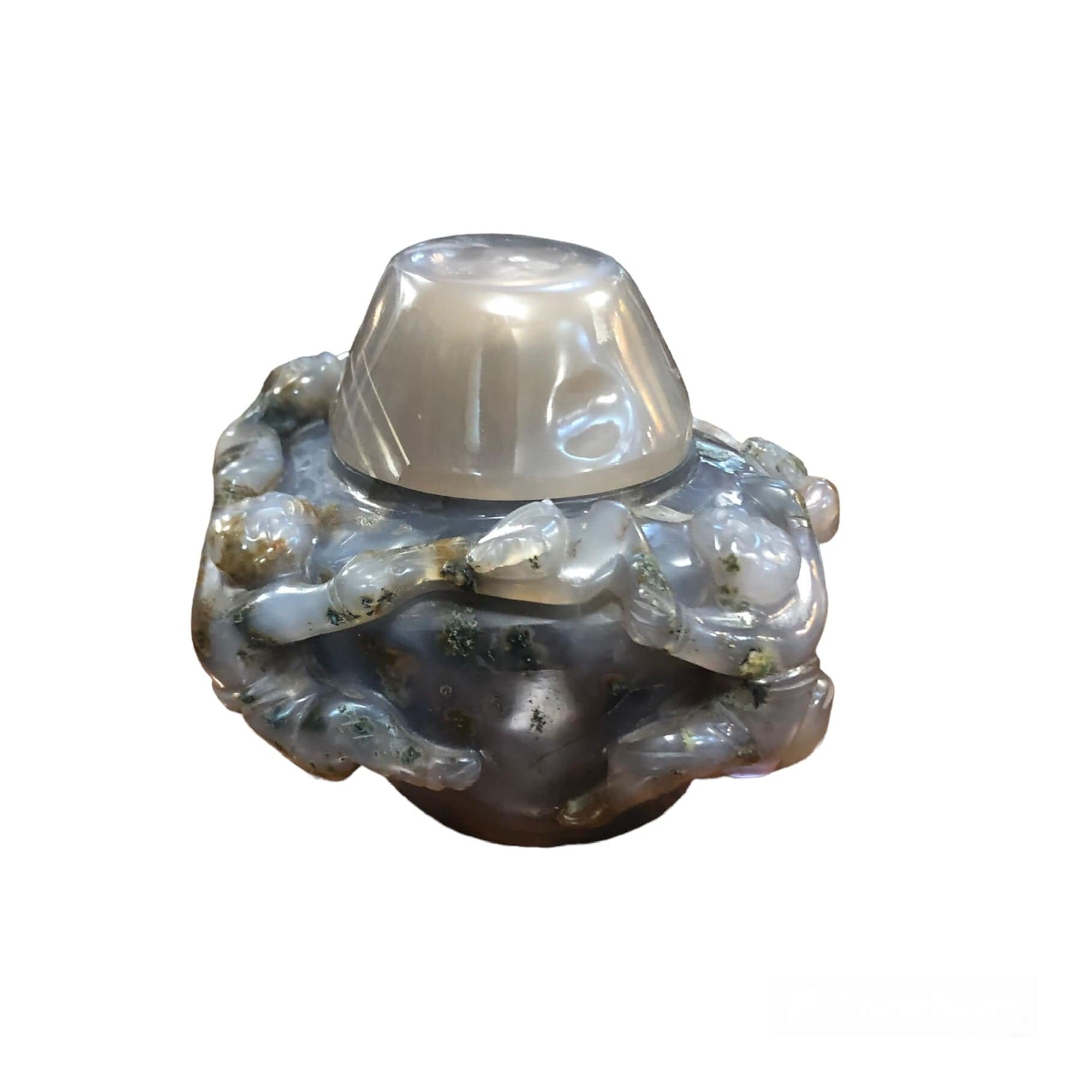 Bella caja con tapa en piedra Jade gris, hermoso diseño con hombres en ronda.