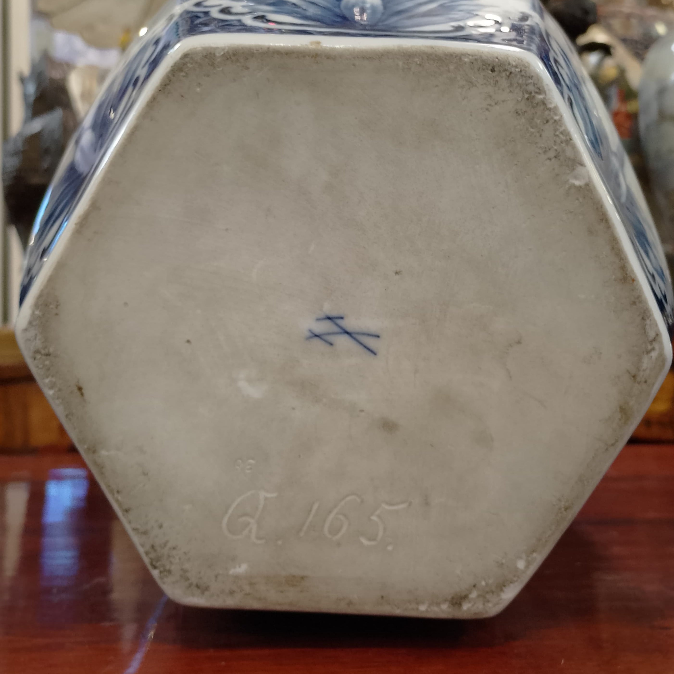 Hermoso potiche de porcelana Meissen en azul y blanco con motivos florales. Cuenta con un tapón de corona removible y el sello de la prestigiosa fábrica en su base.