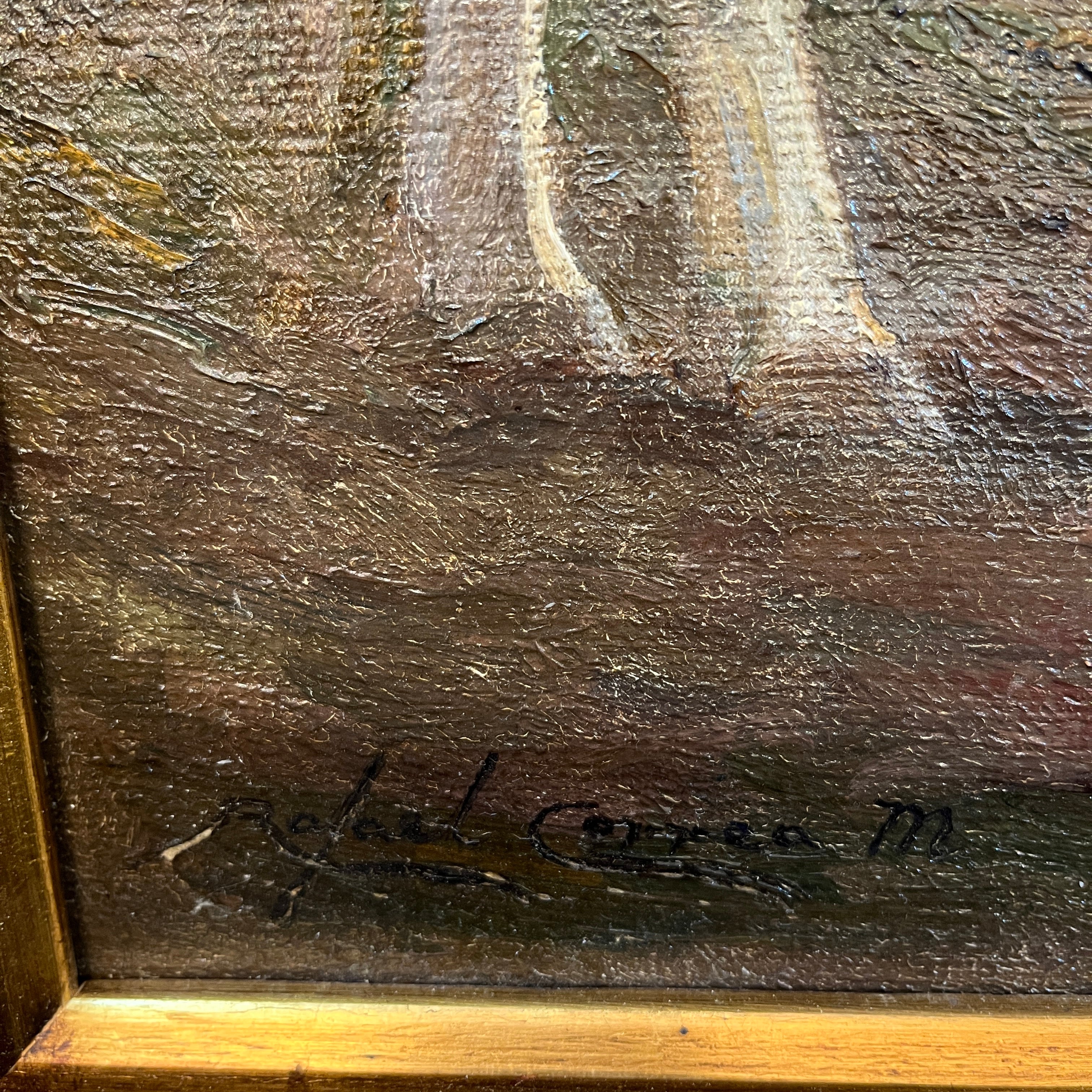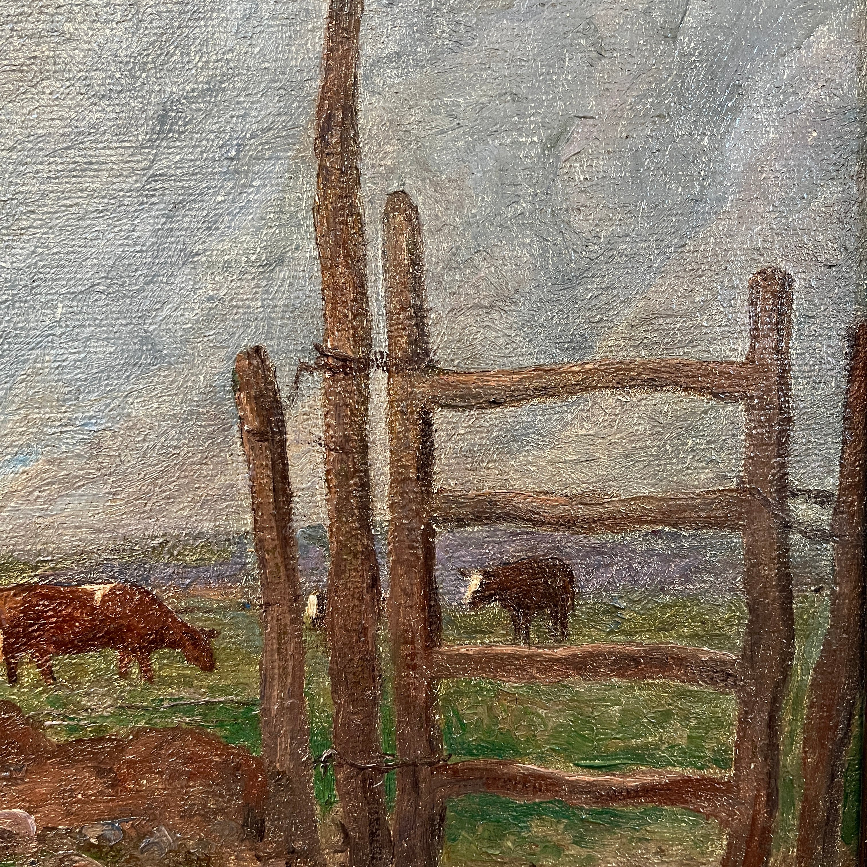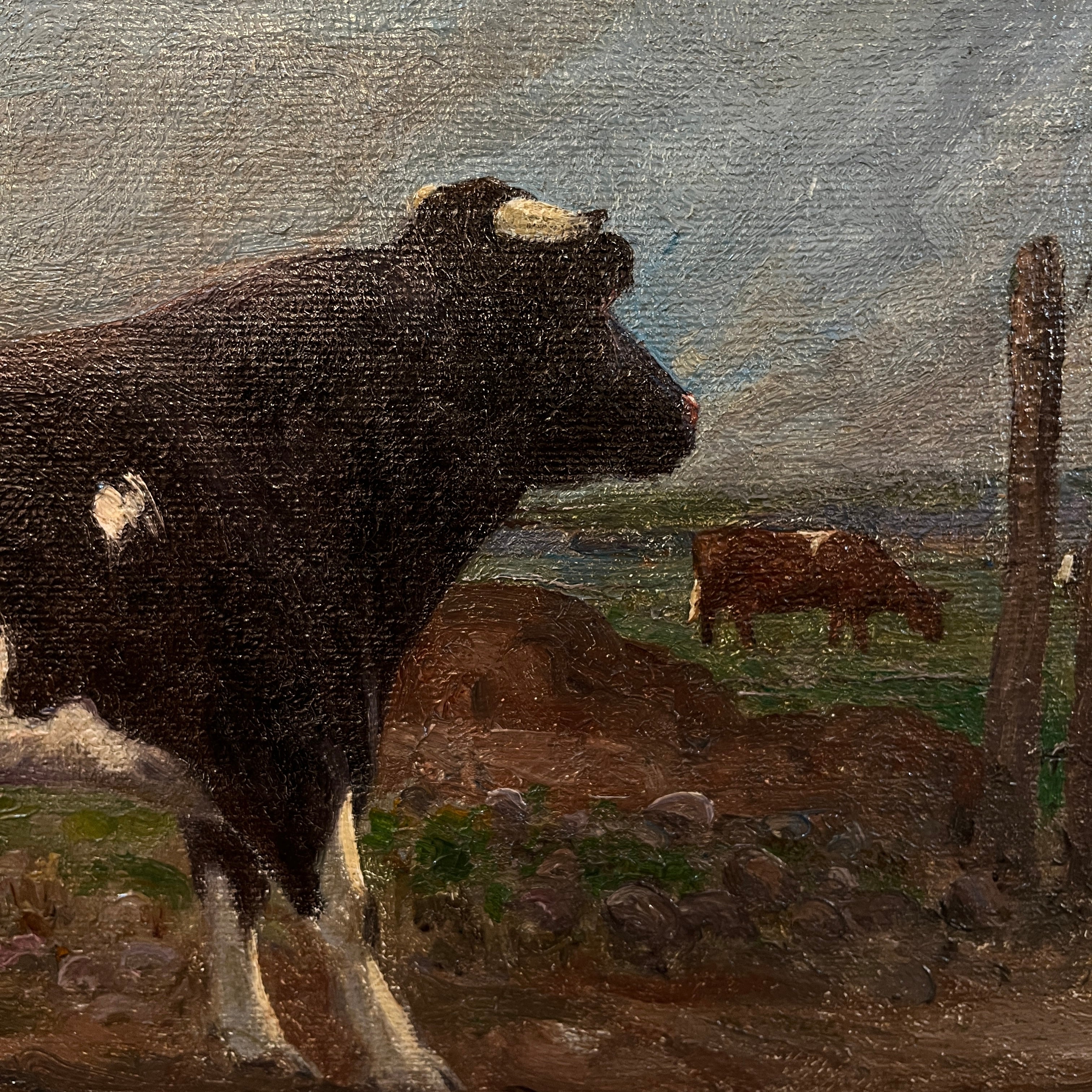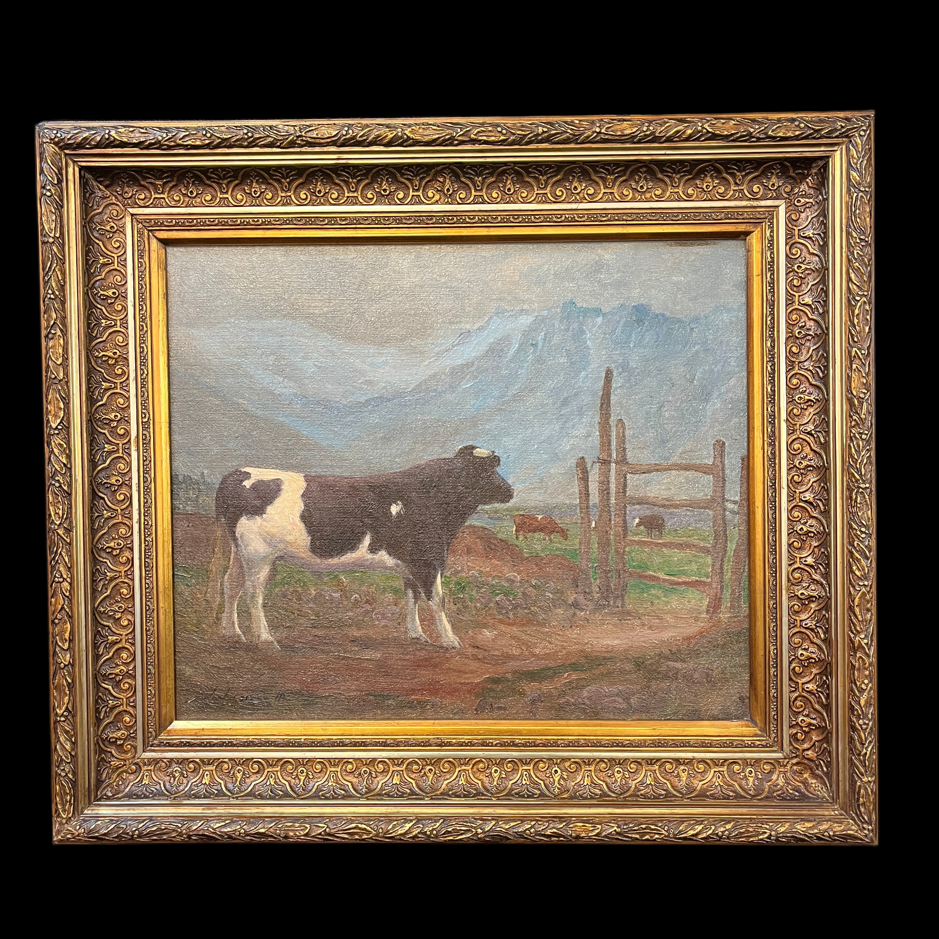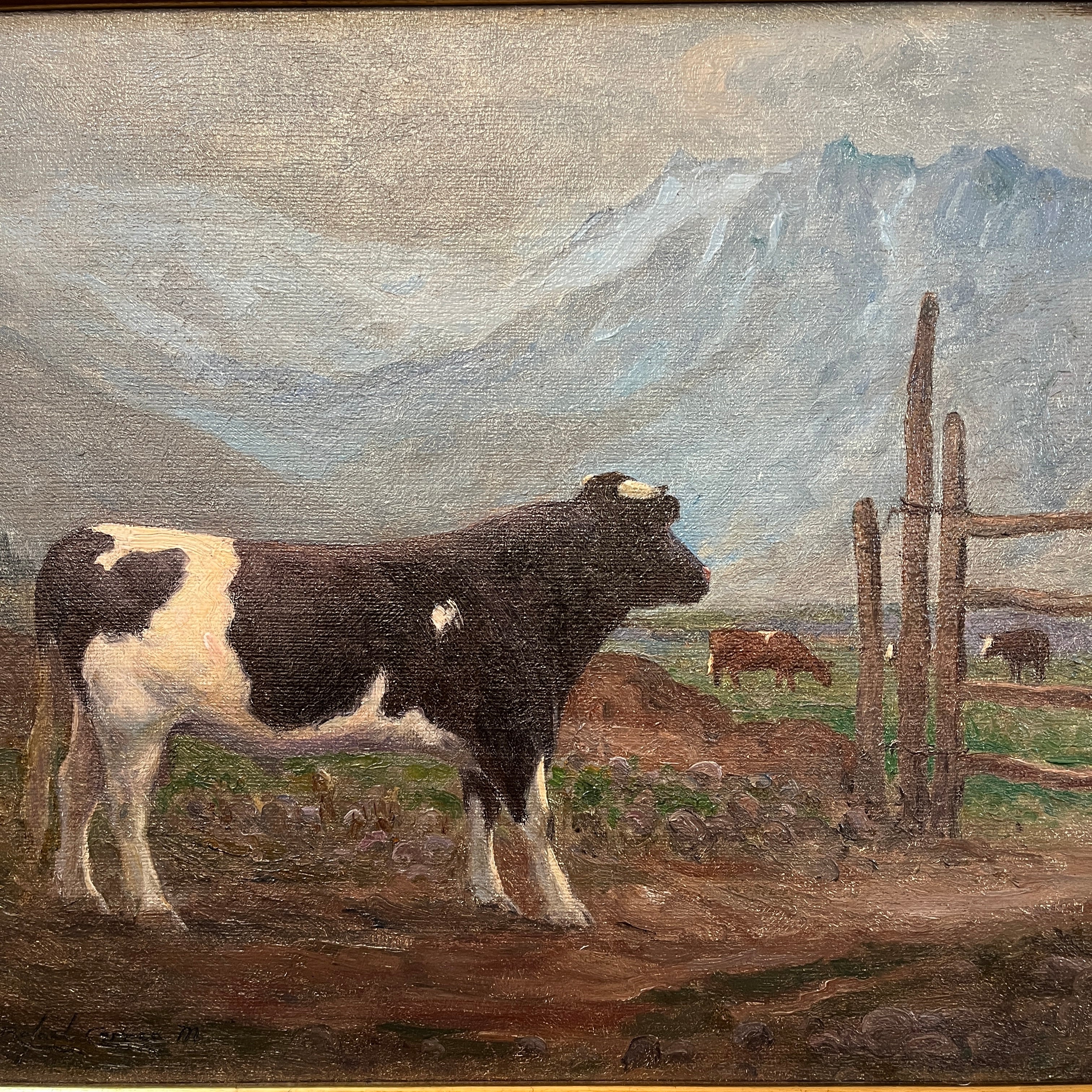 El pintor chileno Rafael Correa nos presenta esta magnífica escena tradicional de un grupo de vacas en un campo chileno. Podemos ver una vaca en primer plano dirigiendo su mirada a la cordillera y más lejos otras vacas pastando.