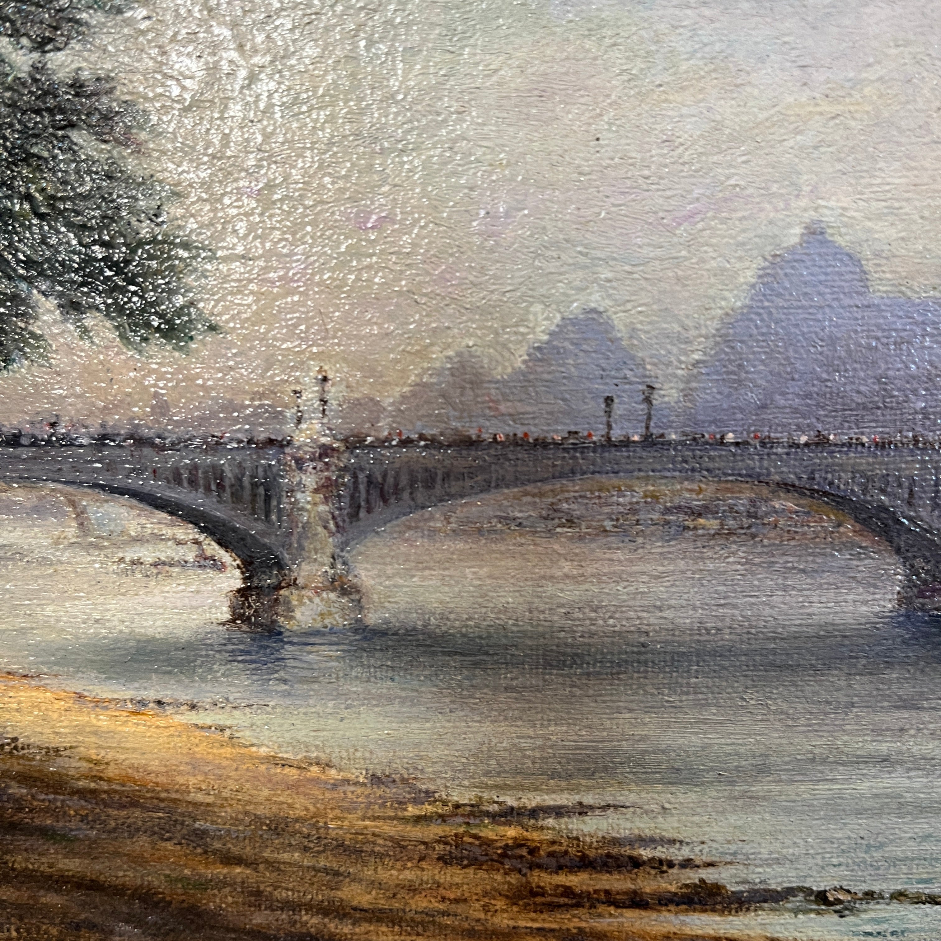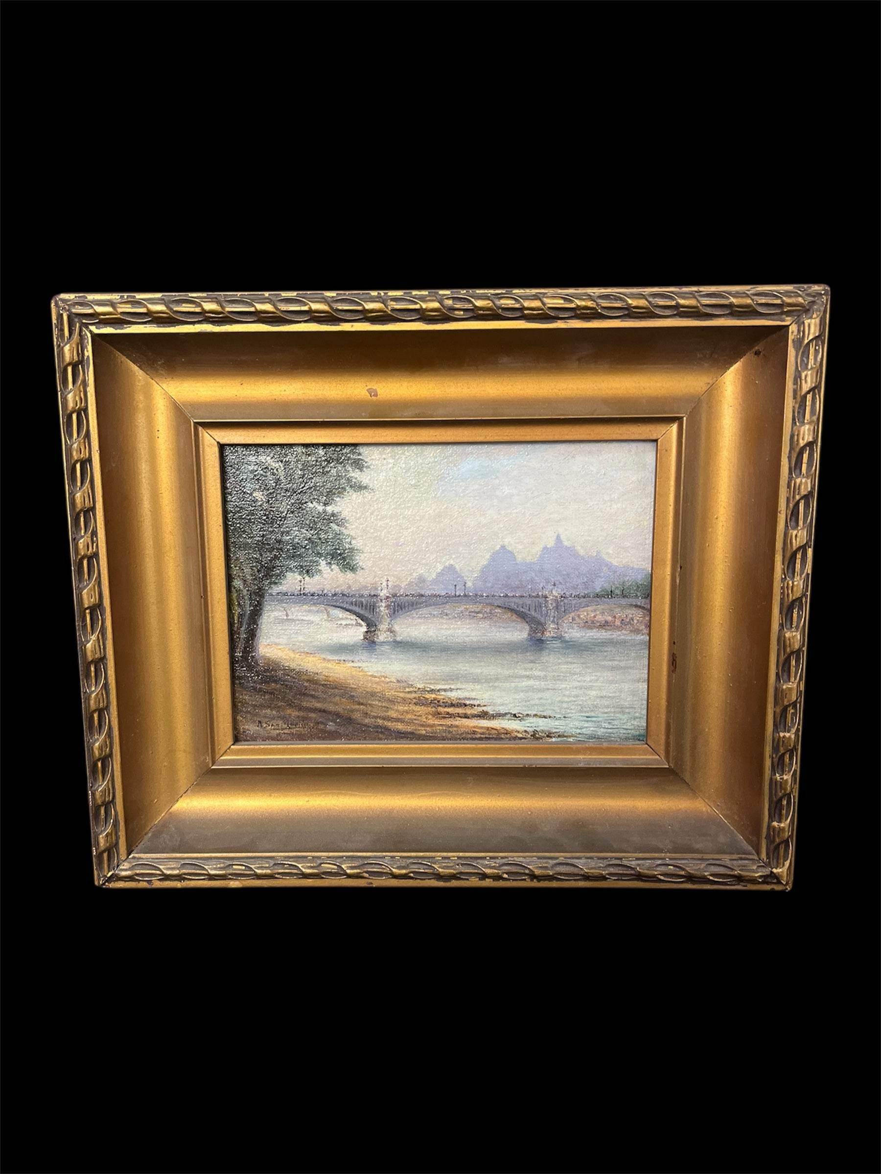 Óleo sobre madera del pintor chileno Rafael San Martín, representando una escena parisina del puente X. La obra de pequeño formato, pintada en 1933, hace una representación detallista y luminosa del paisaje, dándole mucho brillo y reflejo a los elementos. La obra está enmarcada en madera tallada en relieves y terminada de elegante dorado. En el reverso del marco se indica el nombre del artista, el título de la obra, la fecha en la que fue pintada y su título “Paris”, aclarando también que se trata de una copia de otra obra no específicada.