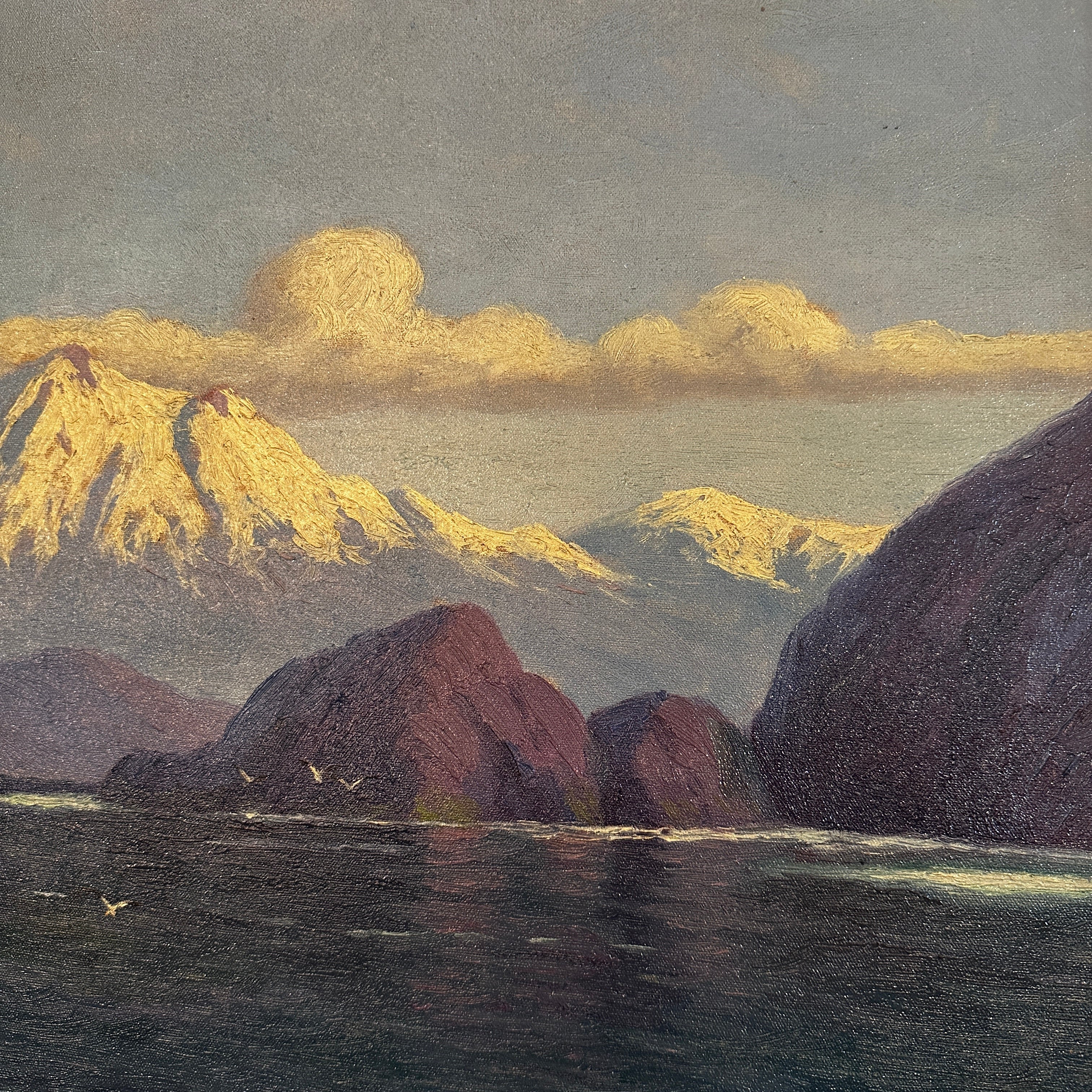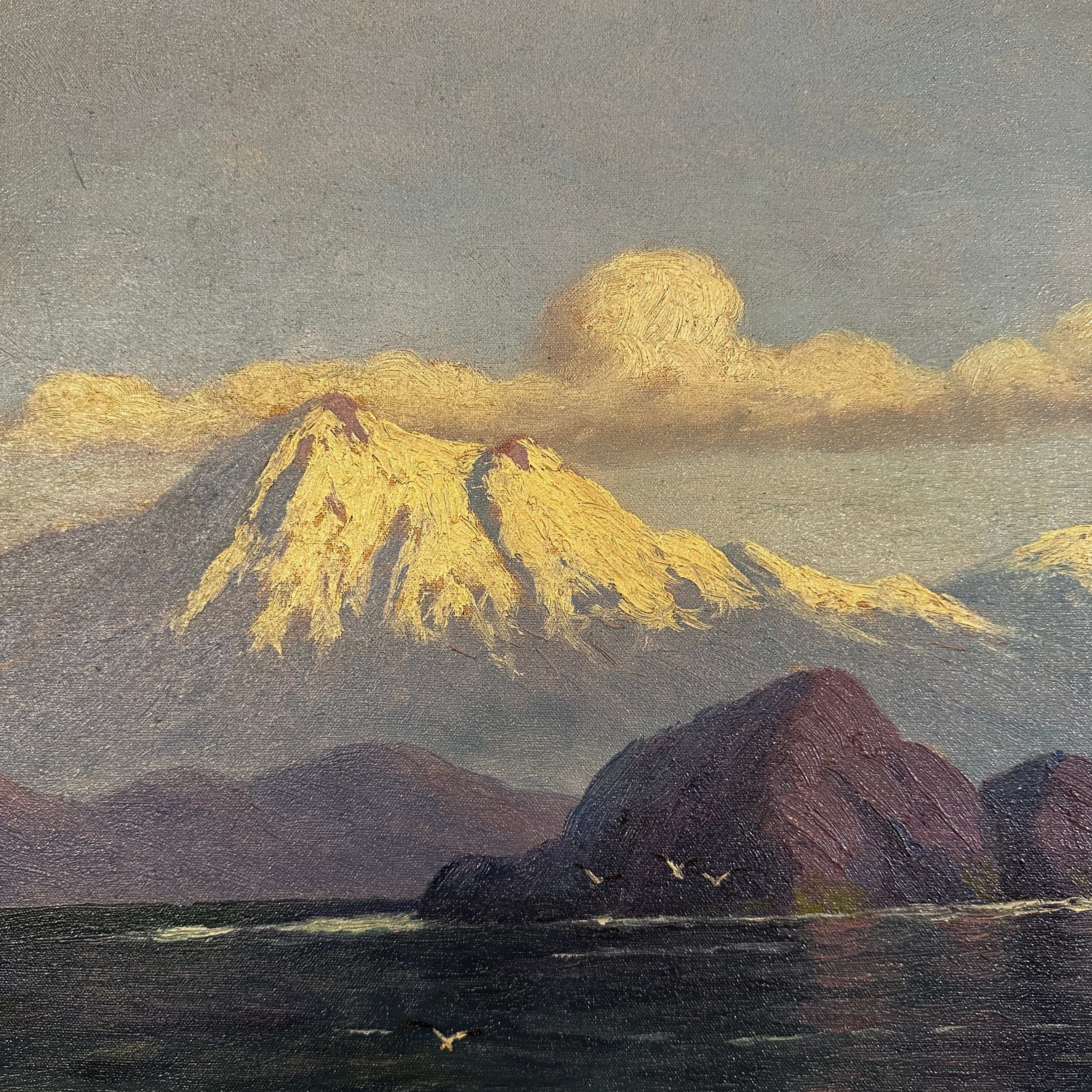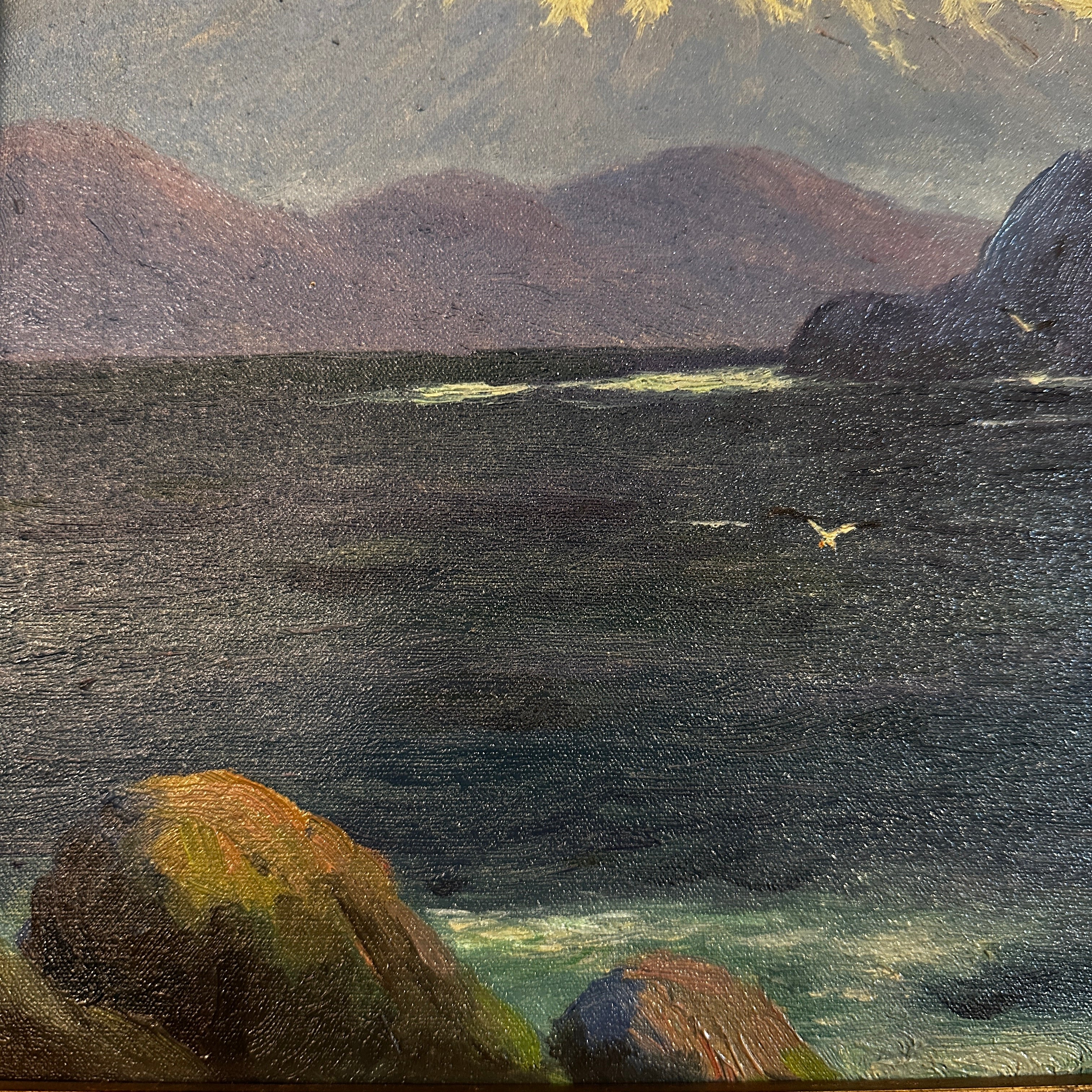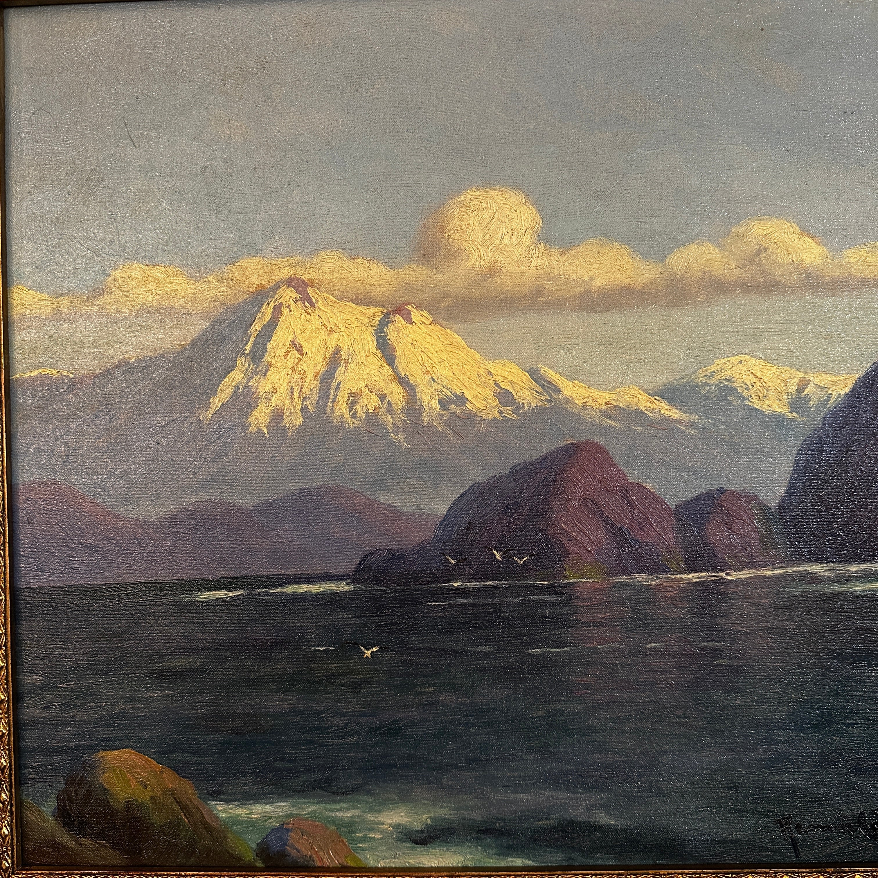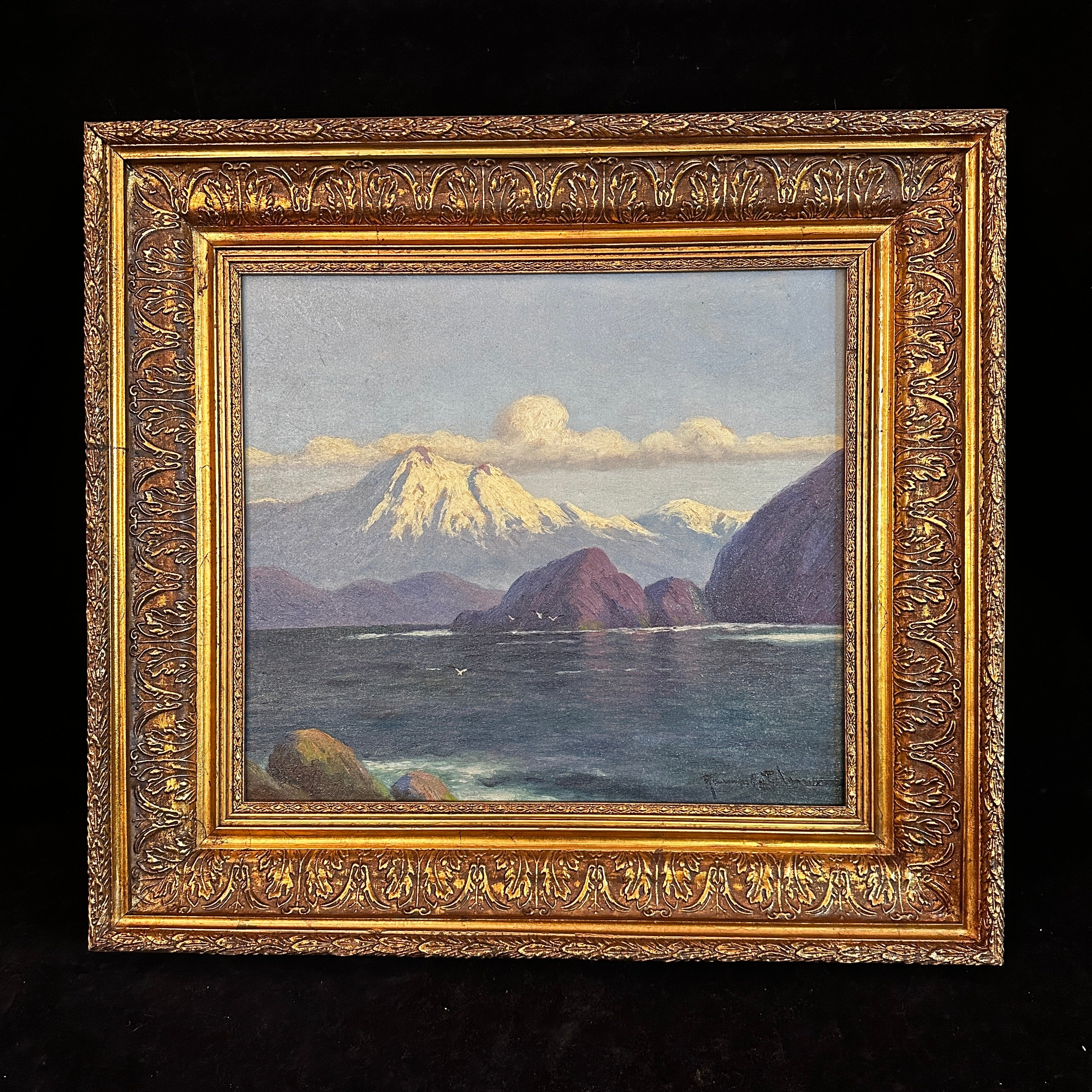 Óleo sobre tela del reconocido artista chileno Benito Ramos Catalán (1888-1964), representando un increíble paisaje del sur de Chile, con la cordillera de fondo, algunos cerros y un lago de un tono azul que sugiere profundidad y movimiento. La obra está enmarcada en madera tallada en relieves y terminada de un elegante tono dorado.