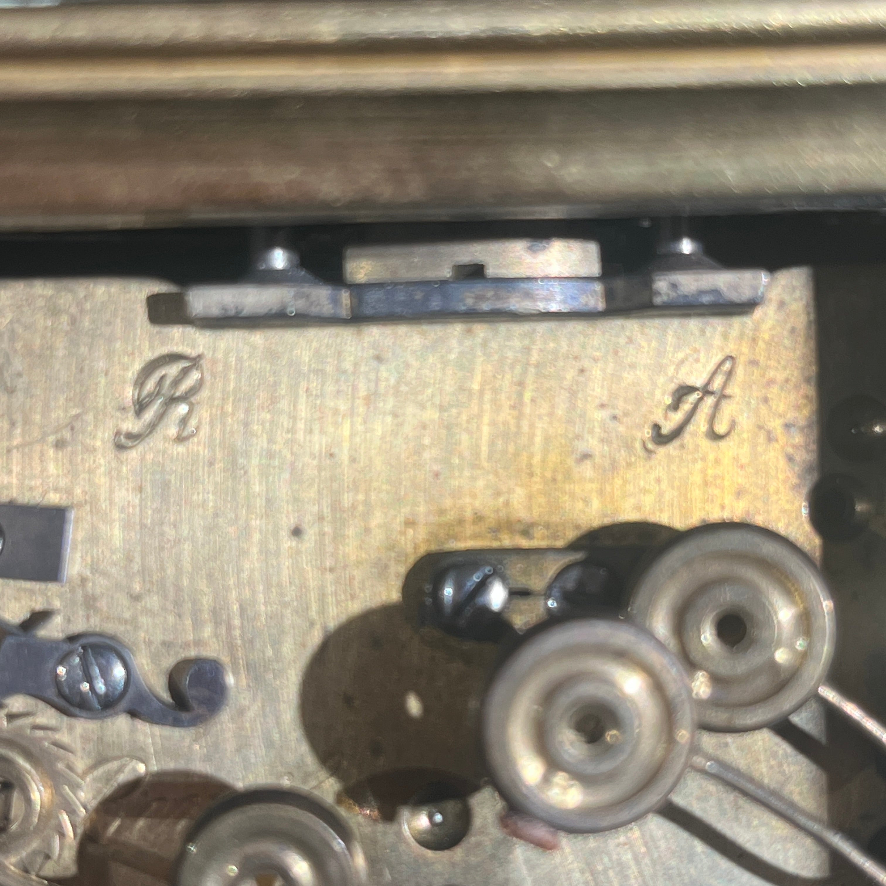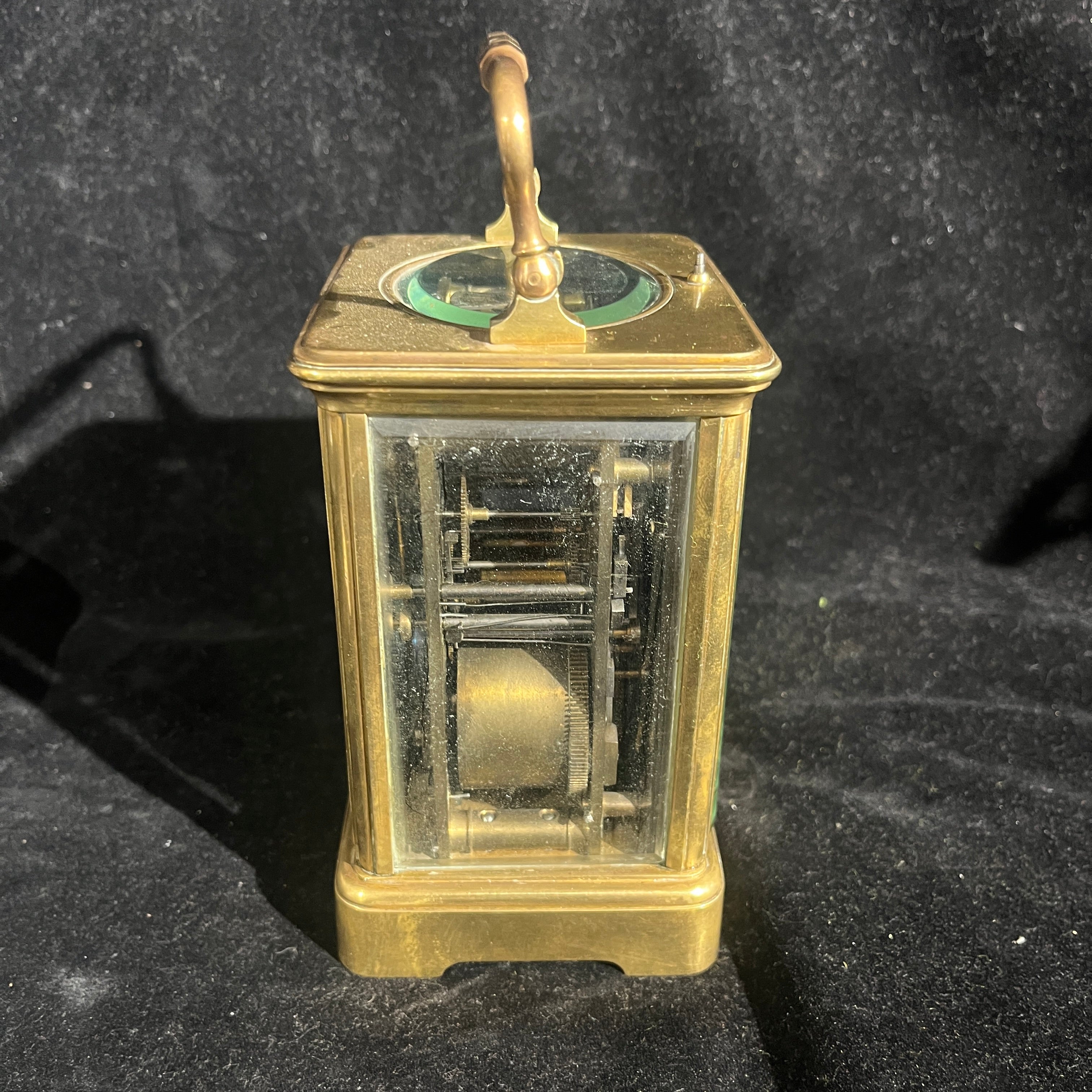 Precioso reloj carruaje francés siglo XIX con estructura de bronce dorado y finos vidrios biselados, que dejan ver su mecanismo interior. La pieza tiene un asa, remarcando su función original para ser llevado en los carruajes.