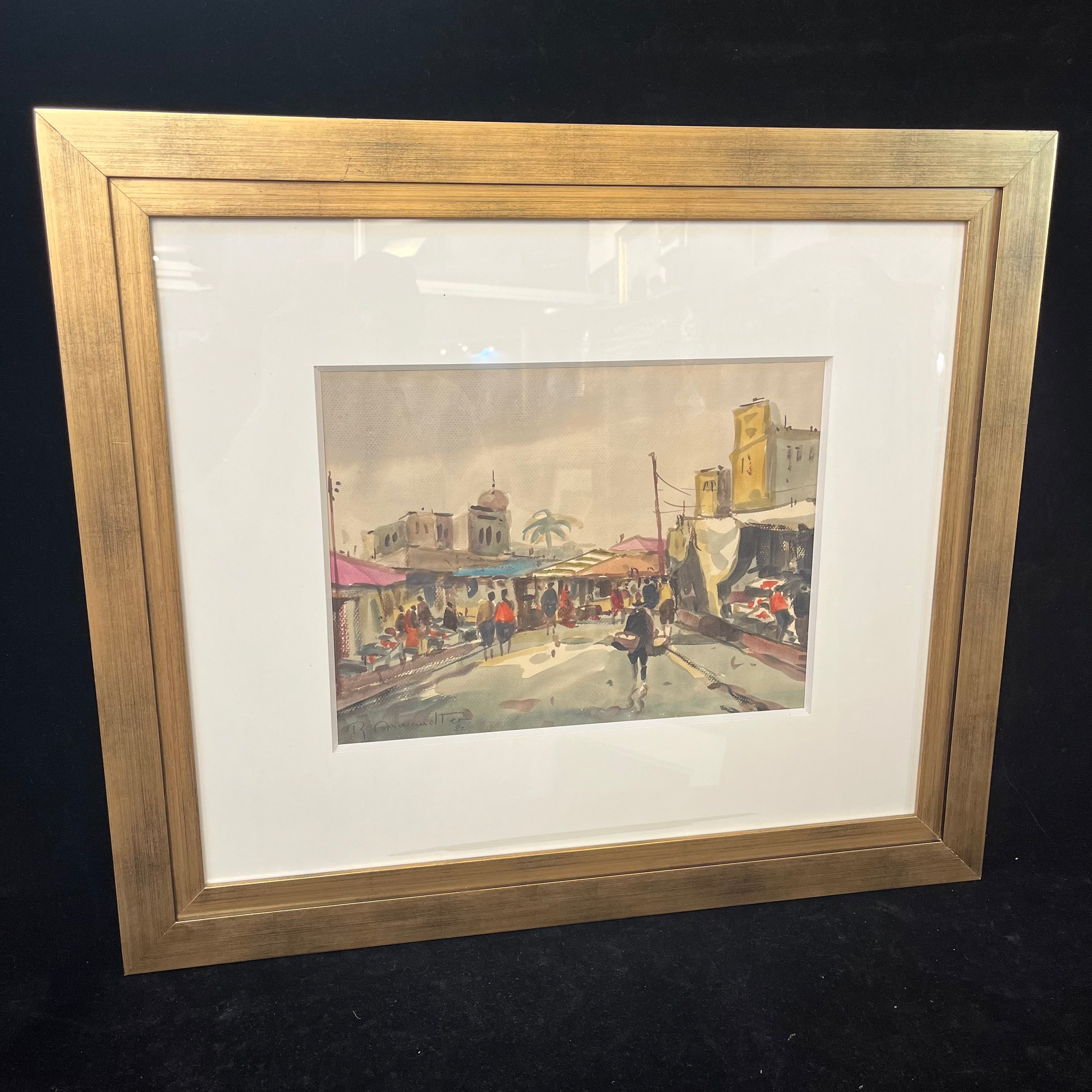 Acuarela sobre papel del pintor chileno Ricardo Anwandter, representando un mercado con puestos y personajes caminando con cestas. De fondo se ve el techo de algunos edificios, palmeras y el cielo. Se trata de una composición que juega entre la forma y el detalle, mostrando todas las posibilidades expresivas de la acuarela. Destacable es el trabajo de luces, sombras y reflejos del suelo, y de las telas de los puestos.