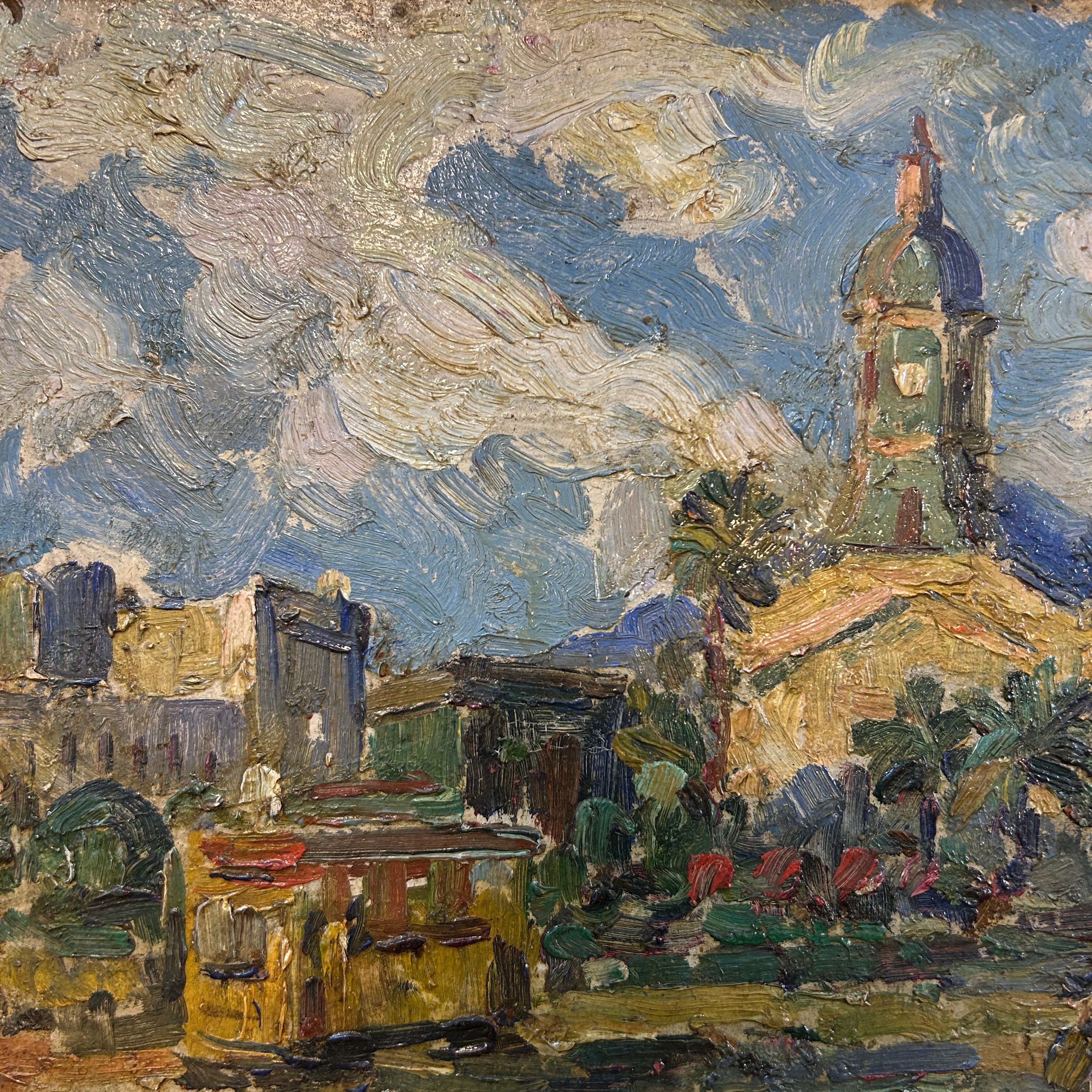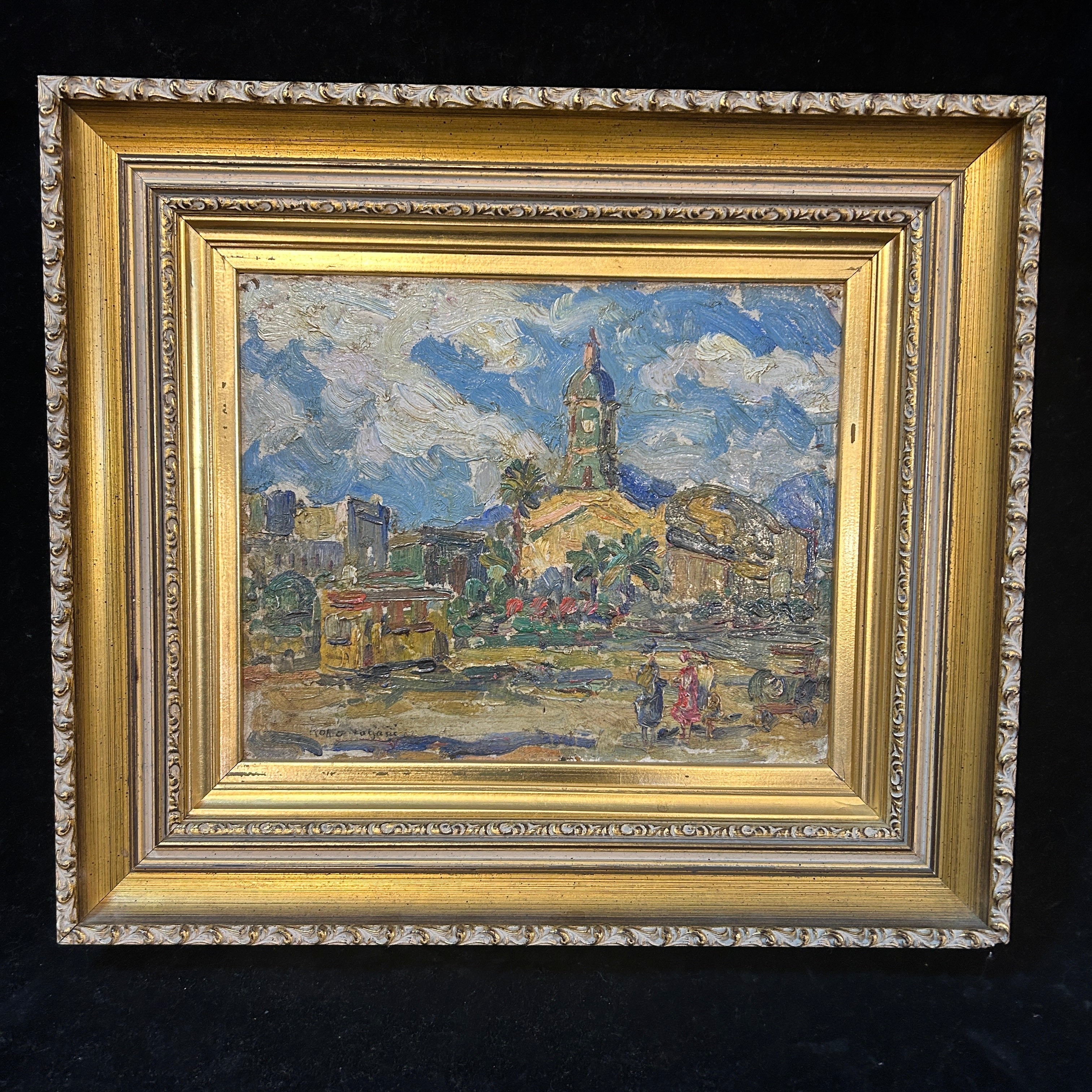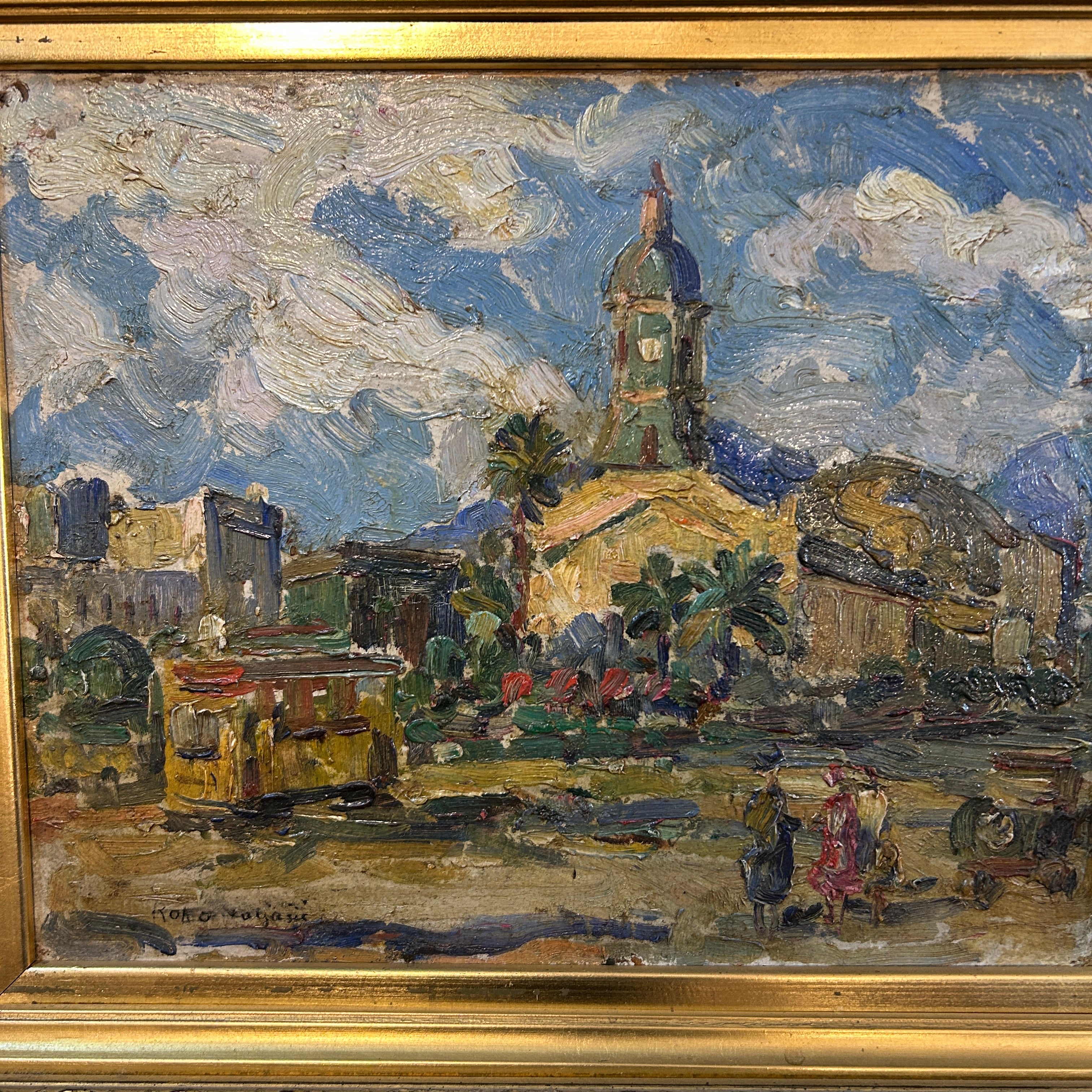 Nostálgico cuadro de Roko Matjasic que retrata la iglesia de la Recoleta Franciscana. Con tonos intensos un cielo nuboso primaveral, la pintura nos transporta a una época de antaño, cuando las ciudades eran más pausadas en su ritmo.