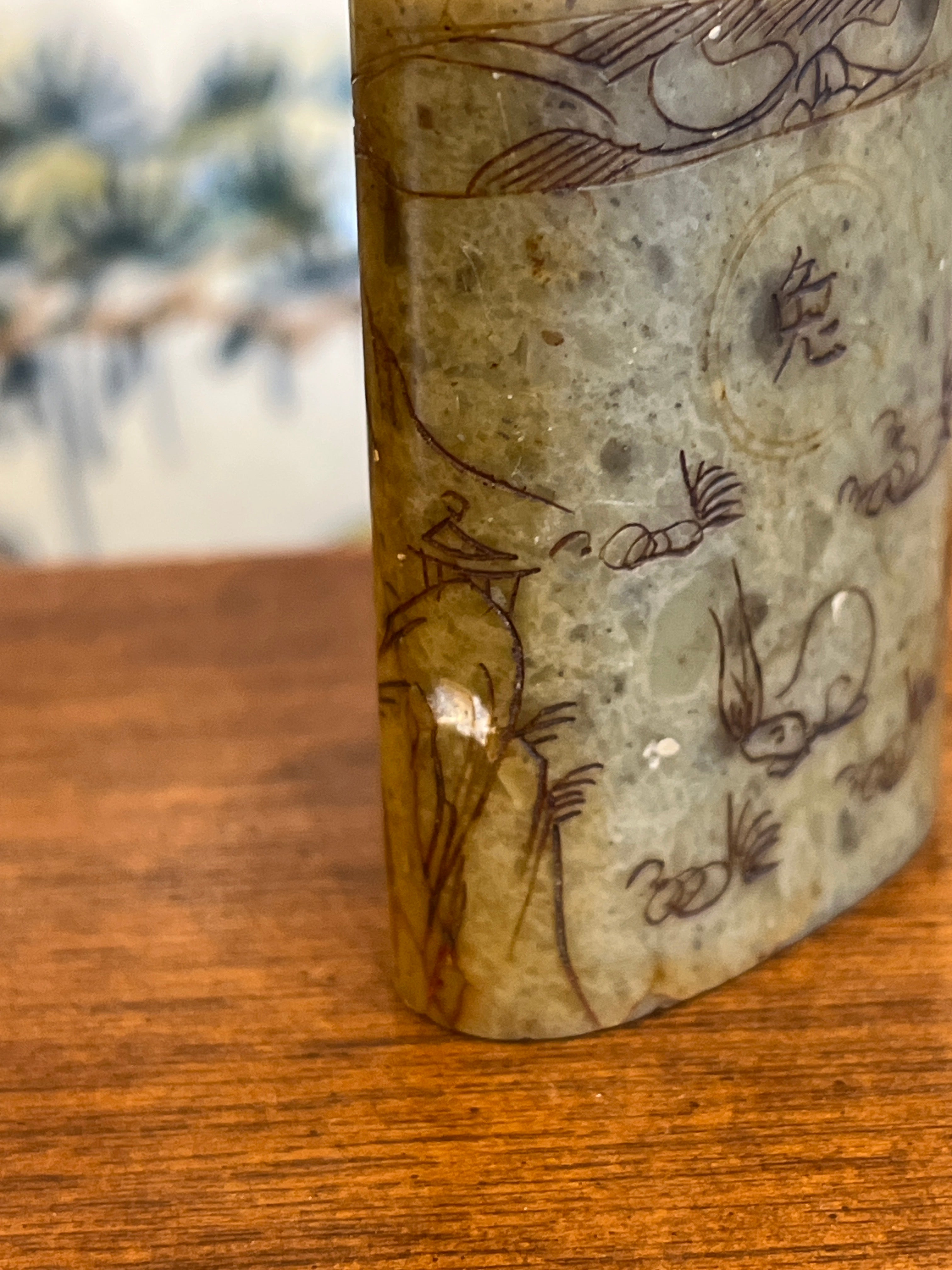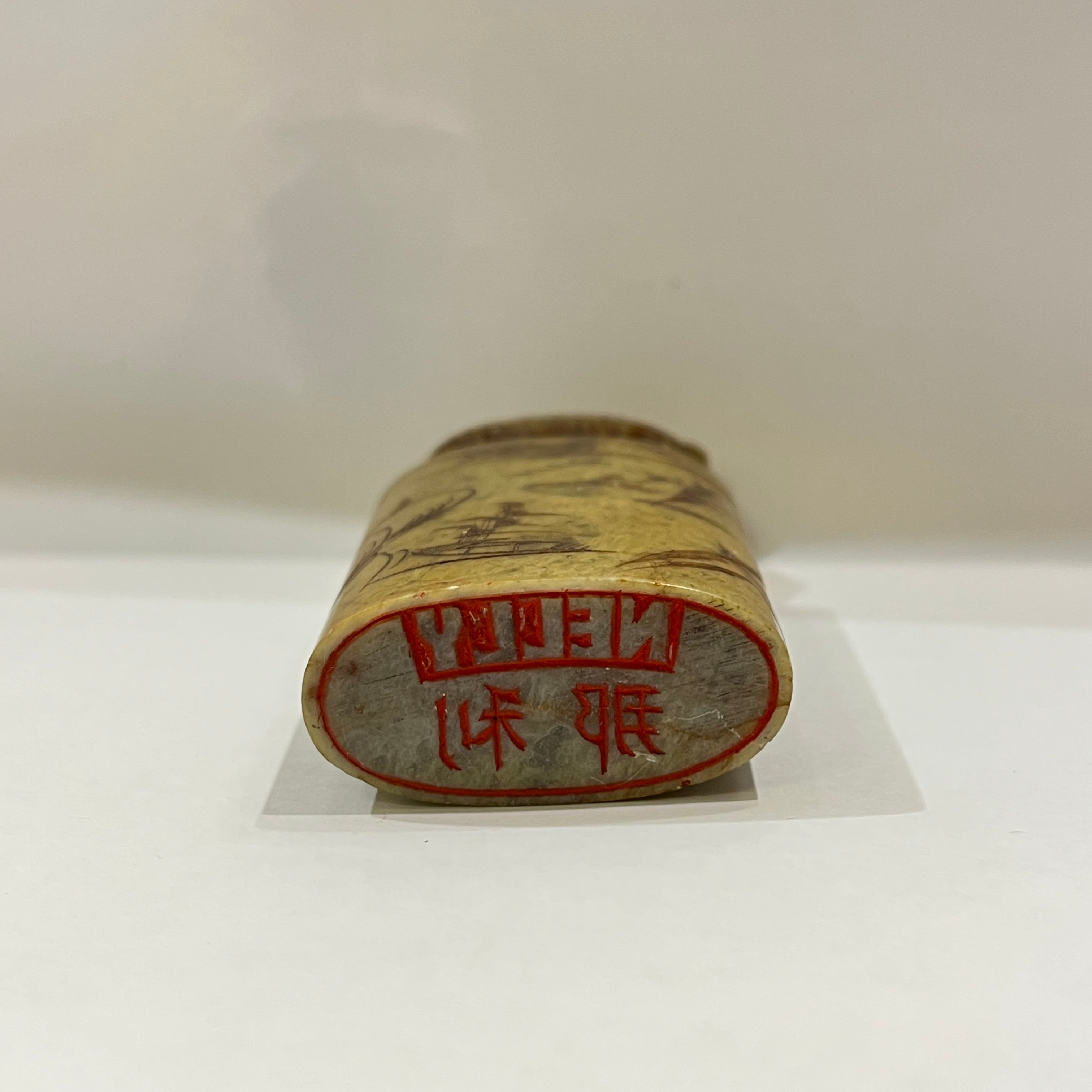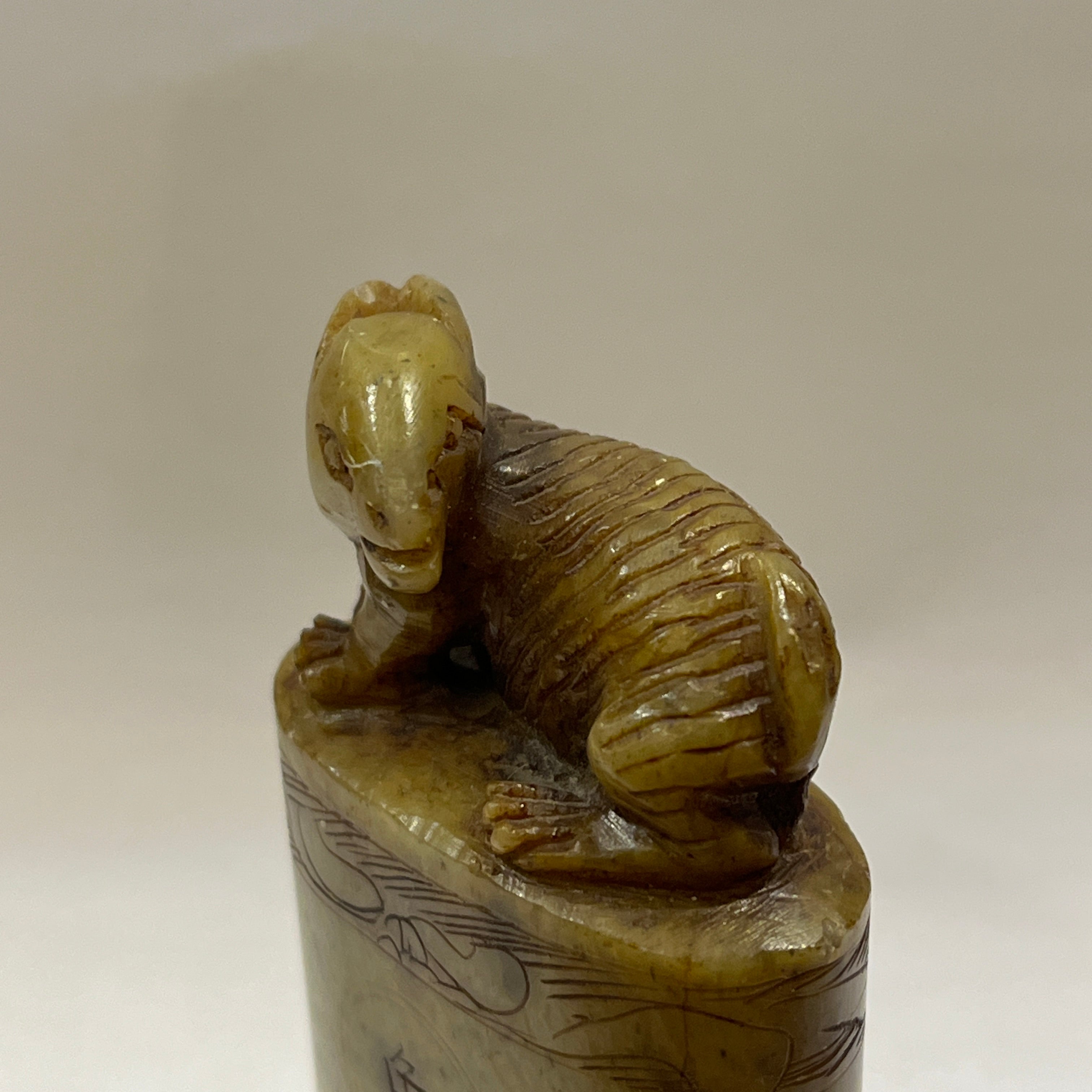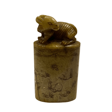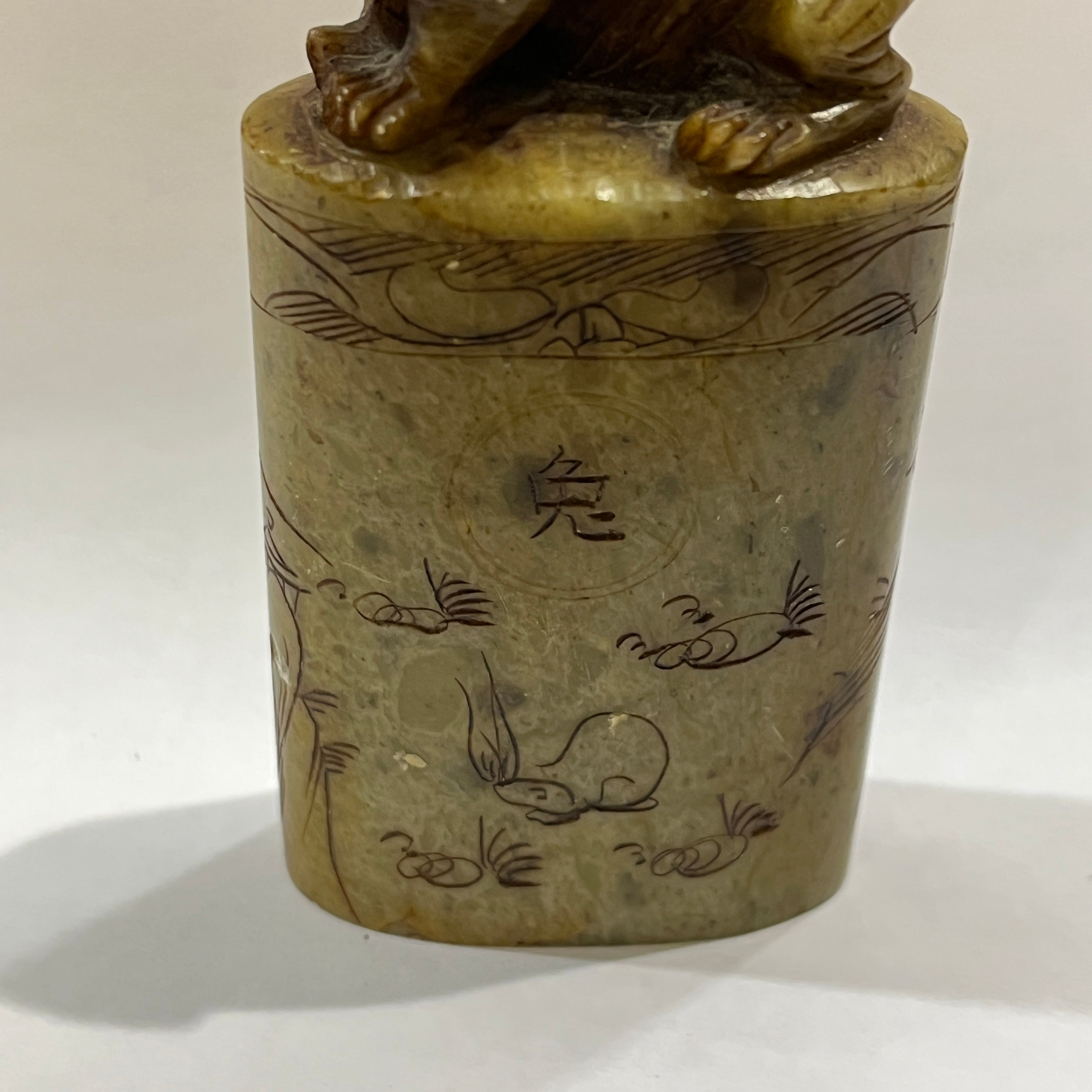 Precioso sello de origen chino, hecho en piedra dura tallada a mano, representando una figura de un conejo con un gesto de alerta, con tallados y relieves decorativos en su superficie.