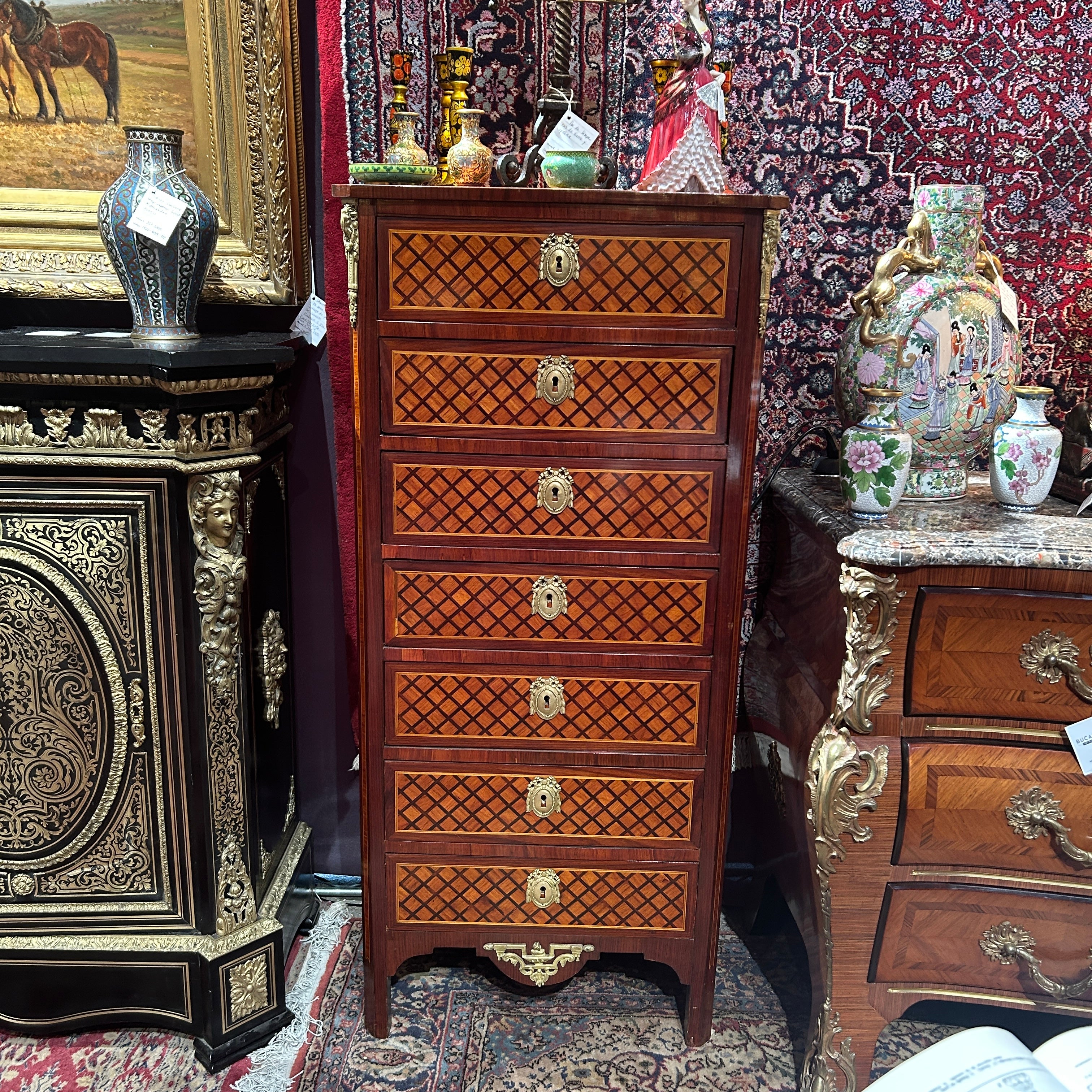Bello semainier francés estilo transición en maderas palo de rosa y palisandro con fileteado dorado en la cubierta y bronce en los costados superiores y chapas. Presenta parquetería en su caras frontal y laterales. Francia, circa 1940s.