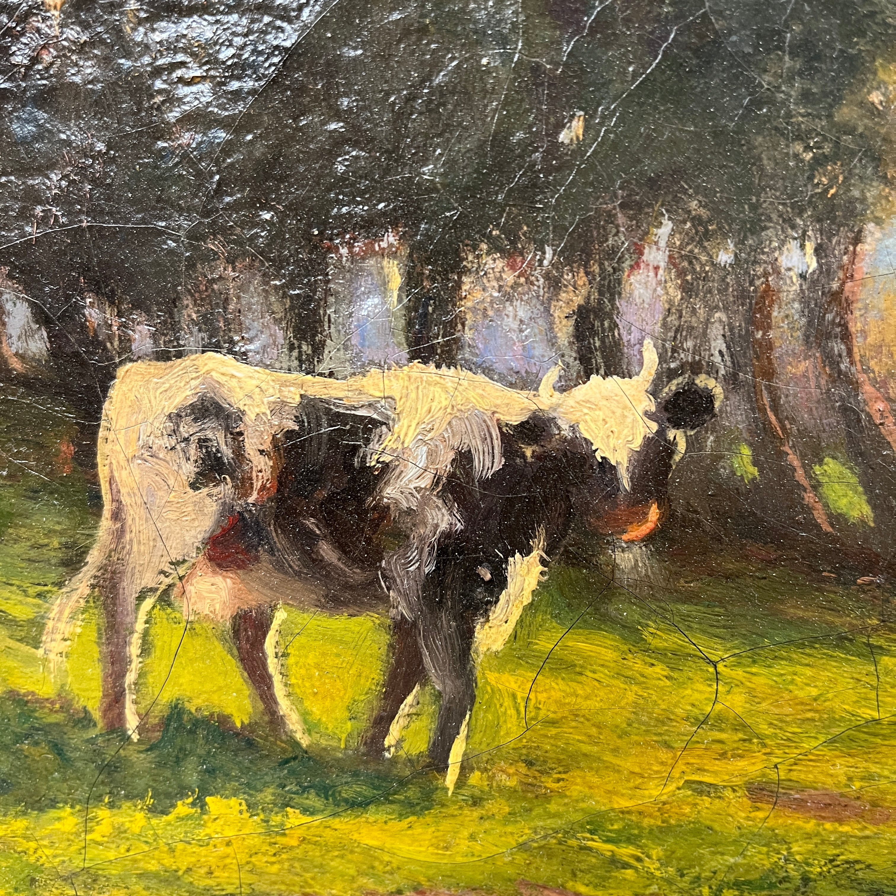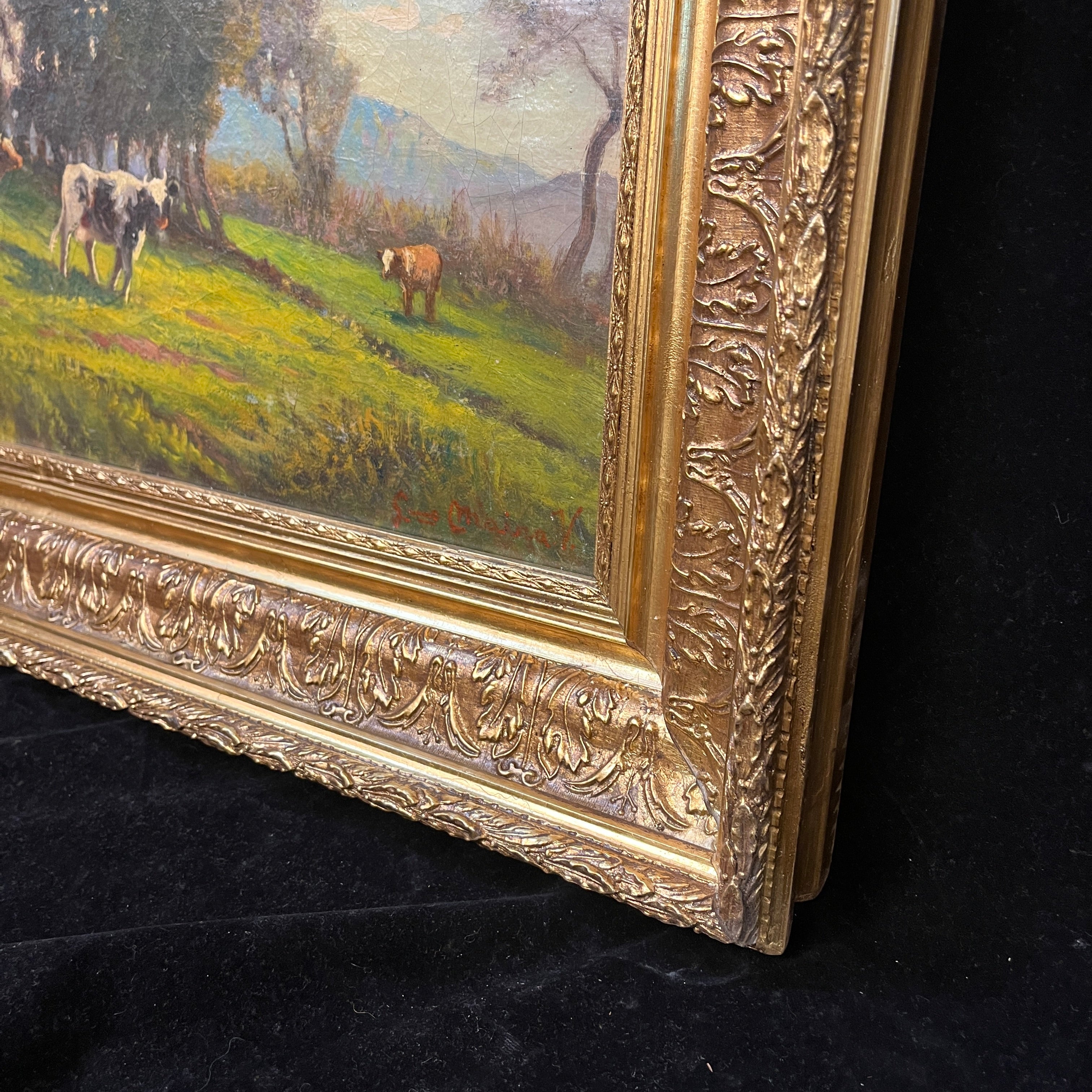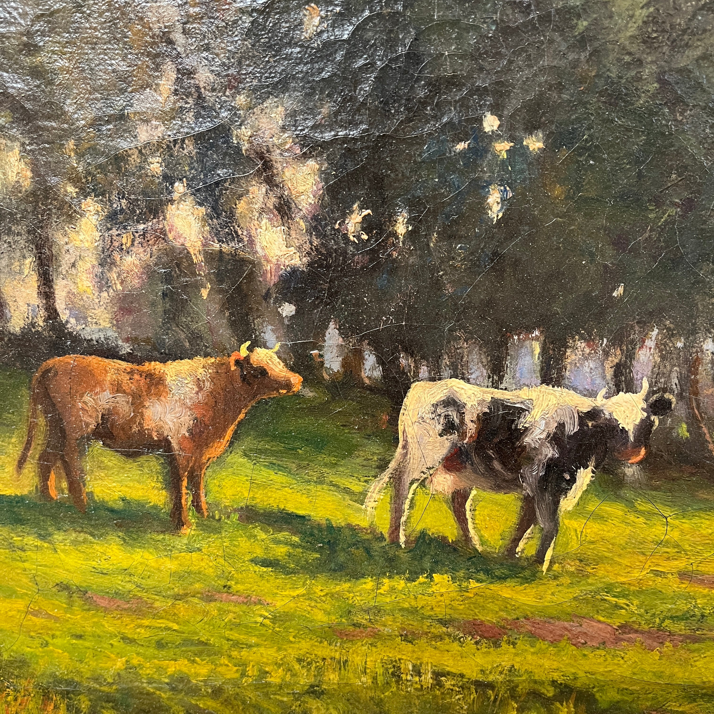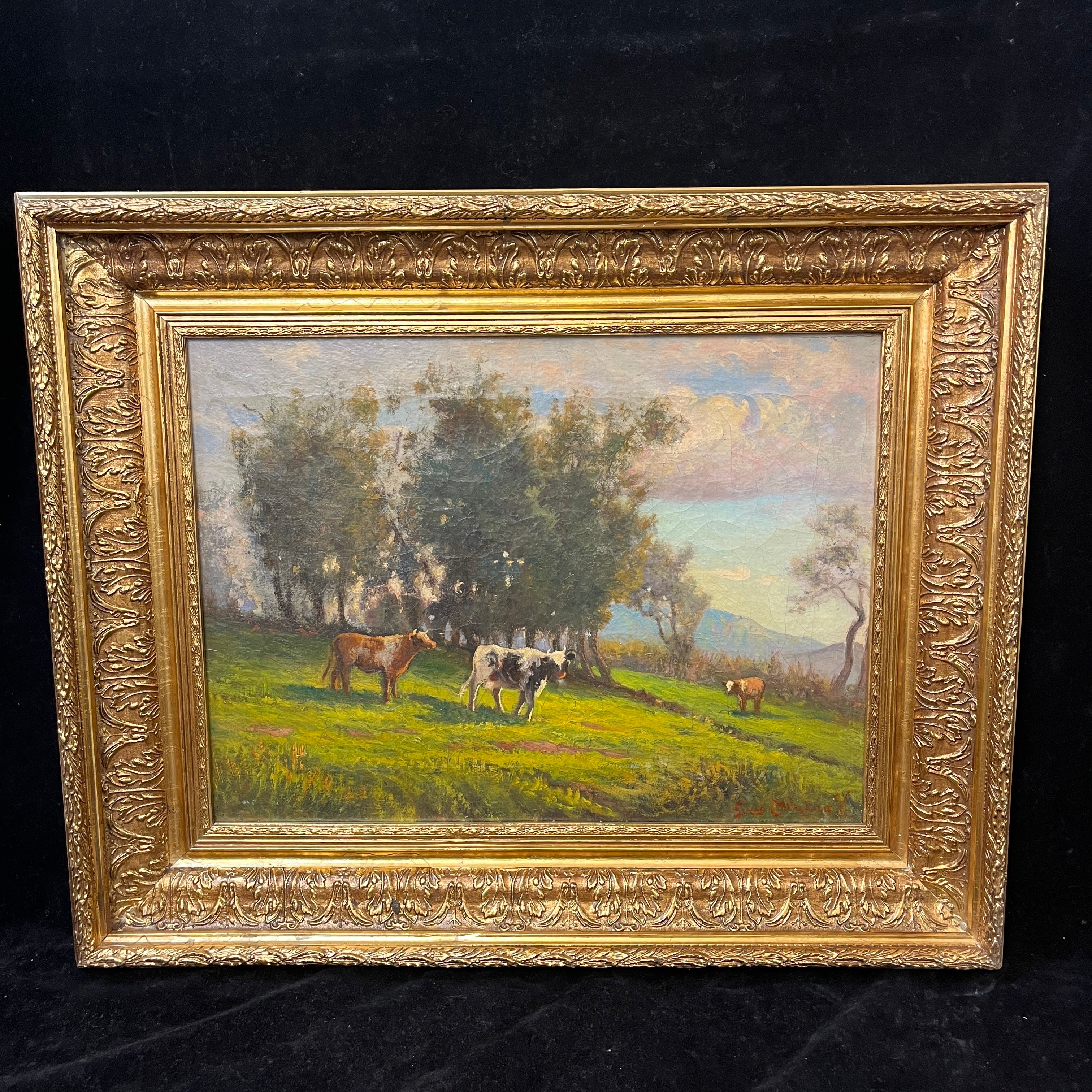 Óleo sobre tela de origen europeo y firma ilegible, representando un paisaje verde en el que tres vacas se encuentran pastando. El pasto y el follaje de los árboles es capturado con detalle y movimiento, al igual que el cielo. La obra es luminosa y vibrante en sus colores, logrando un acabo nítido en el paisaje. La obra tiene un gran marco de madera tallada en relieves y acabada con dorado.