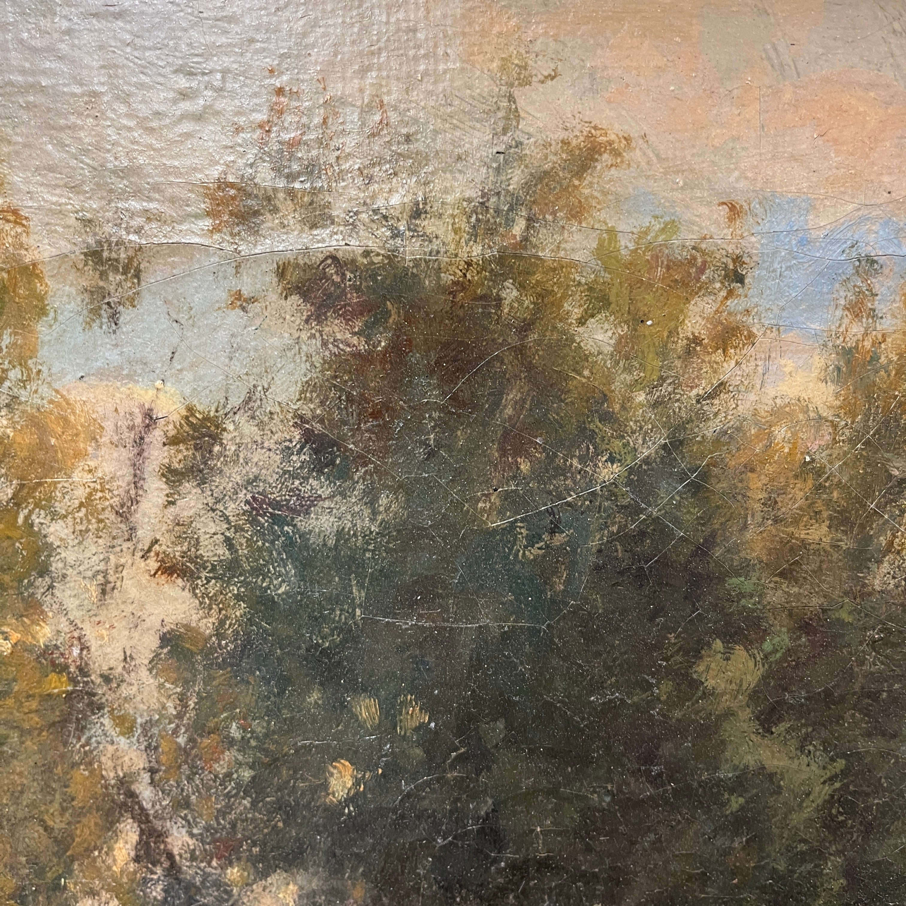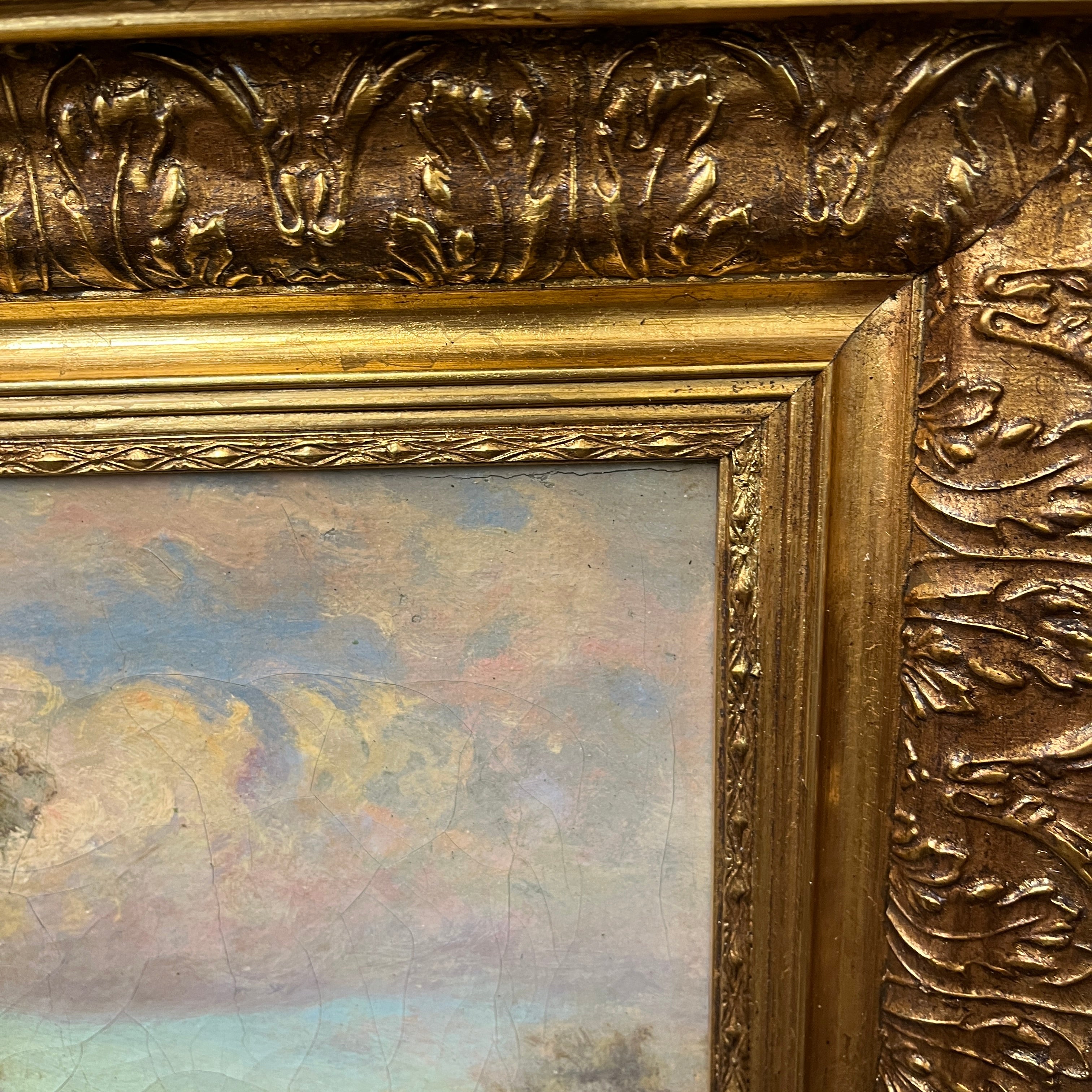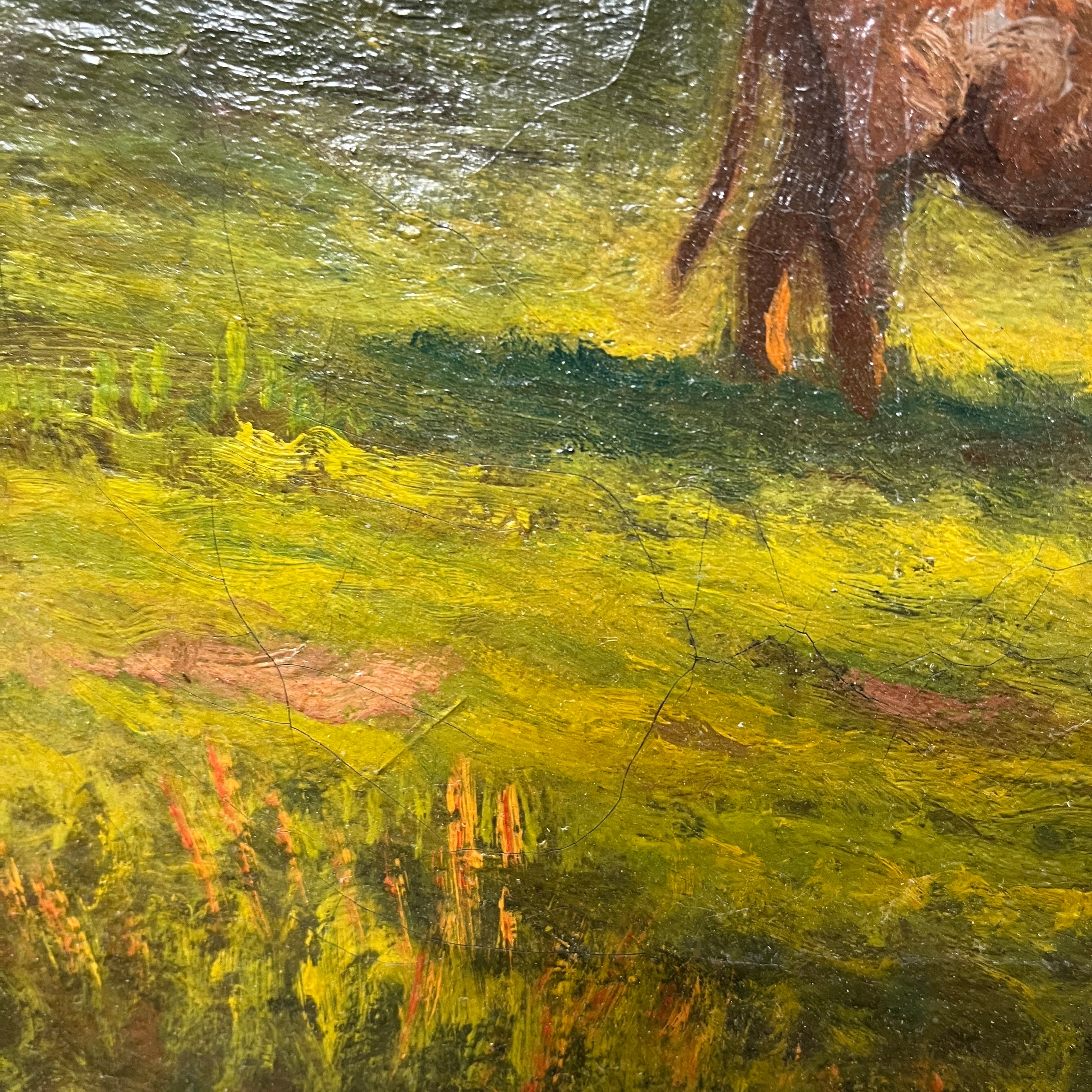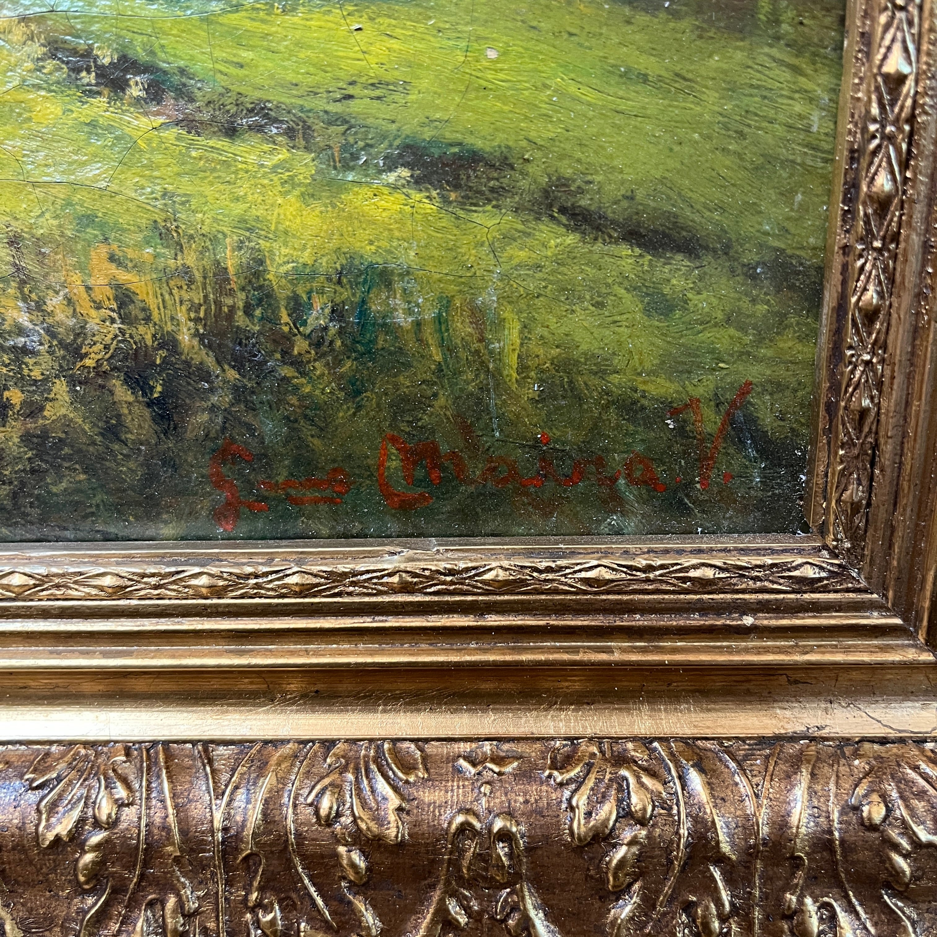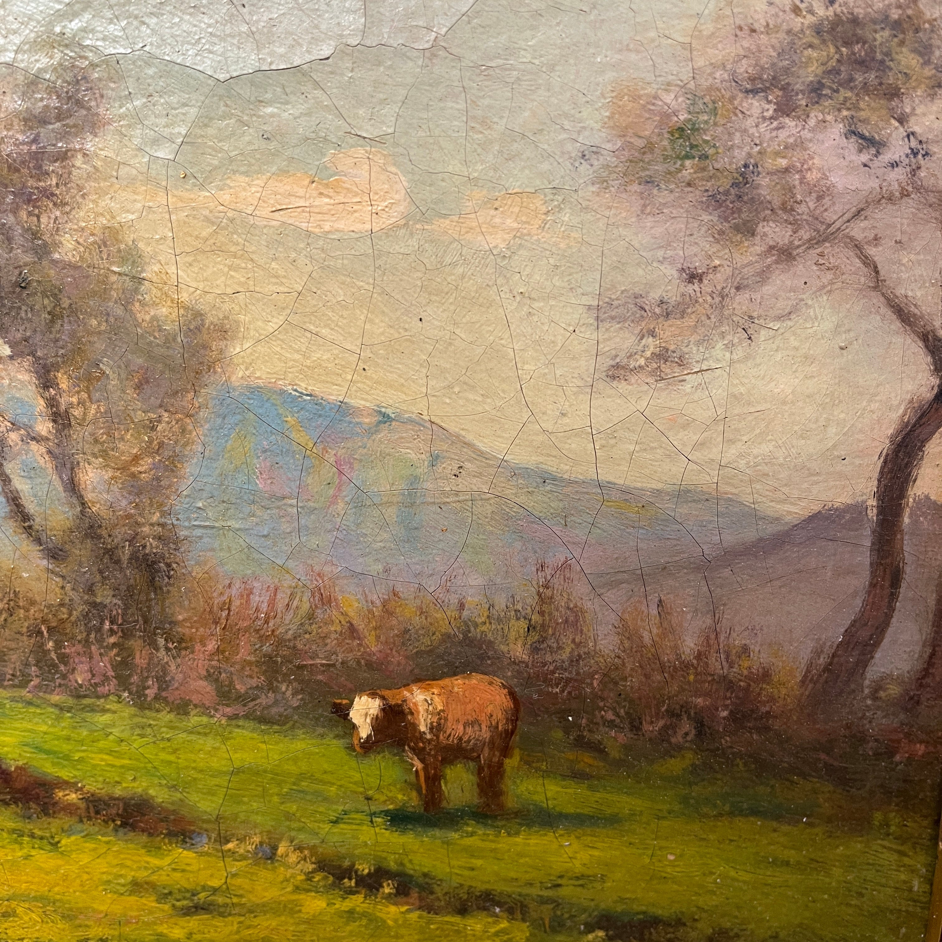 Óleo sobre tela de origen europeo y firma ilegible, representando un paisaje verde en el que tres vacas se encuentran pastando. El pasto y el follaje de los árboles es capturado con detalle y movimiento, al igual que el cielo. La obra es luminosa y vibrante en sus colores, logrando un acabo nítido en el paisaje. La obra tiene un gran marco de madera tallada en relieves y acabada con dorado.
