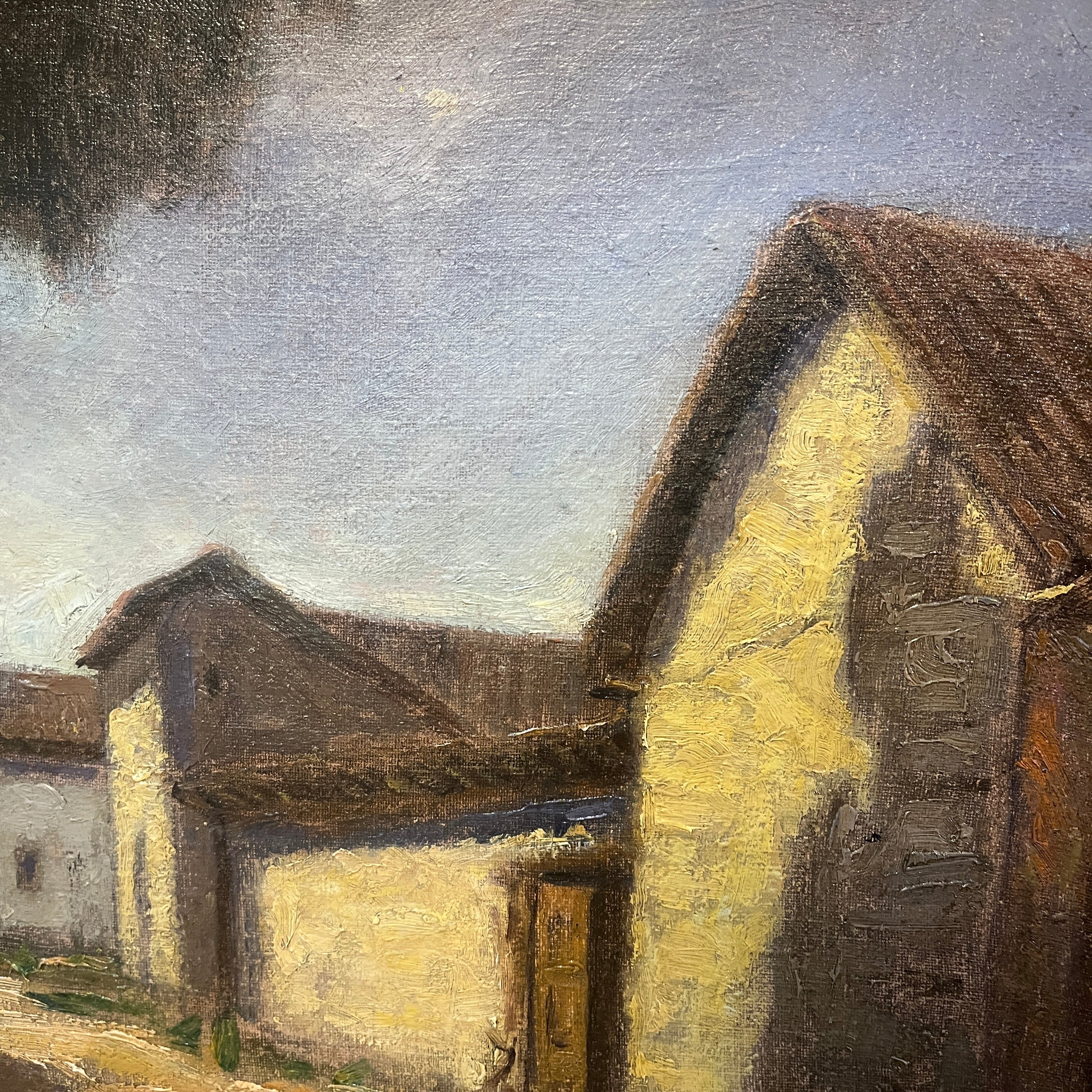 Hermoso óleo del destacado pintor chileno Ezequiel Plaza (1892-1947), parte de la generación del 13. Retrata una bella casona campestre, con sus puertas abiertas y en una esquina un pozo de agua. El artista logra transmitir cierta sensación de estar presenciado un lugar abandonado, a partir del uso de tonos terrosos y una particular preocupación por cautivarnos a partir de una escena cotidiana que todos podemos reconocer. Plaza se destacó por pintar retratos y también paisajes tanto de ciudad como rurales, realzando una estética realista.