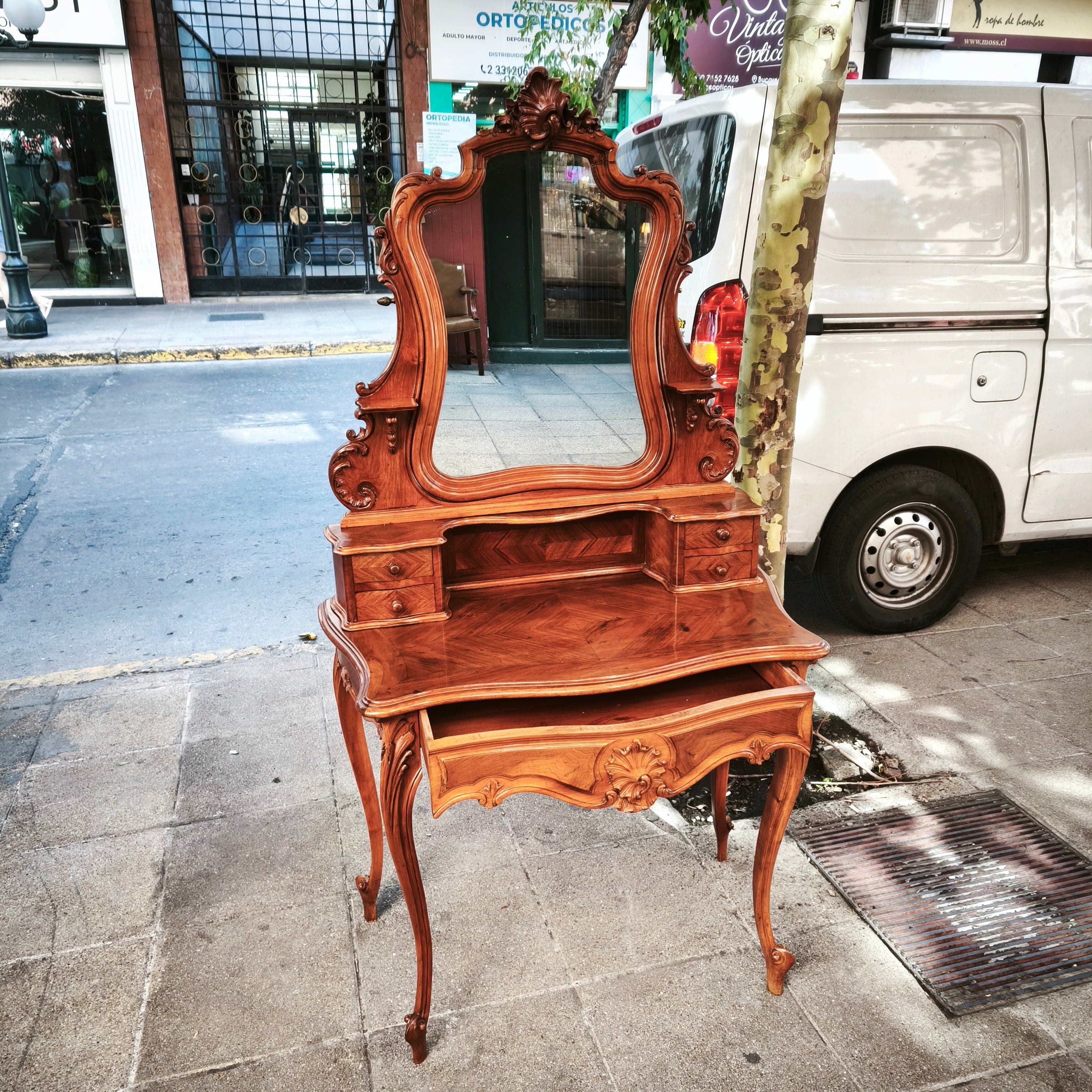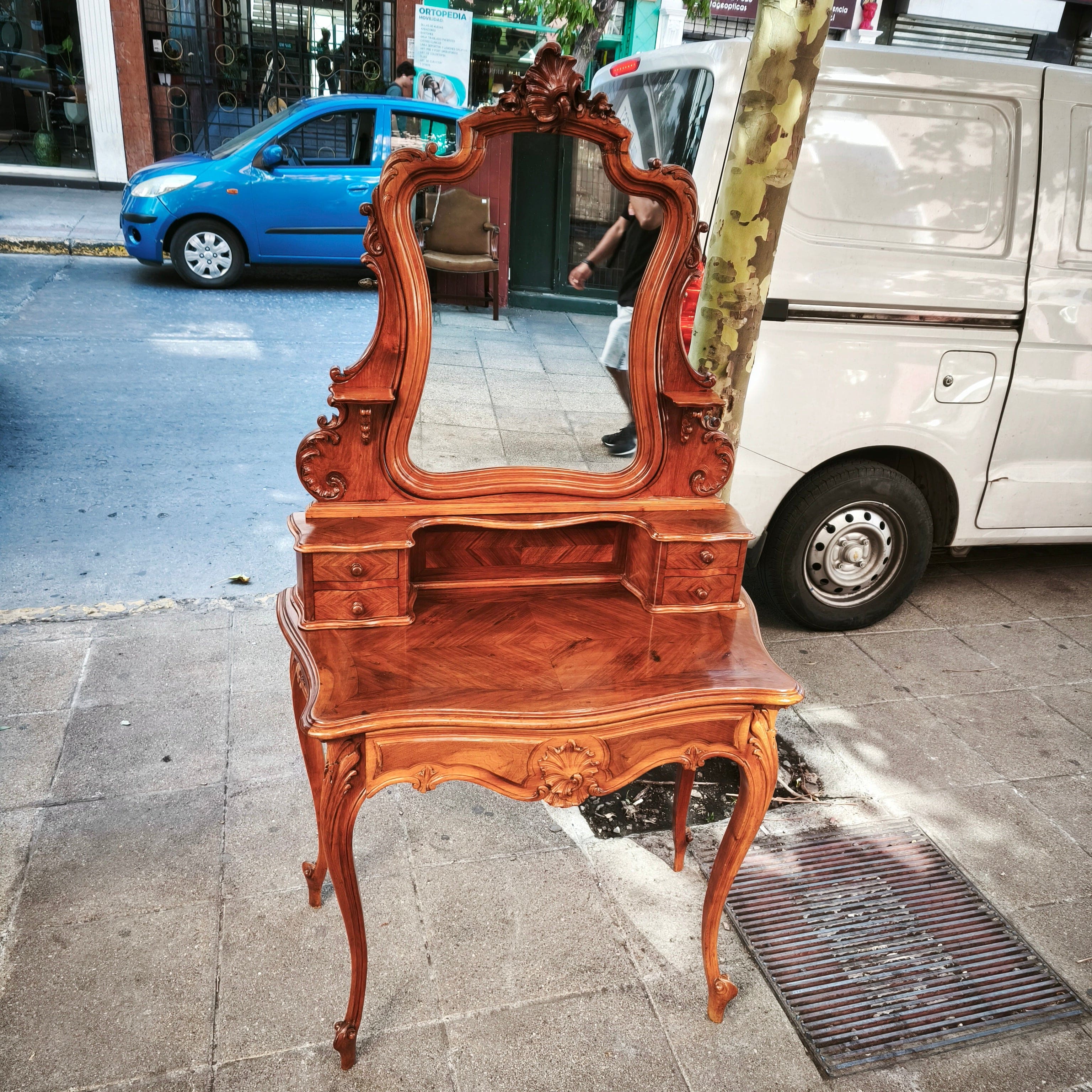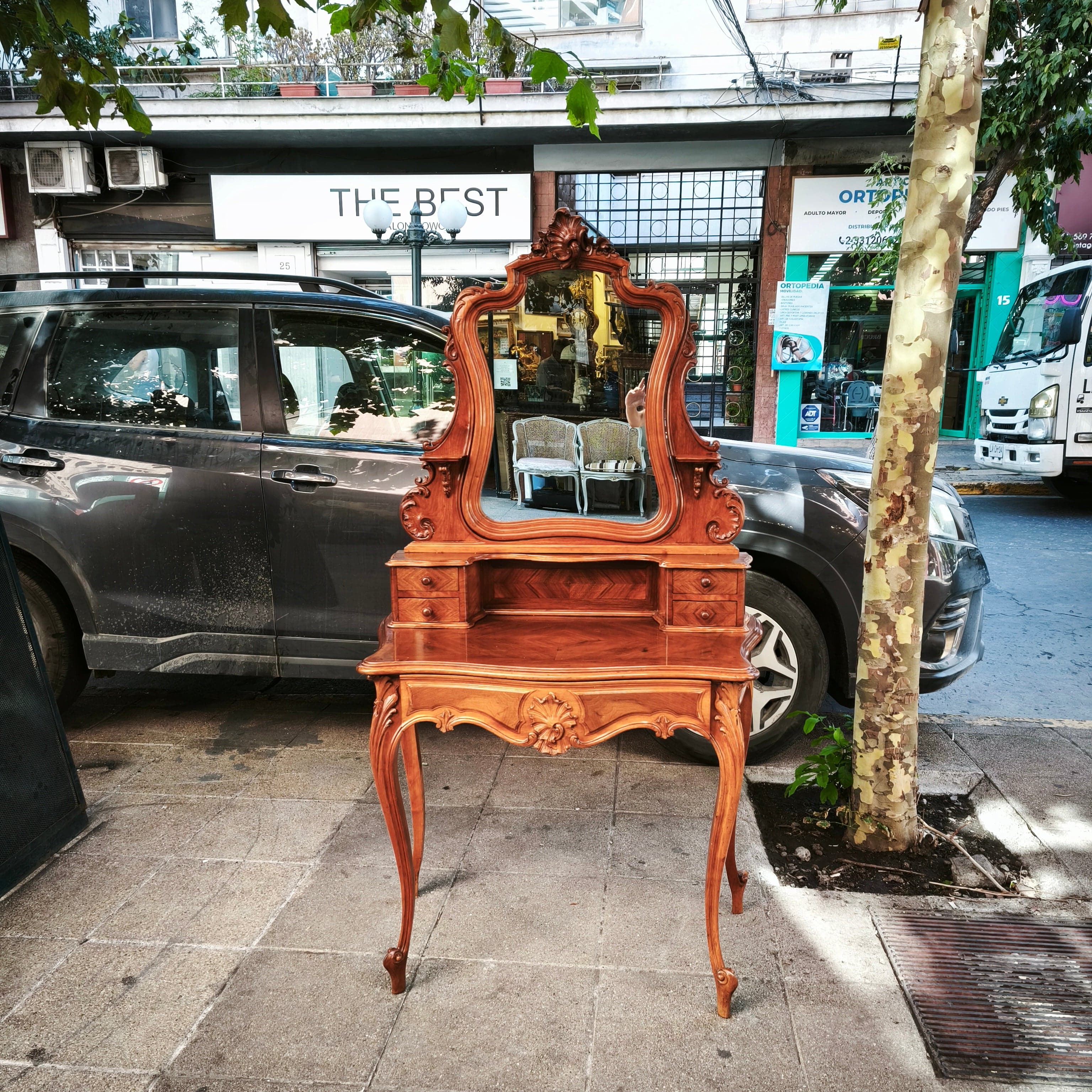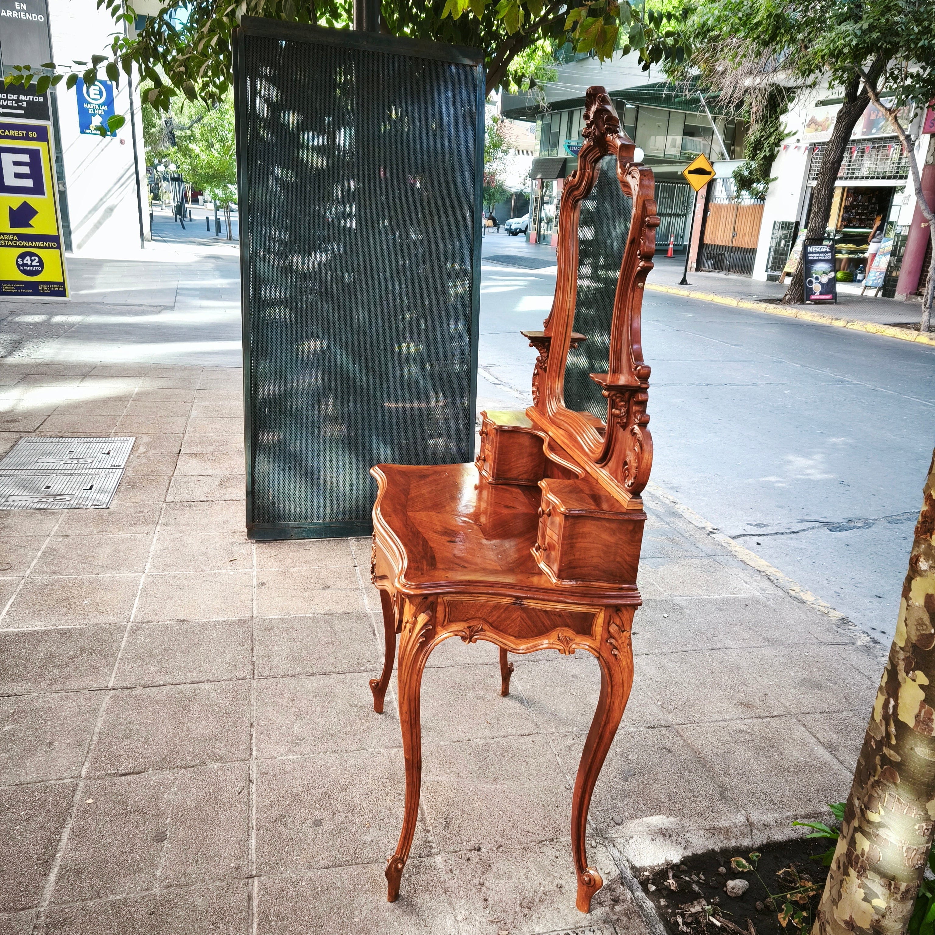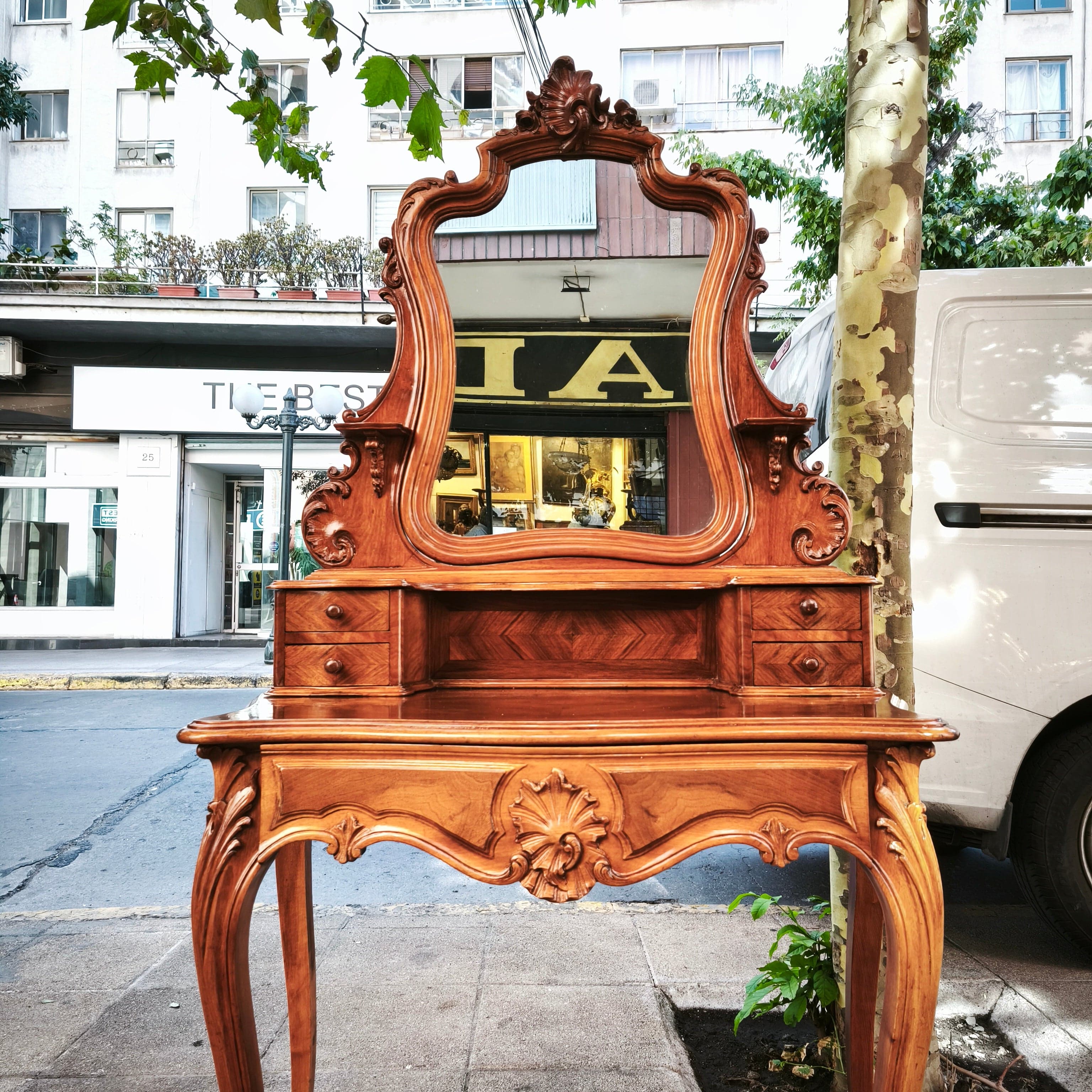 Hermoso tocador Frances en madera de nogal tallado, posee cuatro cajones pequeños, dos en cada lado, un cajon inferior espacioso en la parte inferior y un espejo.