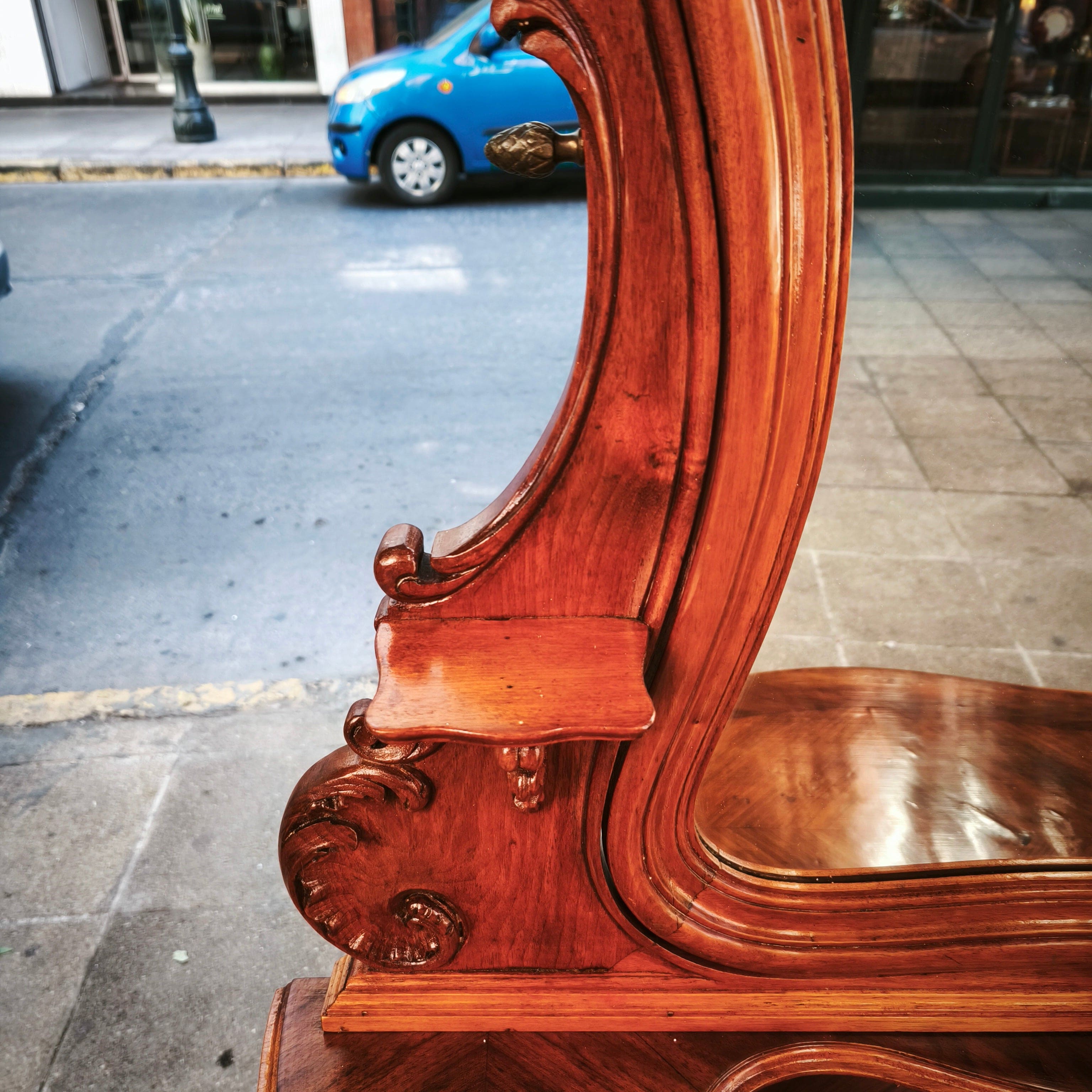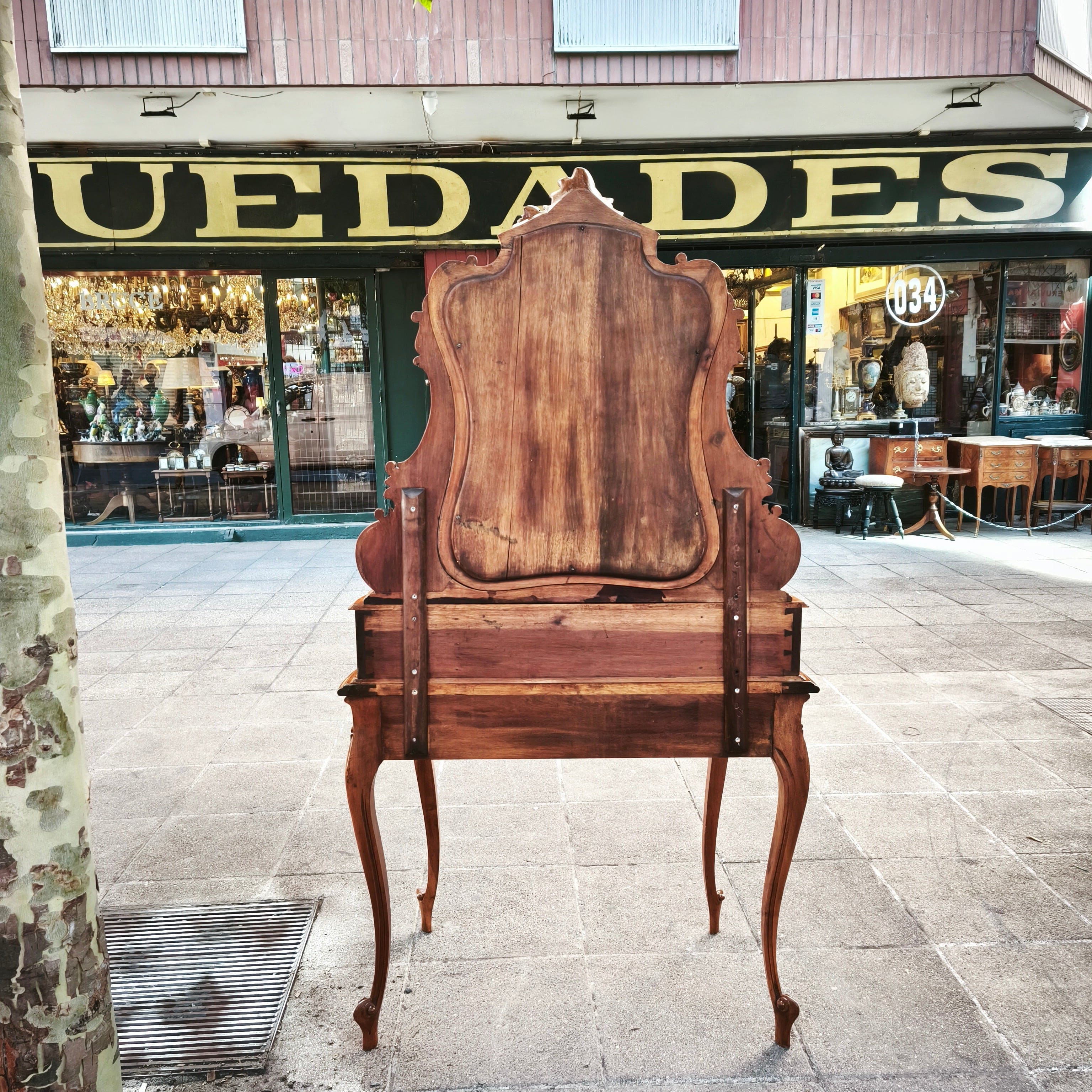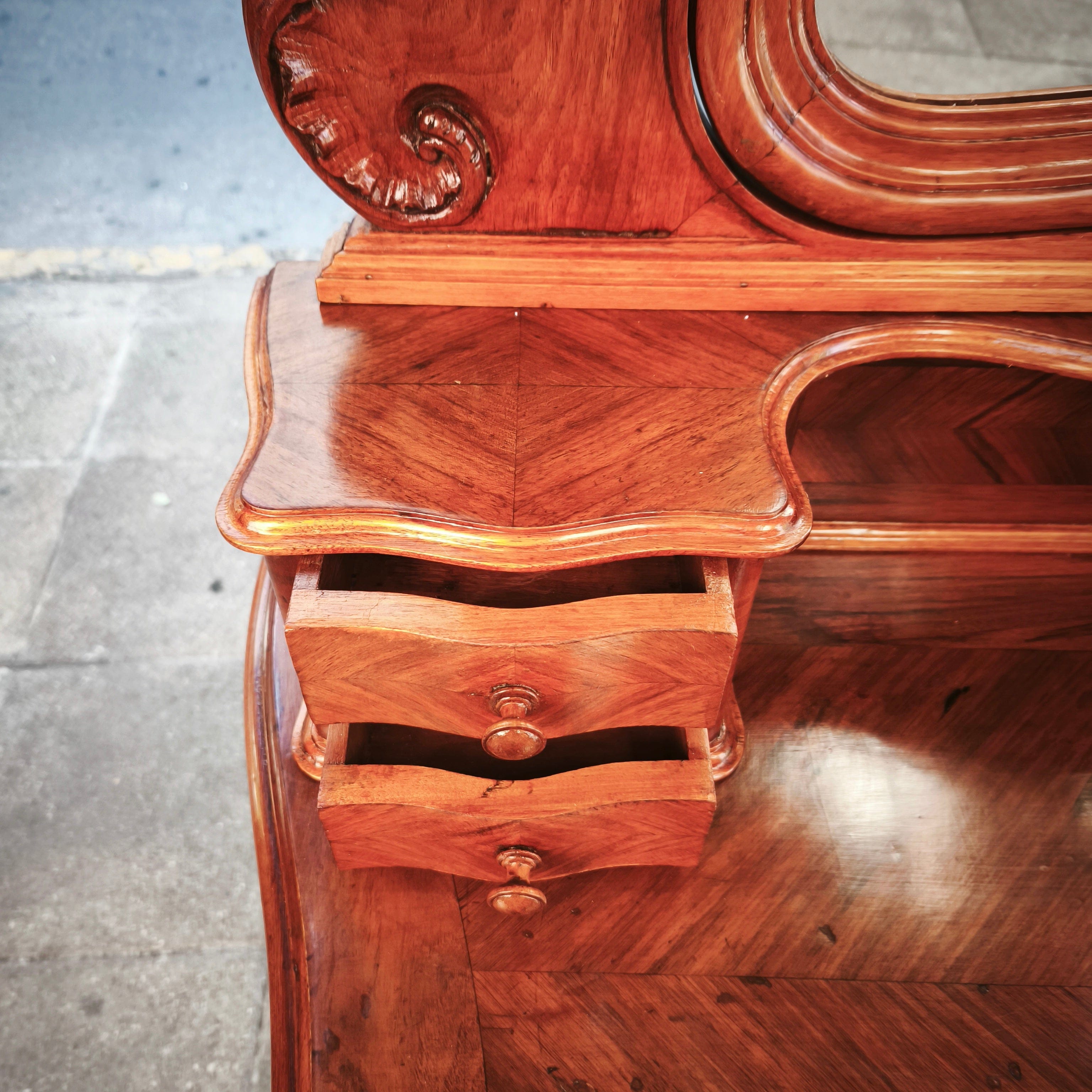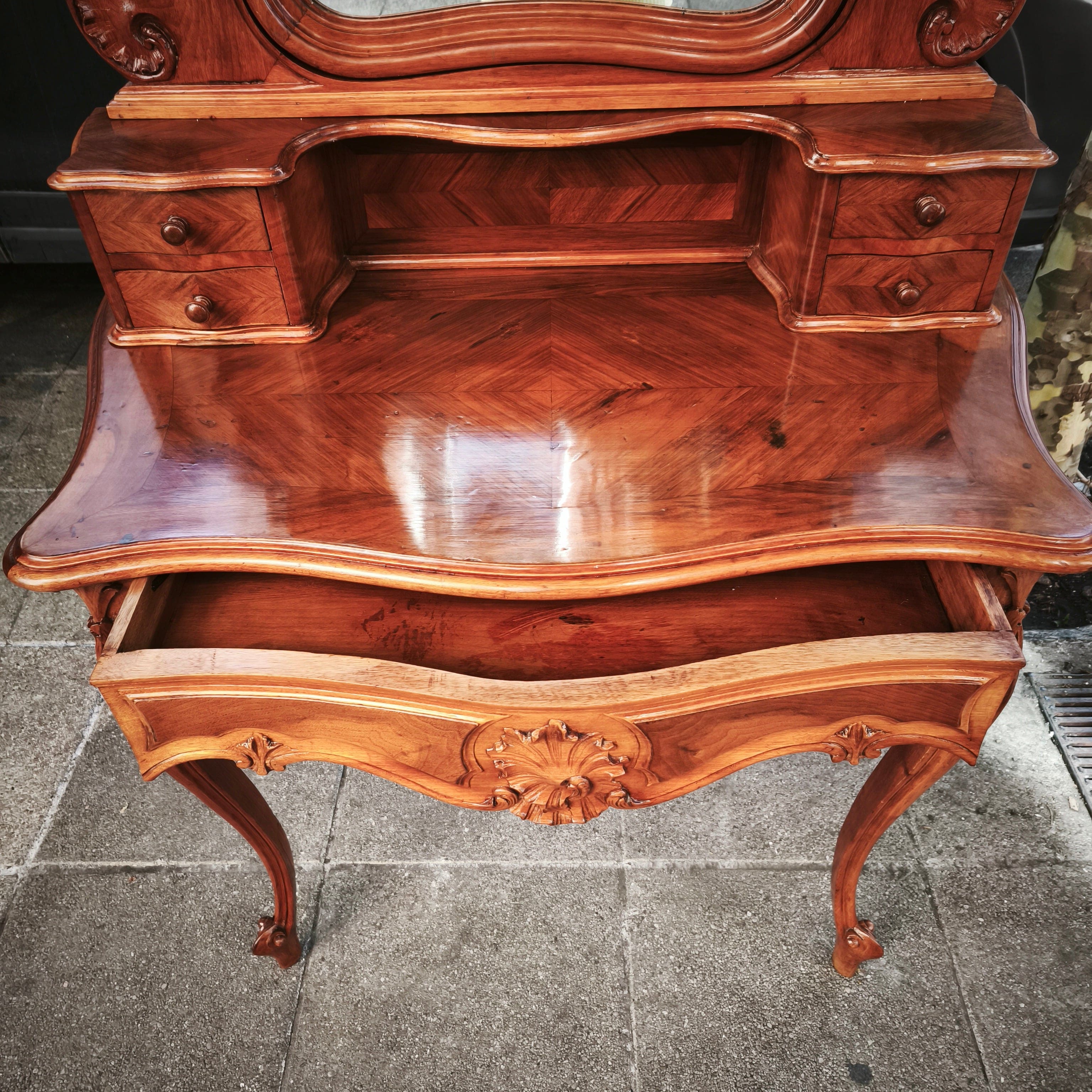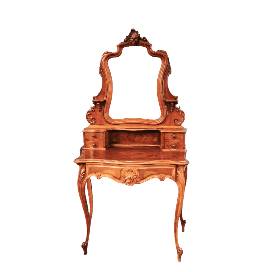 Hermoso tocador Frances en madera de nogal tallado, posee cuatro cajones pequeños, dos en cada lado, un cajon inferior espacioso en la parte inferior y un espejo.