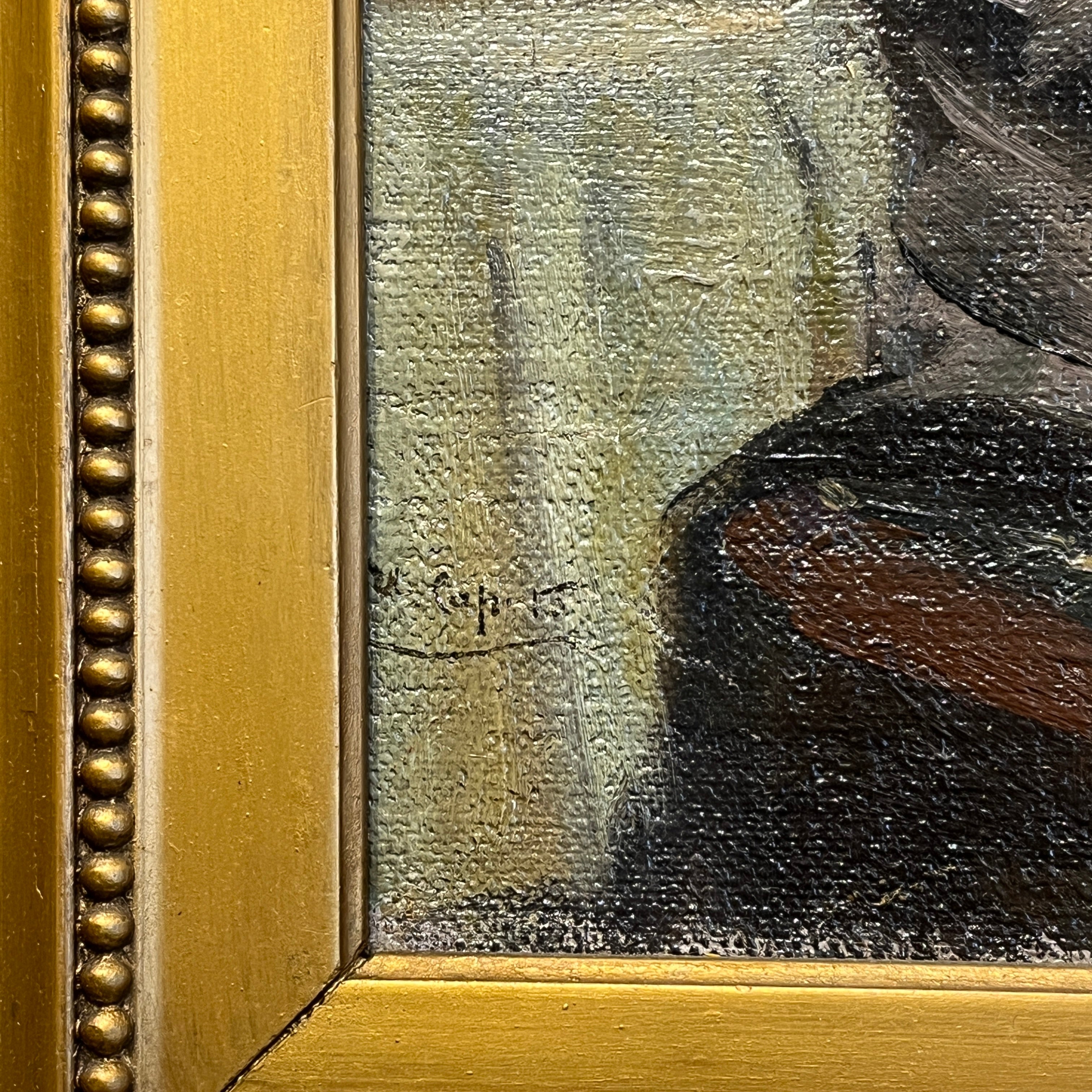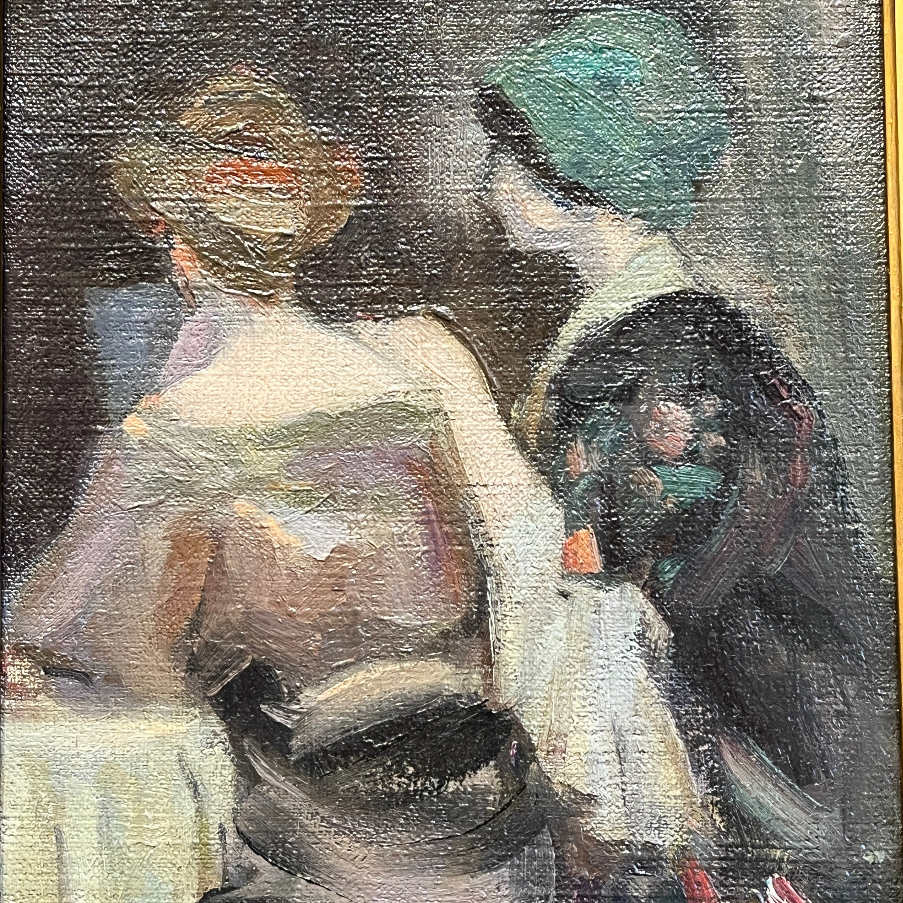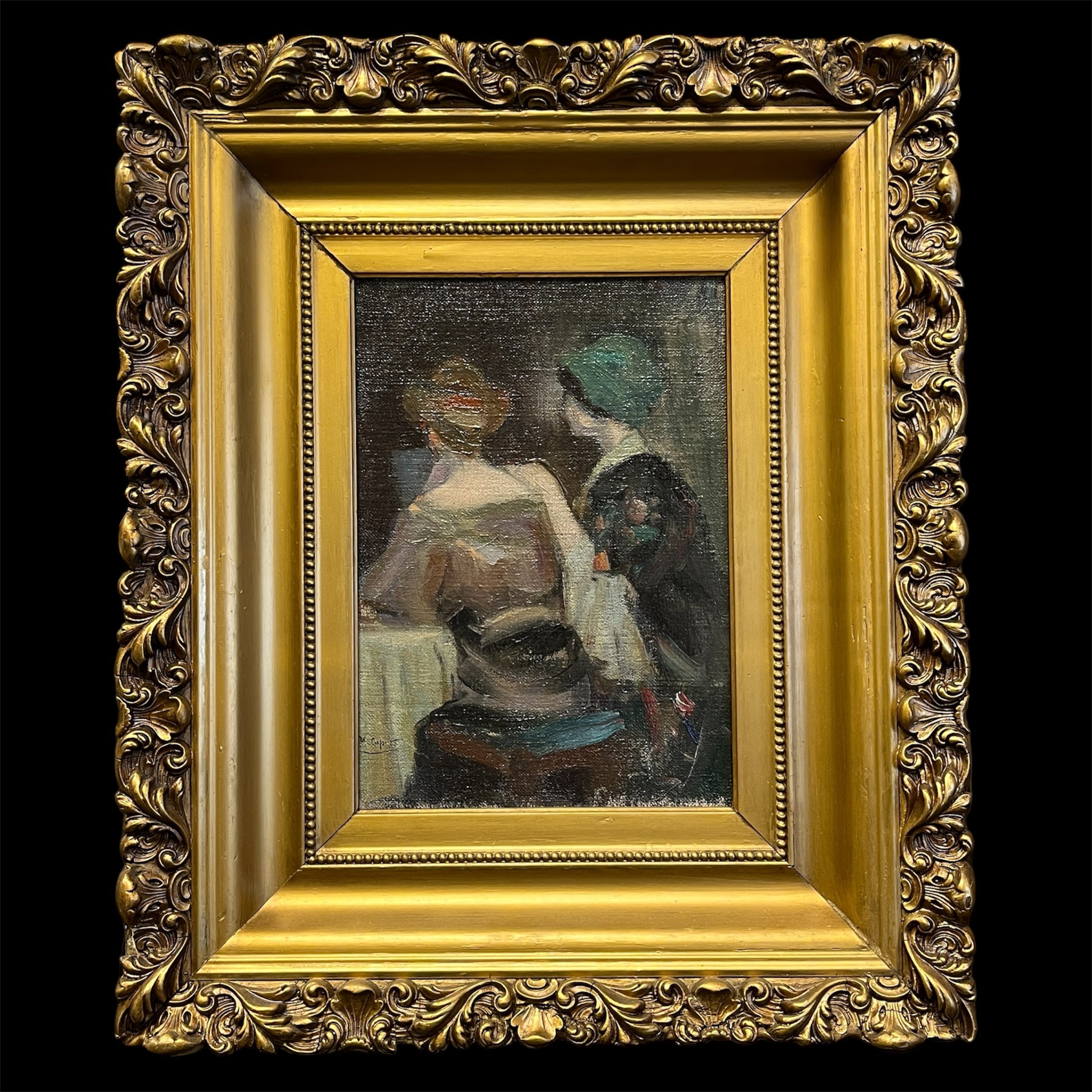 Óleo sobre tela del pintor italiano Ulisse Caputo (1872-1948), representando a dos mujeres de espalda en una mesa, posiblemente en un café o restorán. Una de ellas tiene su mano reposando sobre el hombro de la otra, sugiriendo una complicidad entre ellas. El punto de vista, entonces, pone énfasis en estas mujeres, las siluetas, telas y colores de sus vestuarios, pero nos deja con un misterio acerca de sus rostros y sobre la situación que las une. El artista utiliza trazos expresivos y cargado de materia, dándole volumen y textura a los elementos. La obra tiene un marco de madera tallada en relieves decorados y terminada de elegante dorado.