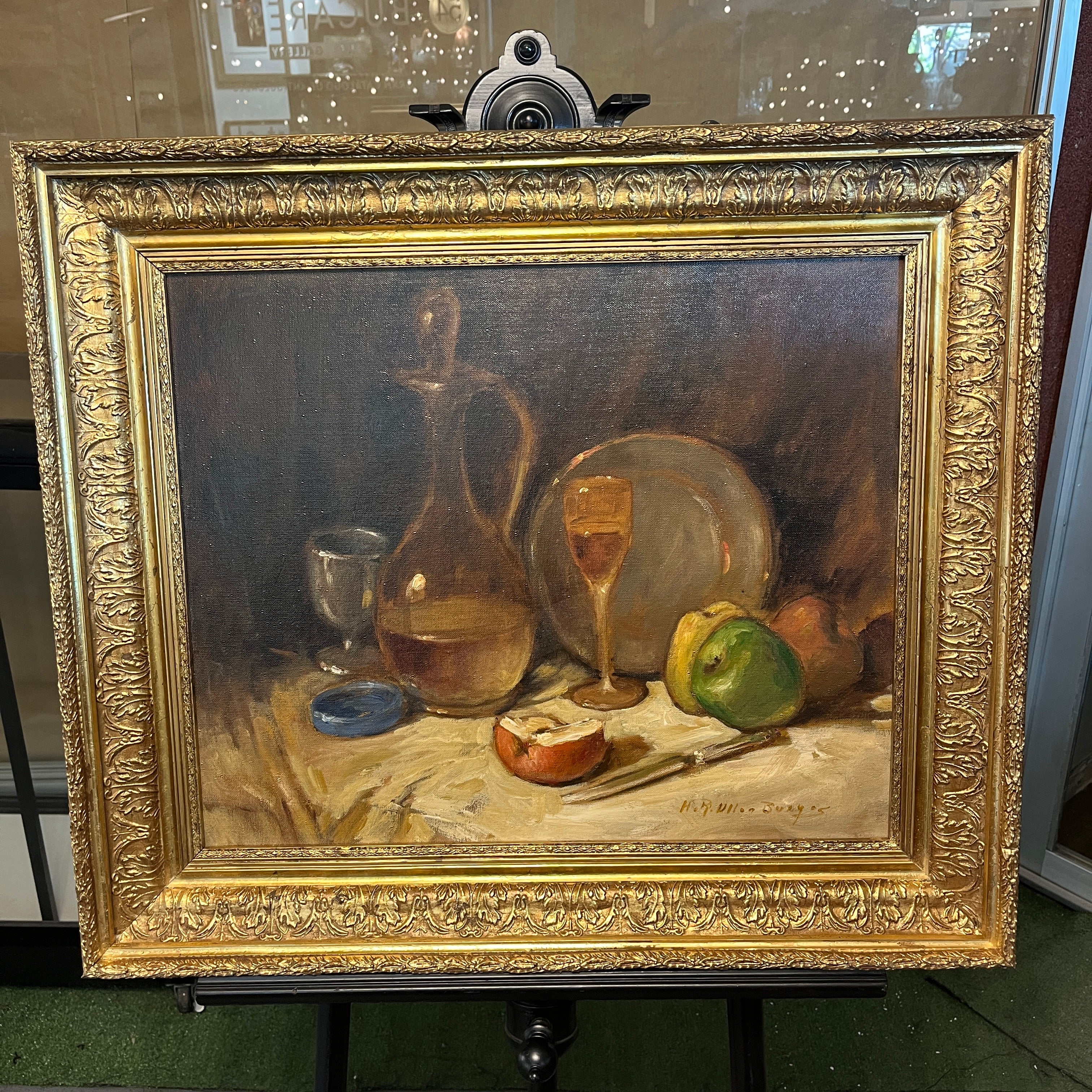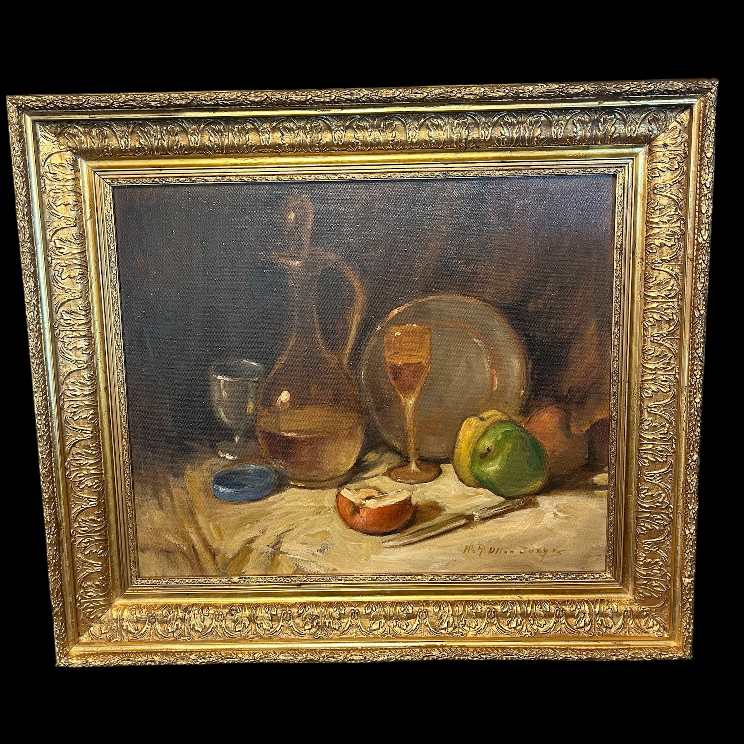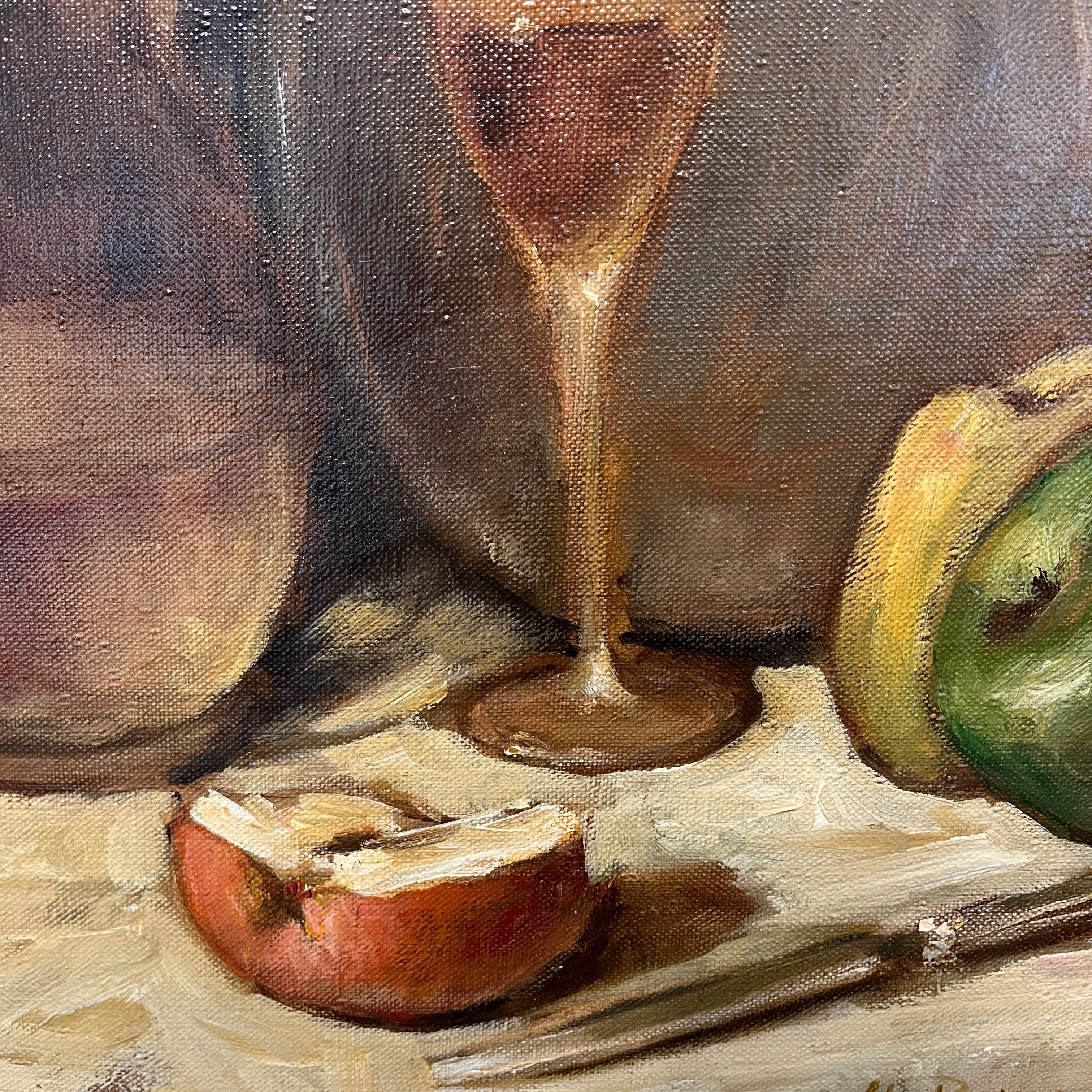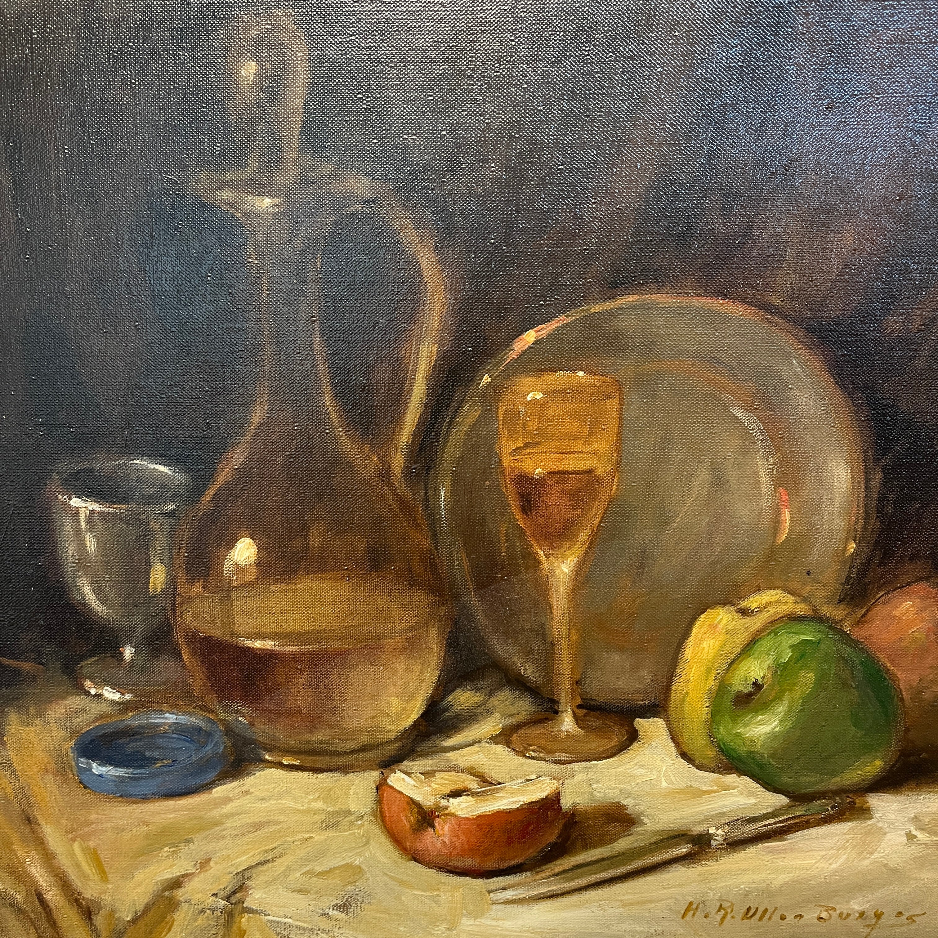 Óleo sobre tela del reconocido artista chileno Raúl Ulloa Burgos, representando un bello bodegón de colores cálidos. En la composición podemos ver algunas manzanas y objetos de cristal para la mesa, como una botella, una copa, un plato y un cenicero. Es una naturaleza muerta con un  juego entre los tonos dorados cálidos y colores primarios saturados, que hacen resaltar los elementos. La obra está enmarcada en madera tallada en finos relieves y terminada en dorado.