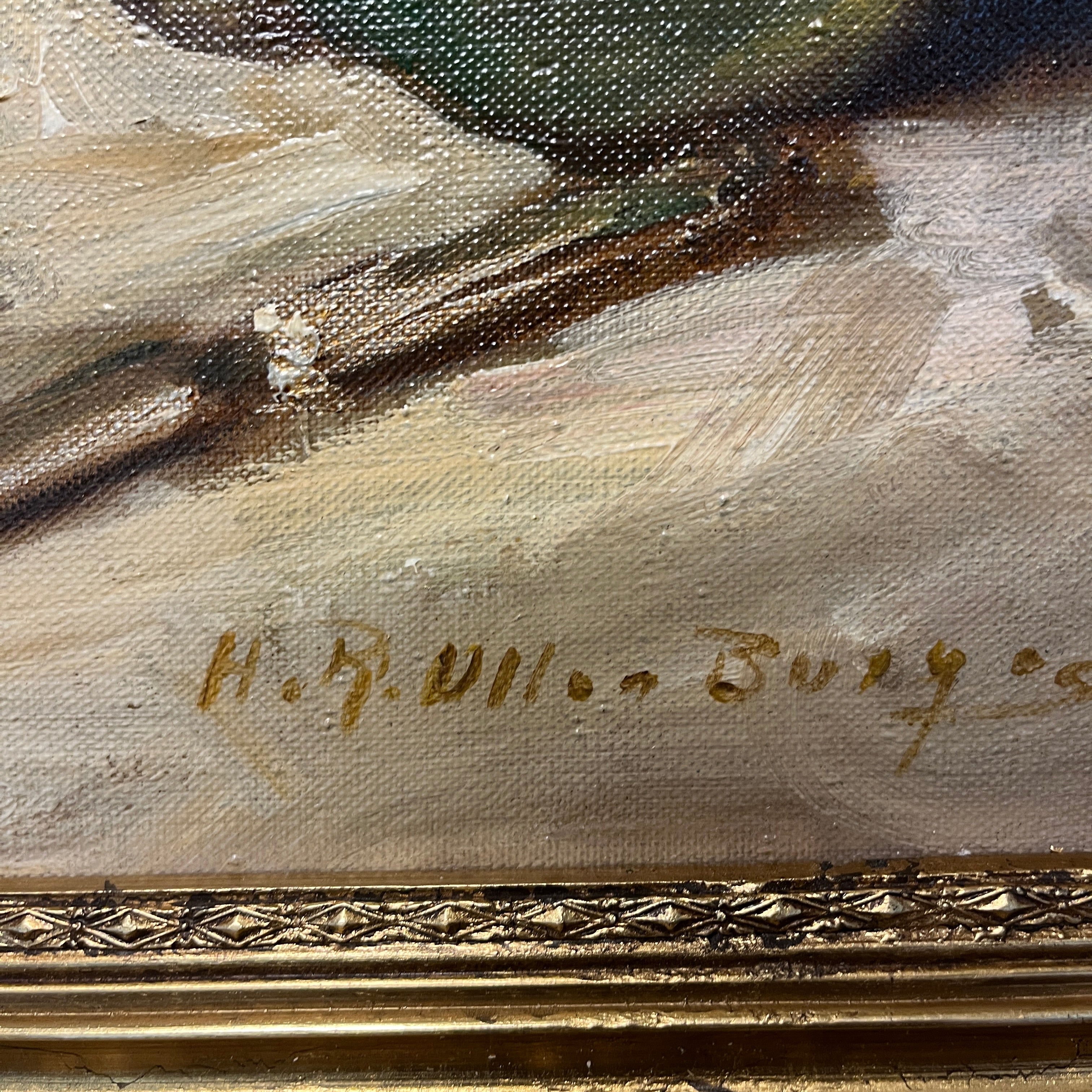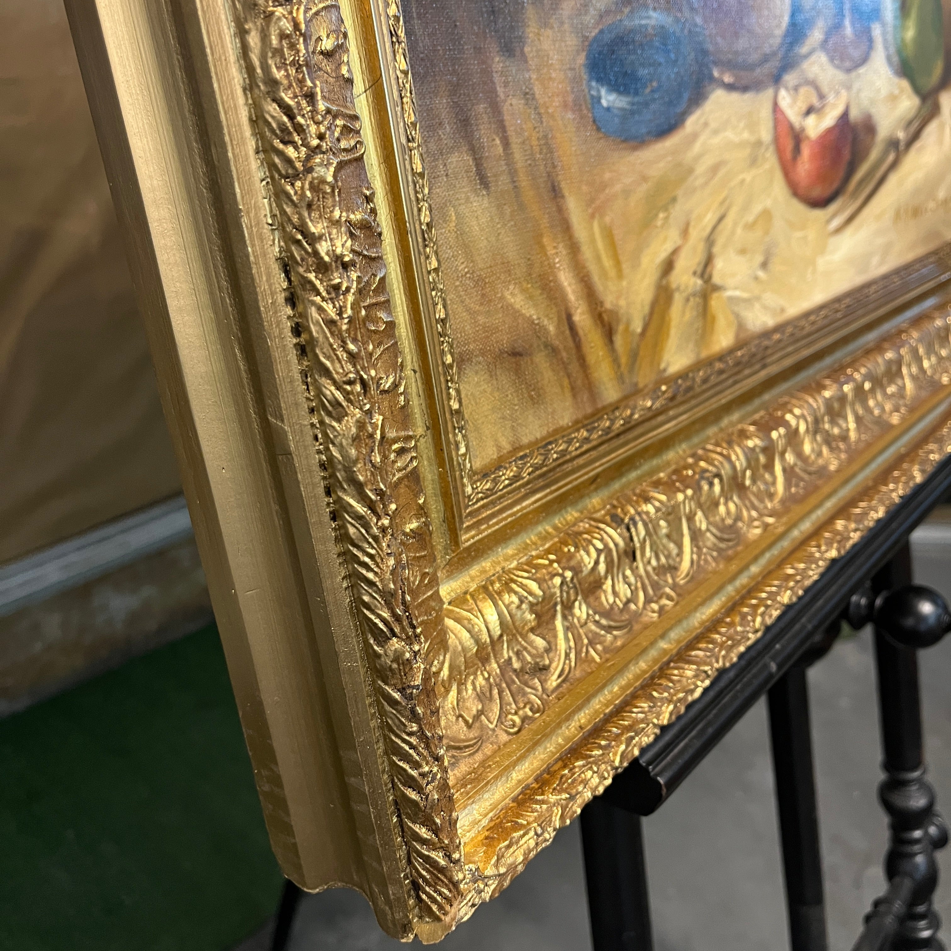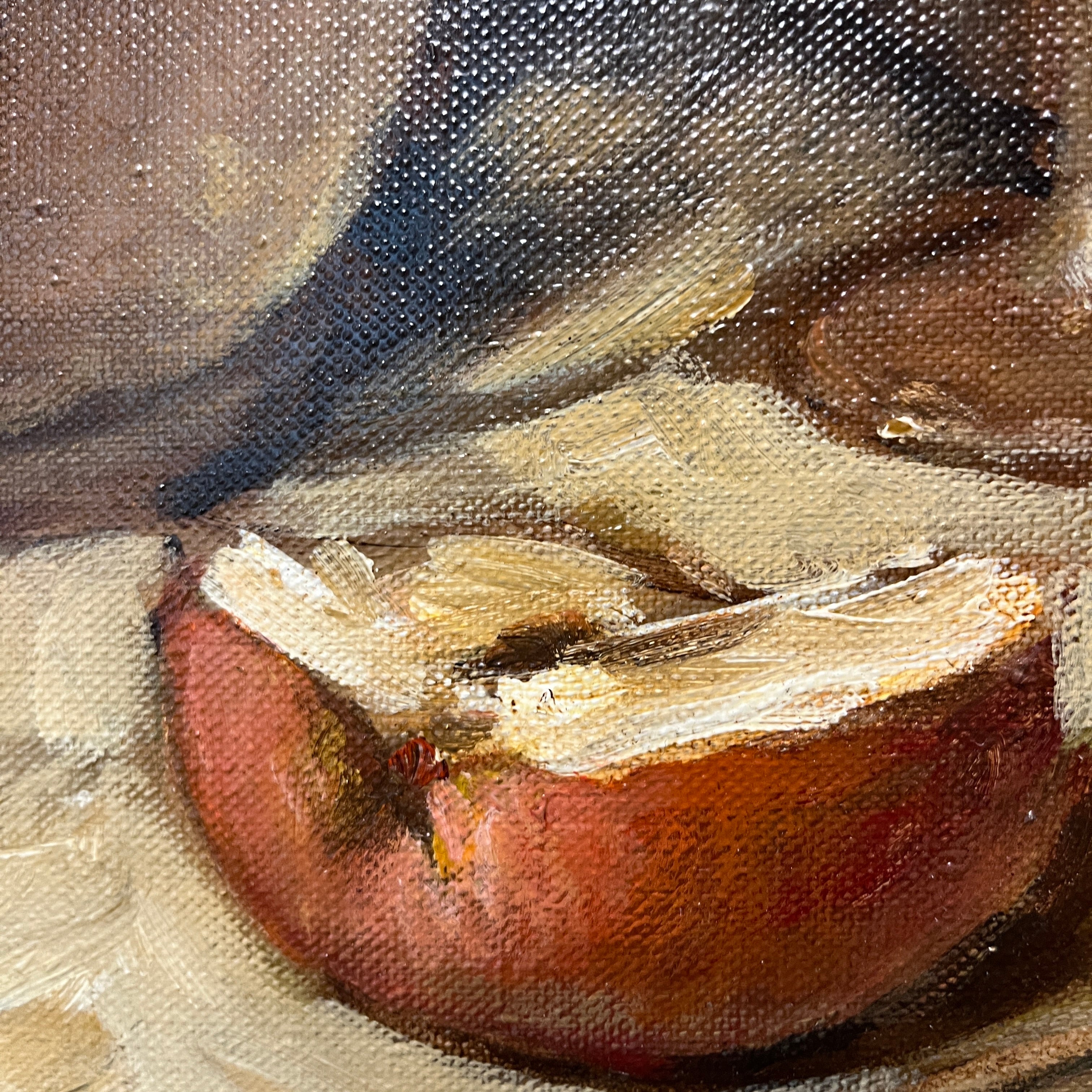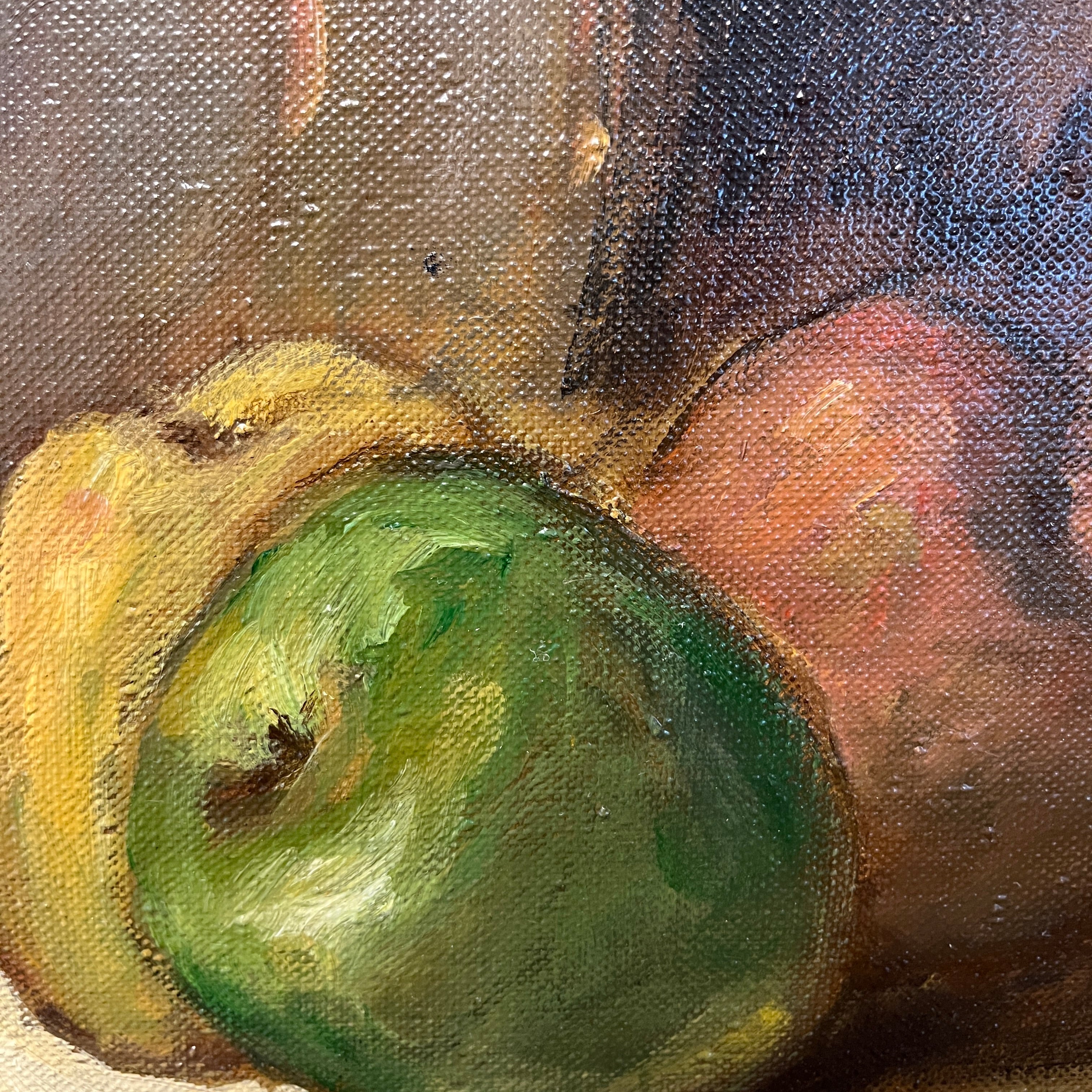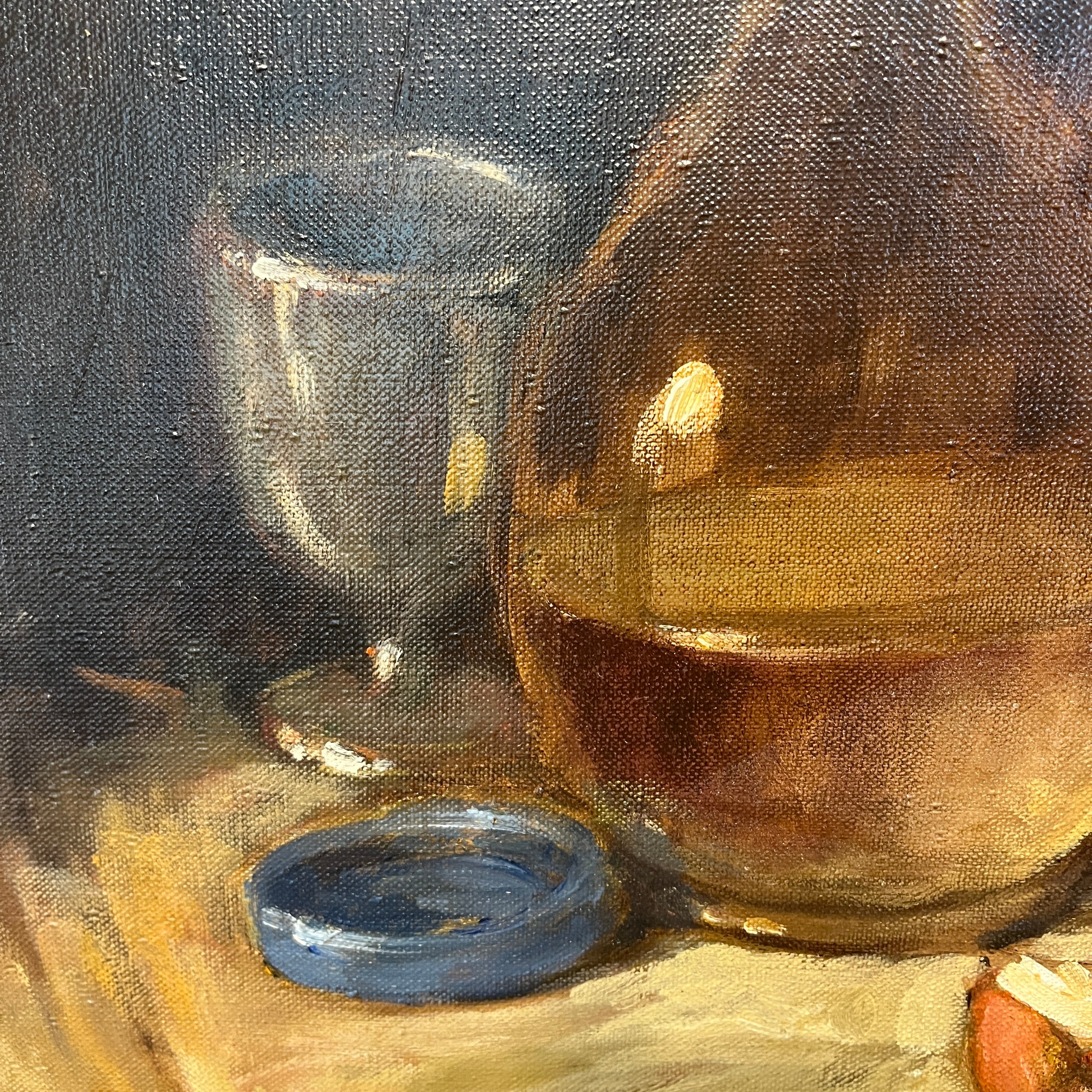 Óleo sobre tela del reconocido artista chileno Raúl Ulloa Burgos, representando un bello bodegón de colores cálidos. En la composición podemos ver algunas manzanas y objetos de cristal para la mesa, como una botella, una copa, un plato y un cenicero. Es una naturaleza muerta con un  juego entre los tonos dorados cálidos y colores primarios saturados, que hacen resaltar los elementos. La obra está enmarcada en madera tallada en finos relieves y terminada en dorado.