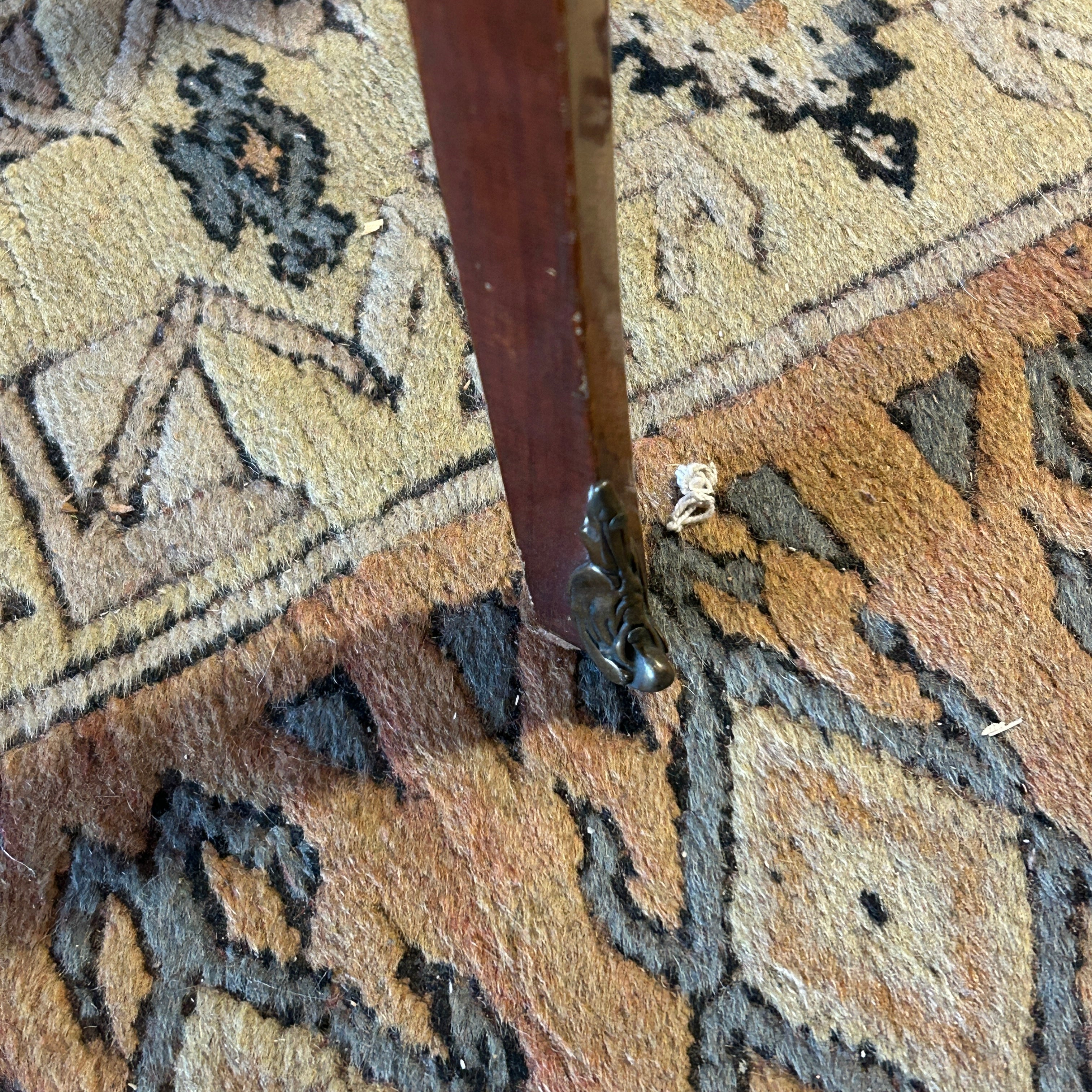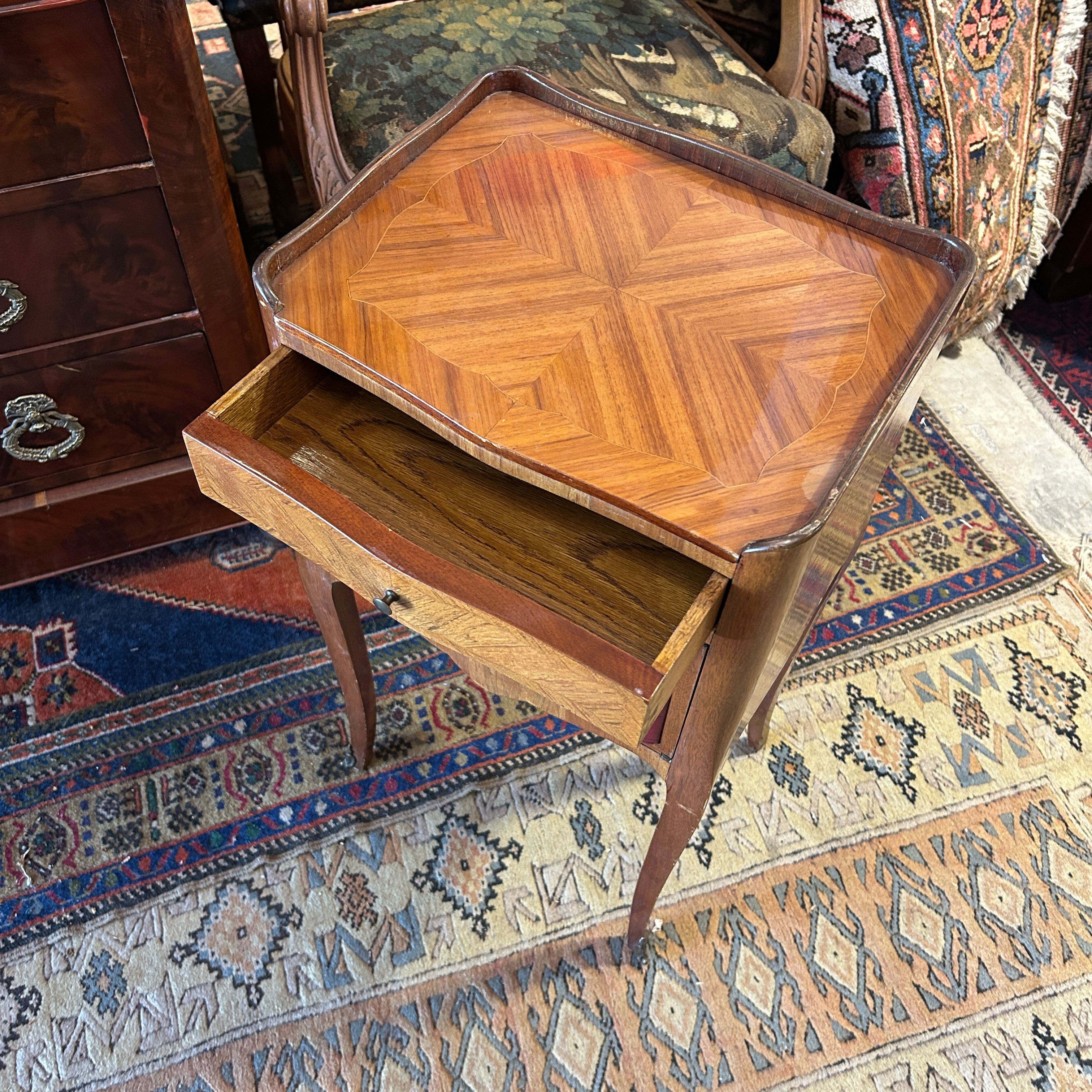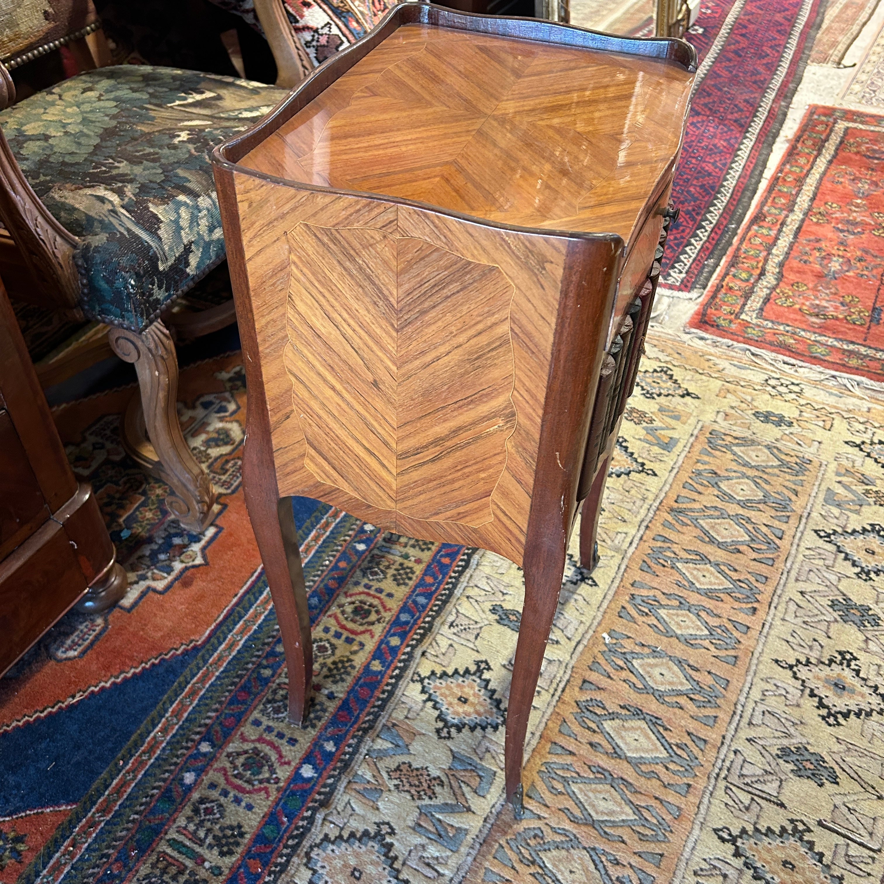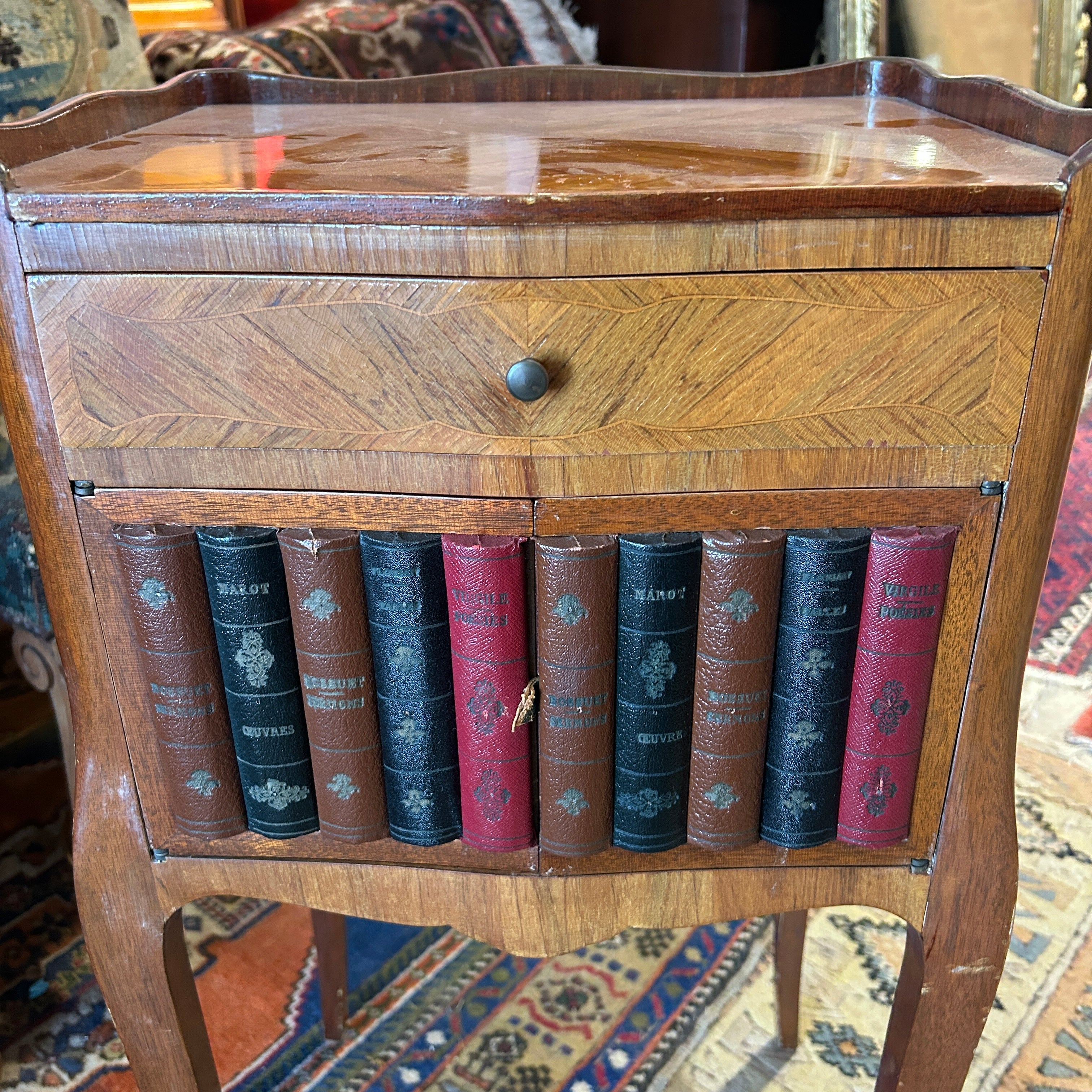 Velador de origen francés estilo Luis XVI, hecho de madera enchapada. La pieza tiene un cajón y dos compuertas, cubiertas con lomos de libros, que dan acceso a un espacio de almacenaje.
