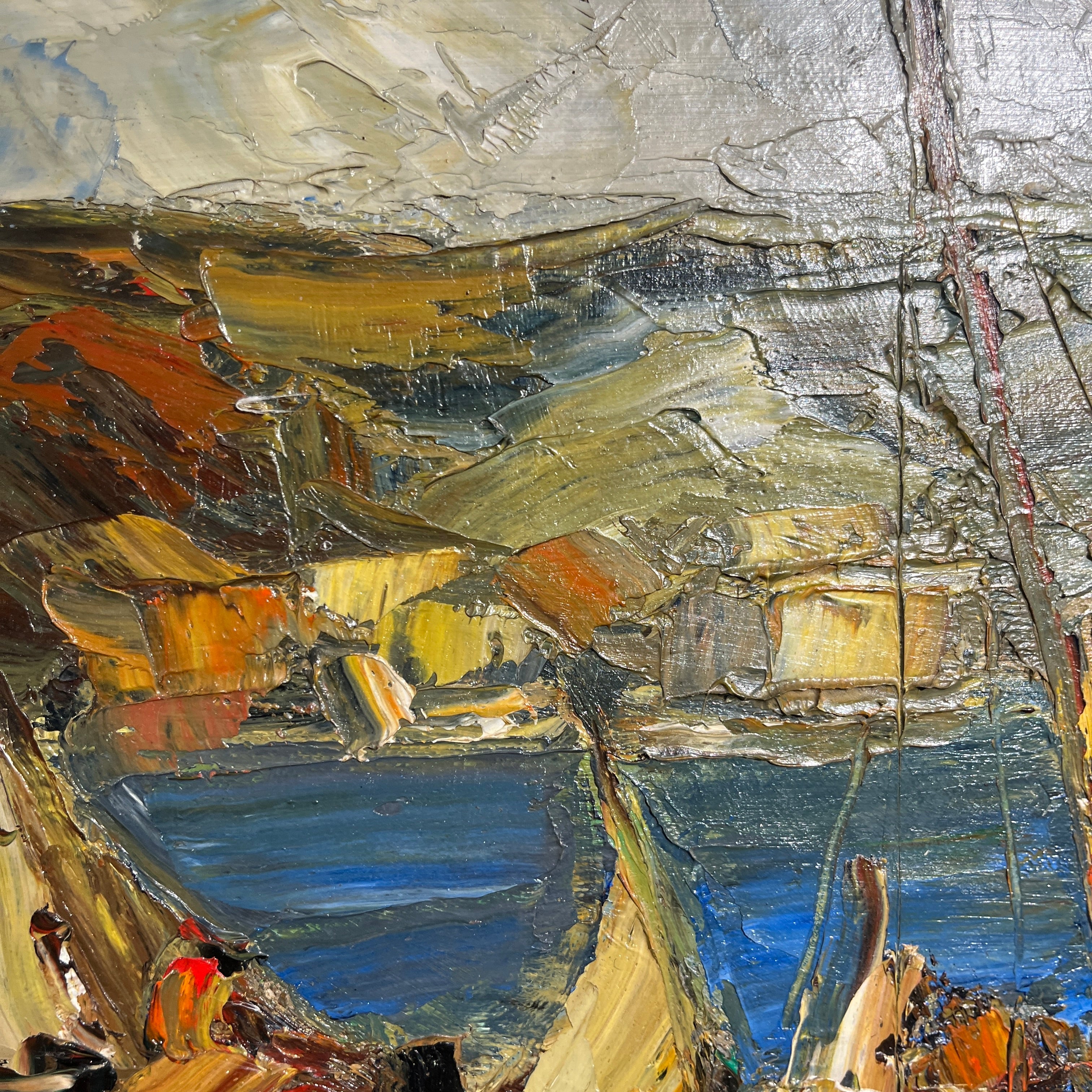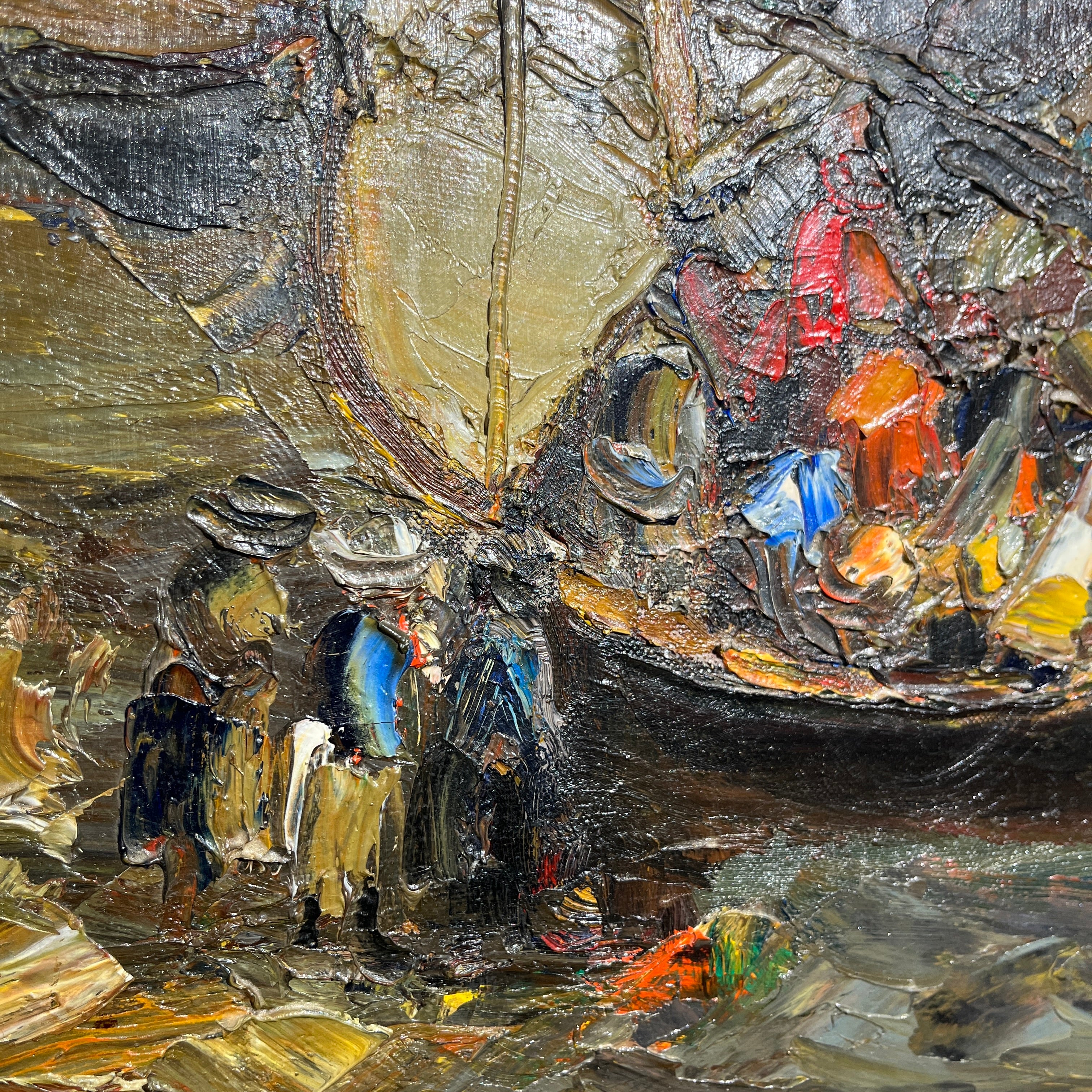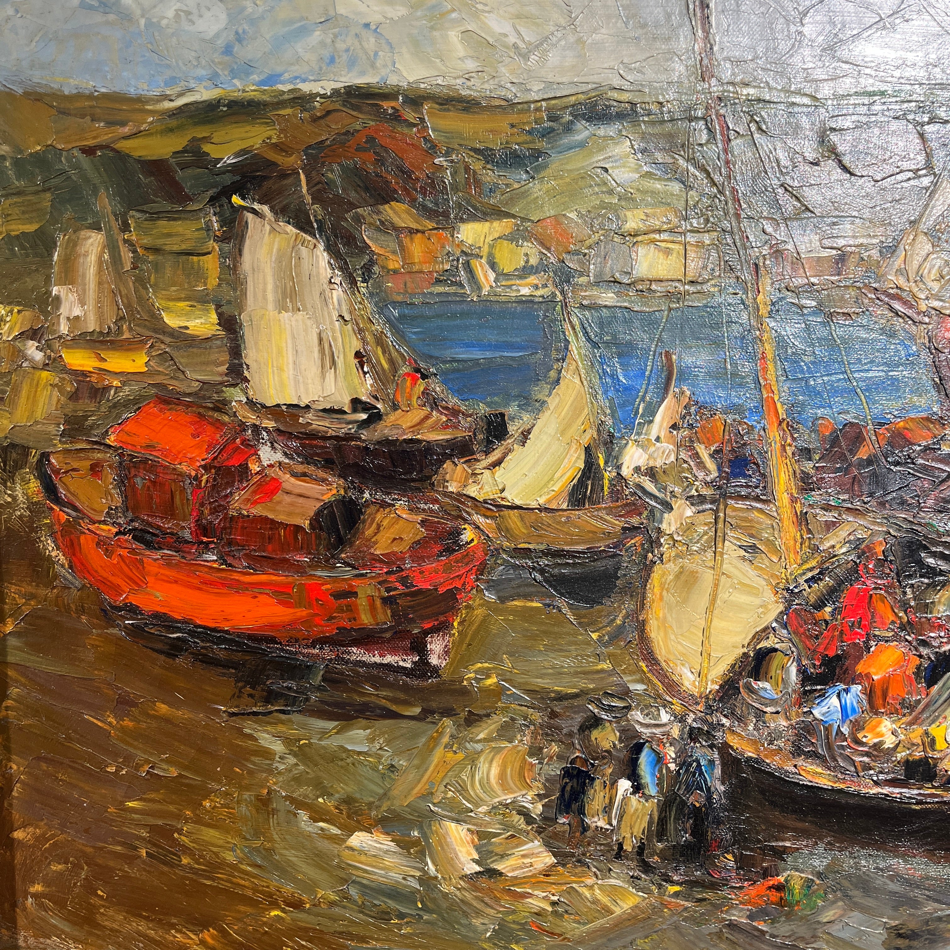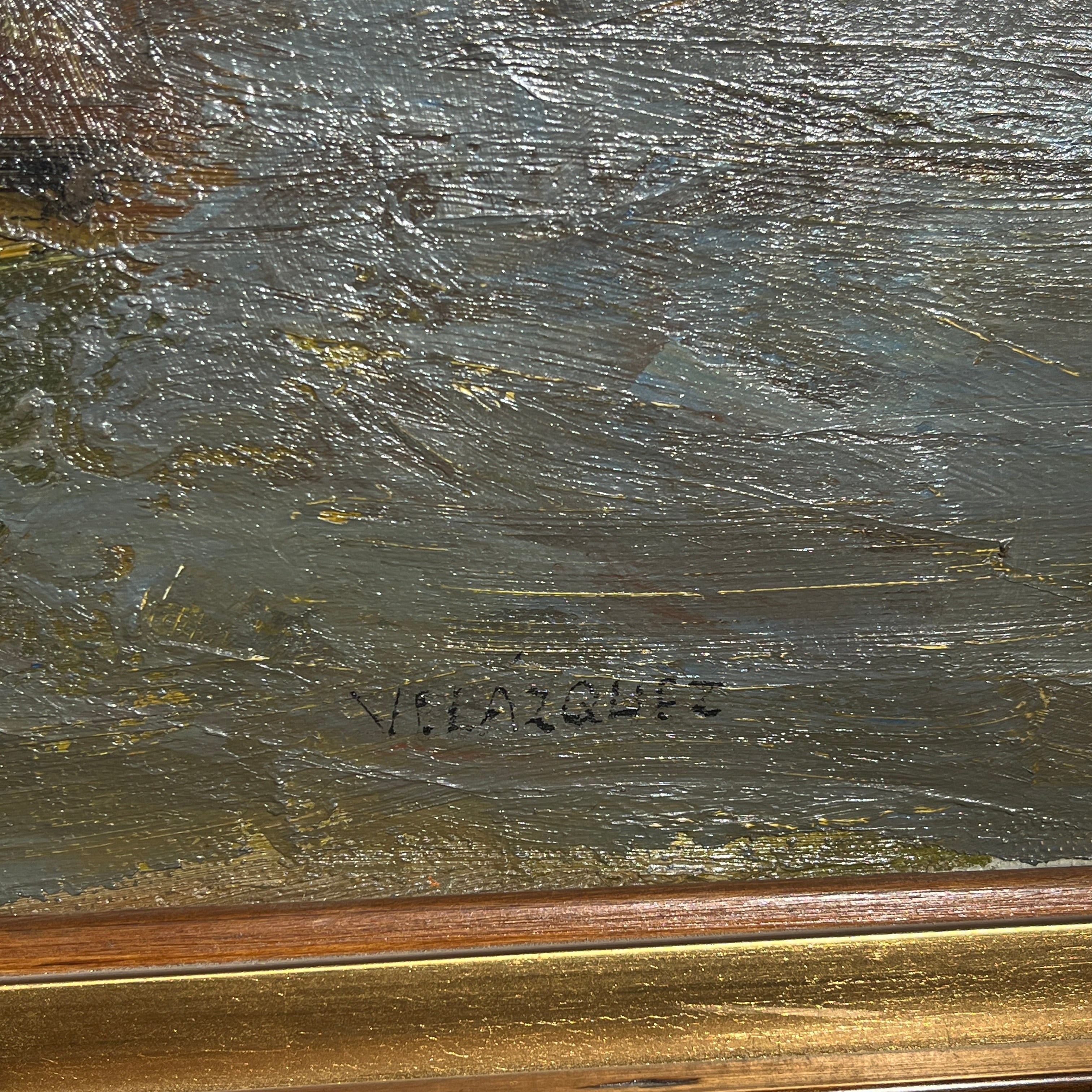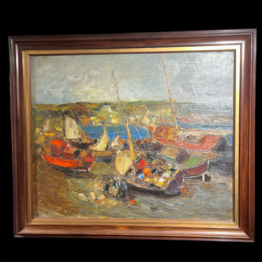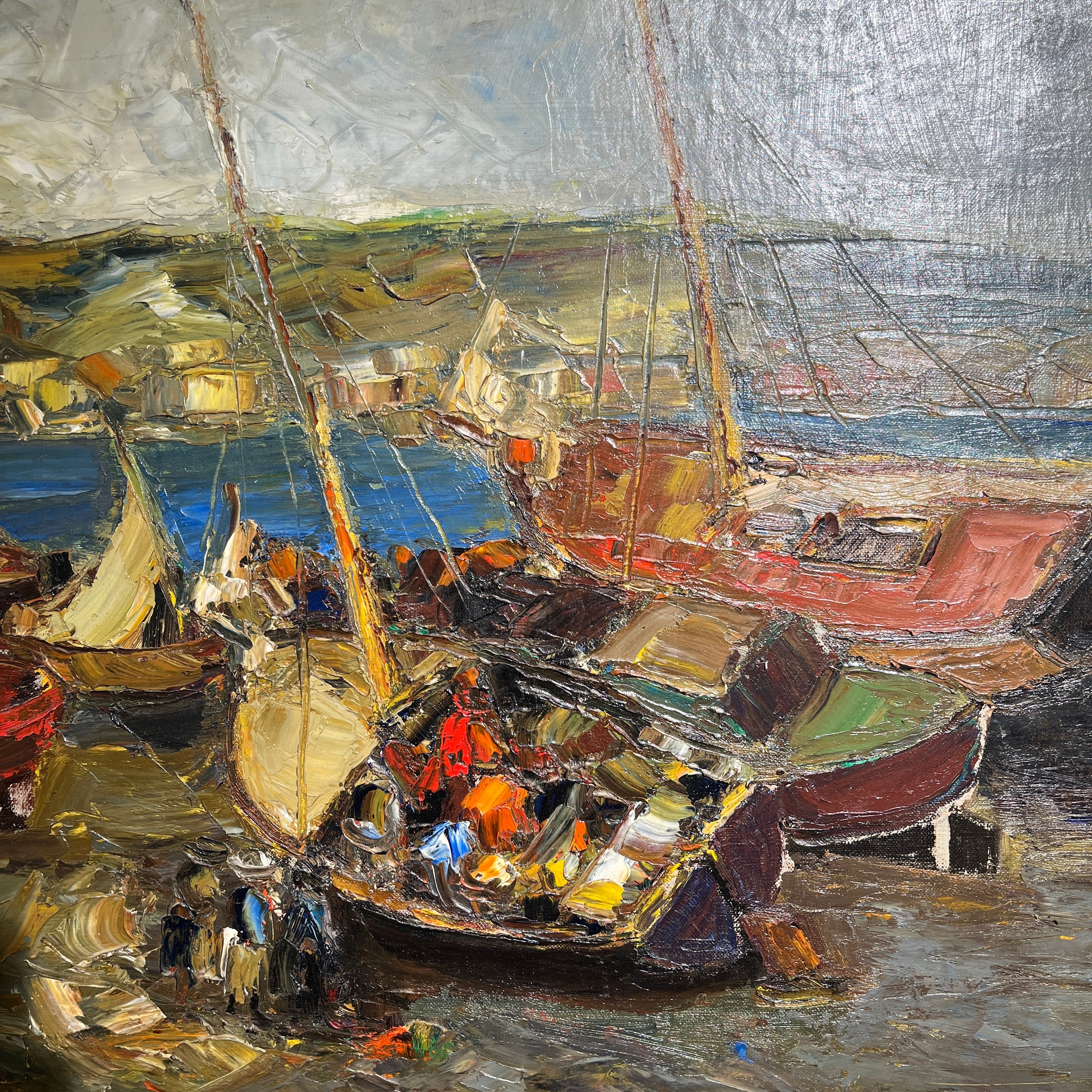 Óleo sobre tela de origen posiblemente chileno, firmado “Velázquez”, representando un paisaje de veleros muy al estilo de Pacheco Altamirano, con un uso expresivo de la materia y el trazo, dándole volúmenes y movimiento a los veleros. Los verdes priman en el fondo de la composición, mientras que tonos de rojo y azul sirven como contrapunto para destacar elementos como el velero central y algunos personajes, seguramente pescadores, descargando la mercadería. En el horizonte podemos ver una costa con casitas y sobre ella, el cielo. La obra tiene un marco de madera de diseño sobrio, con un borde interior en dorado.