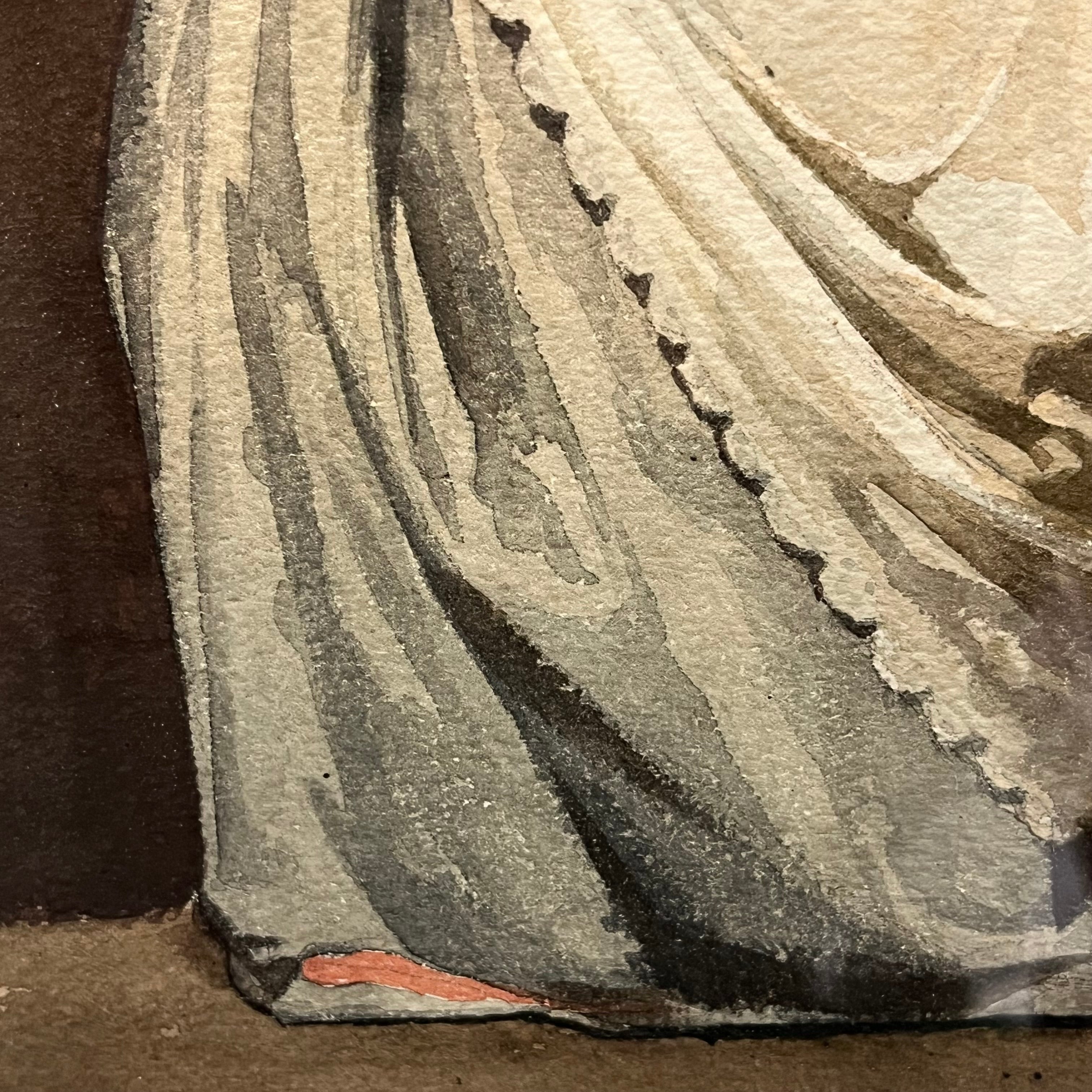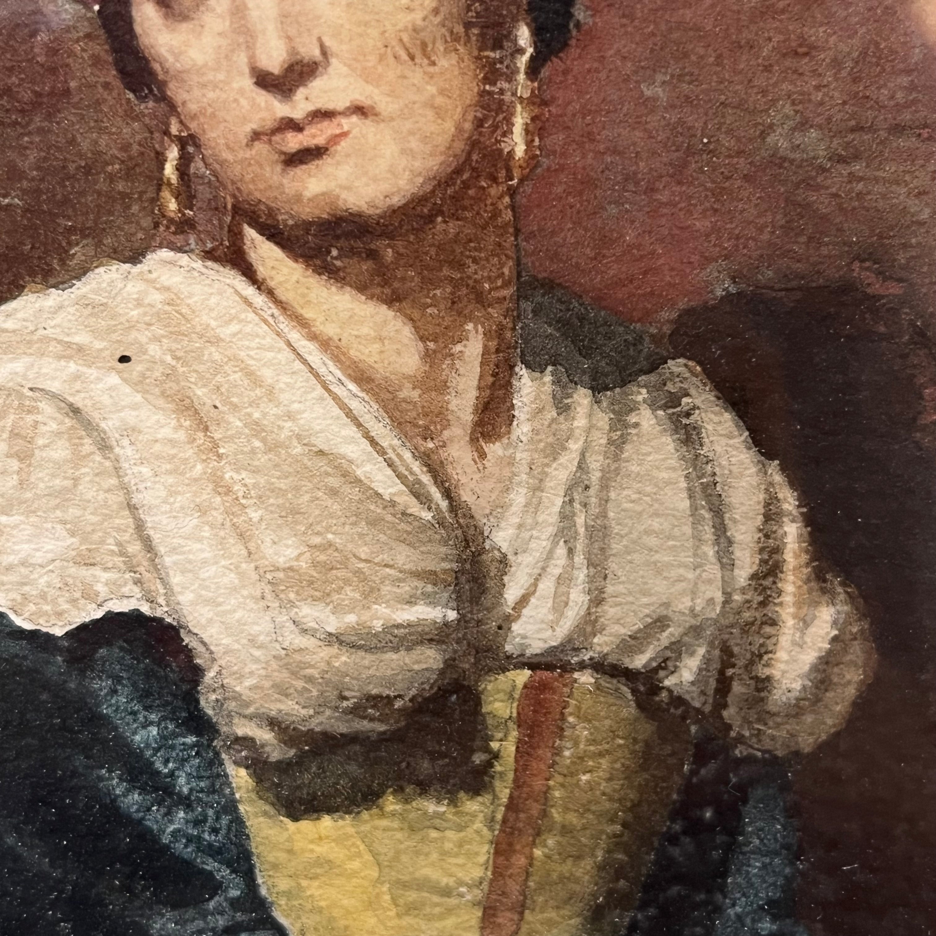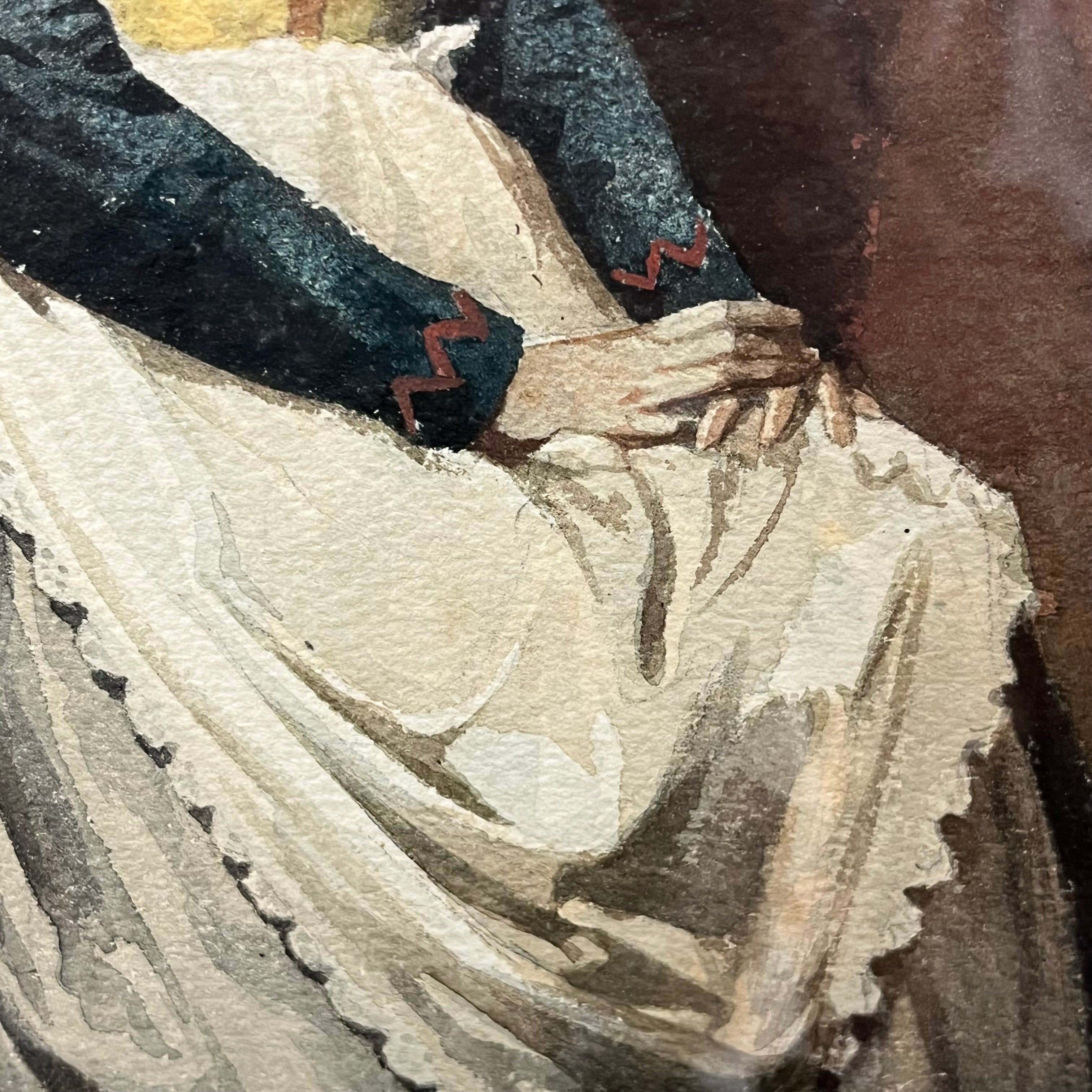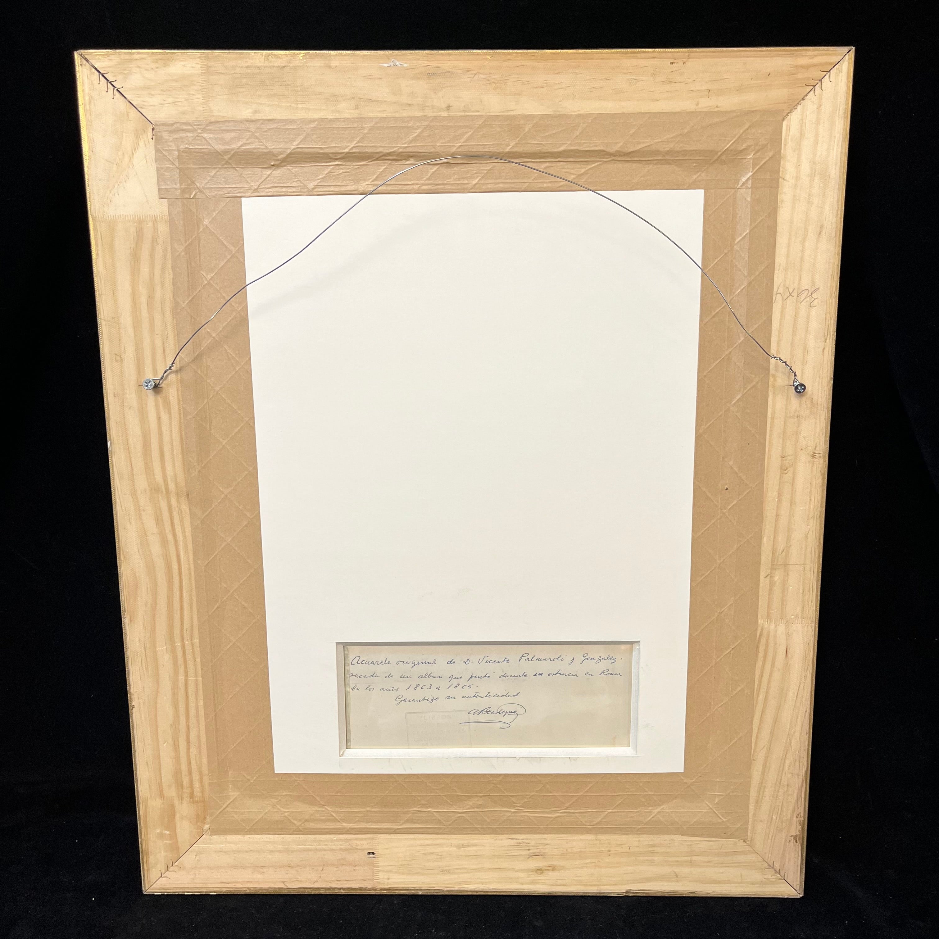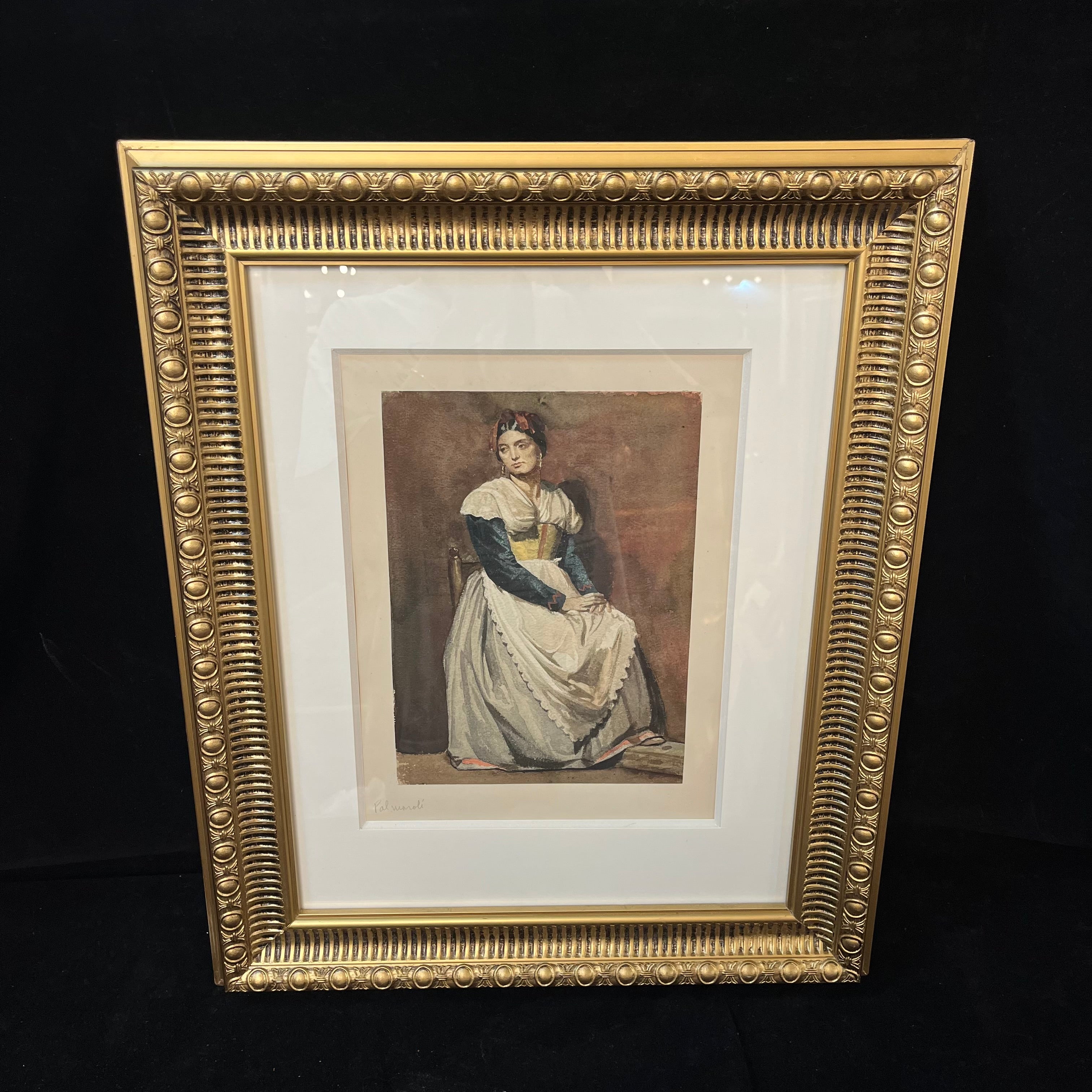 Acuarela sobre papel del pintor español Vicente Palmaroli y González, representando a una mujer posando, sentada sobre una silla. Lleva un vestido sencillo y un delantal blanco, lo que nos sugiere que se trata de una mujer de un contexto sencillo y no de una aristócrata. El cuadro está pintado con oficio y dominio de la técnica de la acuarela, capturando los detalles con definición y matices en tonos, luces y sombras. En la parte posterior se enmarca en un paspartú una garantía de autenticidad de Antonio Serdegué, anticuario madrileño, asegurando que esta acuarela fue encontrada en un álbum de Palmaroli, correspondiente a su estadía en Roma entre 1863 y 1865. La obra tiene un marco de madera tallada en relieves y terminada de luminoso dorado.