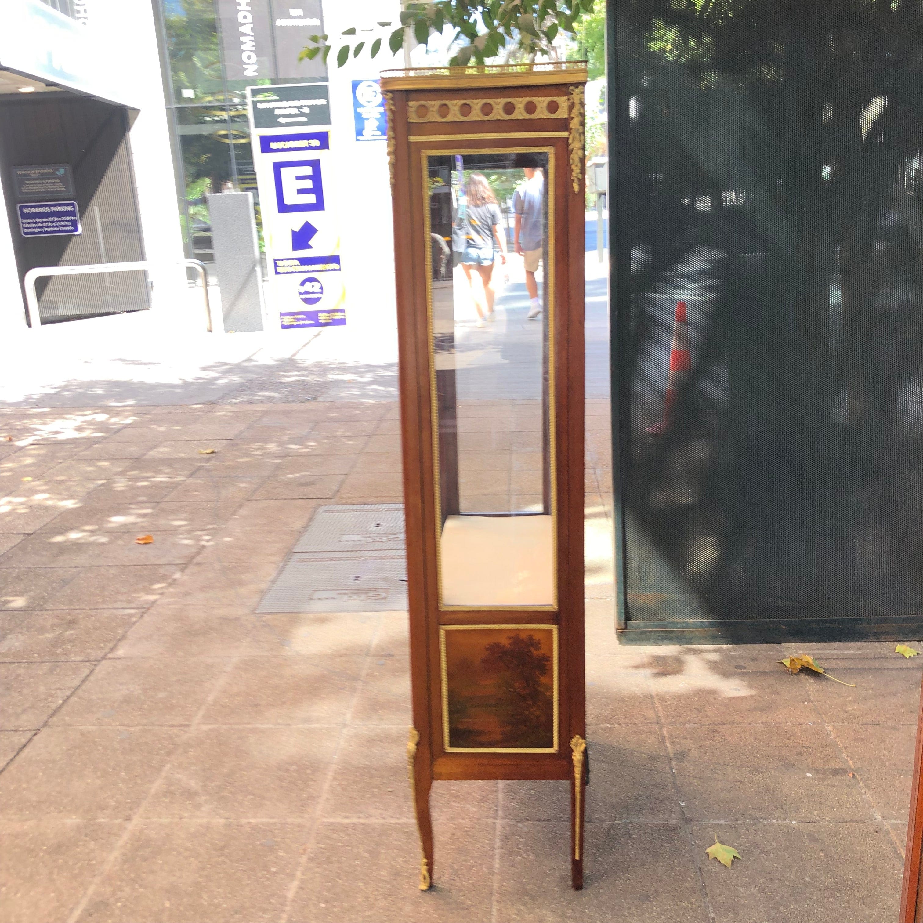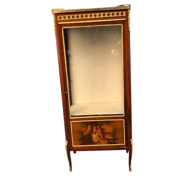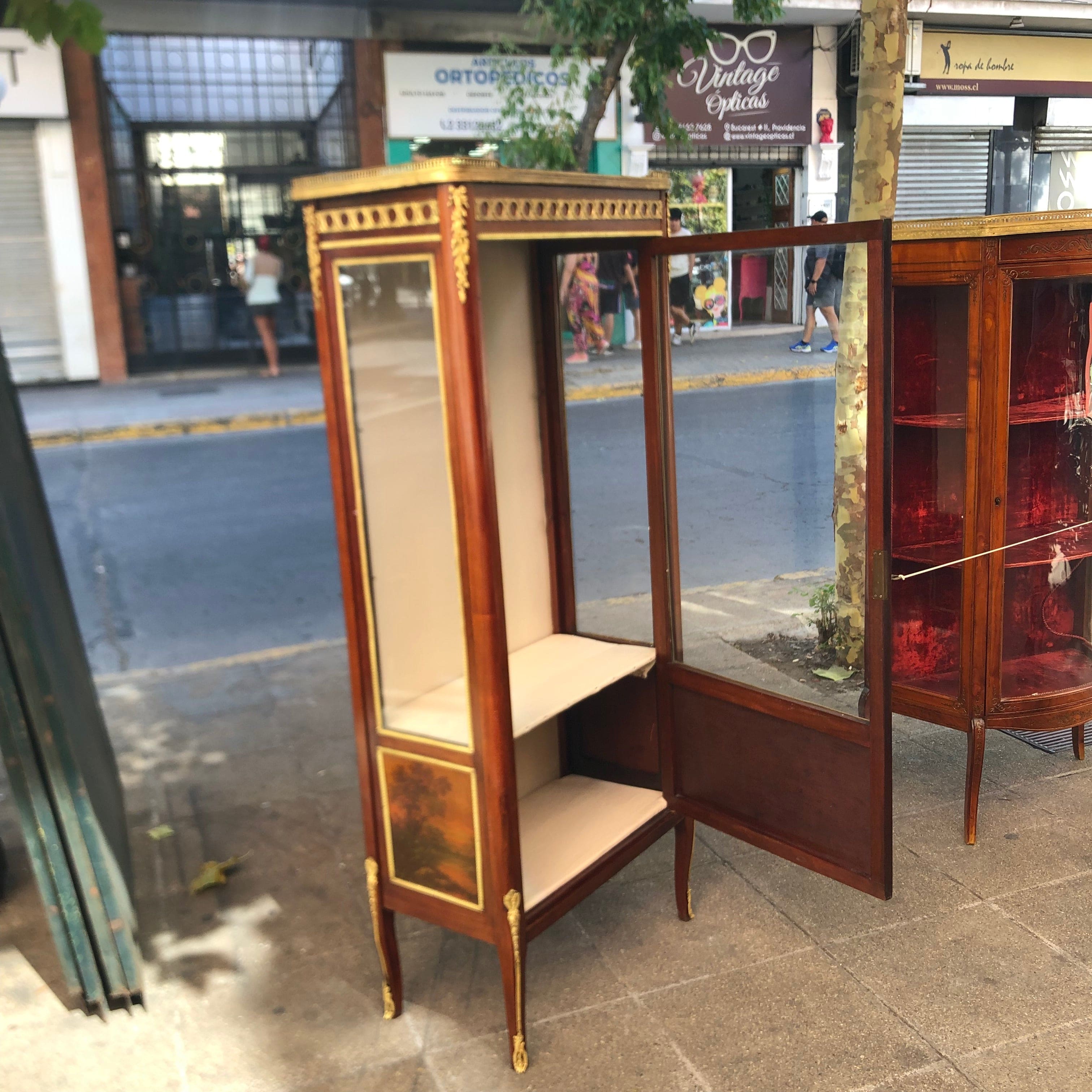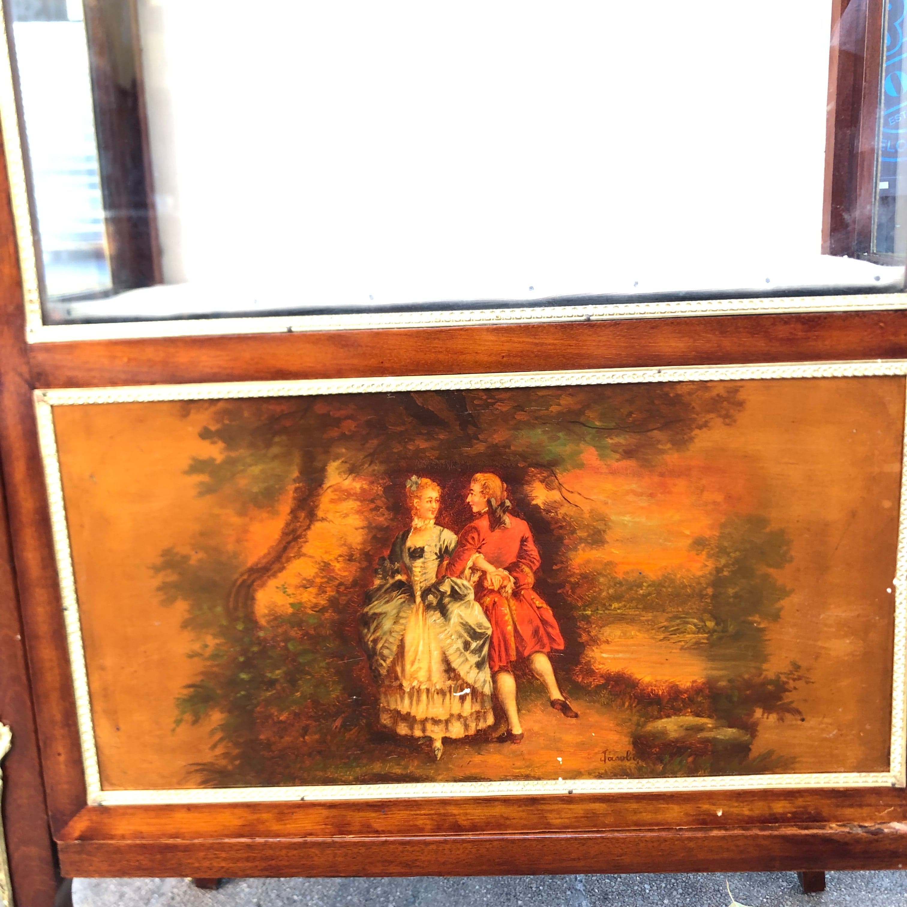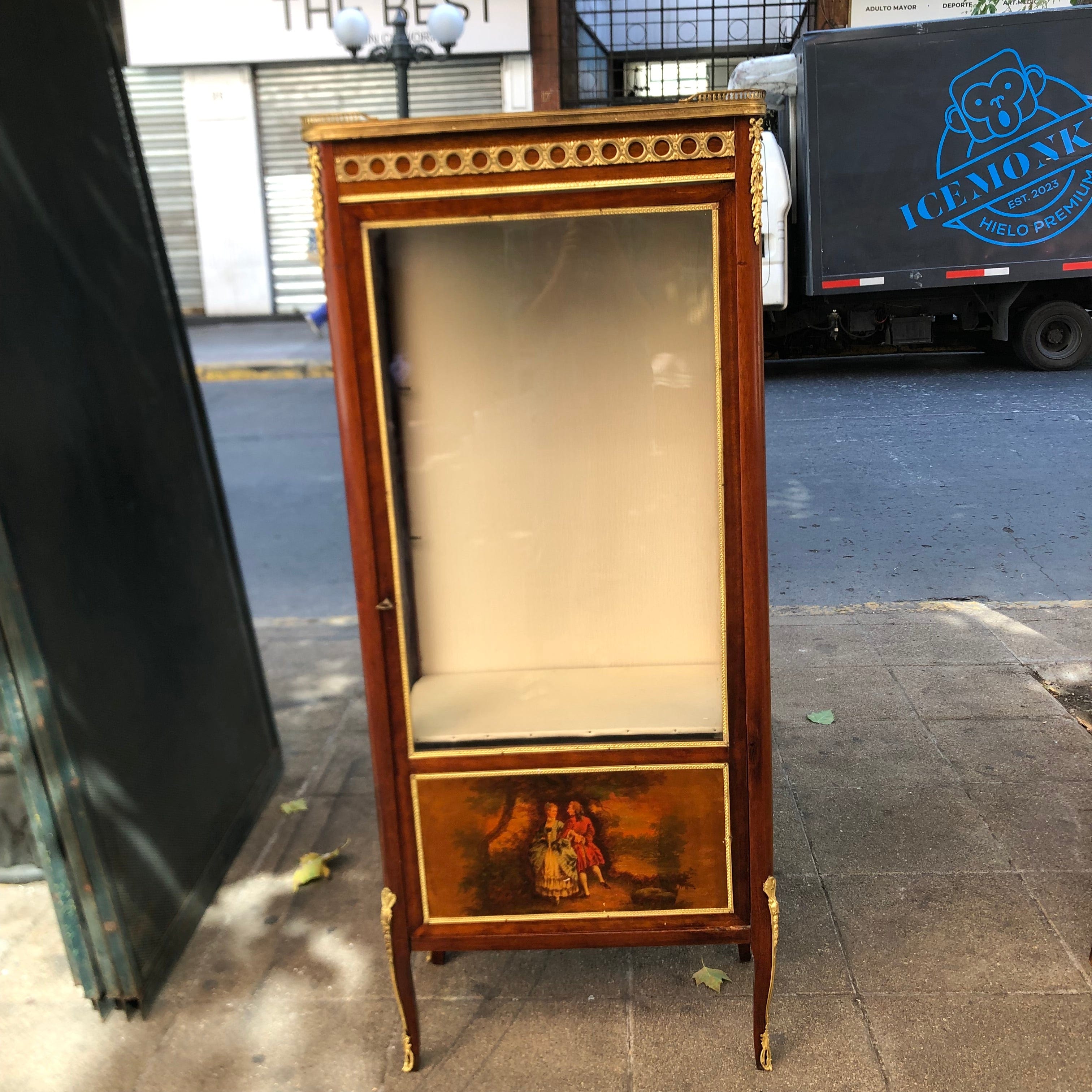 Hermosa vitrina francesa, estilo Vernis Martin en madera caoba y aplicaciones de bronce. Acondicionada con dos repisas, forrada de género blanco en su interior y con verdaderos cuadros en óleo en su diseño, una pareja en su puerta principal y árboles en ambos costados.