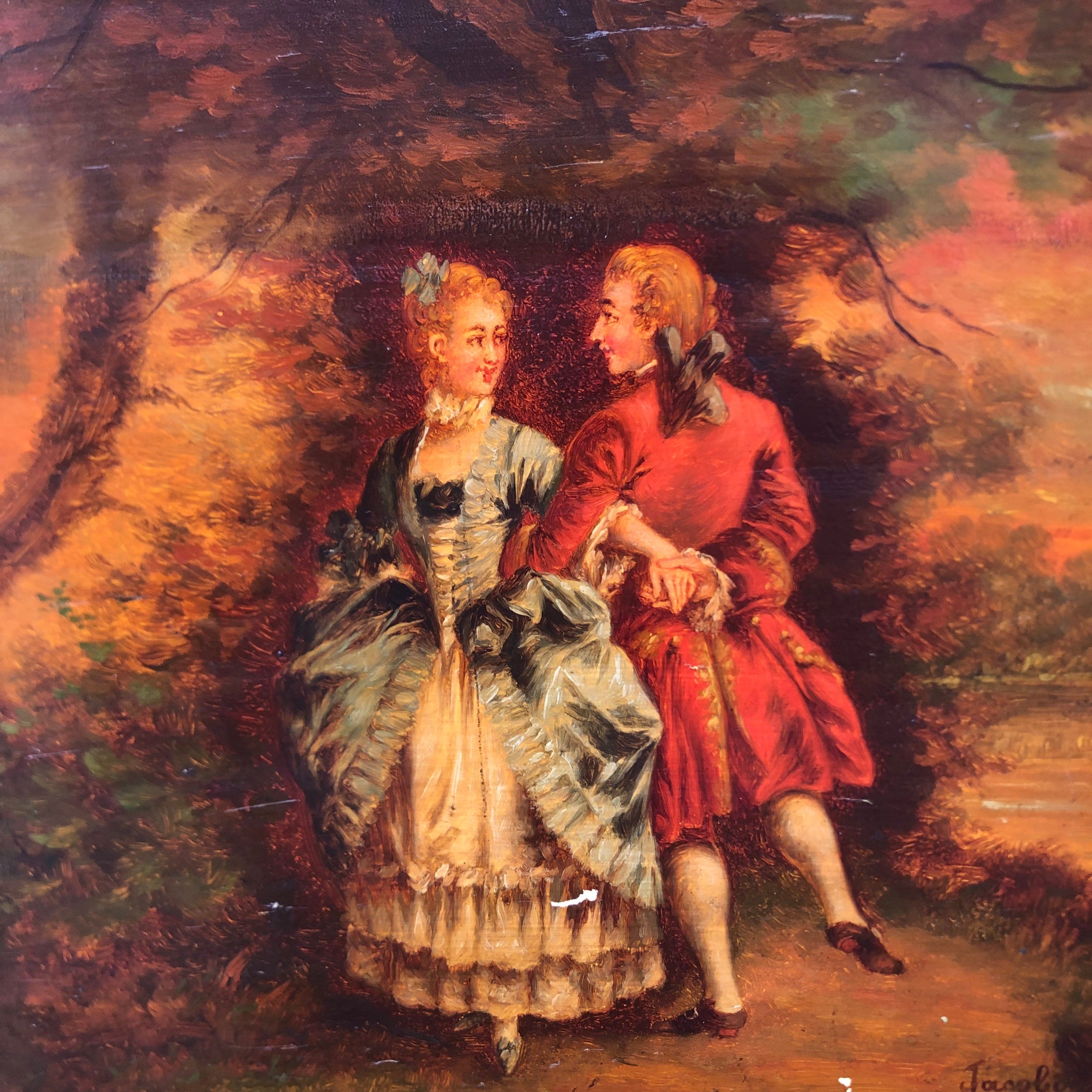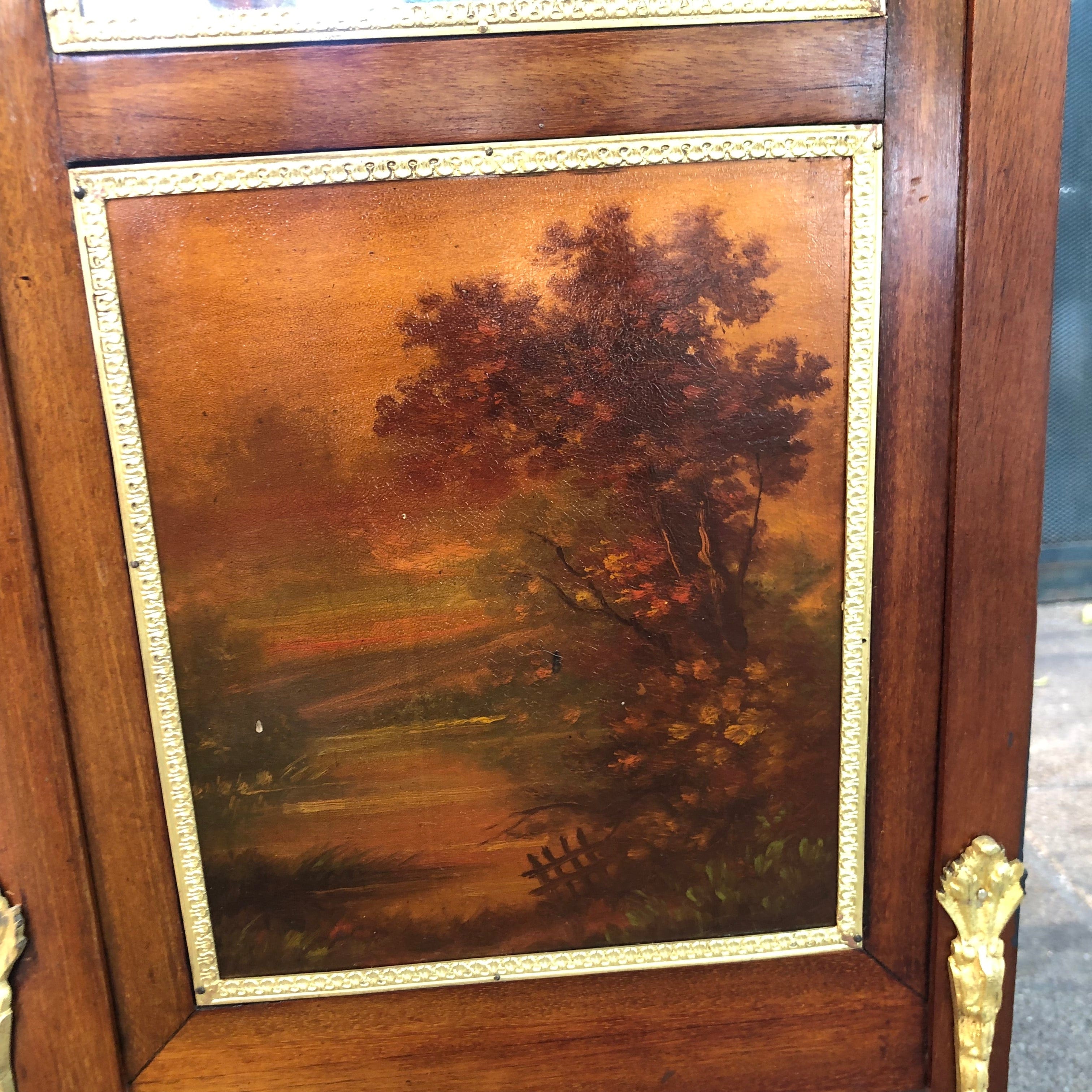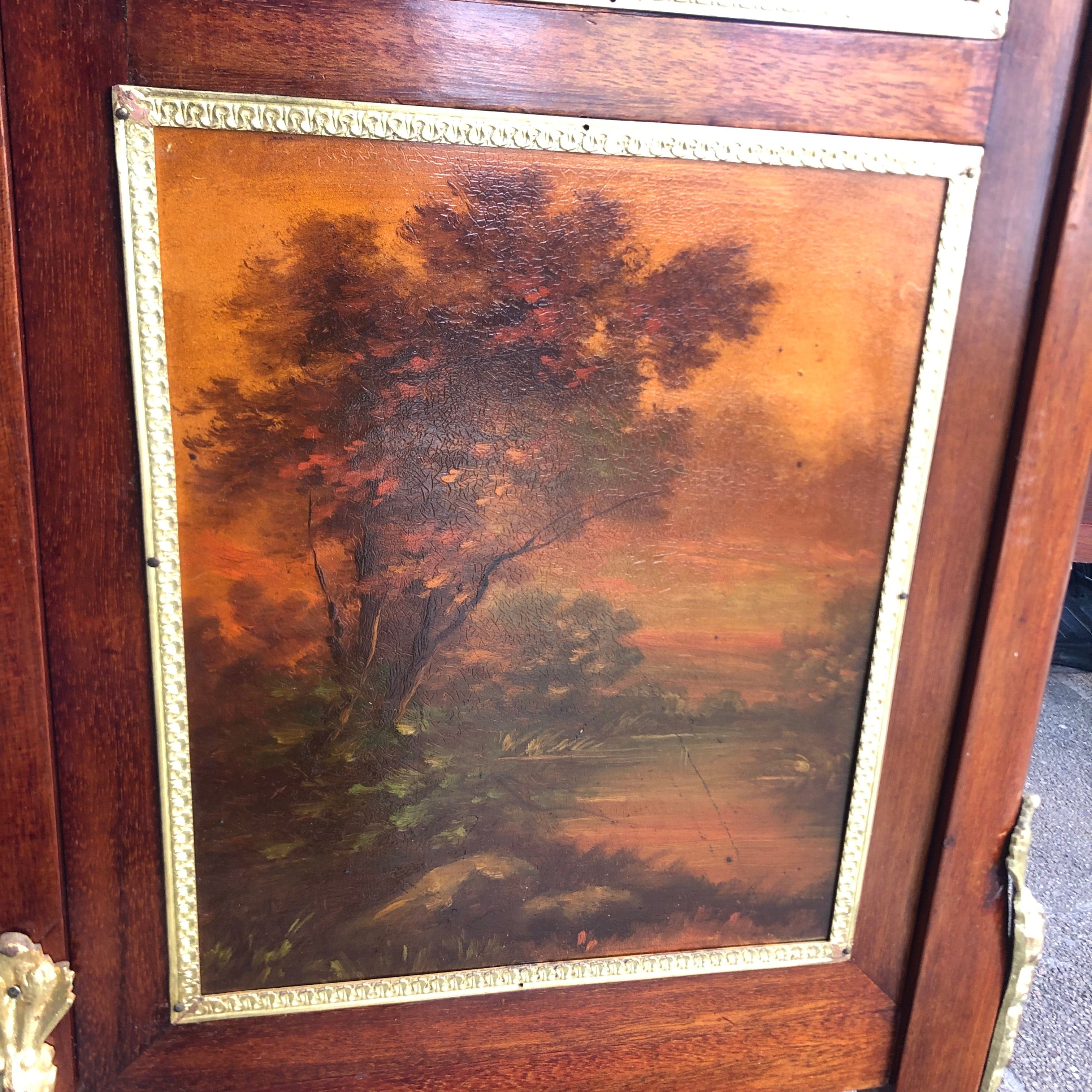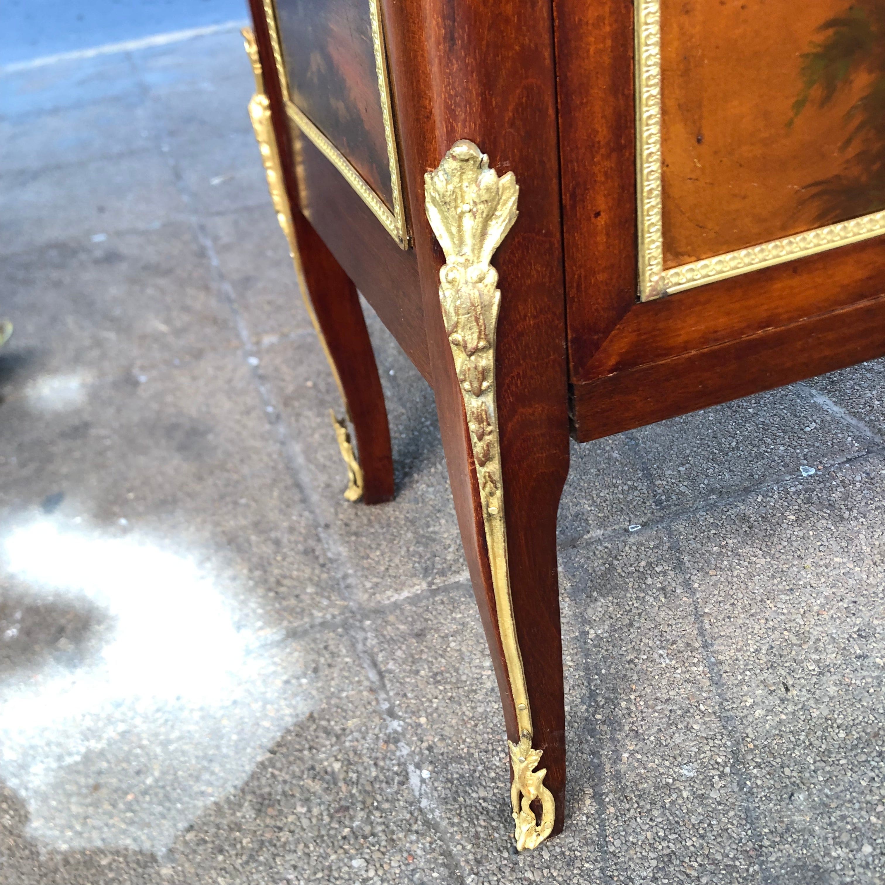 Hermosa vitrina francesa, estilo Vernis Martin en madera caoba y aplicaciones de bronce. Acondicionada con dos repisas, forrada de género blanco en su interior y con verdaderos cuadros en óleo en su diseño, una pareja en su puerta principal y árboles en ambos costados.