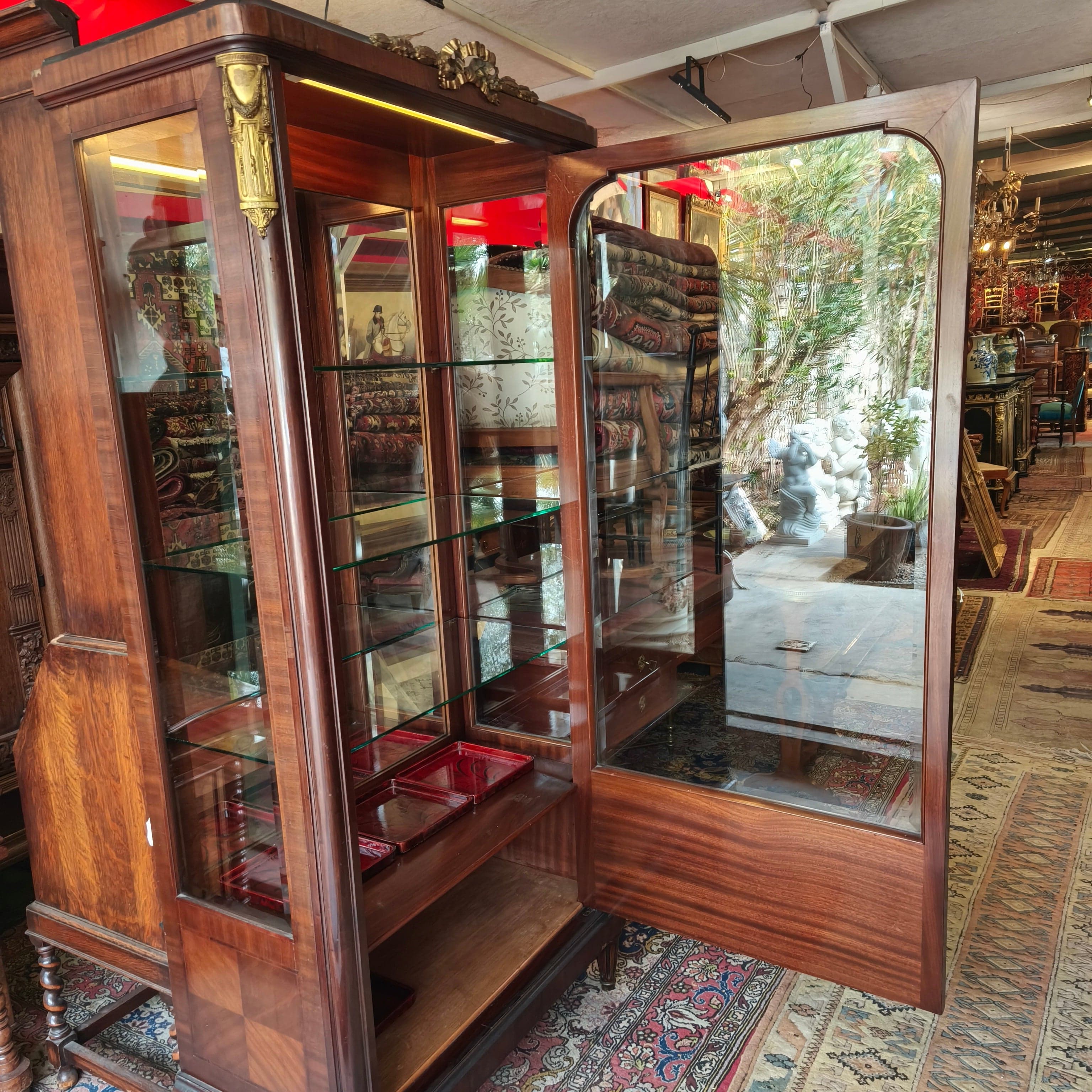 Elegante vitrina francesa de los años 60s en caoba satinada, estilo Luis XVI. Tiene cinco niveles, tres repisas de vidrio de 10 milimetros y dos repisas de madera.