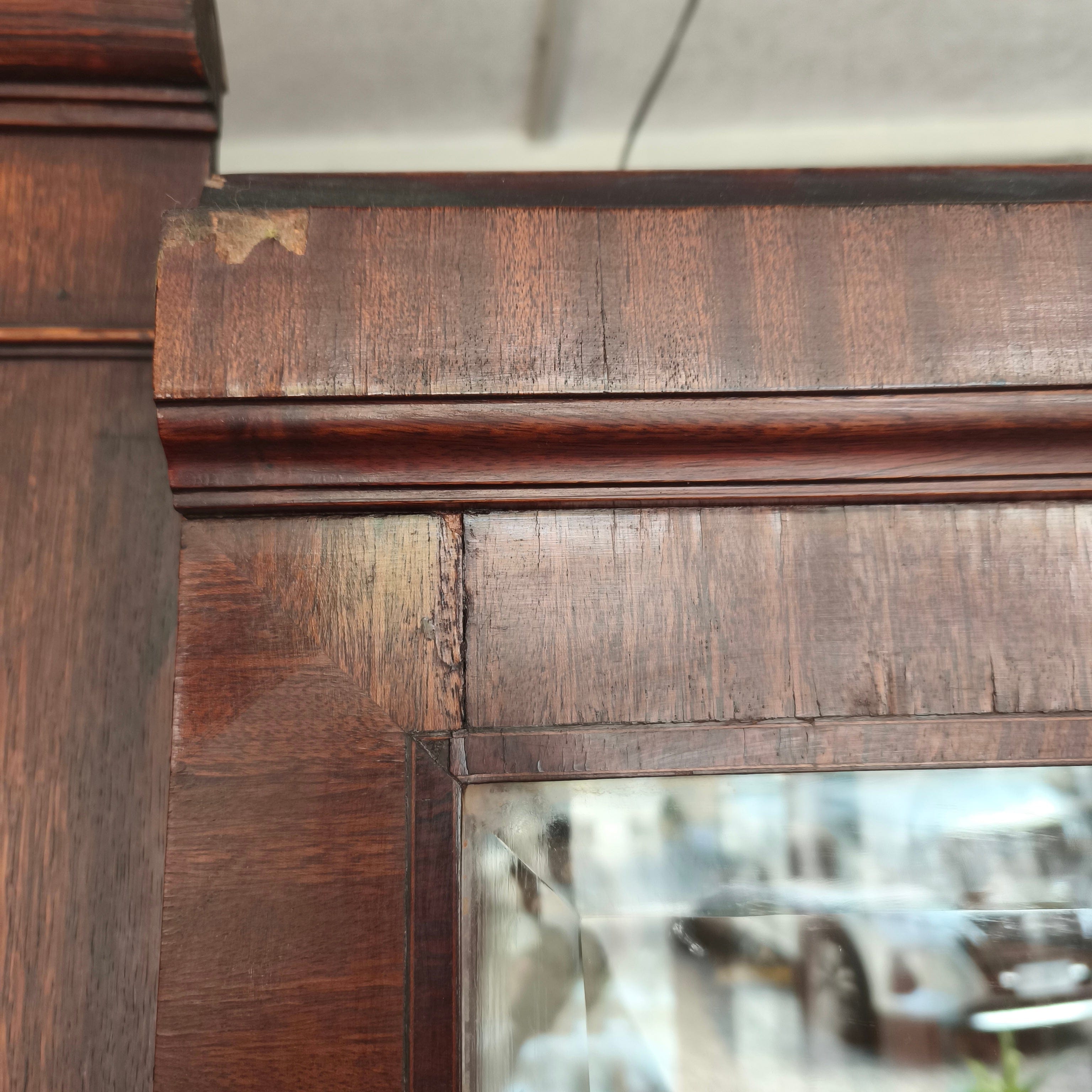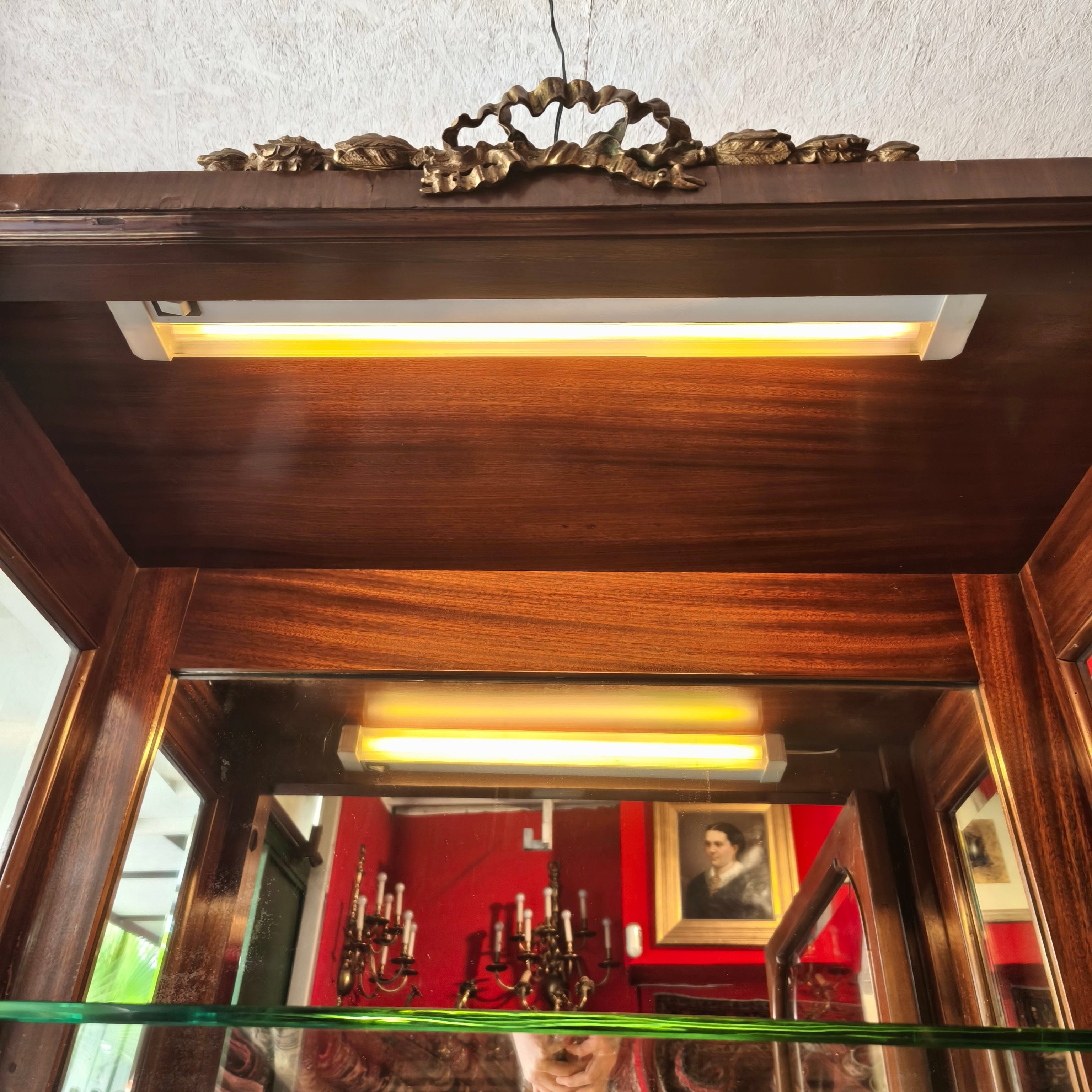 Puertas y laterales de vidrio vicelado de 25 milímetros. Tiene un gran espejo de fondo e iluminación con tubo fluorescente. Preciosas aplicaciones de bronce. Accidentes y detalles propios de su antigüedad.