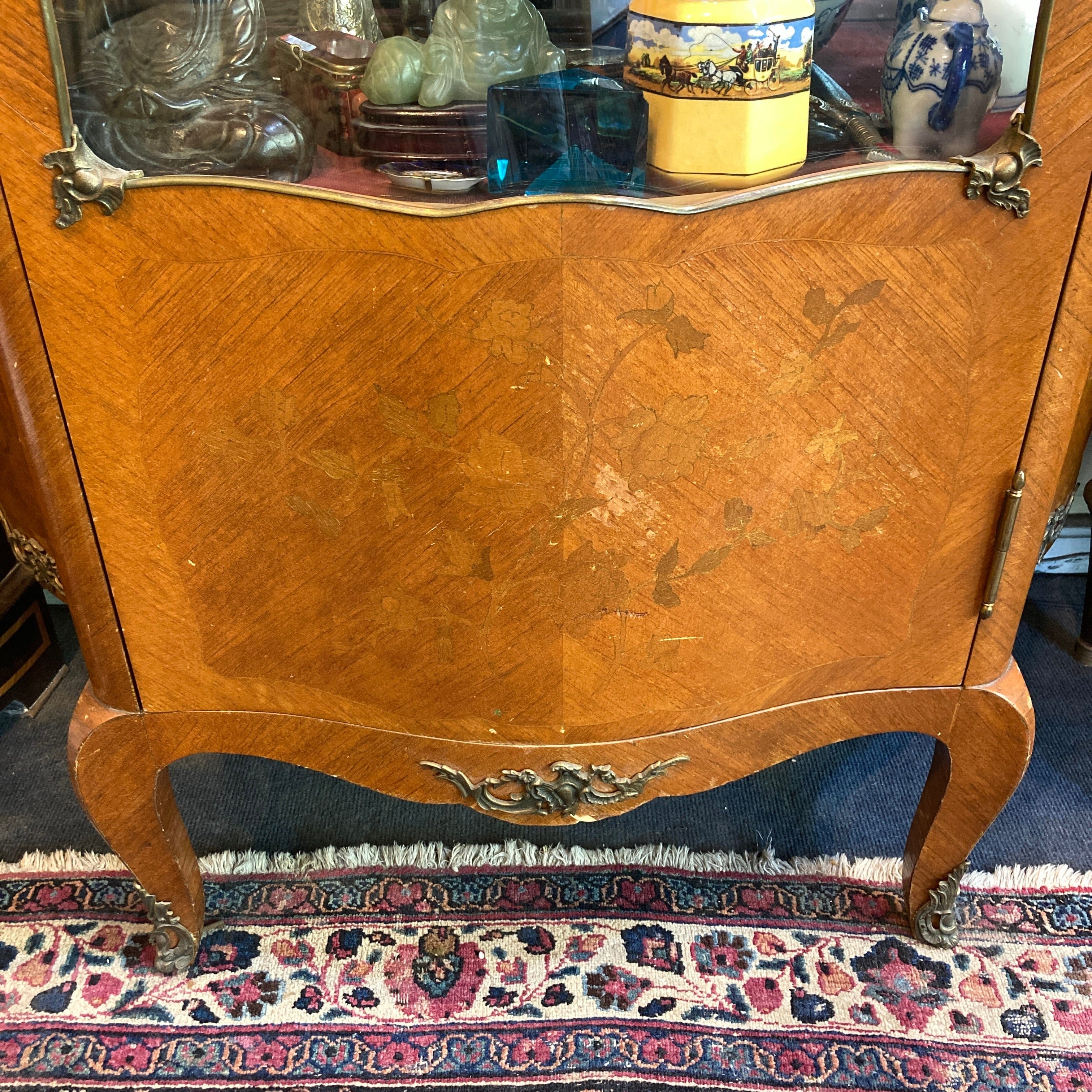 Vitrina Luis XV de medio punto, costados de cristal bombé contra bombé y superficie de mármol. Su interior está tapizado y cuenta con tres repisas y espejo de fondo. Posee un diseño de marquetería en su parte inferior y pequeñas aplicaciones en bronce.