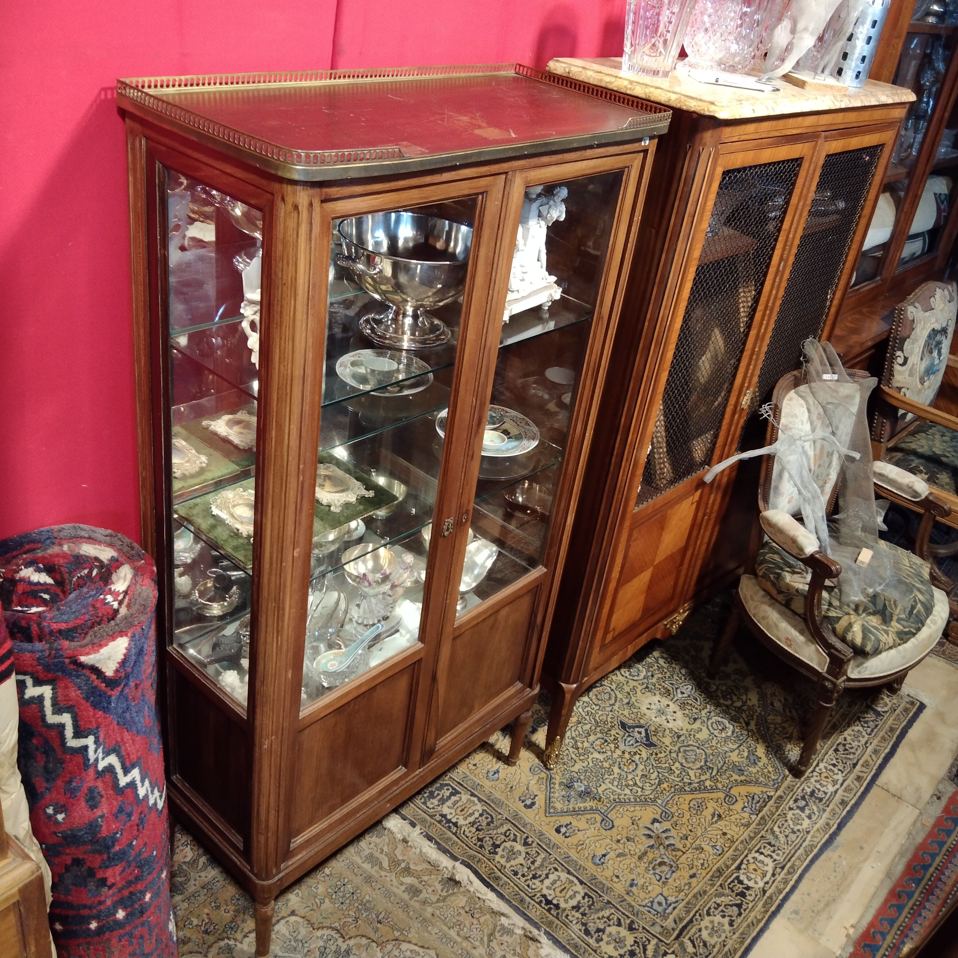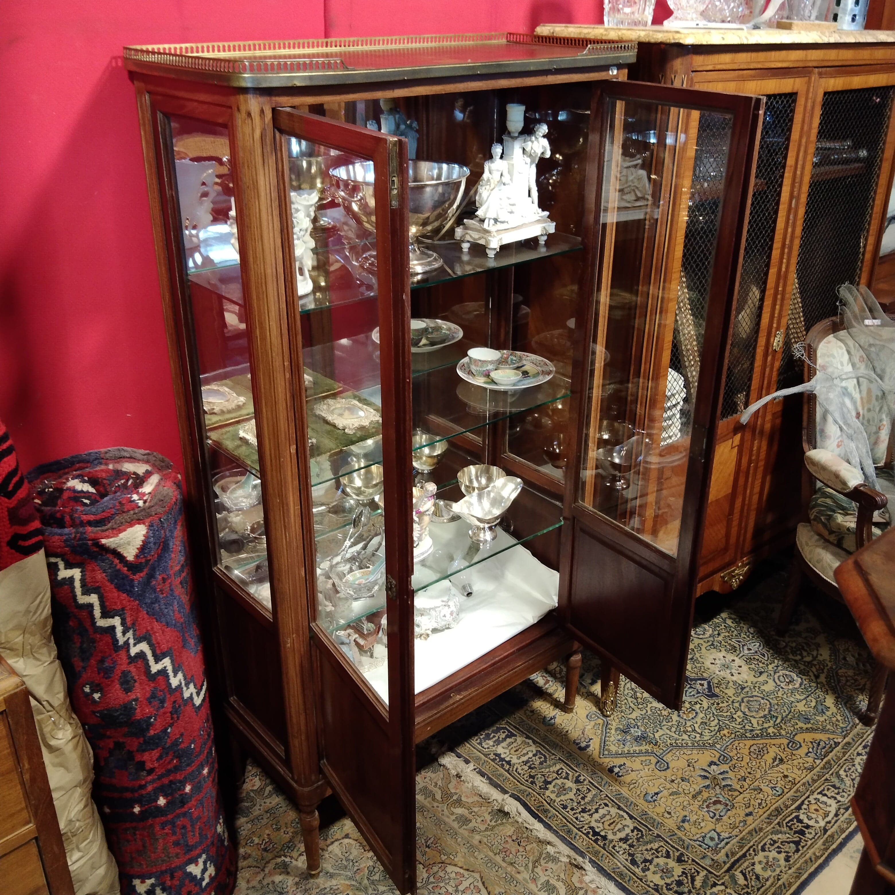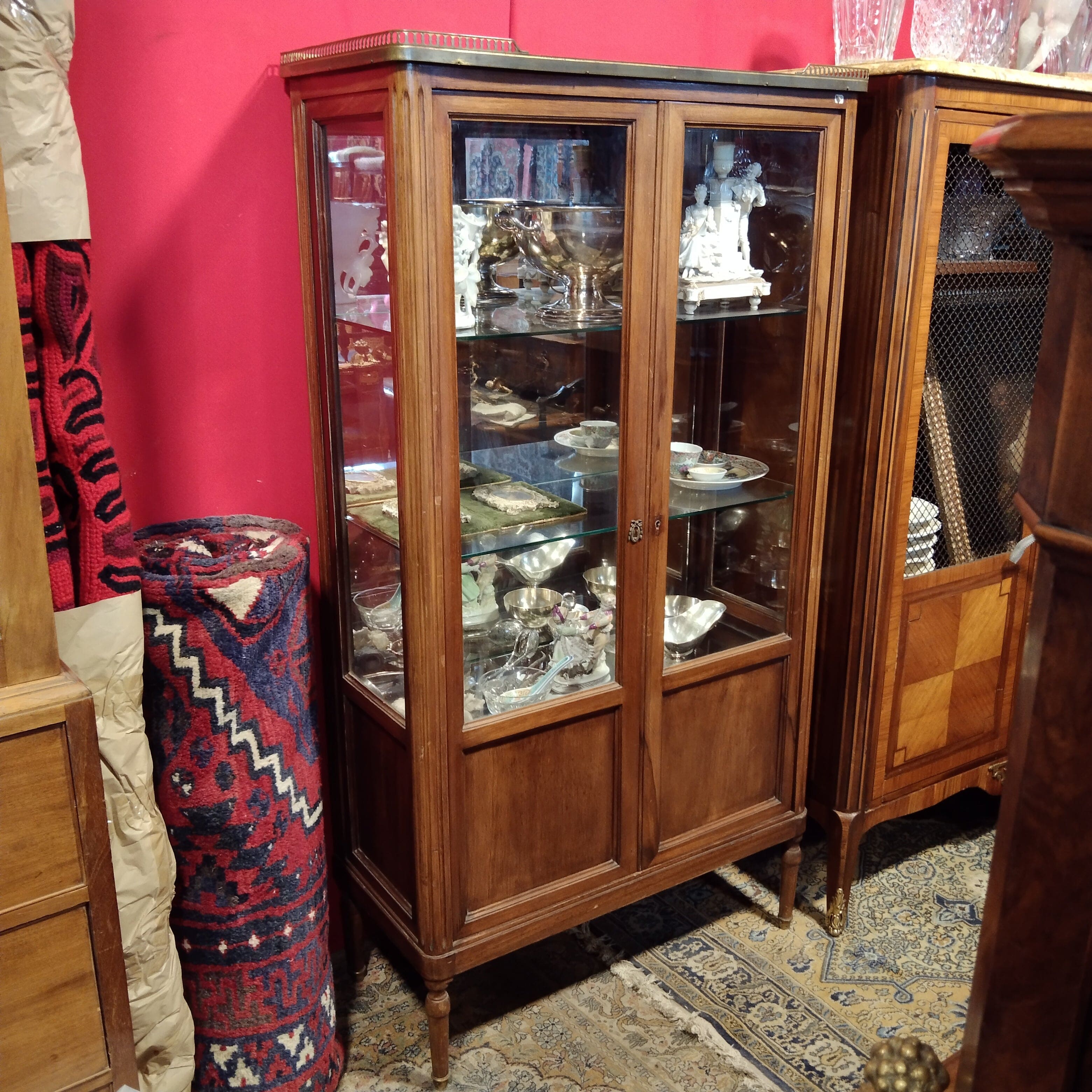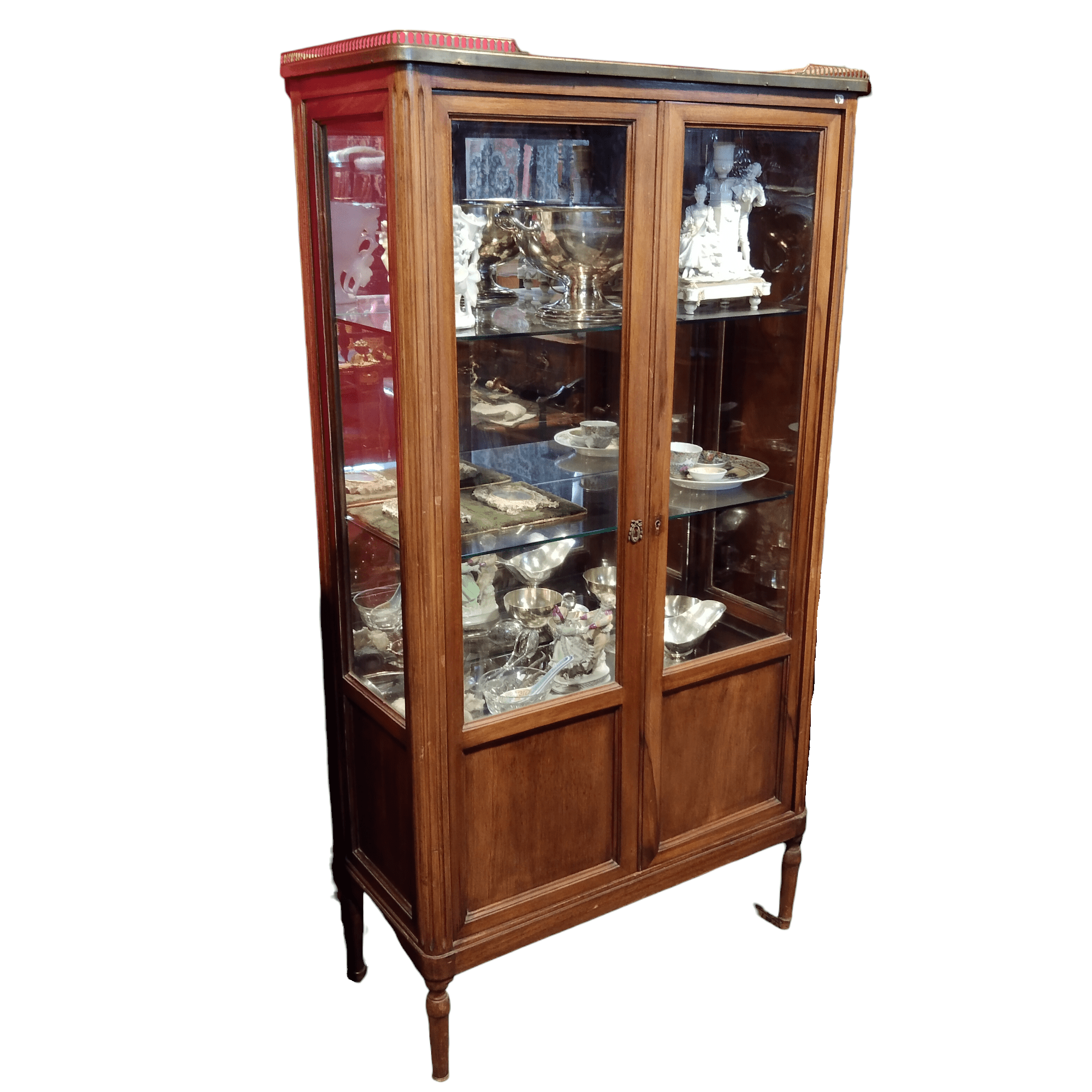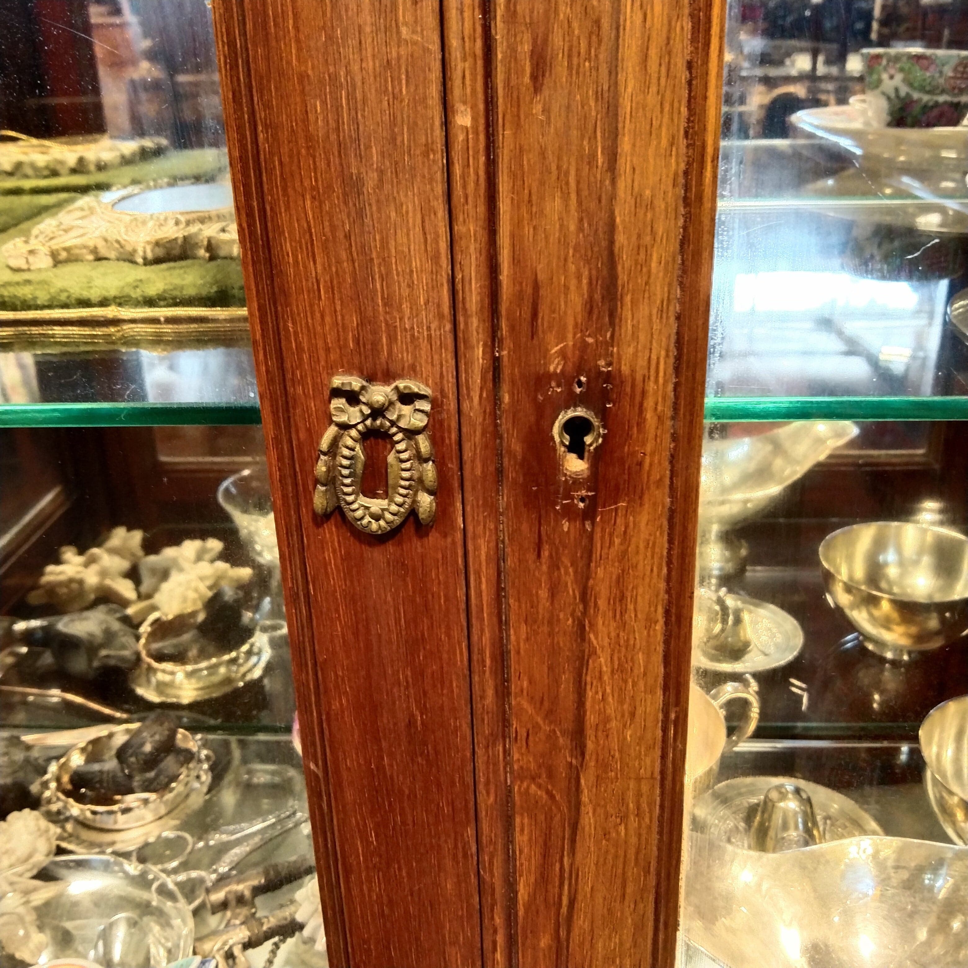 Bella vitrina mediana en X con cintillo de bronce y elegante aplicación para su cerradura. Tiene un interior con espejo y tres repisas de vidrio.