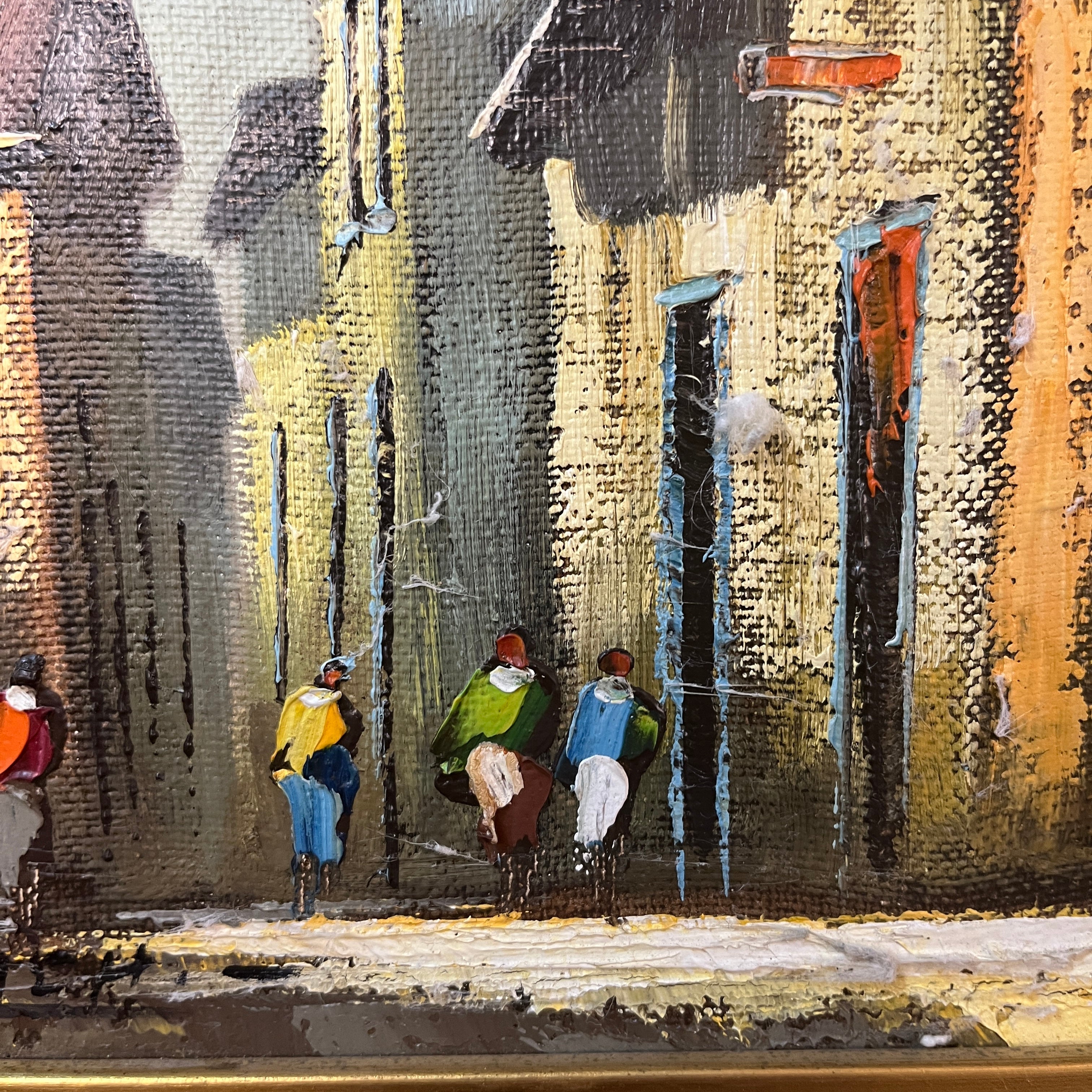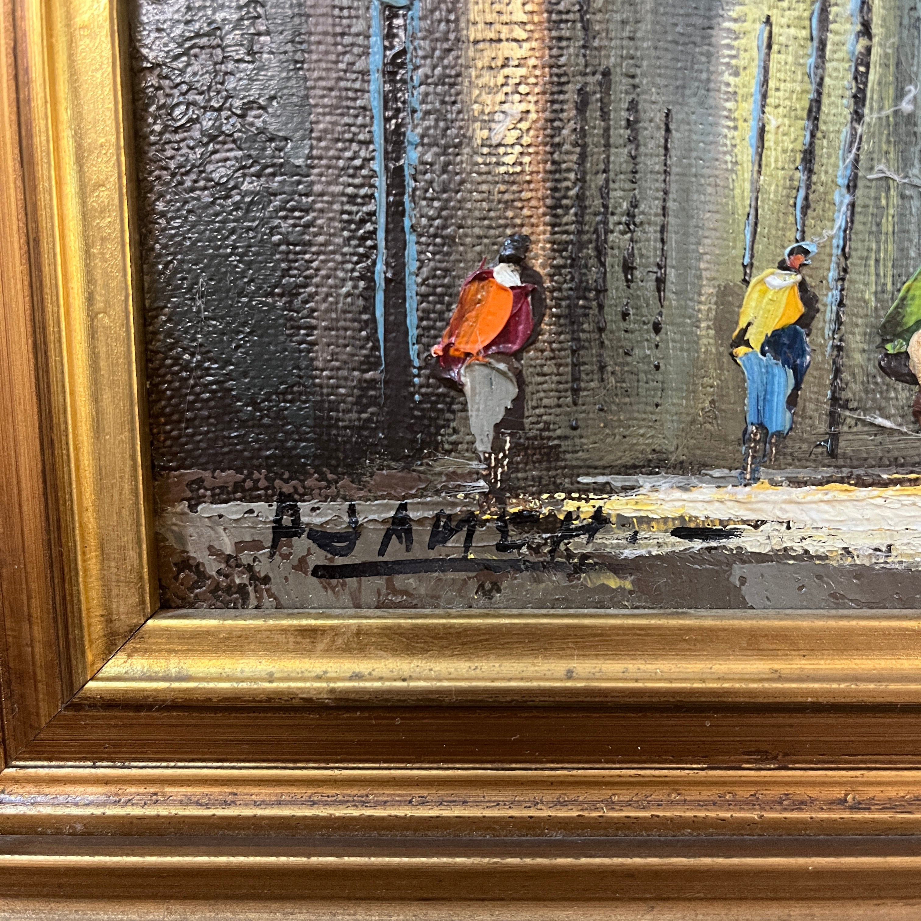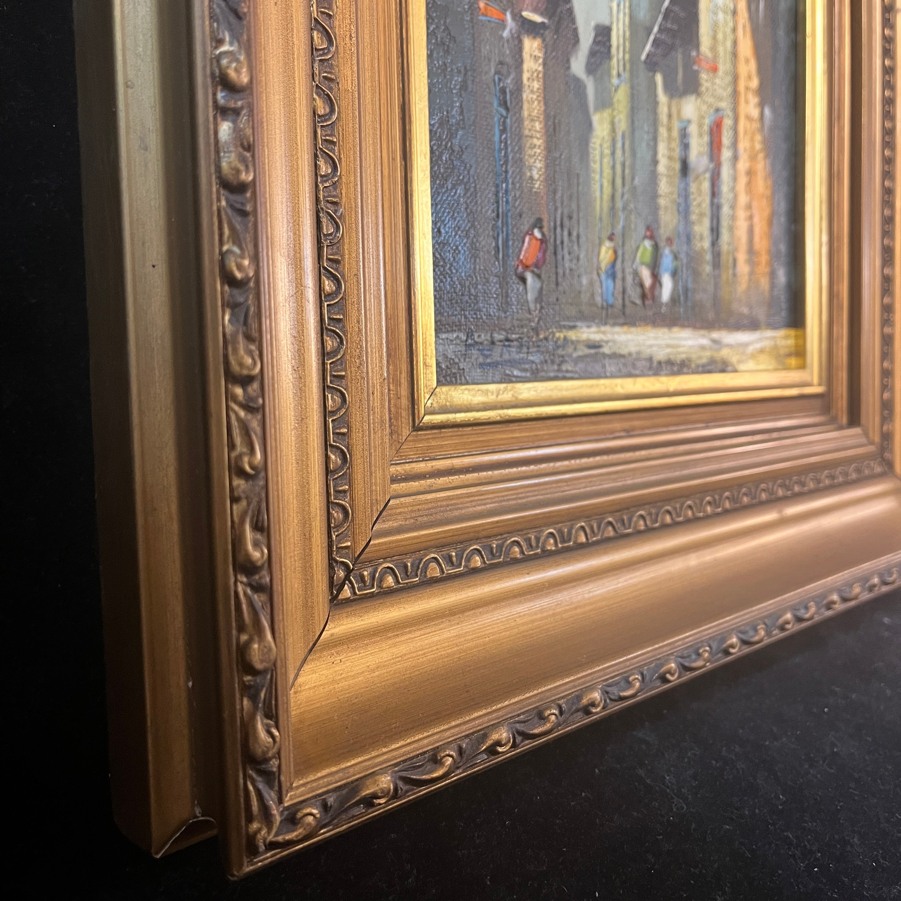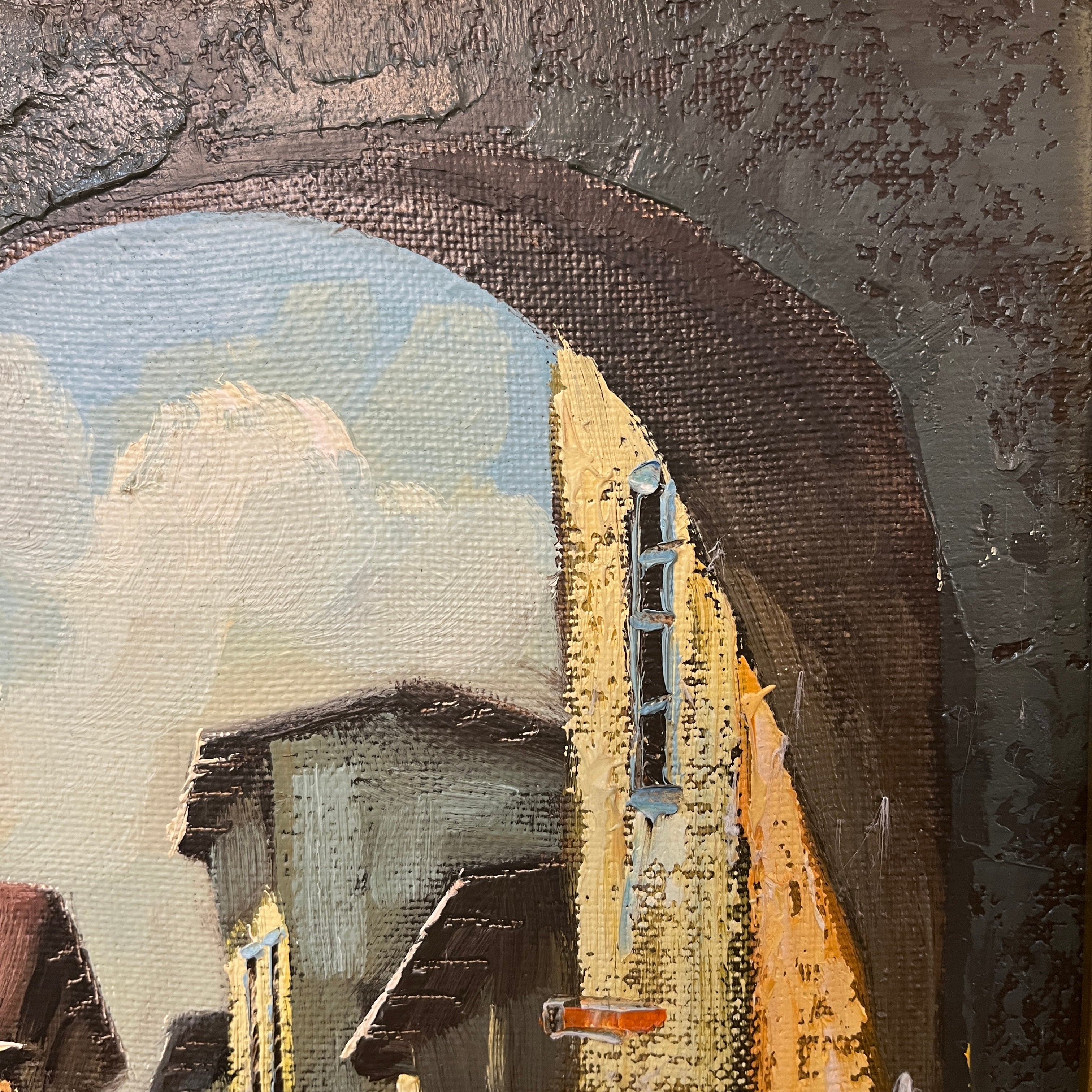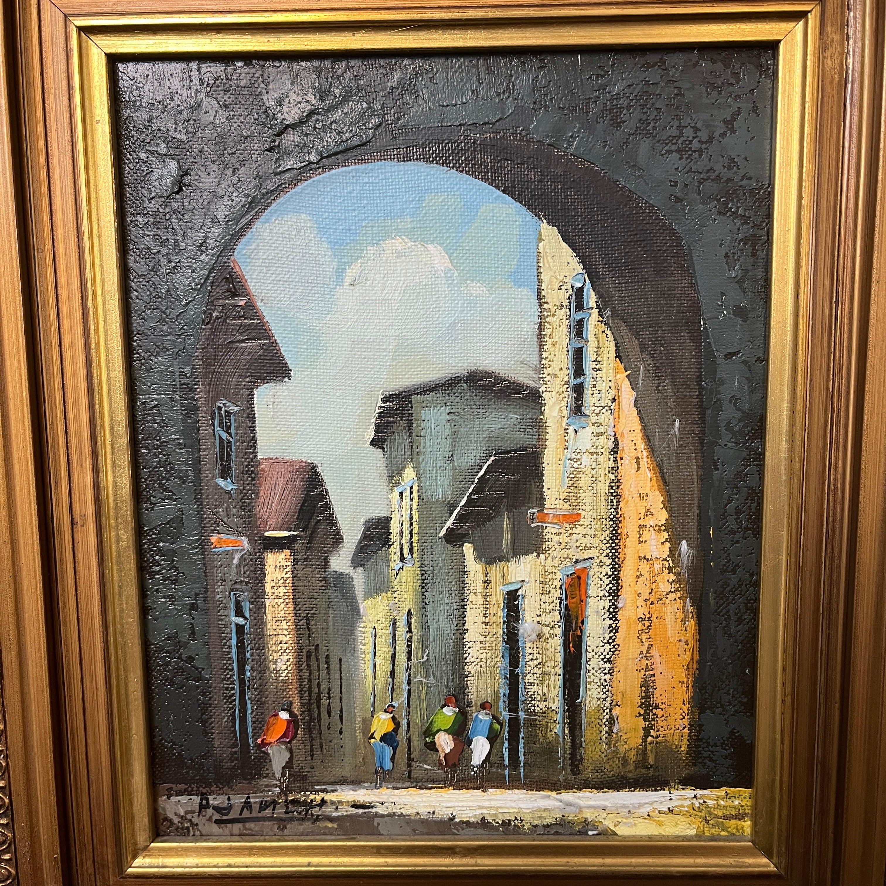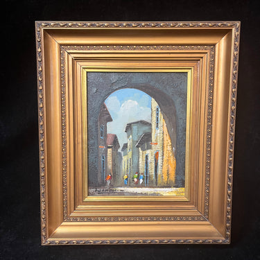 Óleo sobre tela del pintor chileno Alejandro Jamett, representando una vista, desde un gran arco antiguo, de una calle y sus caminantes. La arquitectura sugiere es una ciudad europea antigua. El artista compone el cuadro con un juego de luces y sombras muy interesantes, en el que el gran arco se vuelve un segundo marco que dejar entrar la luz hacia el observador. La obra tiene un marco de madera tallada en relieves y pintada de luminoso dorado.