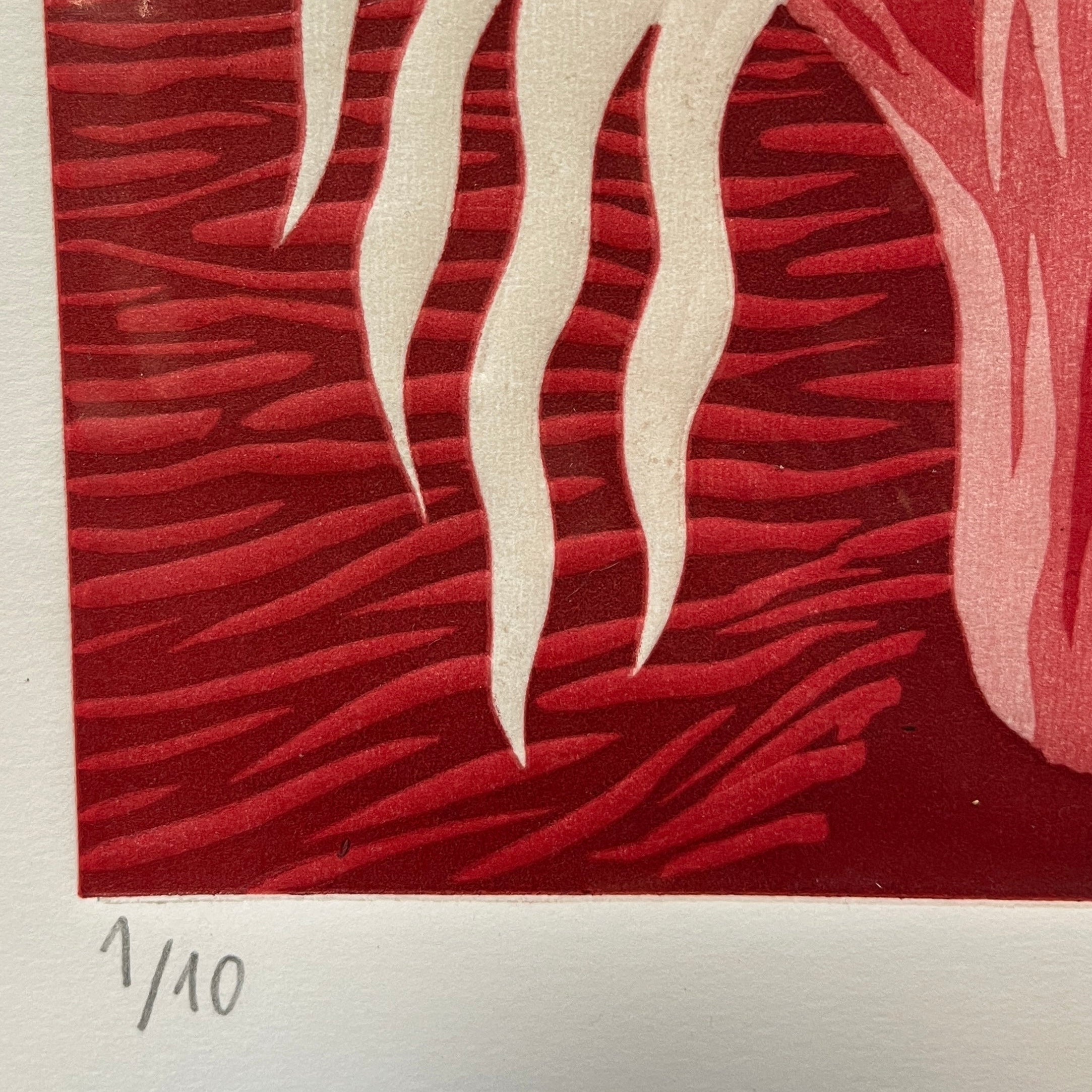 Hermoso linóleo del artista chileno Michael Yaikel, vemos un tronco hueco desde donde brotan ramas de vida en diferentes direcciones. Es una obra cargada en los tonos rojos que entrega a la vista una alta carga de movimiento y su observación abre a un abanico de simbolismos personales.